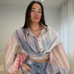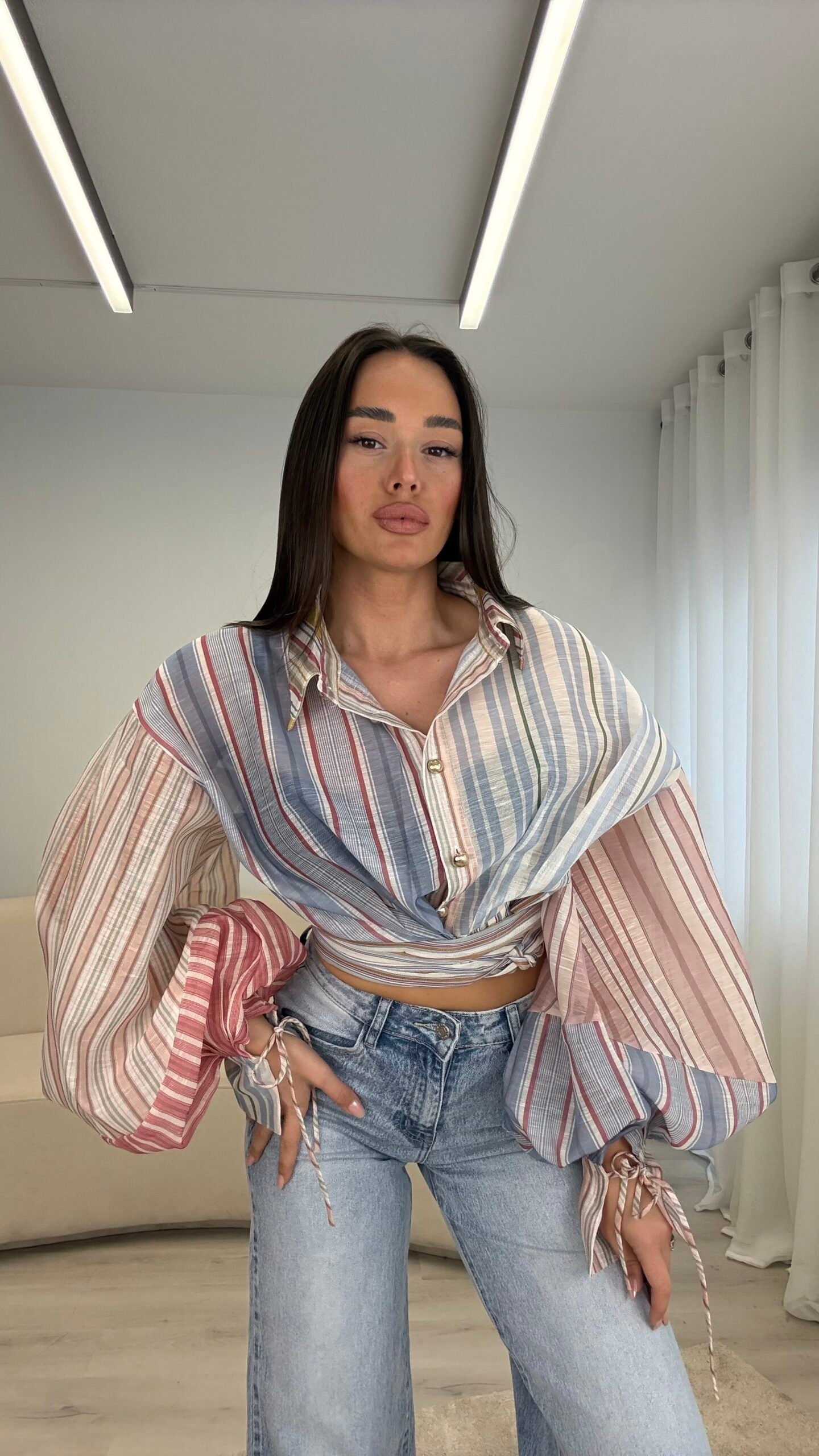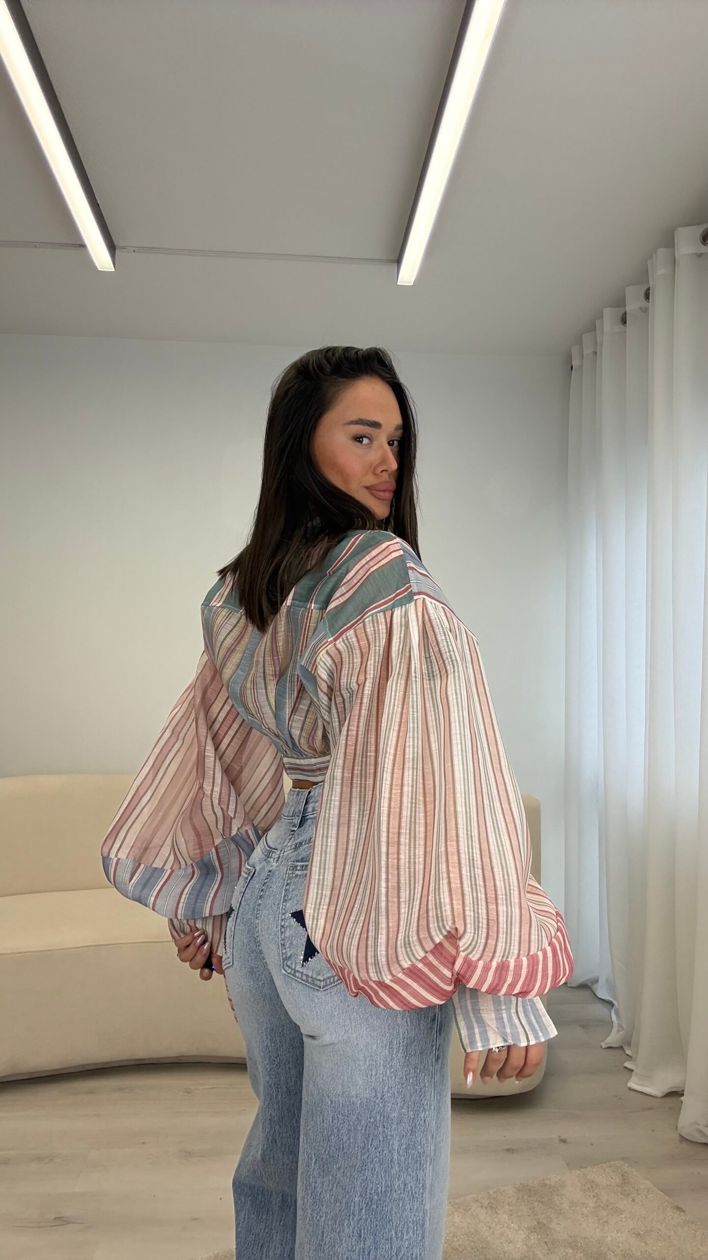 Këmishë moderne me vija në tonalitete pastel, me mëngë të gjera dhe prerje që thekson belin, ideale për një look veror, të freskët dhe “effortless chic” në çdo kombinim.