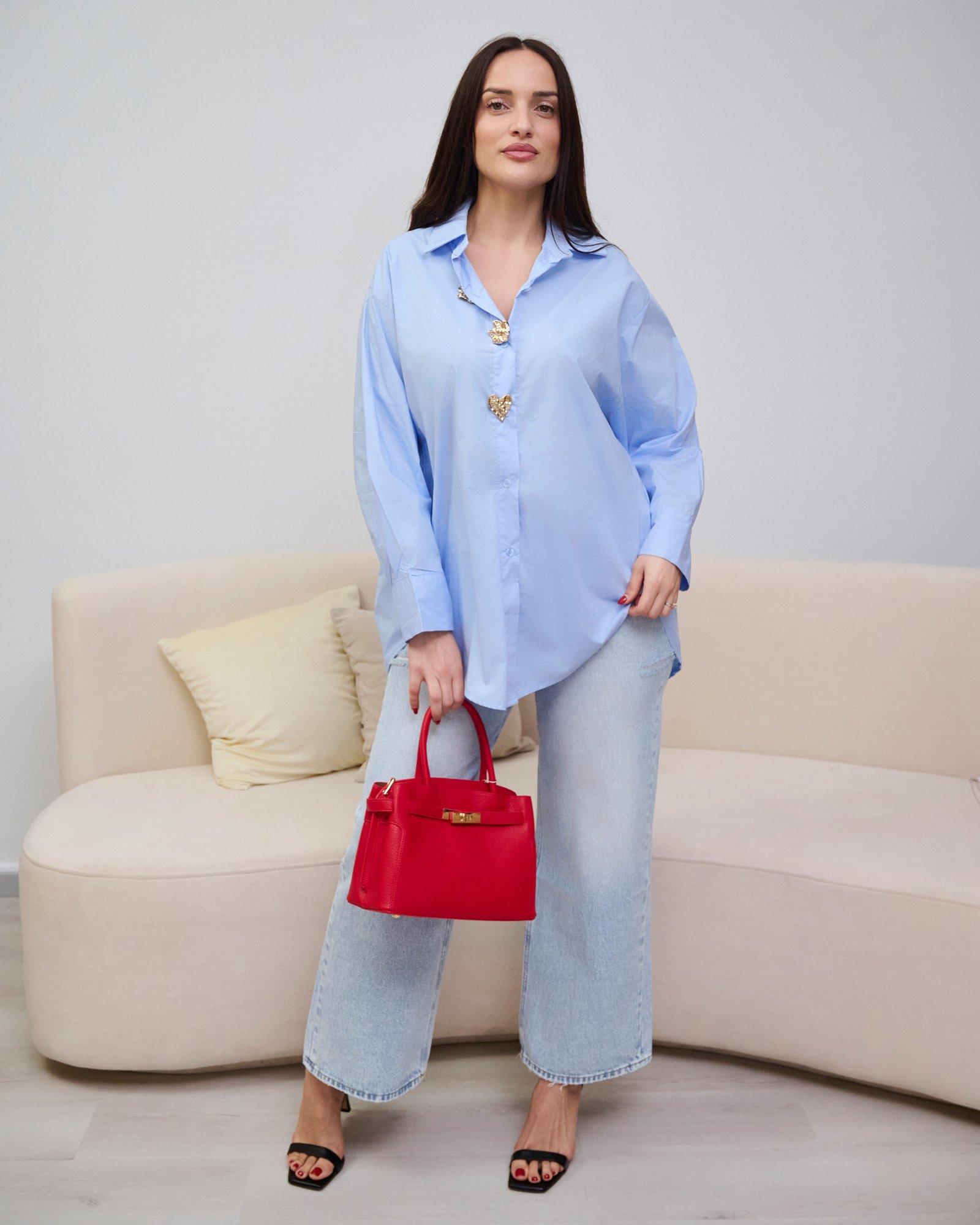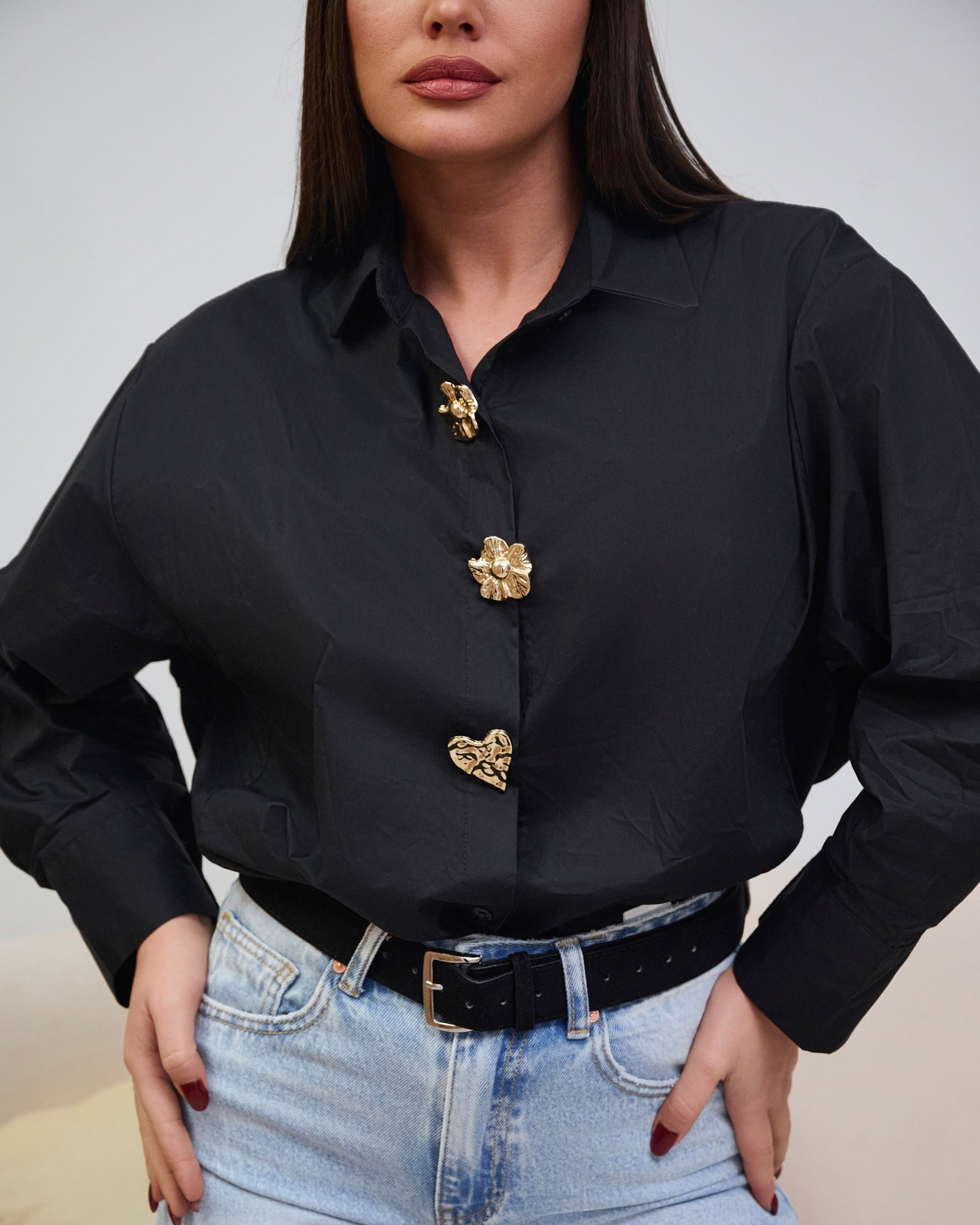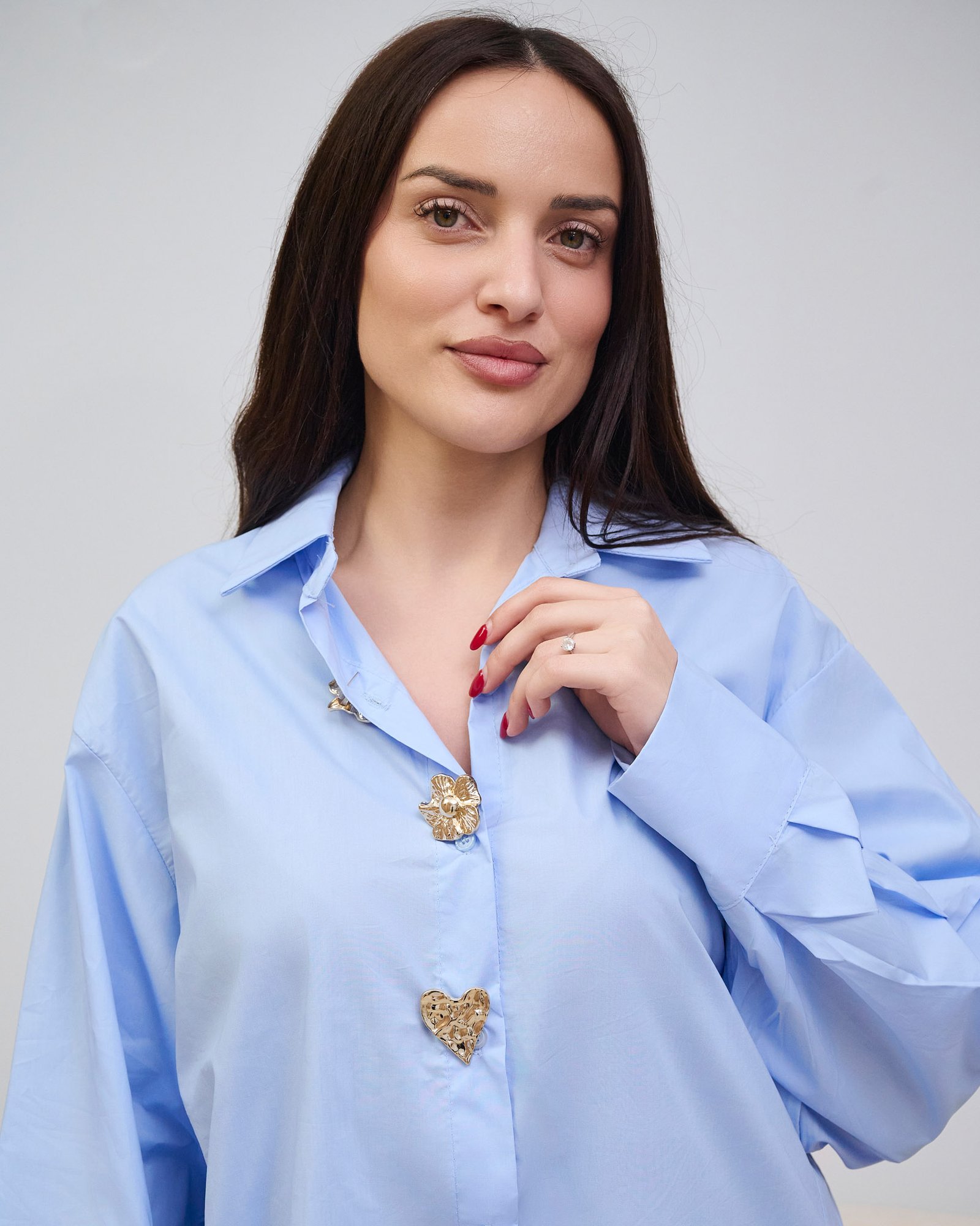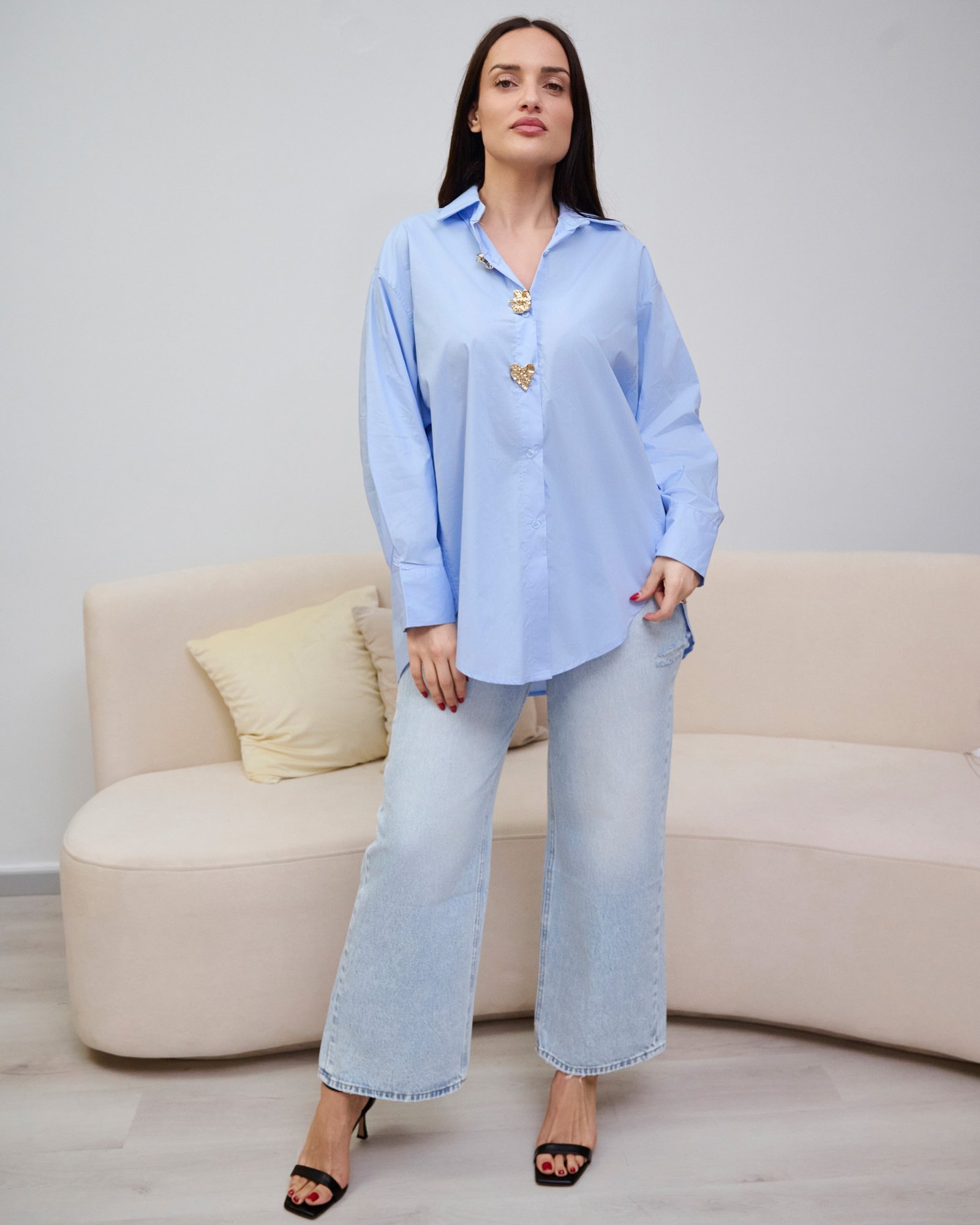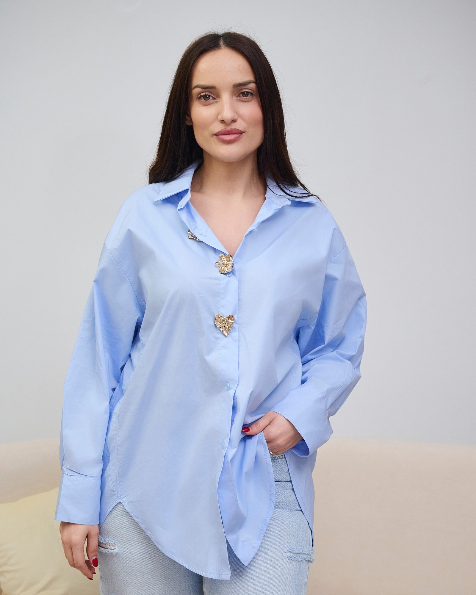 Këmishë oversize elegante, me prerje të lirshme, jakë klasike dhe kopsa dekorative metalike në formë zemre. Material i lehtë dhe komod, ideale për kombinime casual chic me xhinse ose pantallona. Perfekte për veshje të përditshme, zyrë apo dalje urbane.