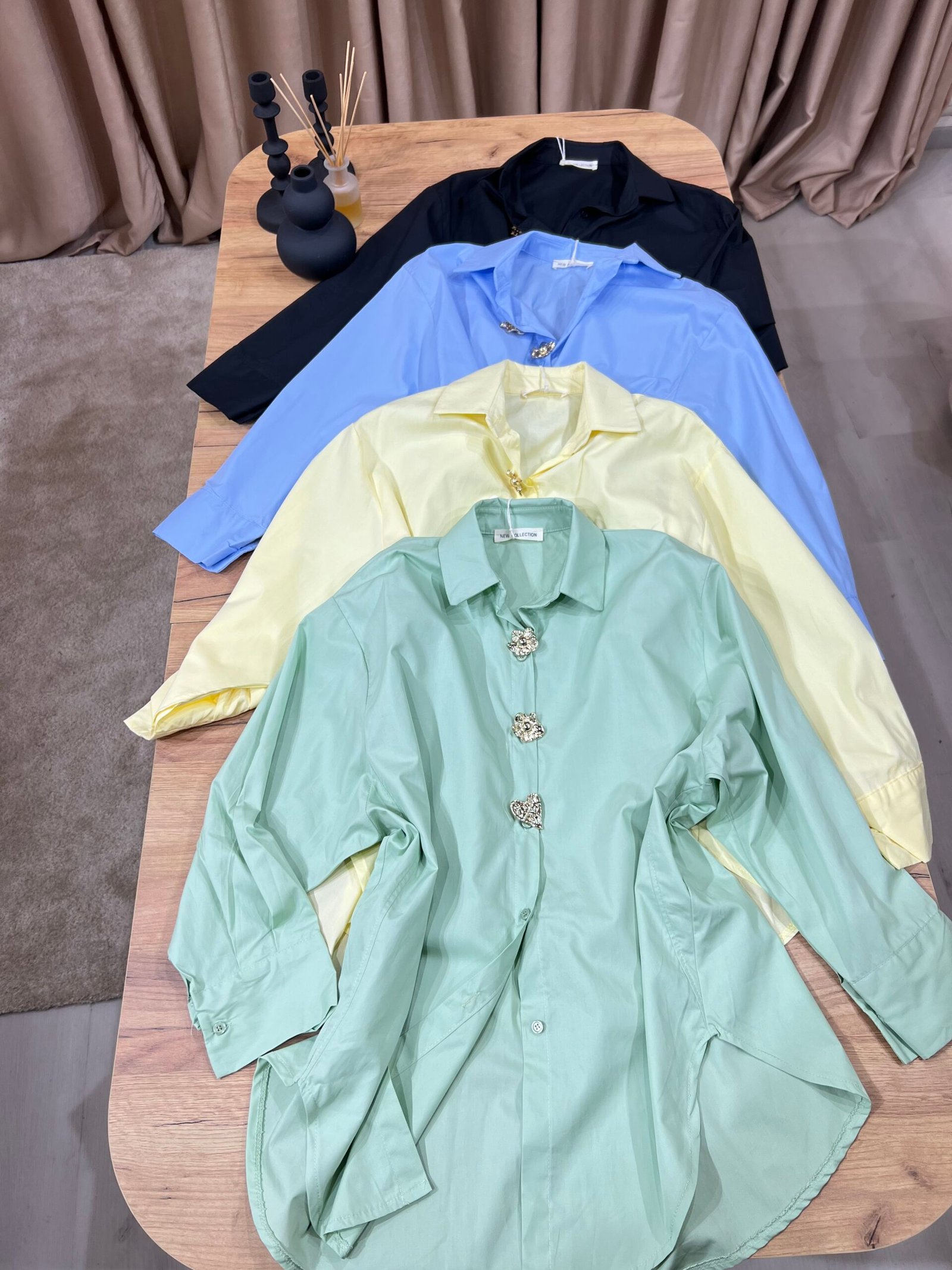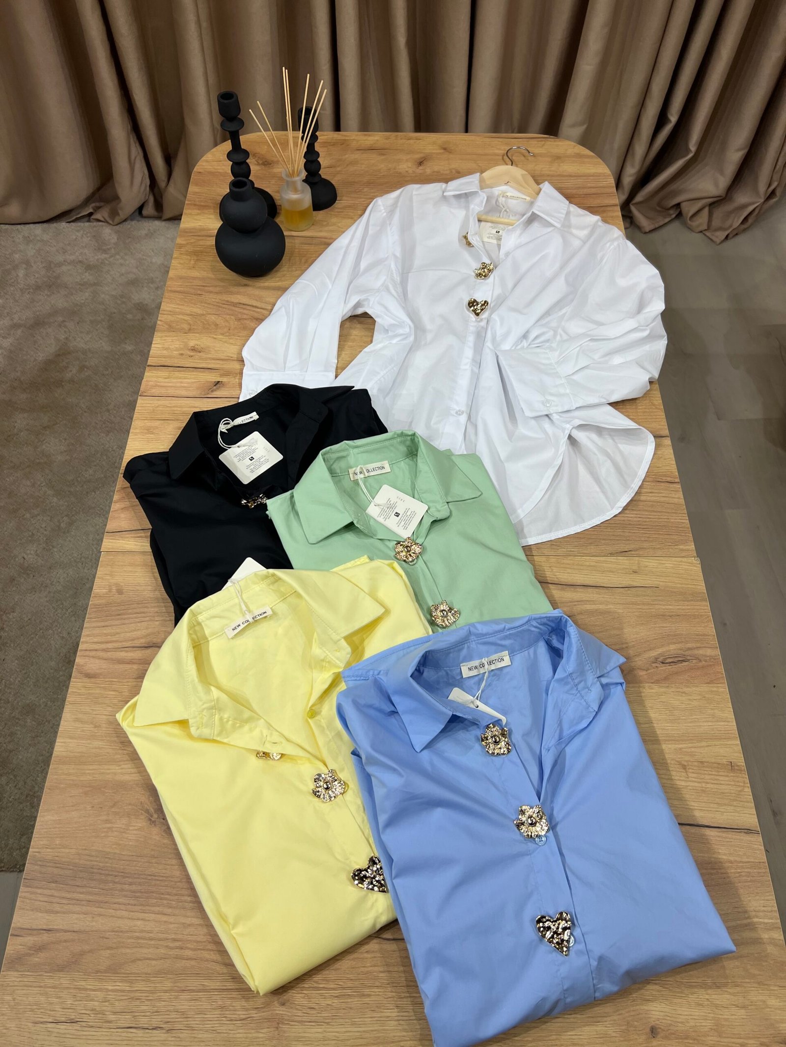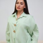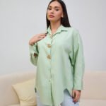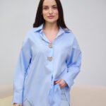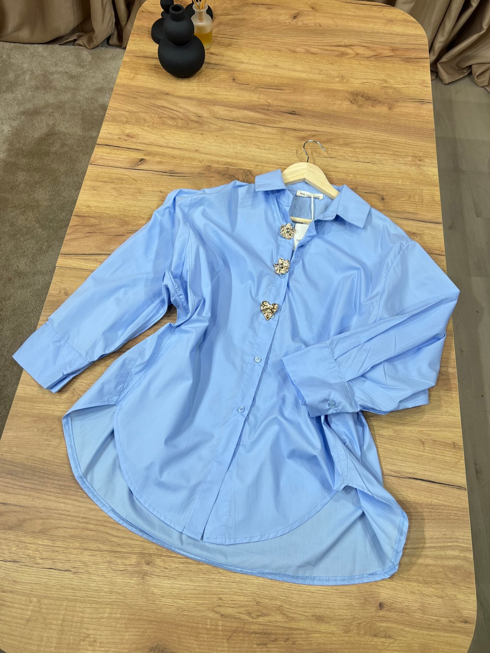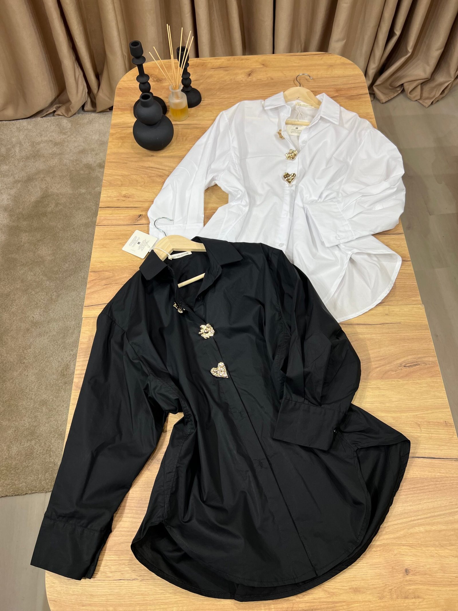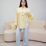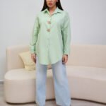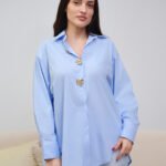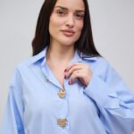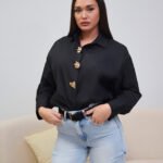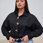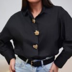 Këmishë oversize elegante, me prerje të lirshme, jakë klasike dhe kopsa dekorative metalike në formë zemre. Material i lehtë dhe komod, ideale për kombinime casual chic me xhinse ose pantallona. Perfekte për veshje të përditshme, zyrë apo dalje urbane.