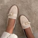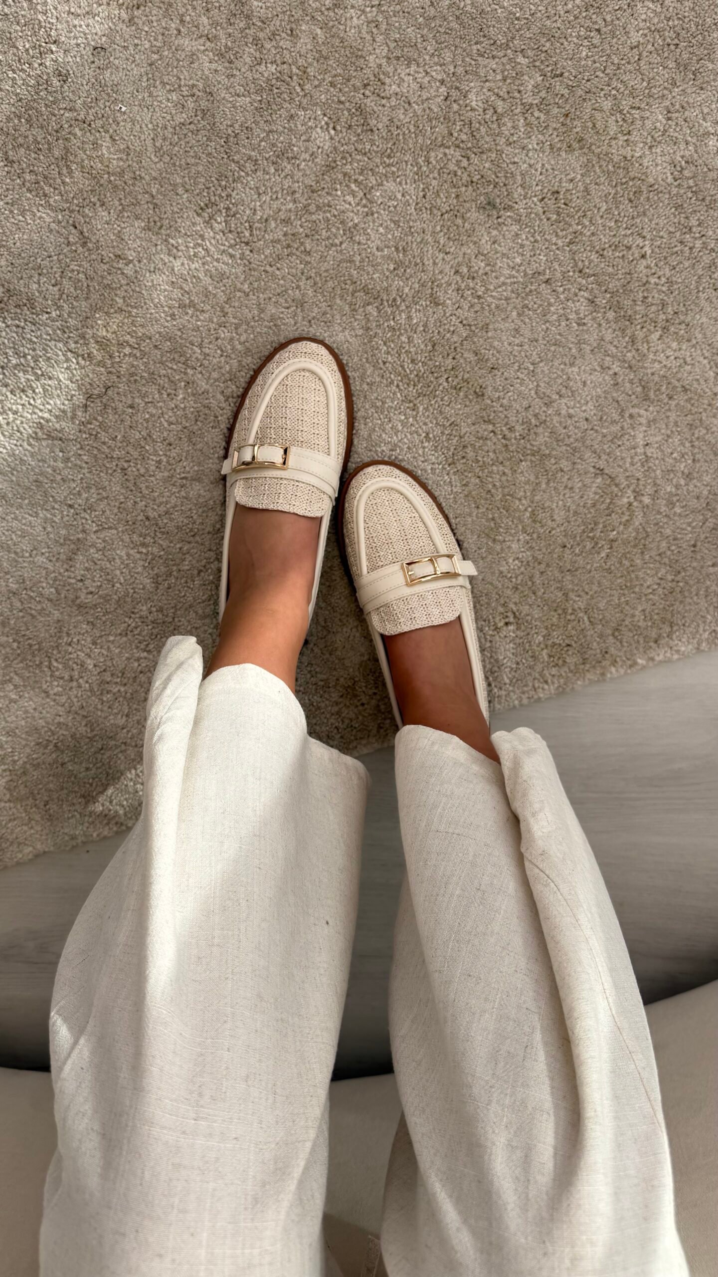 Këpucë loafer me teksturë raffia dhe dizajn elegant që kombinon stilin natyral me detaje moderne. Elementi gold buckle shton një prekje classy, ndërsa forma komode i bën perfekte për përdorim të përditshëm.