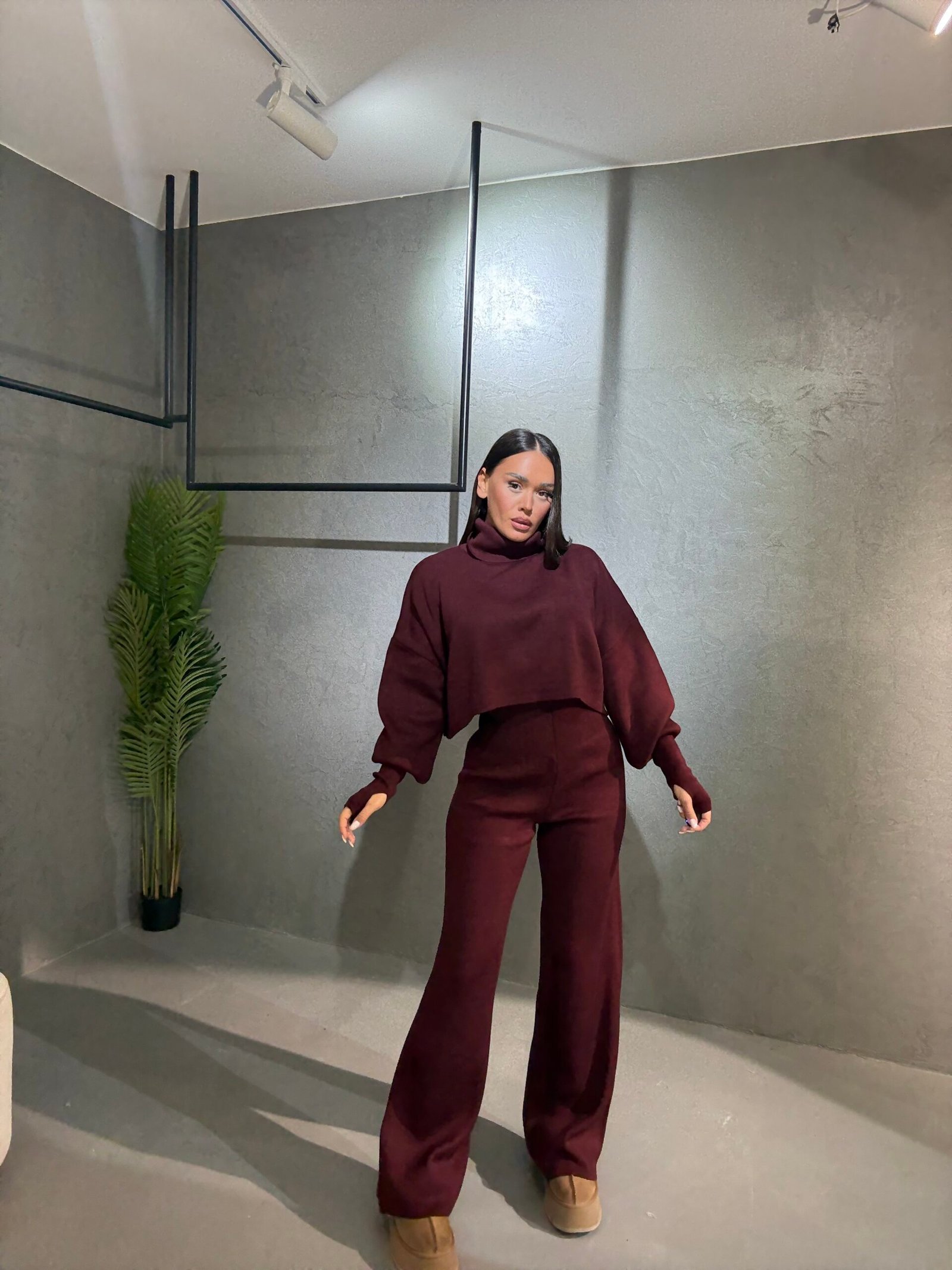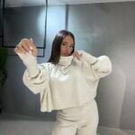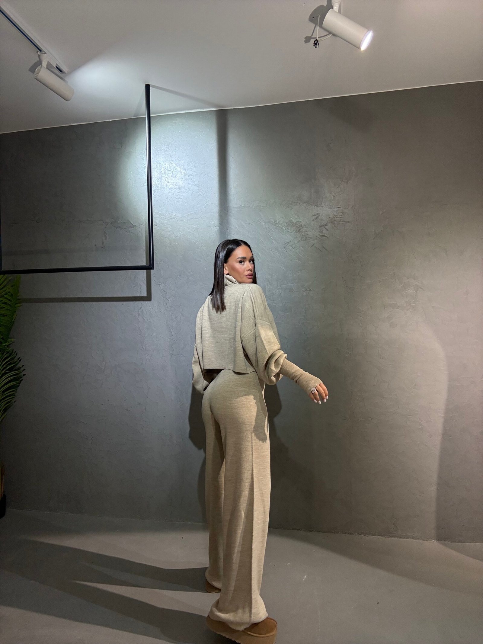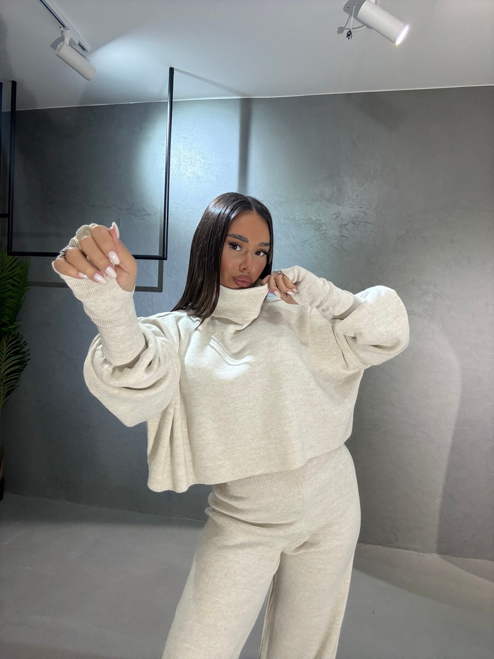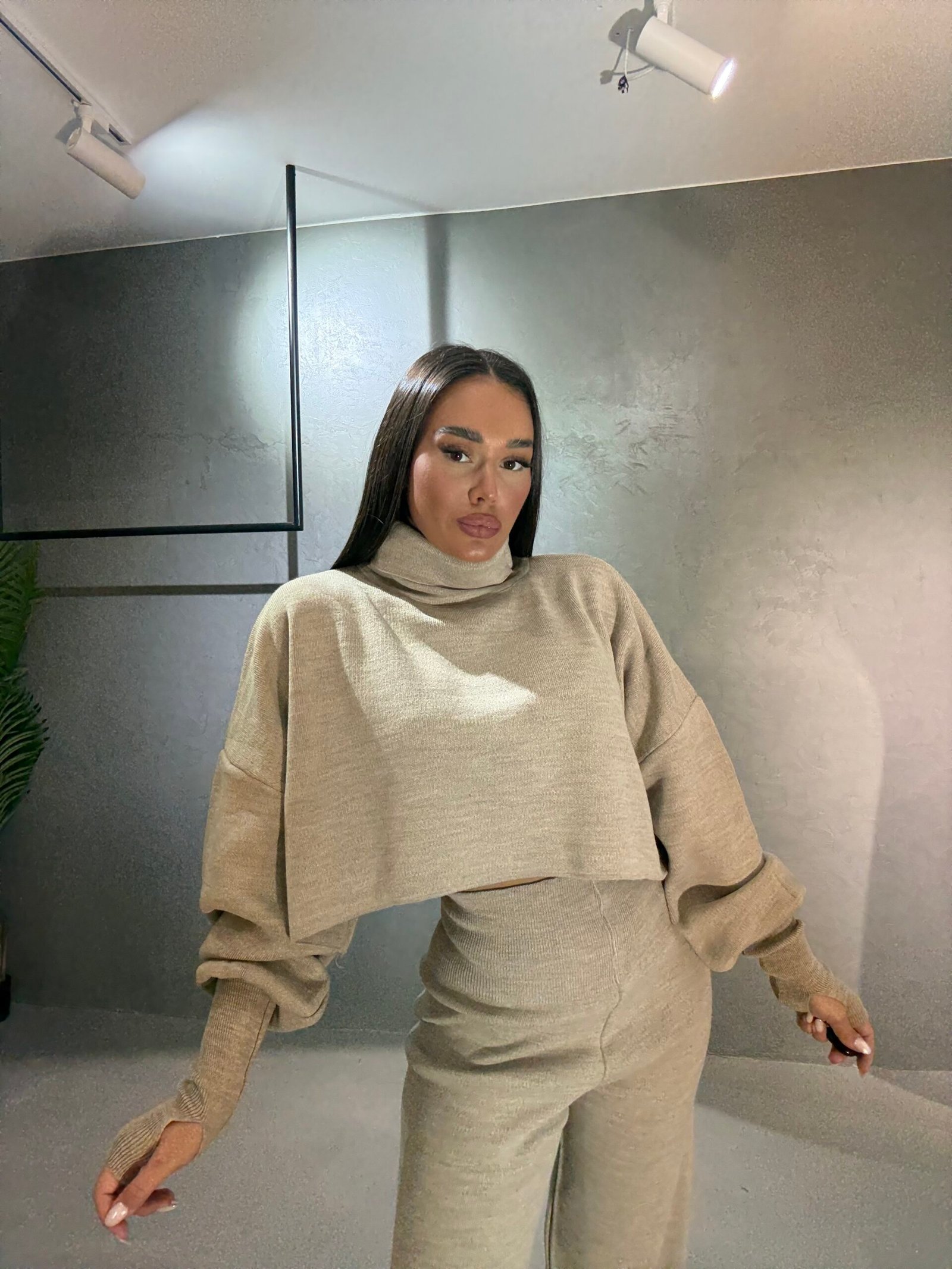Kostum deve me golf prerje oversize dhe material të butë, perfekt për stilin modern dhe të rehatshëm të ditëve të ftohta. Pantallonat me prerje të drejtë sigurojnë rehati maksimale dhe përshtatje ideale. Një veshje e përditshme që kombinon minimalizmin me luksin e thjeshtë.