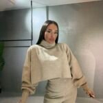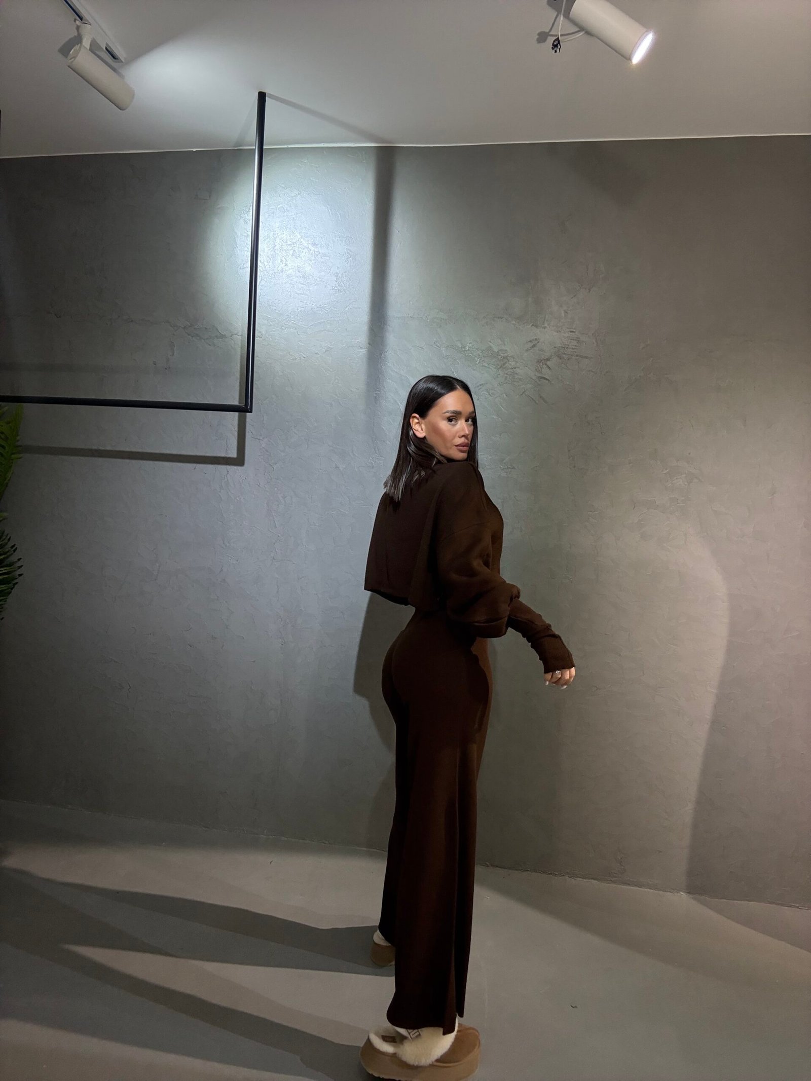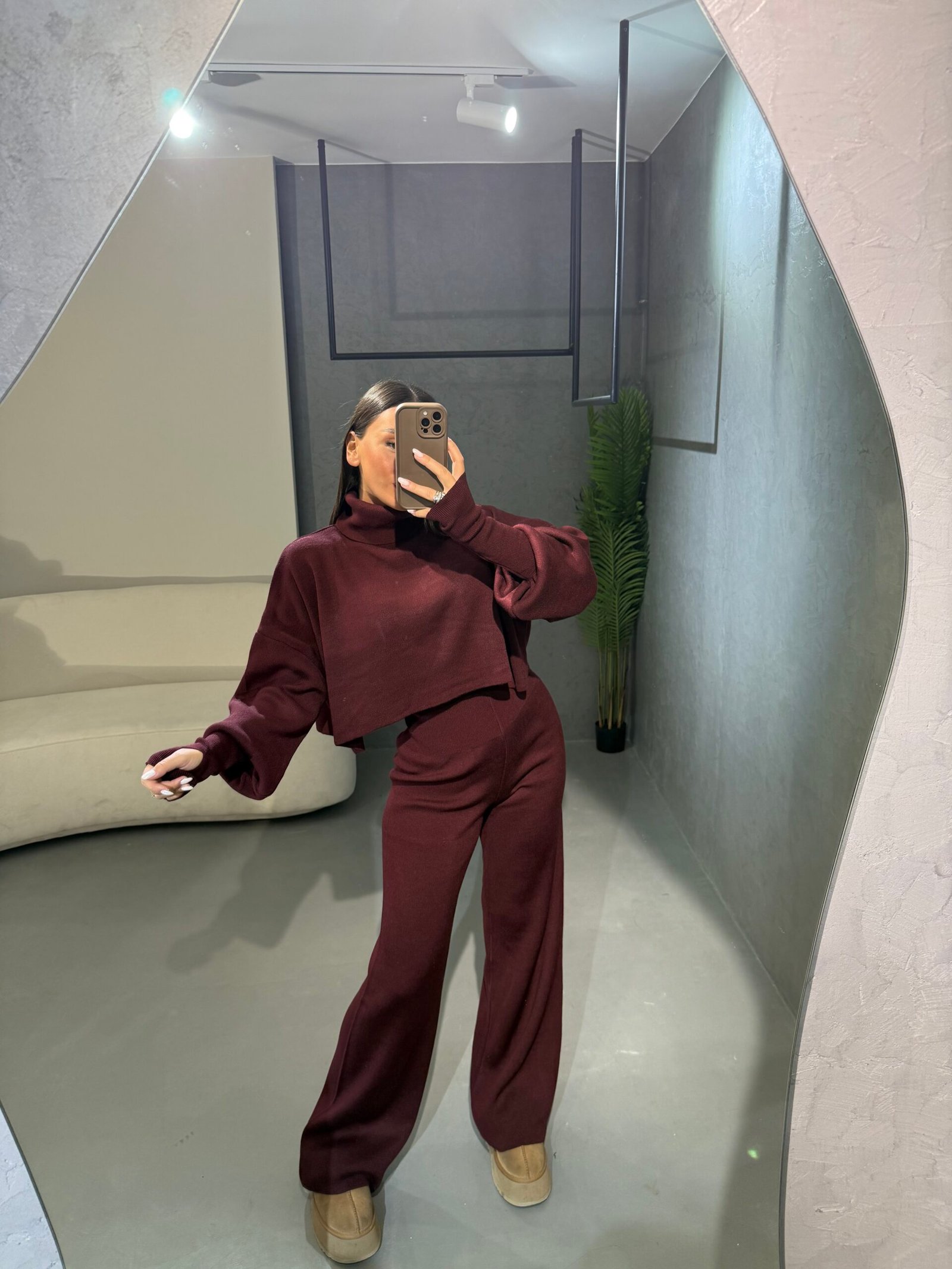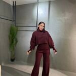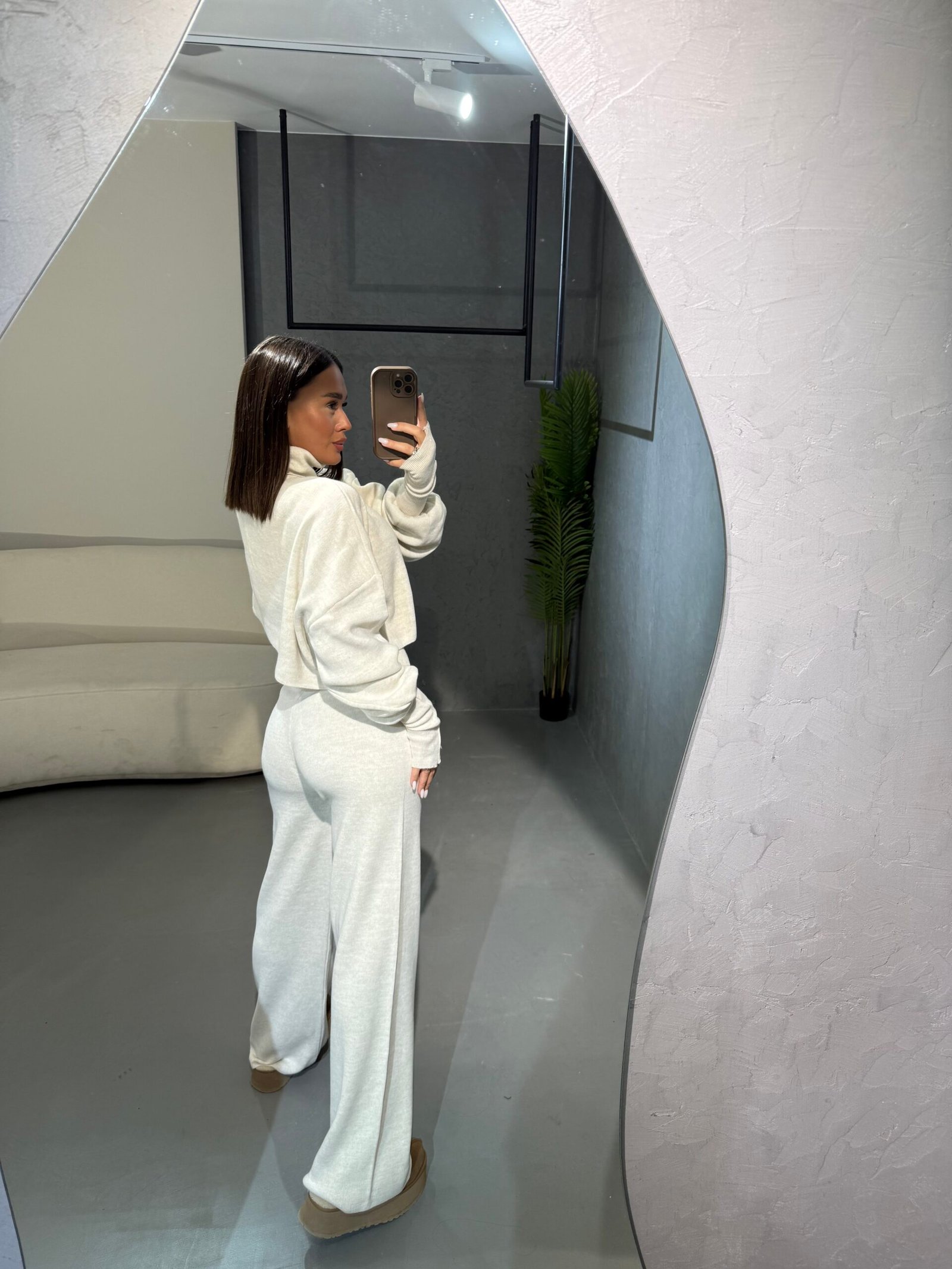 Kostum deve me golf prerje oversize dhe material të butë, perfekt për stilin modern dhe të rehatshëm të ditëve të ftohta. Pantallonat me prerje të drejtë sigurojnë rehati maksimale dhe përshtatje ideale. Një veshje e përditshme që kombinon minimalizmin me luksin e thjeshtë.
