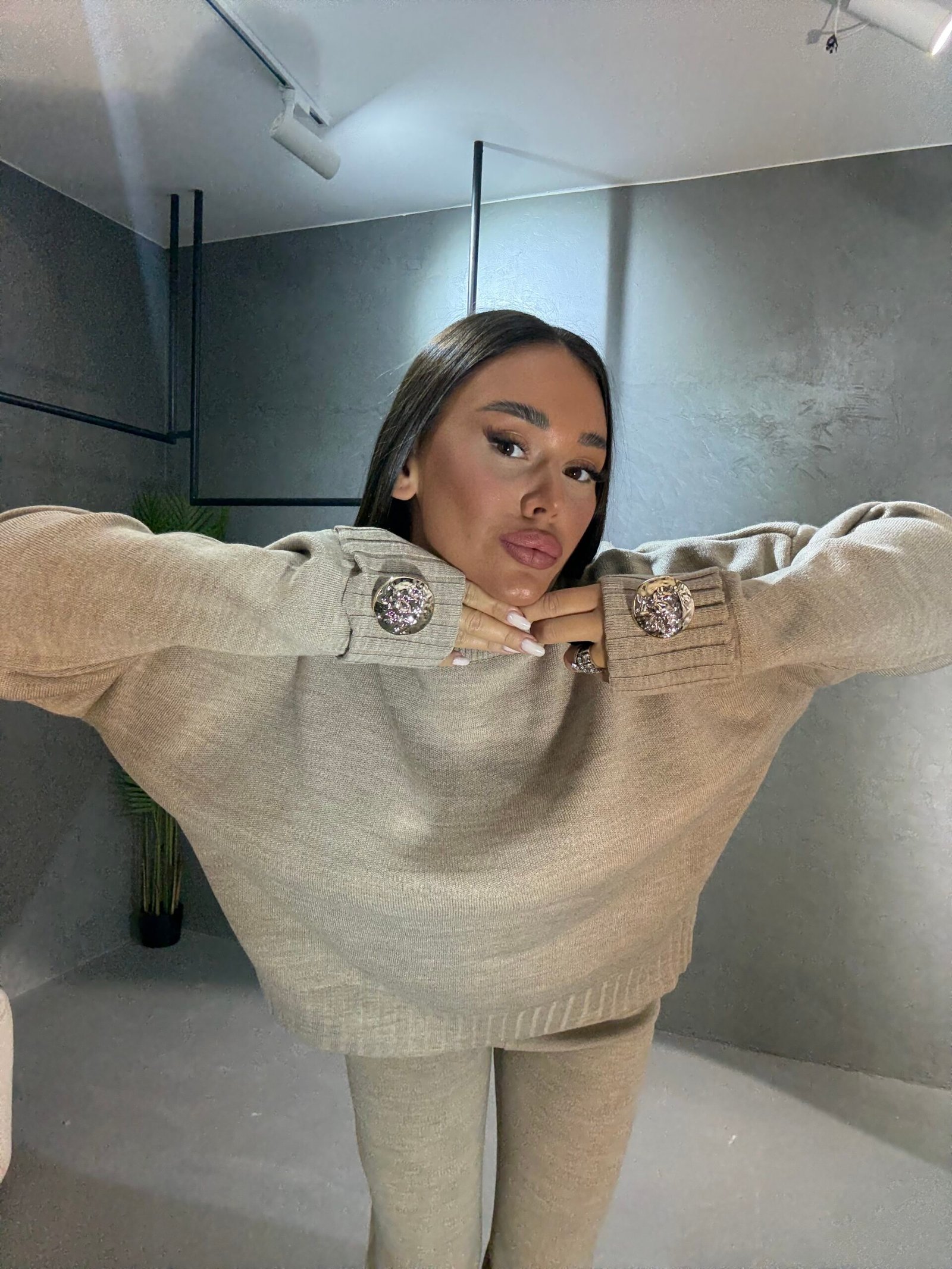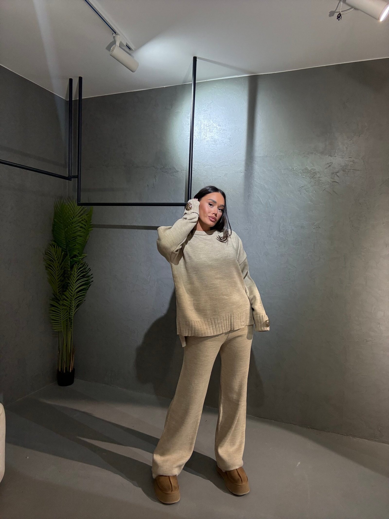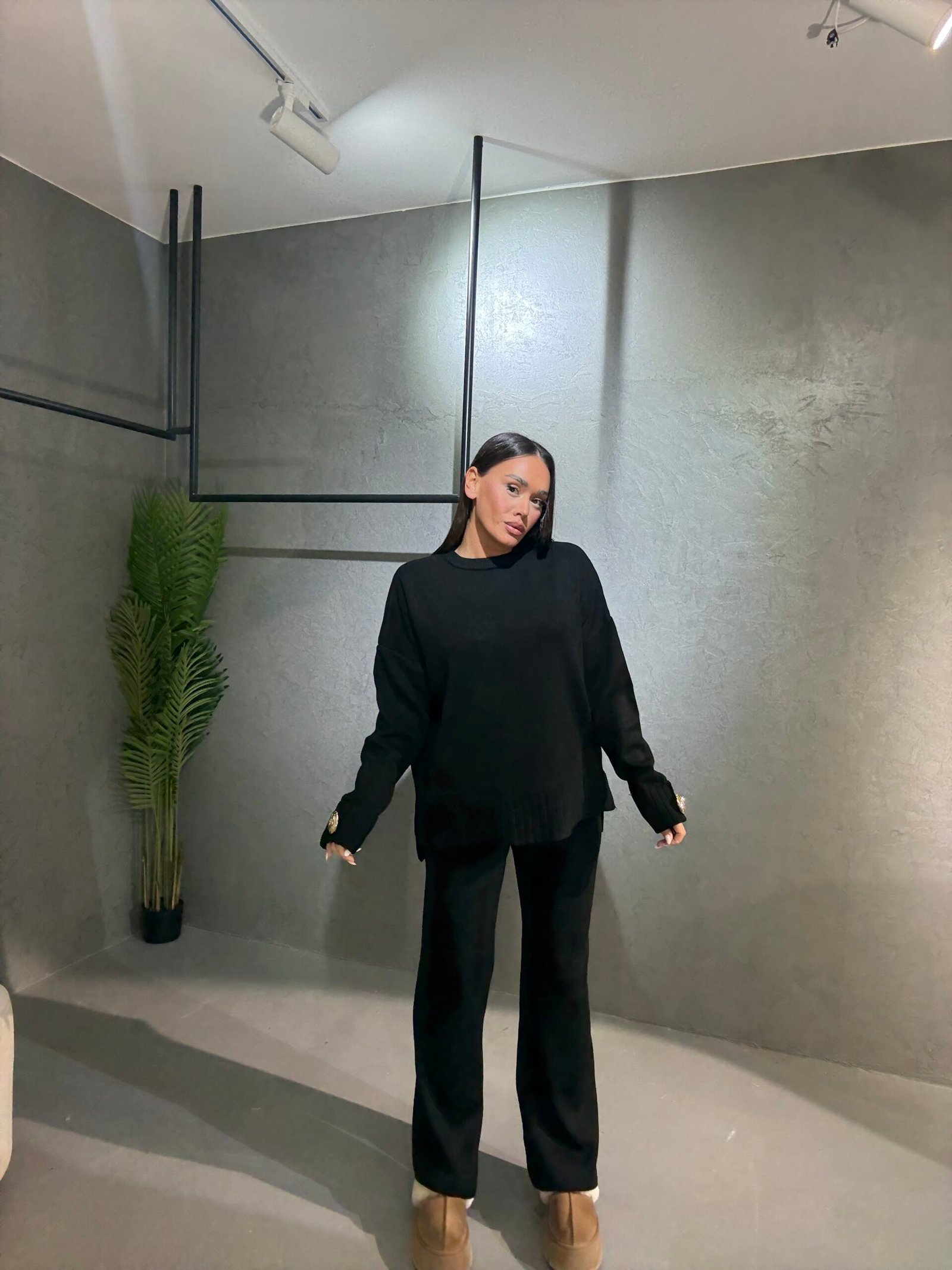 Kostum i butë dhe elegant me prerje komode që ofron stil dhe rehati në çdo moment të ditës. Trikoja ka detaje dekorative me kristale në mëngë për një prekje luksi diskret, ndërsa pantallonat me linja të pastra sigurojnë një pamje të sofistikuar dhe të përditshme njëkohësisht. Një zgjedhje perfekte për kombinime minimaliste dhe moderne.