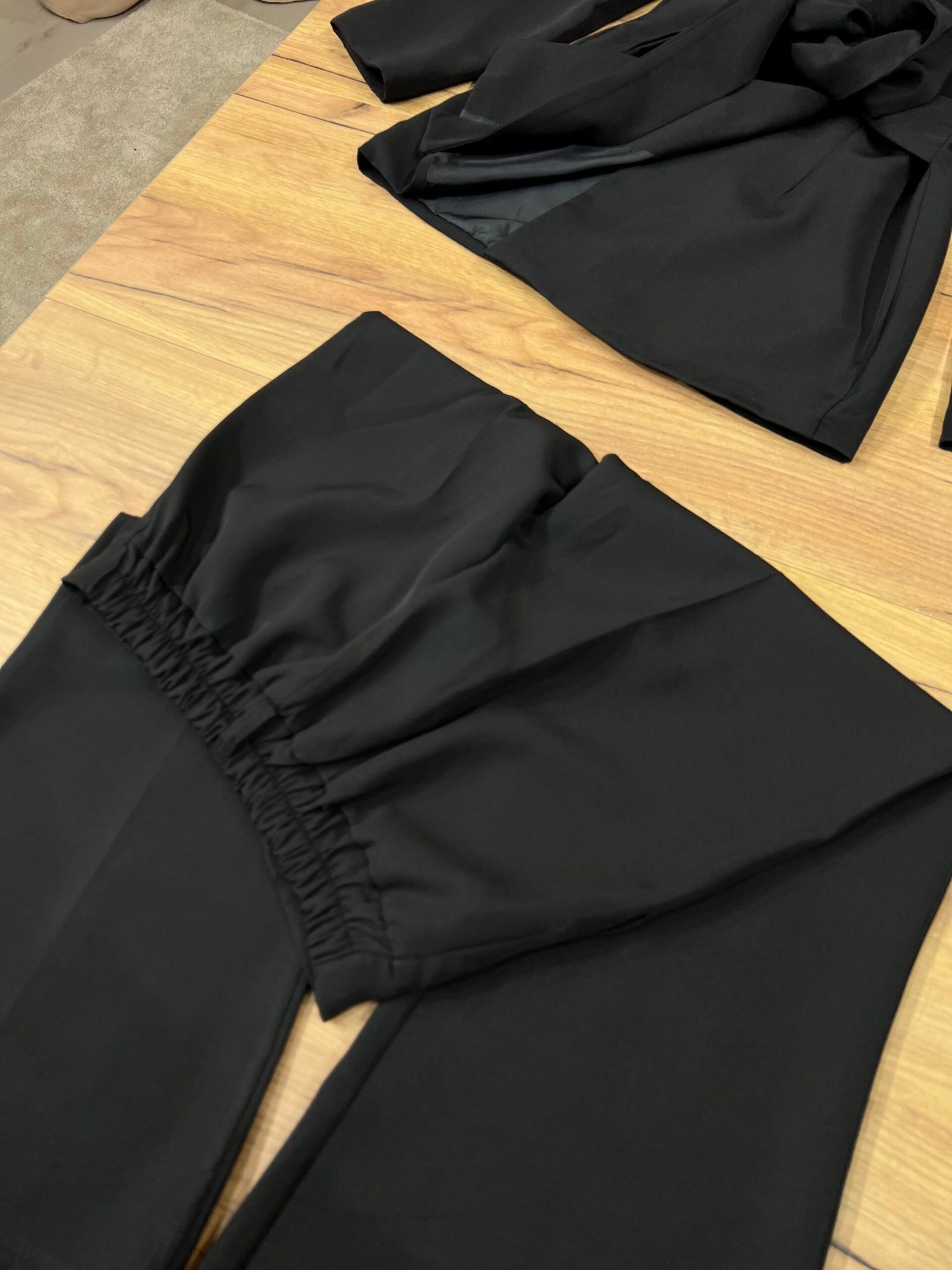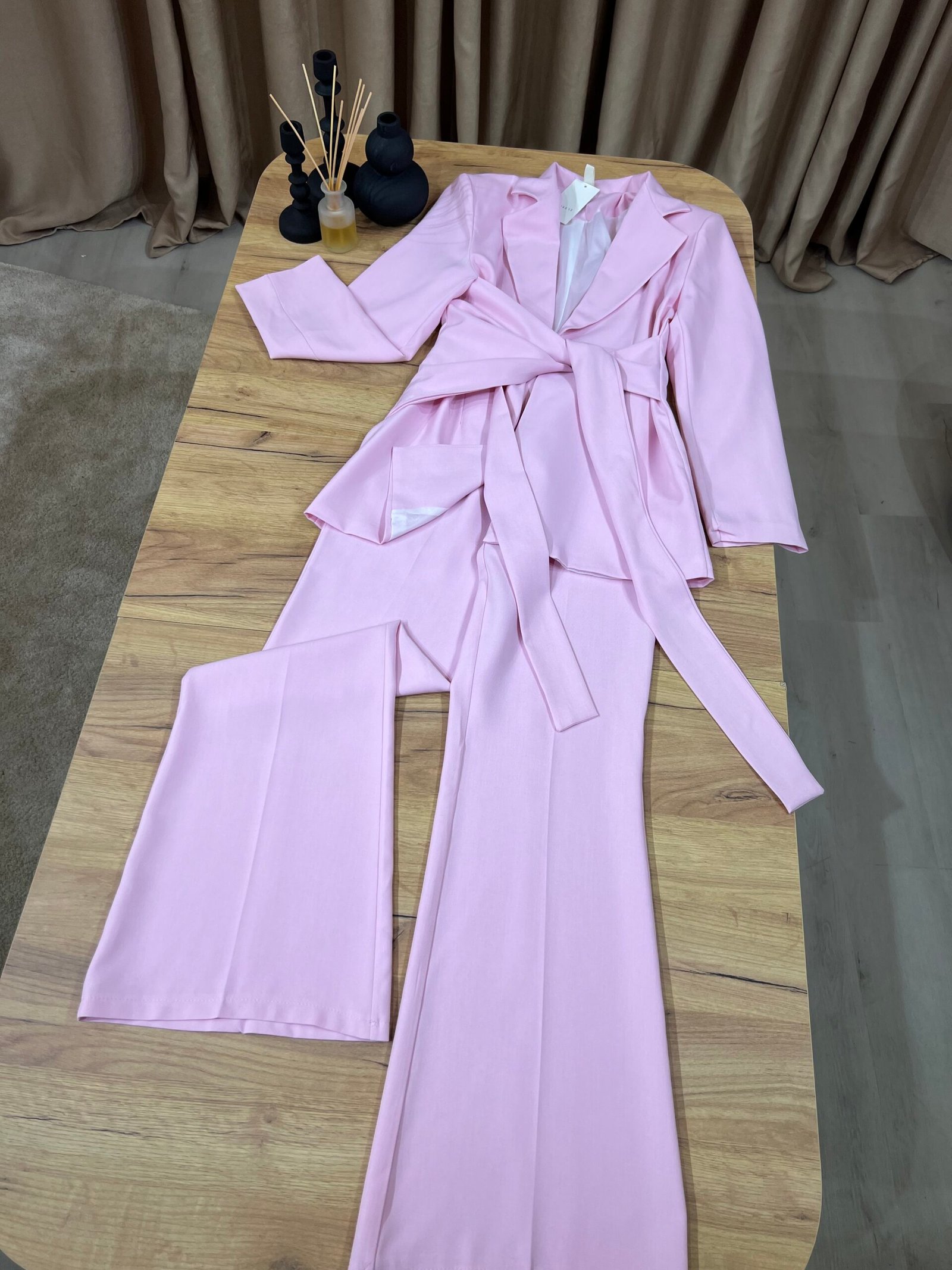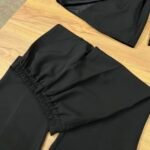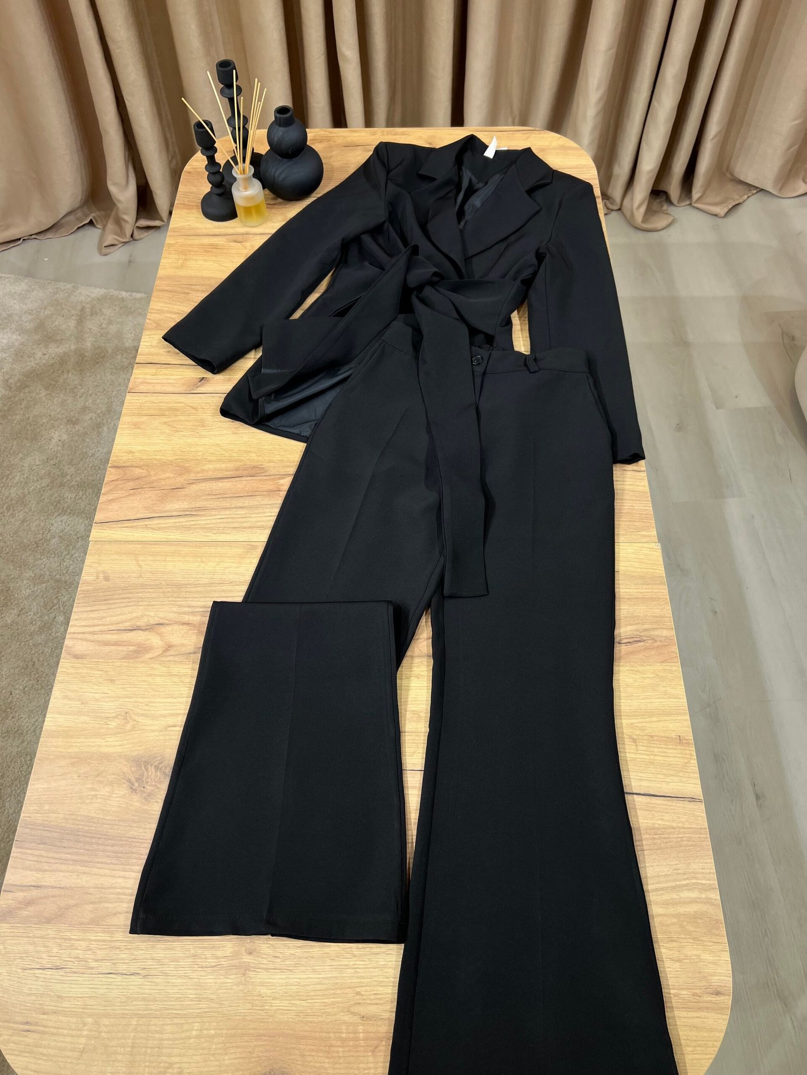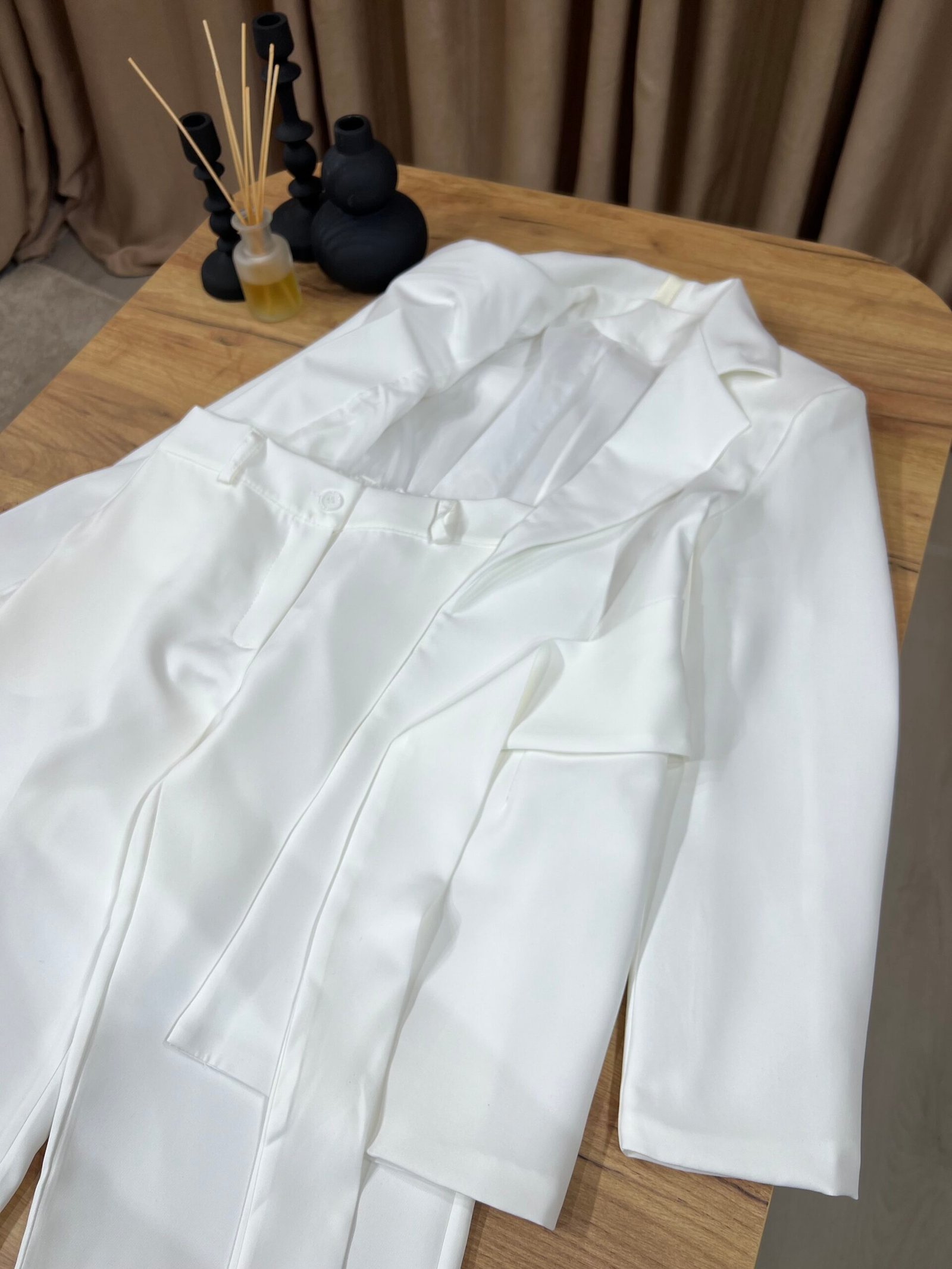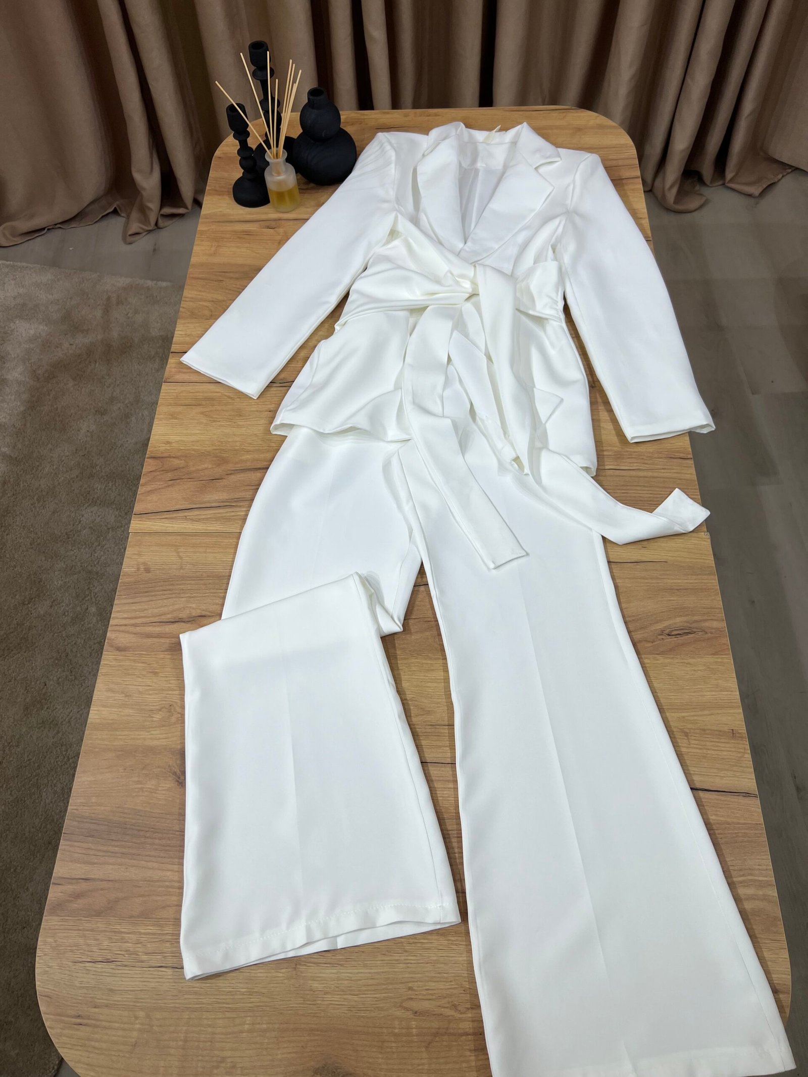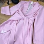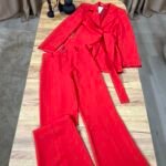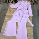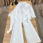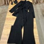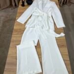 Kostum elegant i përbërë nga xhaketë me jakë klasike dhe rrip në bel që thekson siluetën, i kombinuar me pantallona të gjera me prerje moderne. Model formal dhe shumë chic, ideal për zyrë, evente, takime biznesi apo dalje elegante.