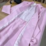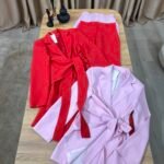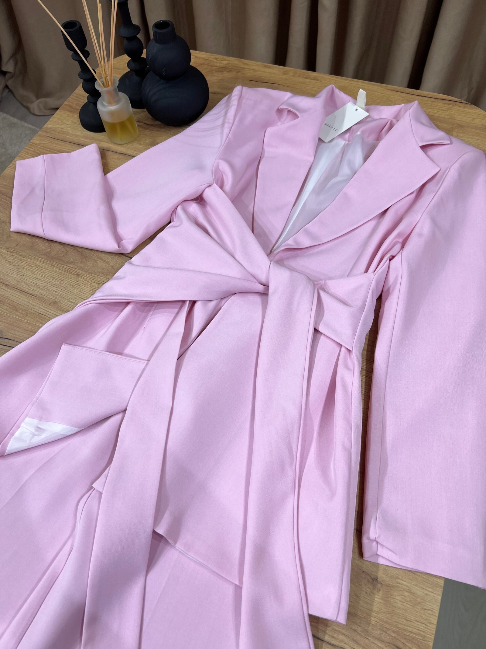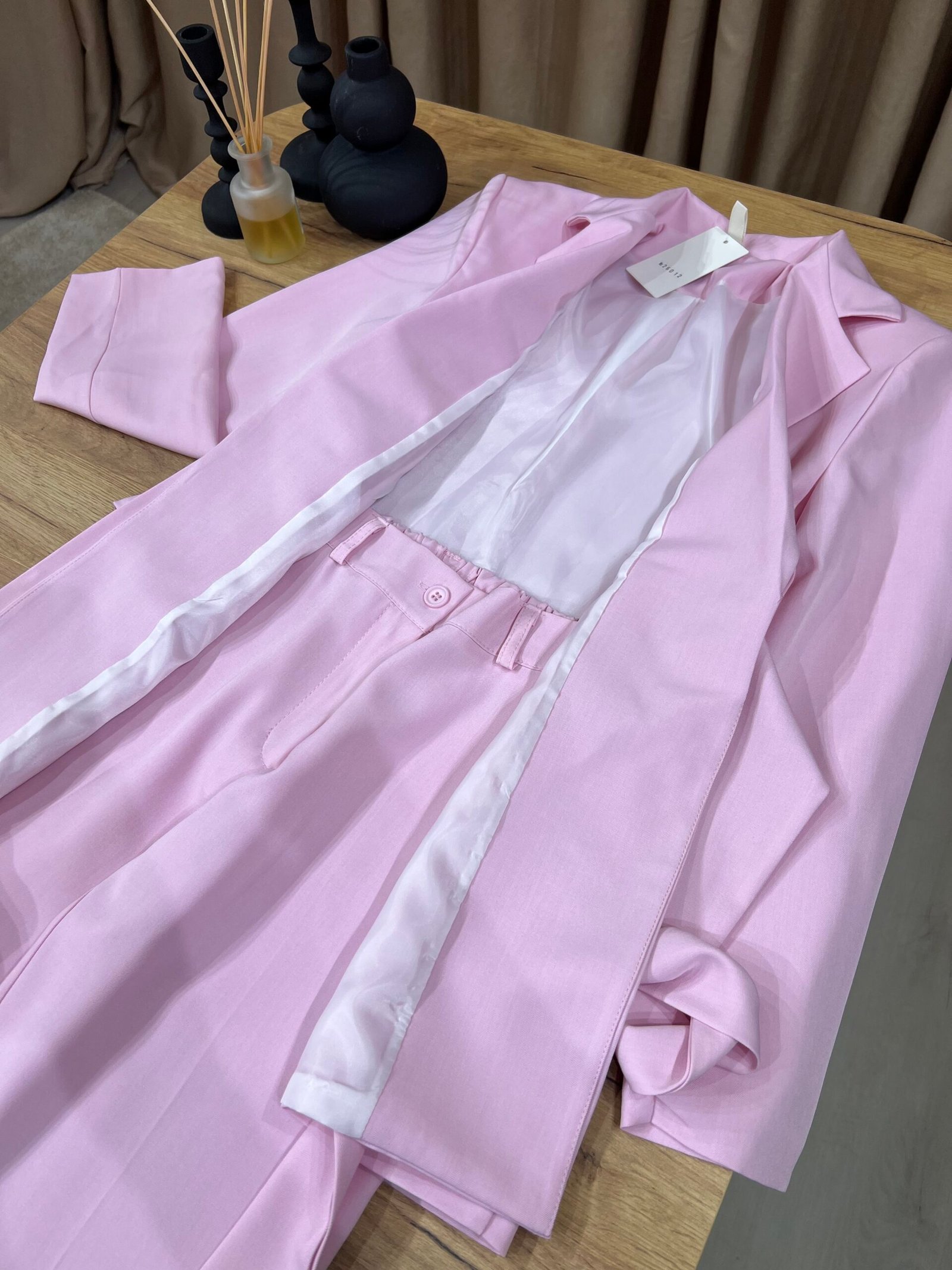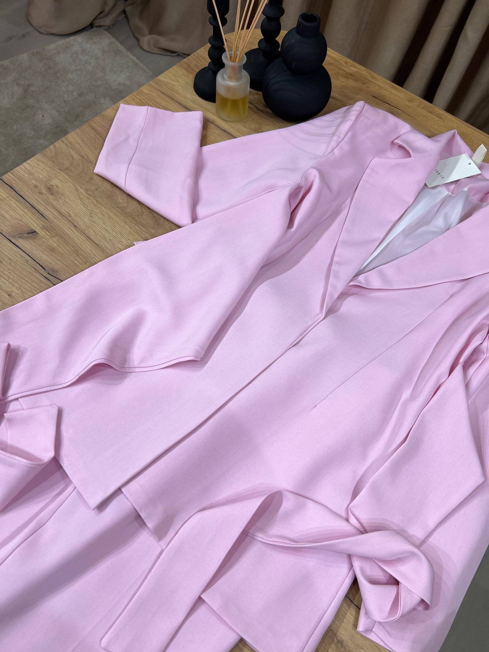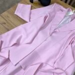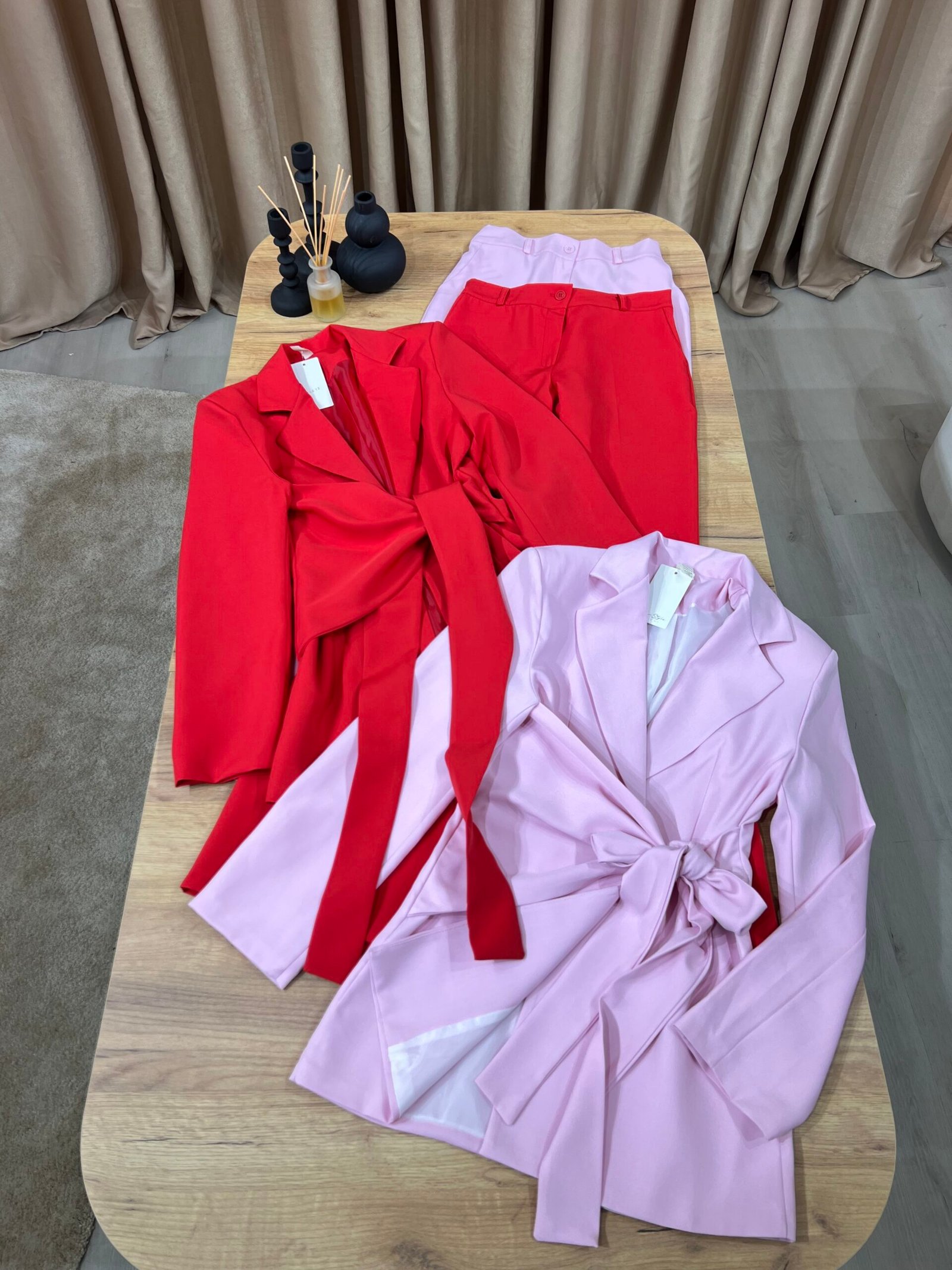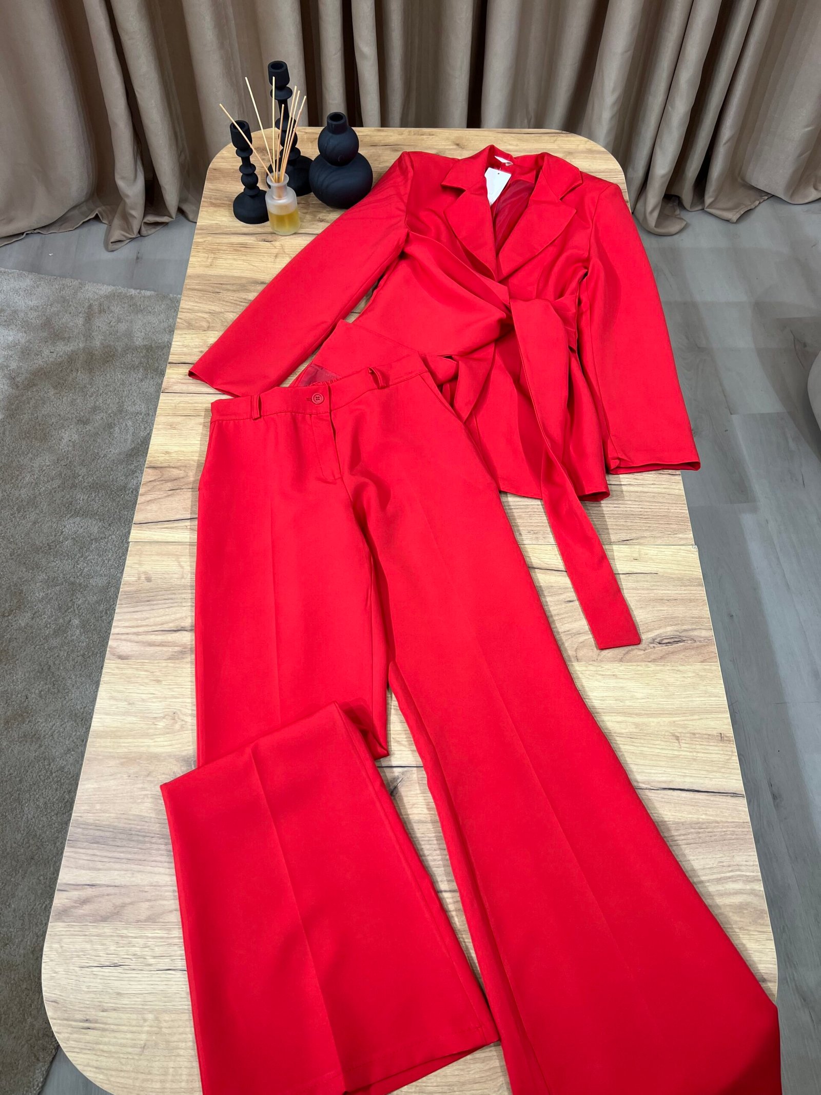 Kostum elegant i përbërë nga xhaketë me jakë klasike dhe rrip në bel që thekson siluetën, i kombinuar me pantallona të gjera me prerje moderne. Model formal dhe shumë chic, ideal për zyrë, evente, takime biznesi apo dalje elegante.