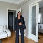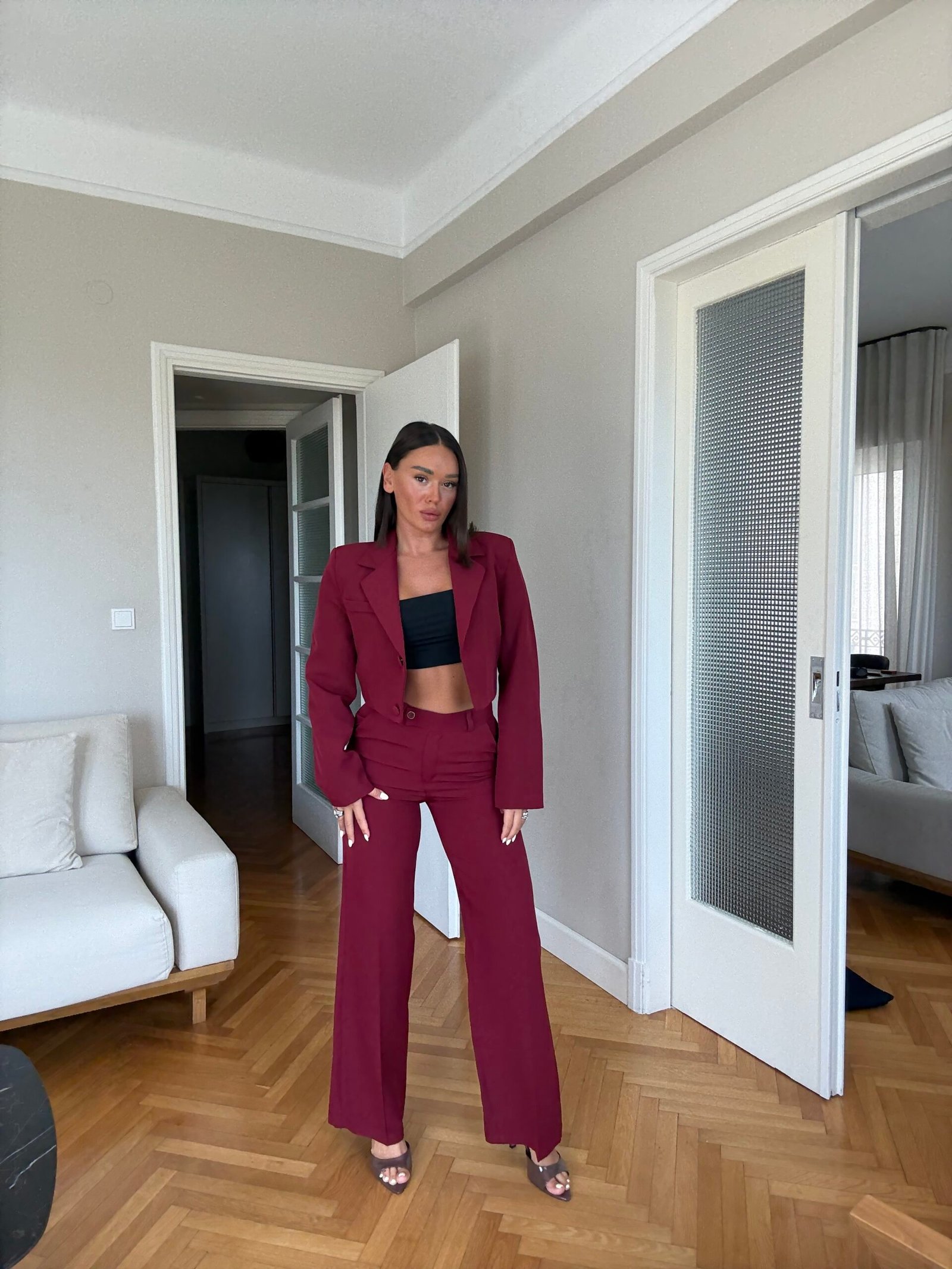 I përbërë nga pantallona me bel të lartë dhe prerje wide leg, kombinohet sipas dëshirës me një xhaketë crop me prerje të shkurtër e moderne.