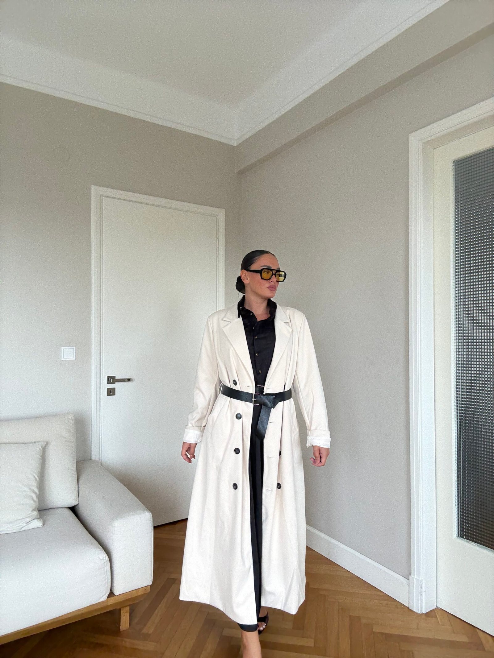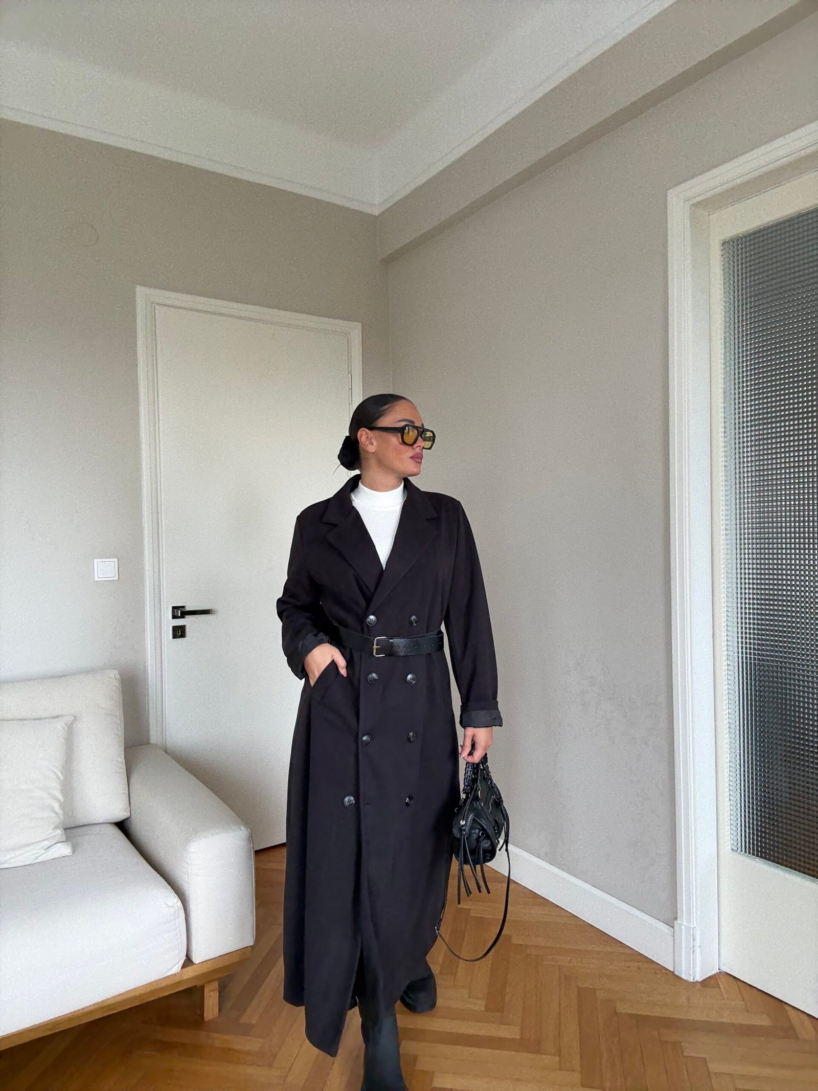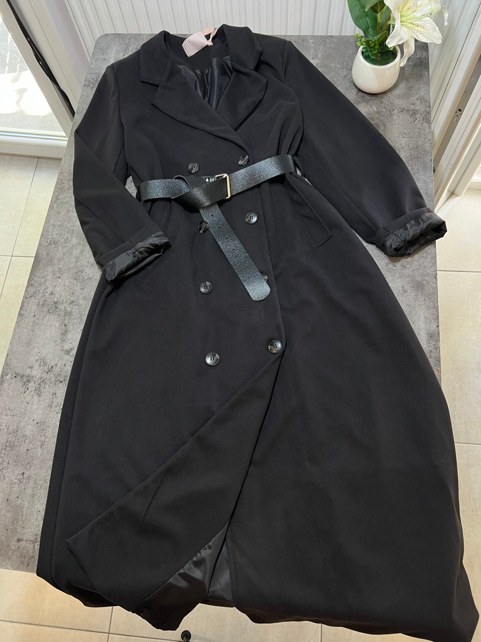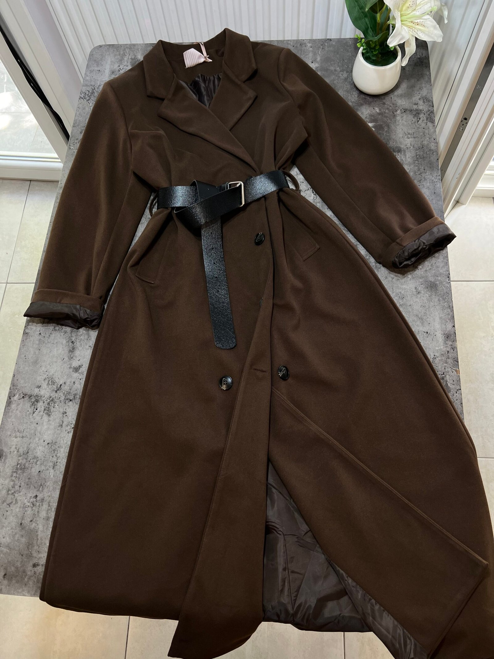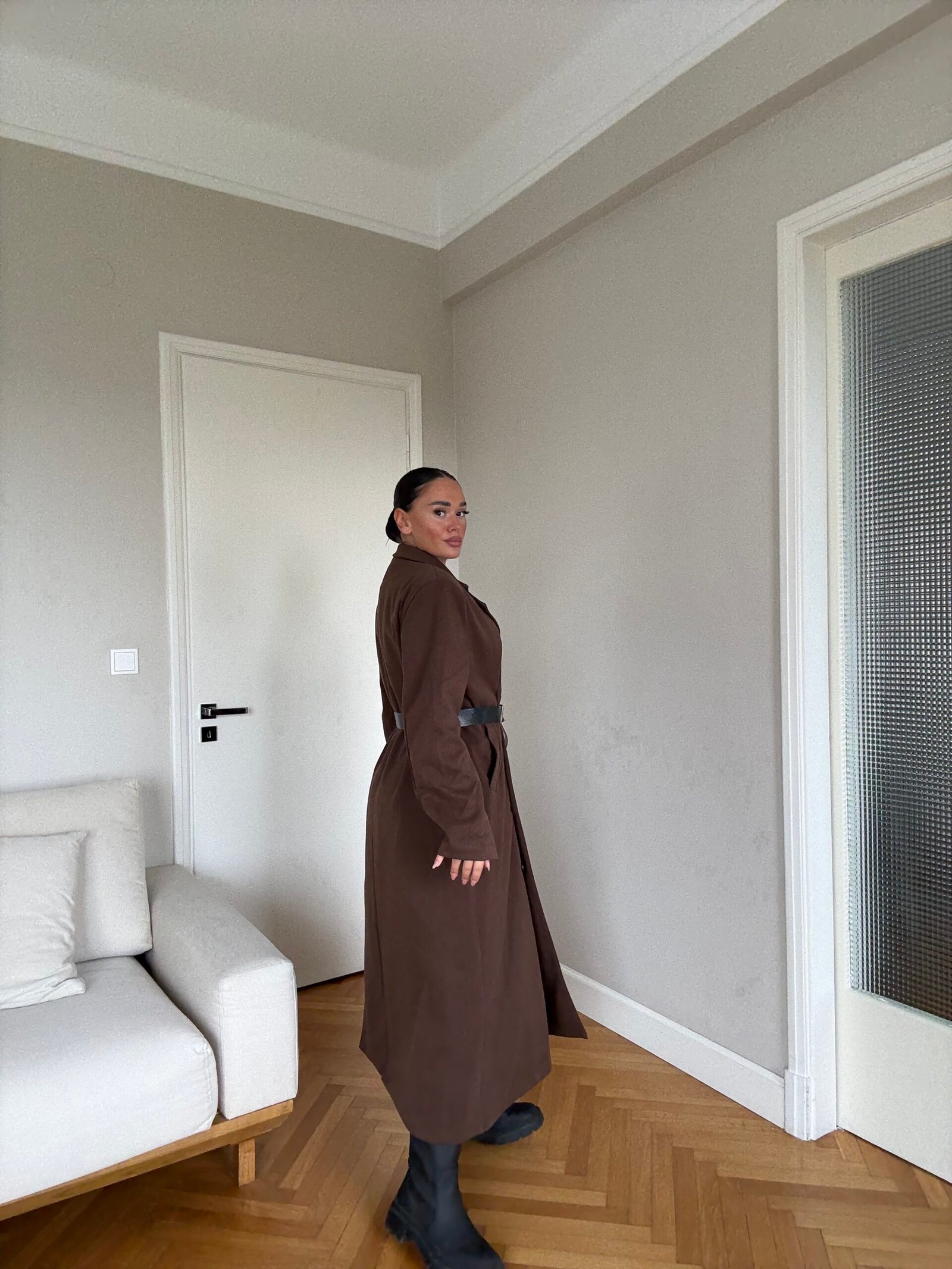 Pallto elegante e gjatë me prerje klasike dhe mbërthim me dopio kopsa përpara, e pajisur me brez në bel që thekson siluetën dhe shton finesë. Materiali cilësor ofron rehati dhe mbulim të plotë, duke e bërë të përshtatshme për përditshmëri dhe raste të veçanta. Një veshje që i jep stil modern dhe pamje të kuruar çdo kombinimi.