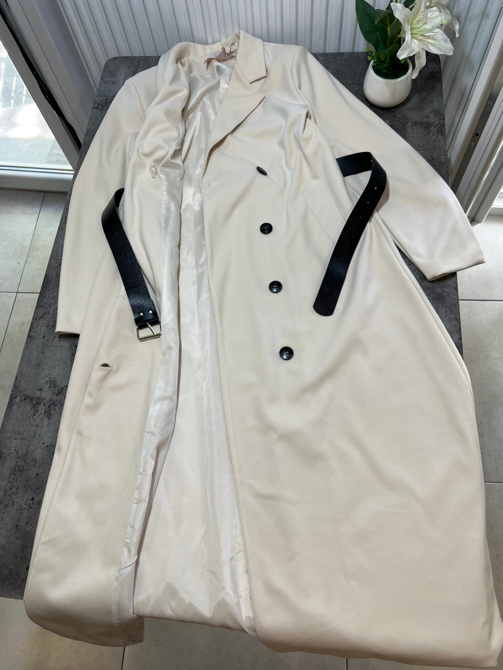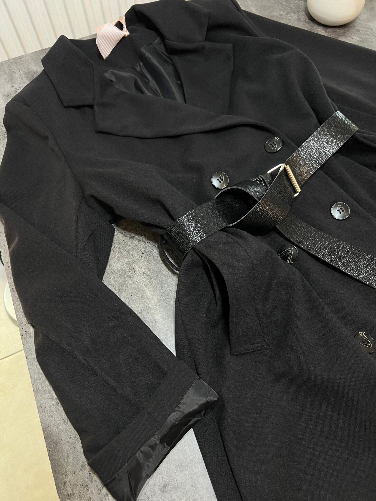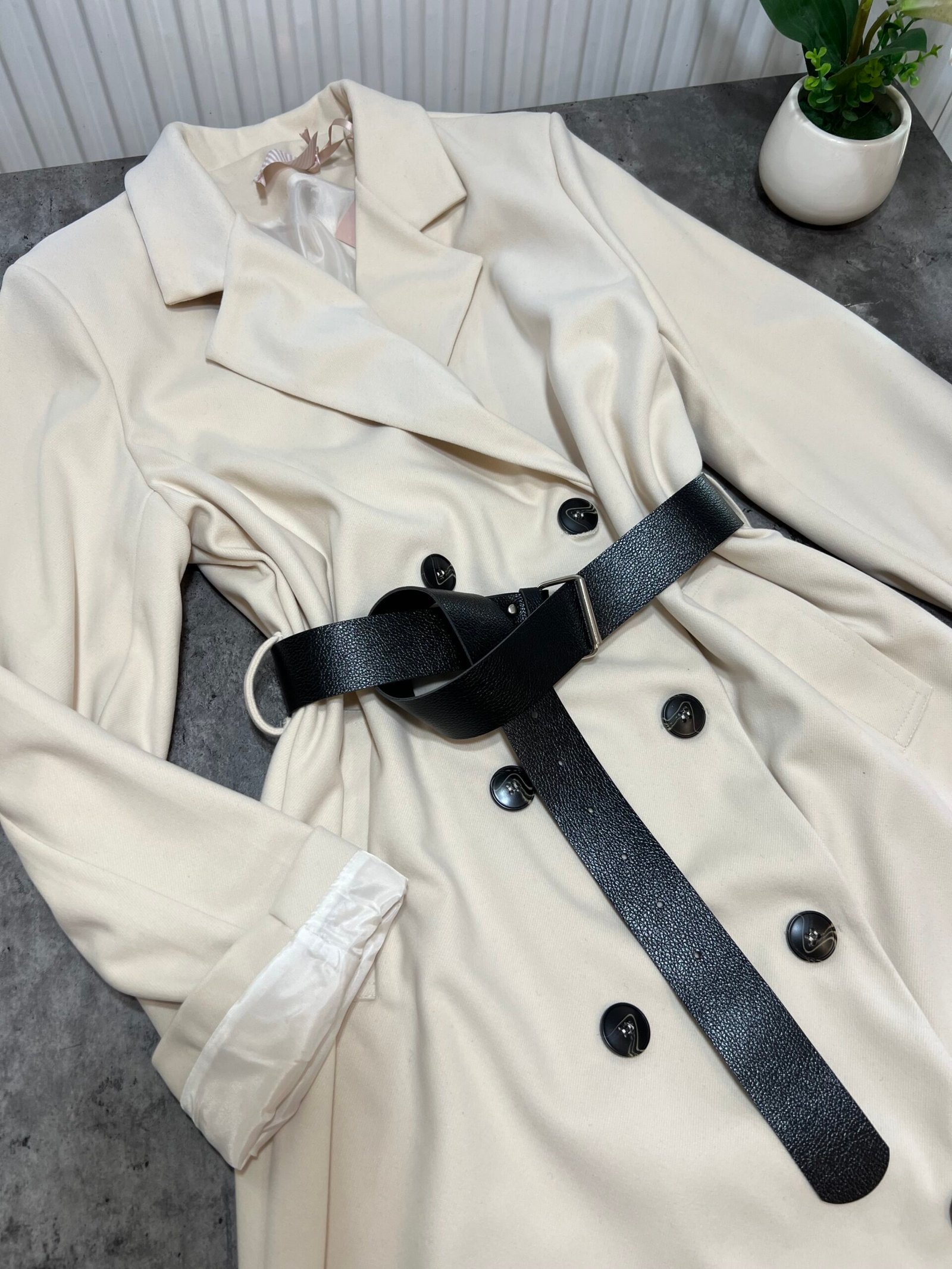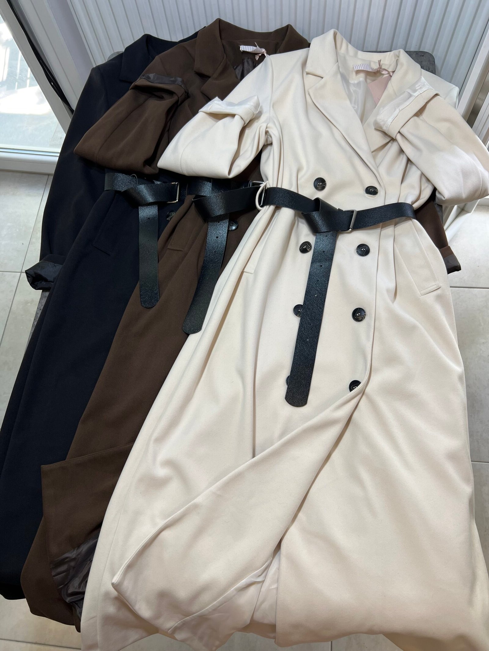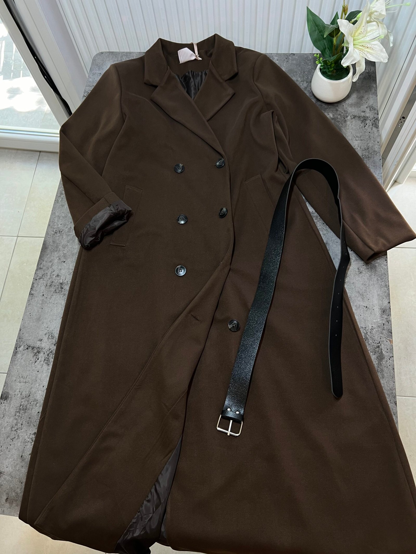 Pallto elegante e gjatë me prerje klasike dhe mbërthim me dopio kopsa përpara, e pajisur me brez në bel që thekson siluetën dhe shton finesë. Materiali cilësor ofron rehati dhe mbulim të plotë, duke e bërë të përshtatshme për përditshmëri dhe raste të veçanta. Një veshje që i jep stil modern dhe pamje të kuruar çdo kombinimi.