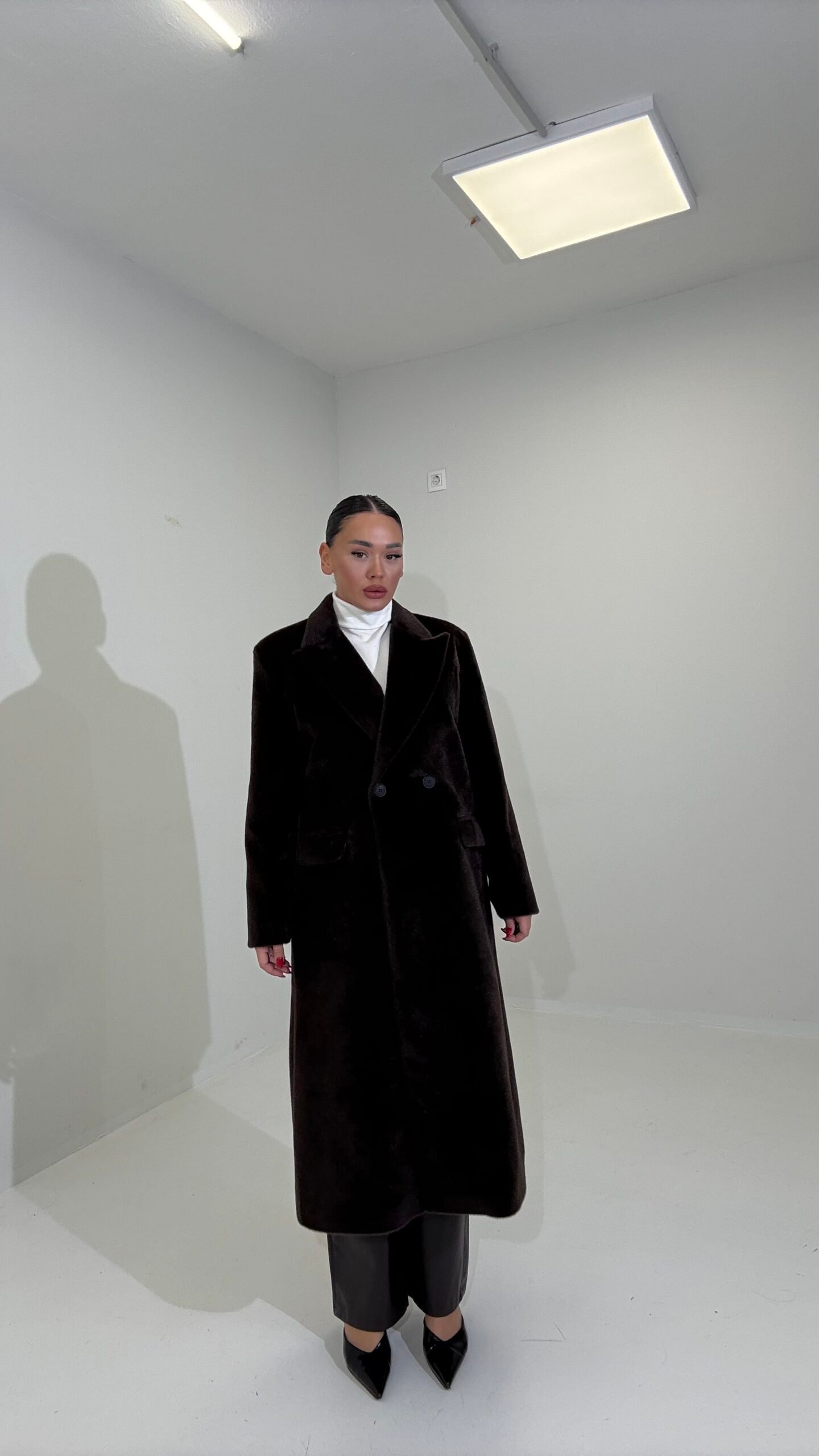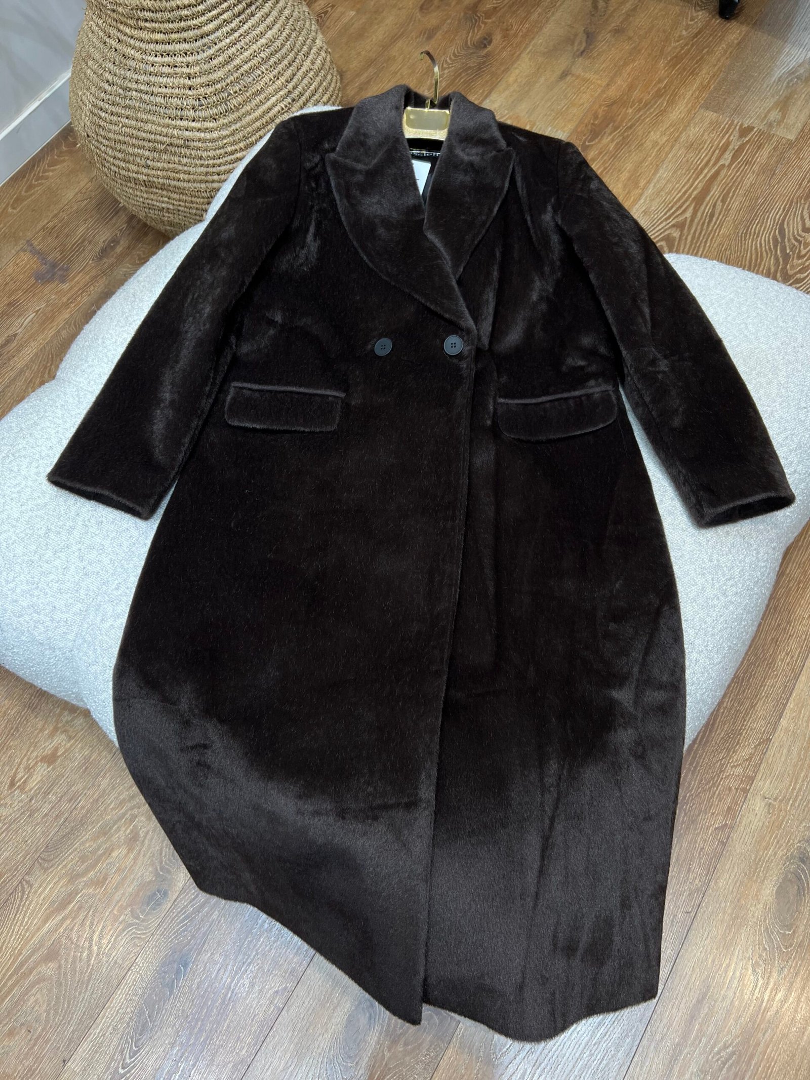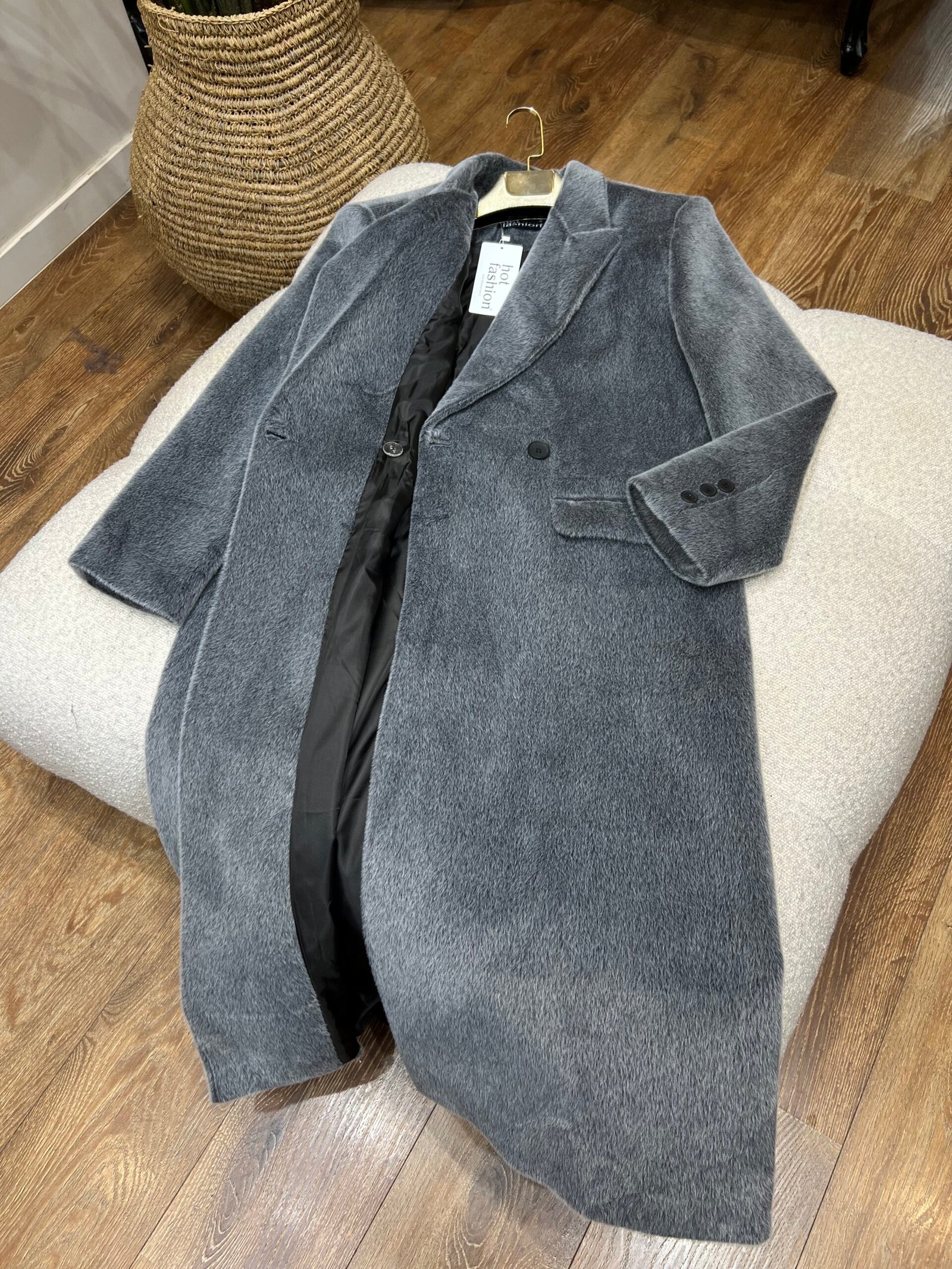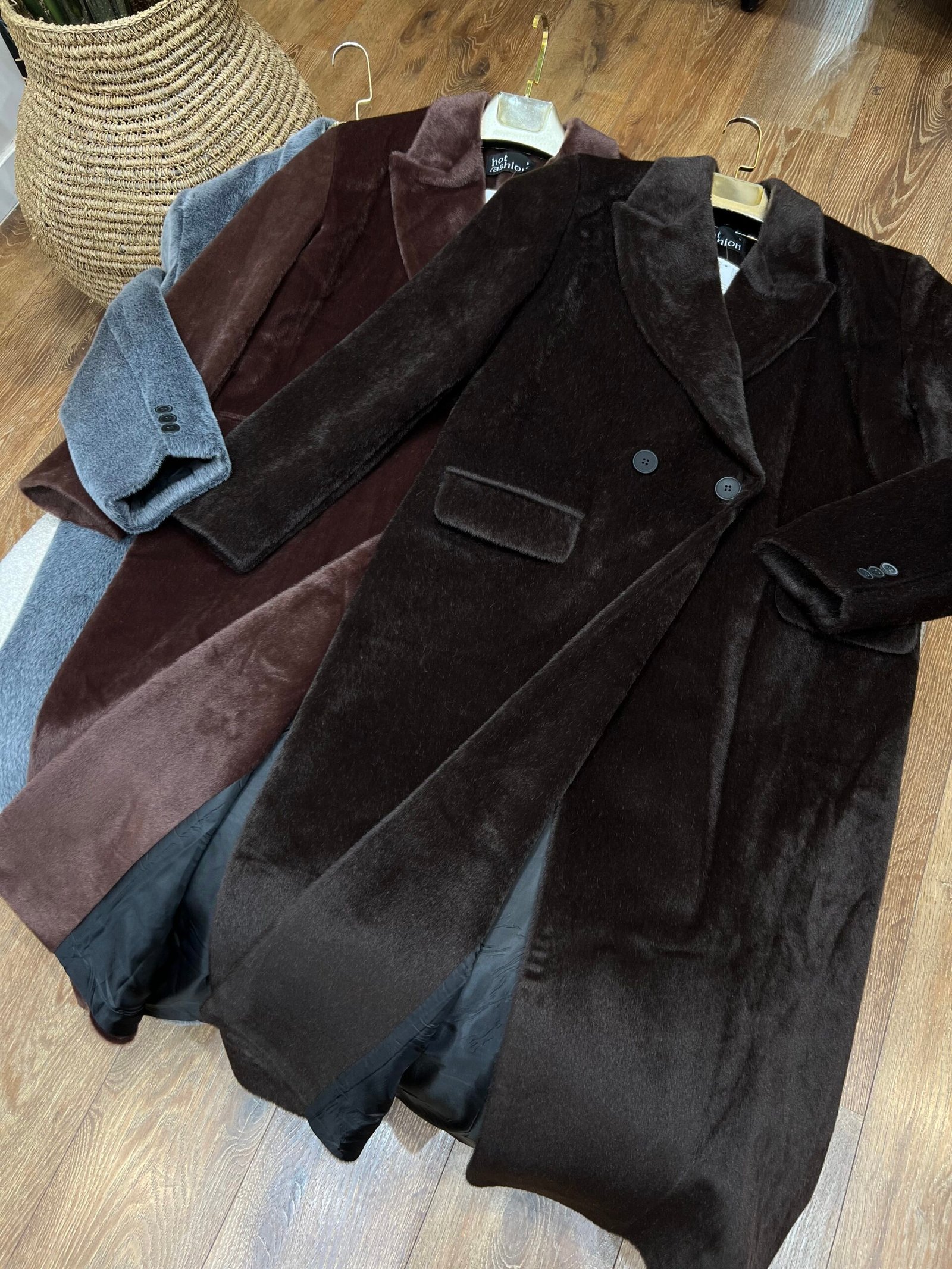 Pallto e gjatë me teksturë të butë që sjell një pamje luksoze dhe të rafinuar në çdo kombinim. Prerja elegante dhe linjat e pastra krijojnë një siluetë të kuruar, ndërsa materiali i ngrohtë siguron rehati gjatë sezonit të ftohtë. Detajet e punuara dhe mbyllja klasike e bëjnë këtë model perfekt si për përditshmërinë, ashtu edhe për daljet më të veçanta. Një pallto që tërheq vëmendjen dhe shton finesë pa mundim.