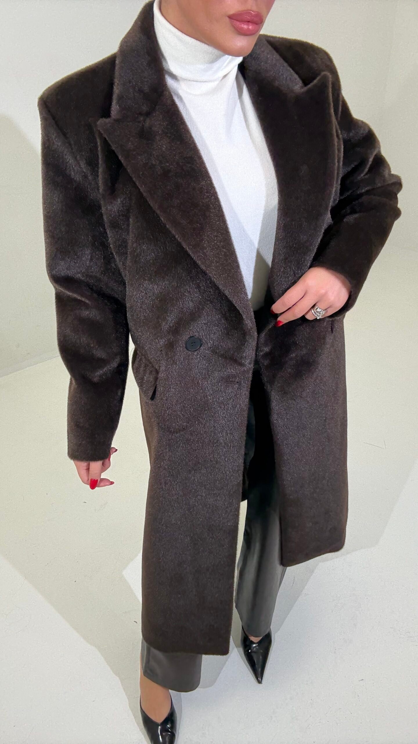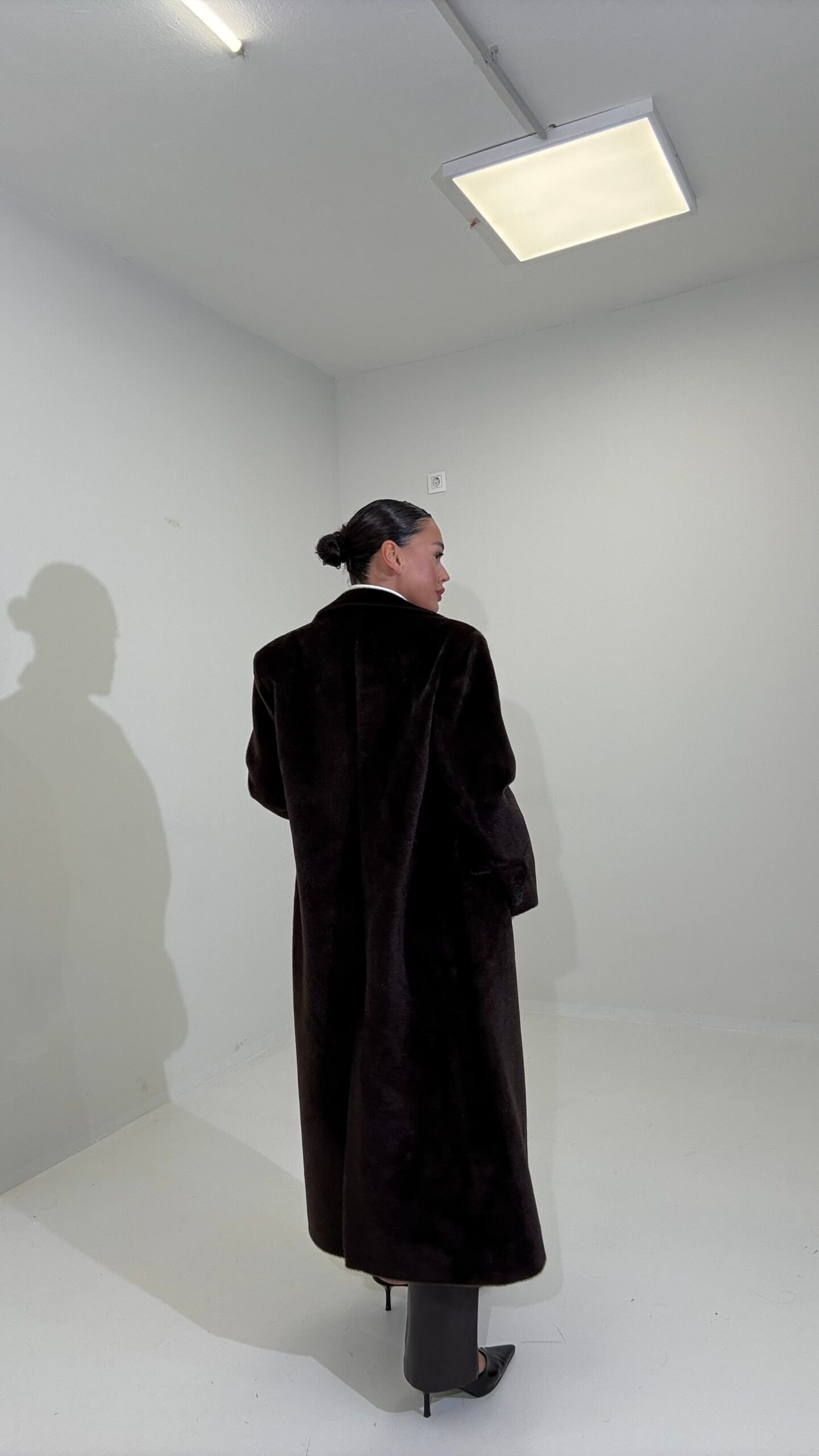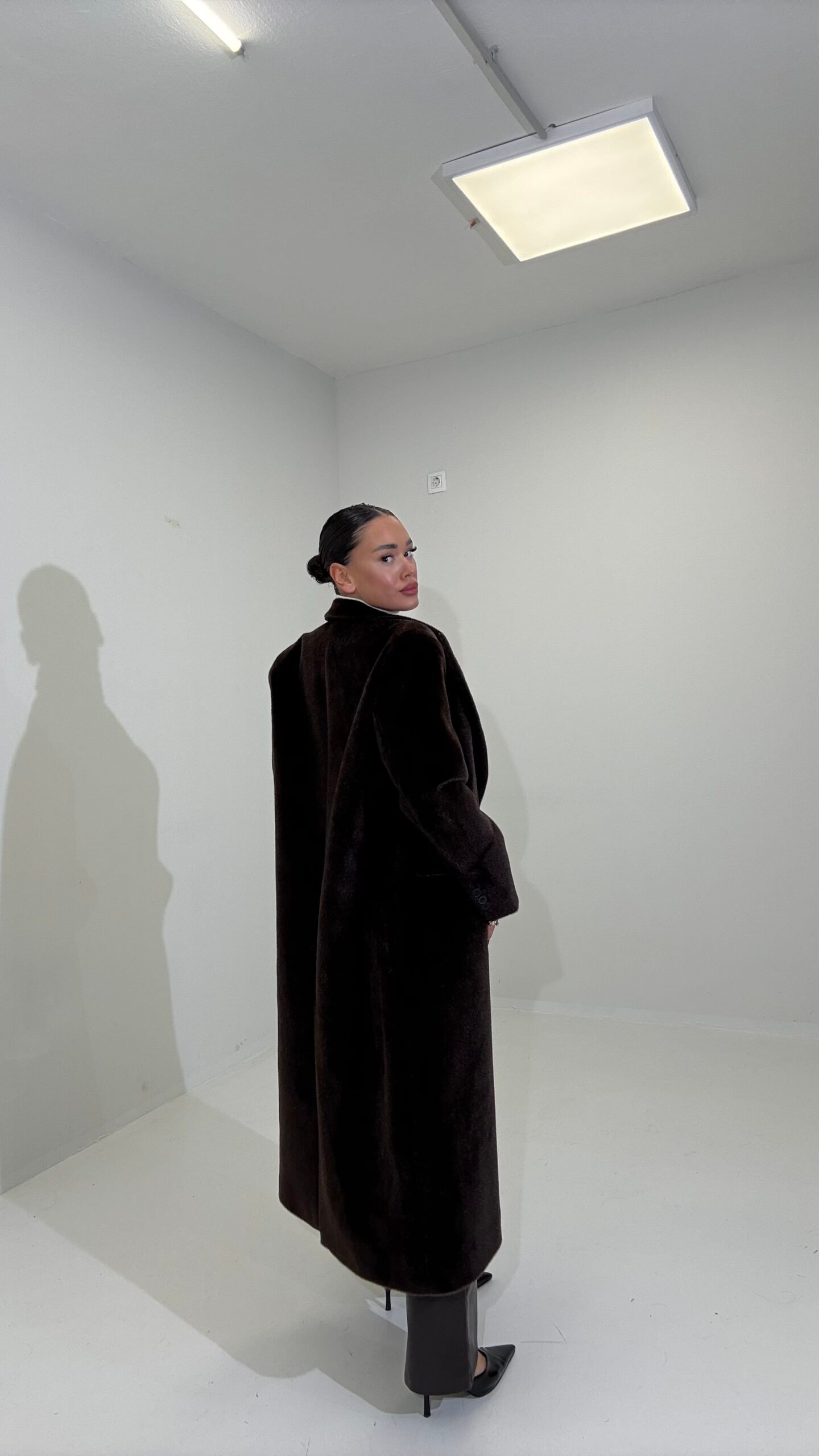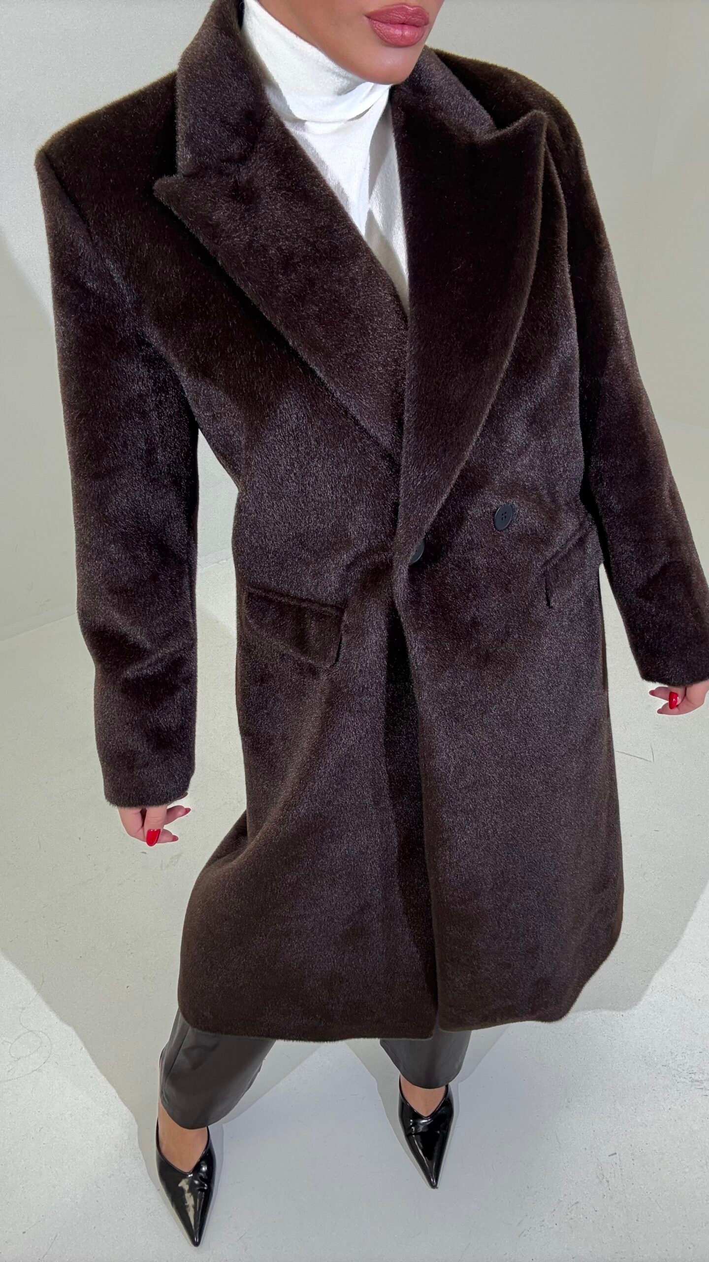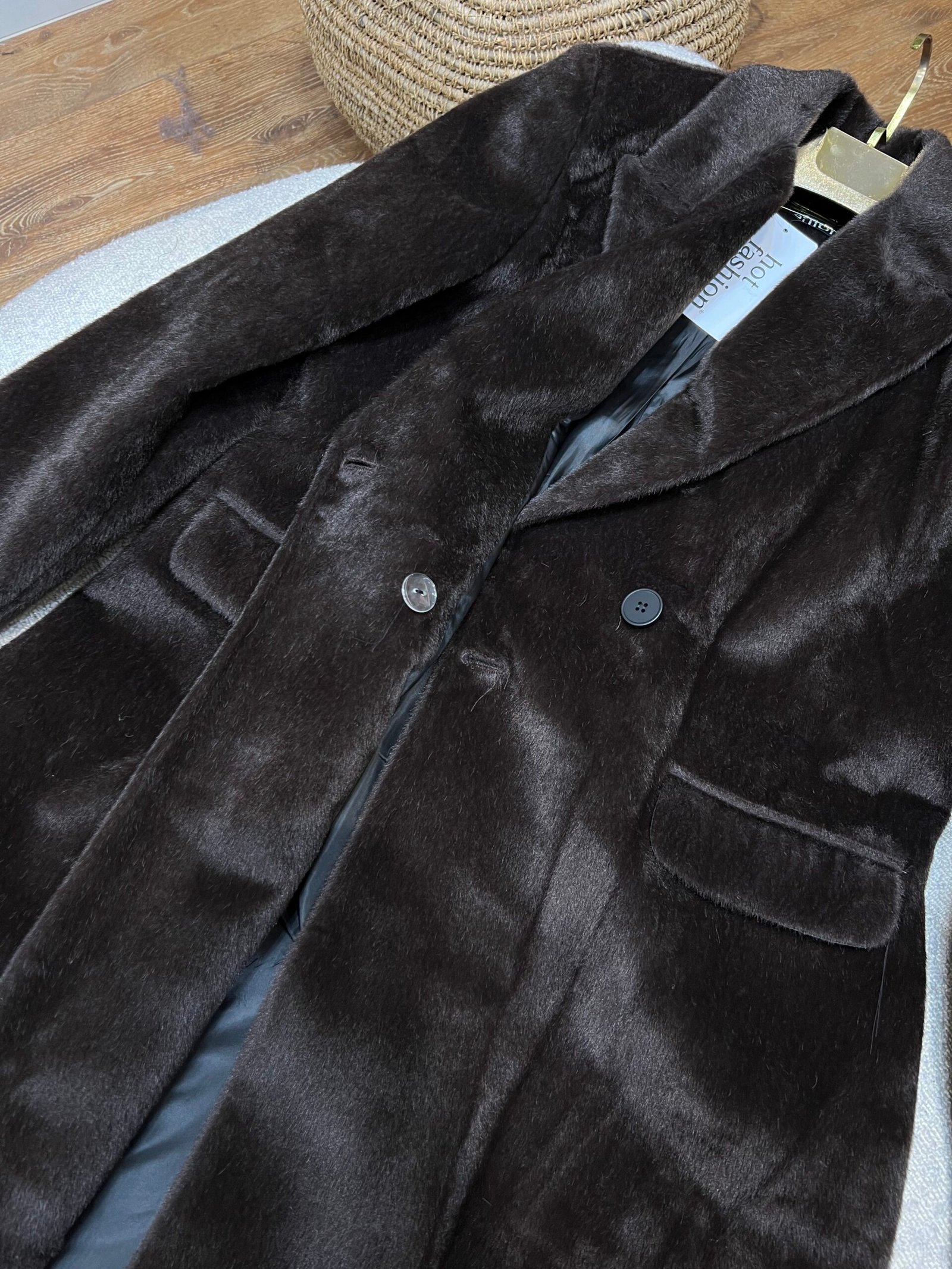 Pallto e gjatë me teksturë të butë që sjell një pamje luksoze dhe të rafinuar në çdo kombinim. Prerja elegante dhe linjat e pastra krijojnë një siluetë të kuruar, ndërsa materiali i ngrohtë siguron rehati gjatë sezonit të ftohtë. Detajet e punuara dhe mbyllja klasike e bëjnë këtë model perfekt si për përditshmërinë, ashtu edhe për daljet më të veçanta. Një pallto që tërheq vëmendjen dhe shton finesë pa mundim.