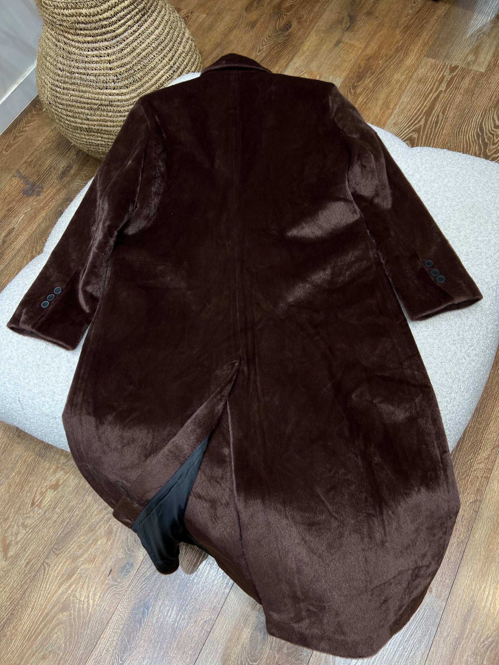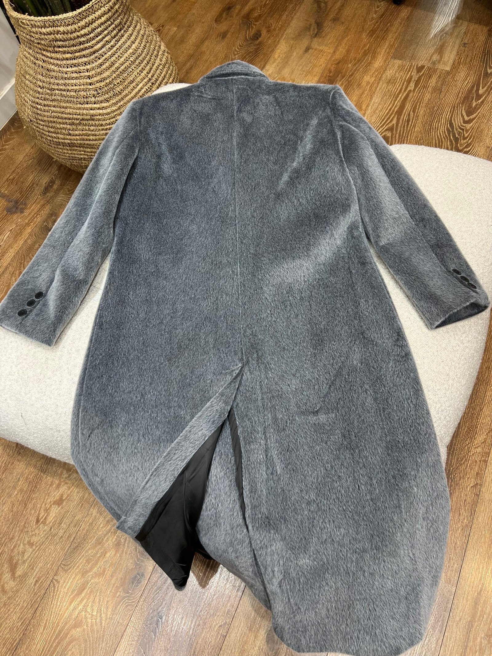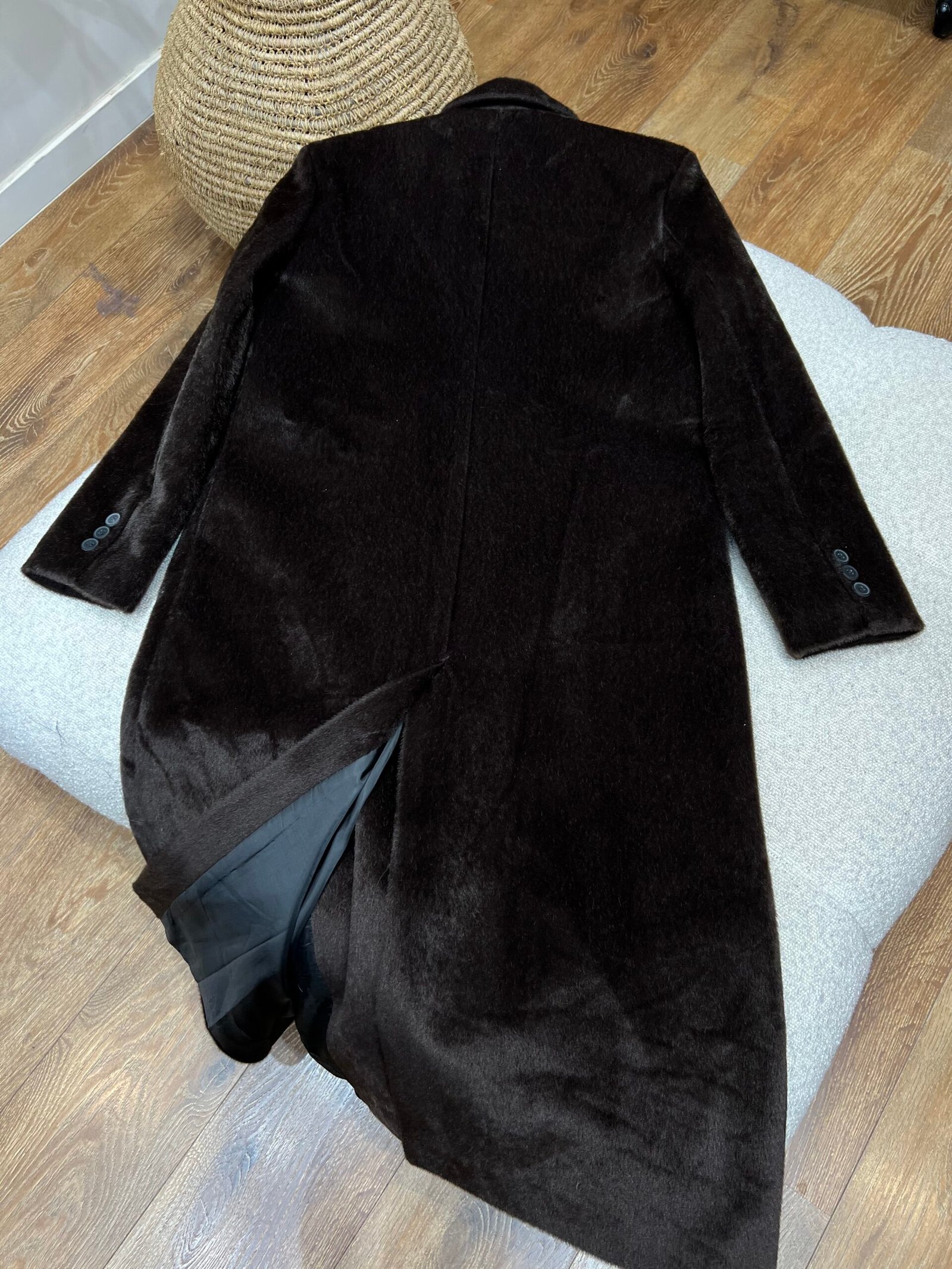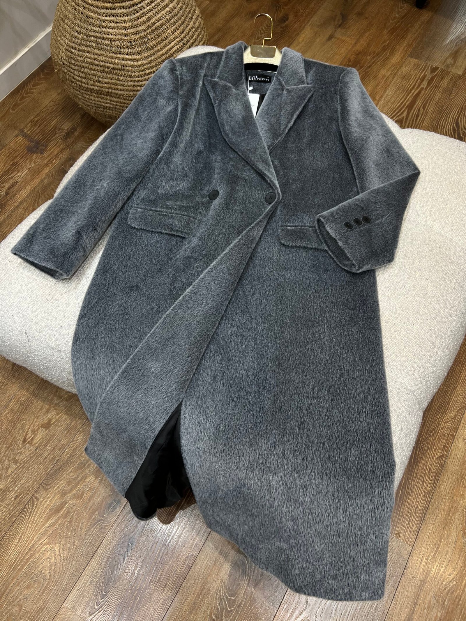 Pallto e gjatë me teksturë të butë që sjell një pamje luksoze dhe të rafinuar në çdo kombinim. Prerja elegante dhe linjat e pastra krijojnë një siluetë të kuruar, ndërsa materiali i ngrohtë siguron rehati gjatë sezonit të ftohtë. Detajet e punuara dhe mbyllja klasike e bëjnë këtë model perfekt si për përditshmërinë, ashtu edhe për daljet më të veçanta. Një pallto që tërheq vëmendjen dhe shton finesë pa mundim.