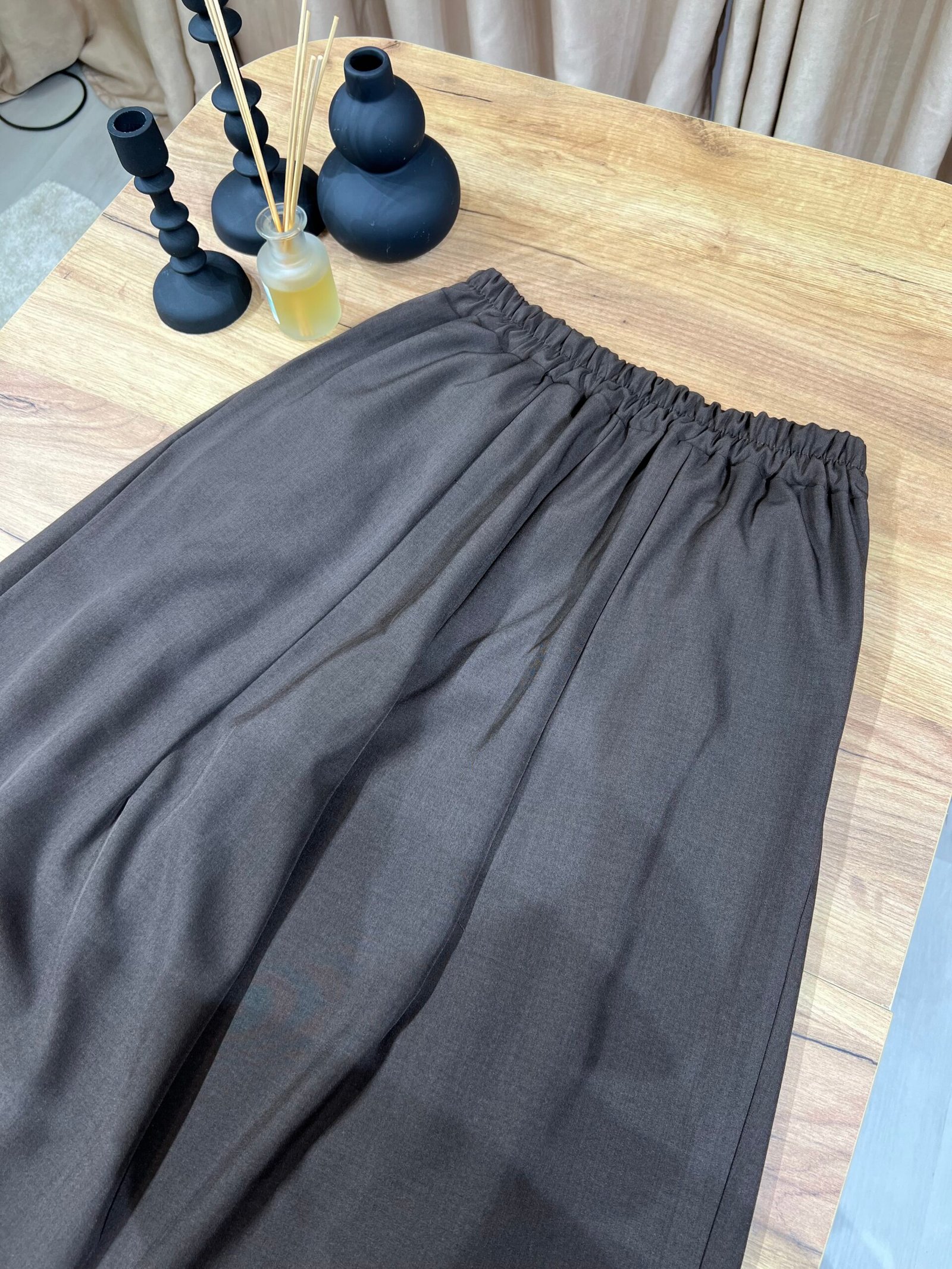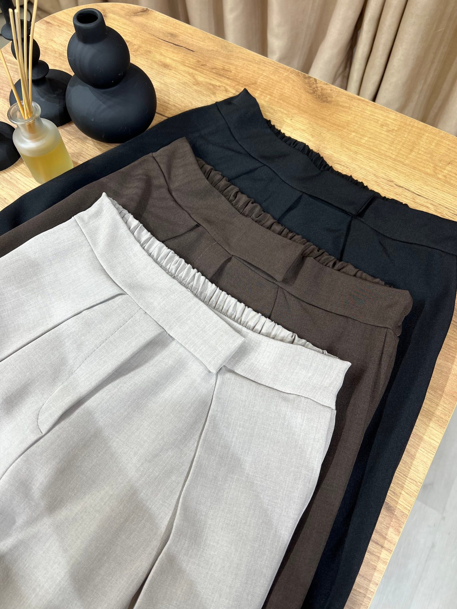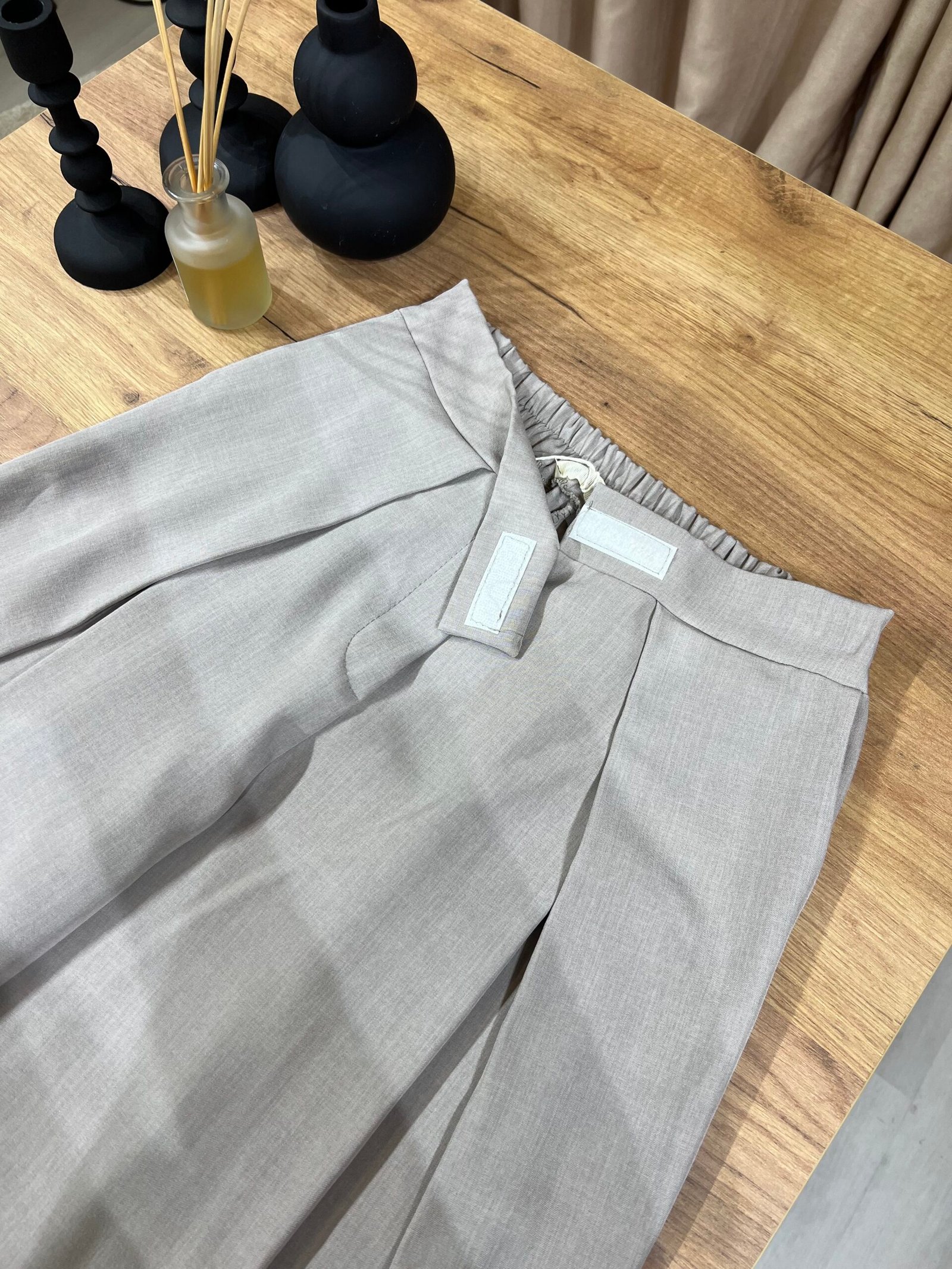 Pantallona klasike me pala përpara dhe prerje të gjerë, që krijojnë një siluetë elegante dhe të strukturuar. Dizajn minimalist dhe bel i rregullt, ideale për zyrë, kombinime formale ose look-e smart-casual me stil të pastër dhe modern.