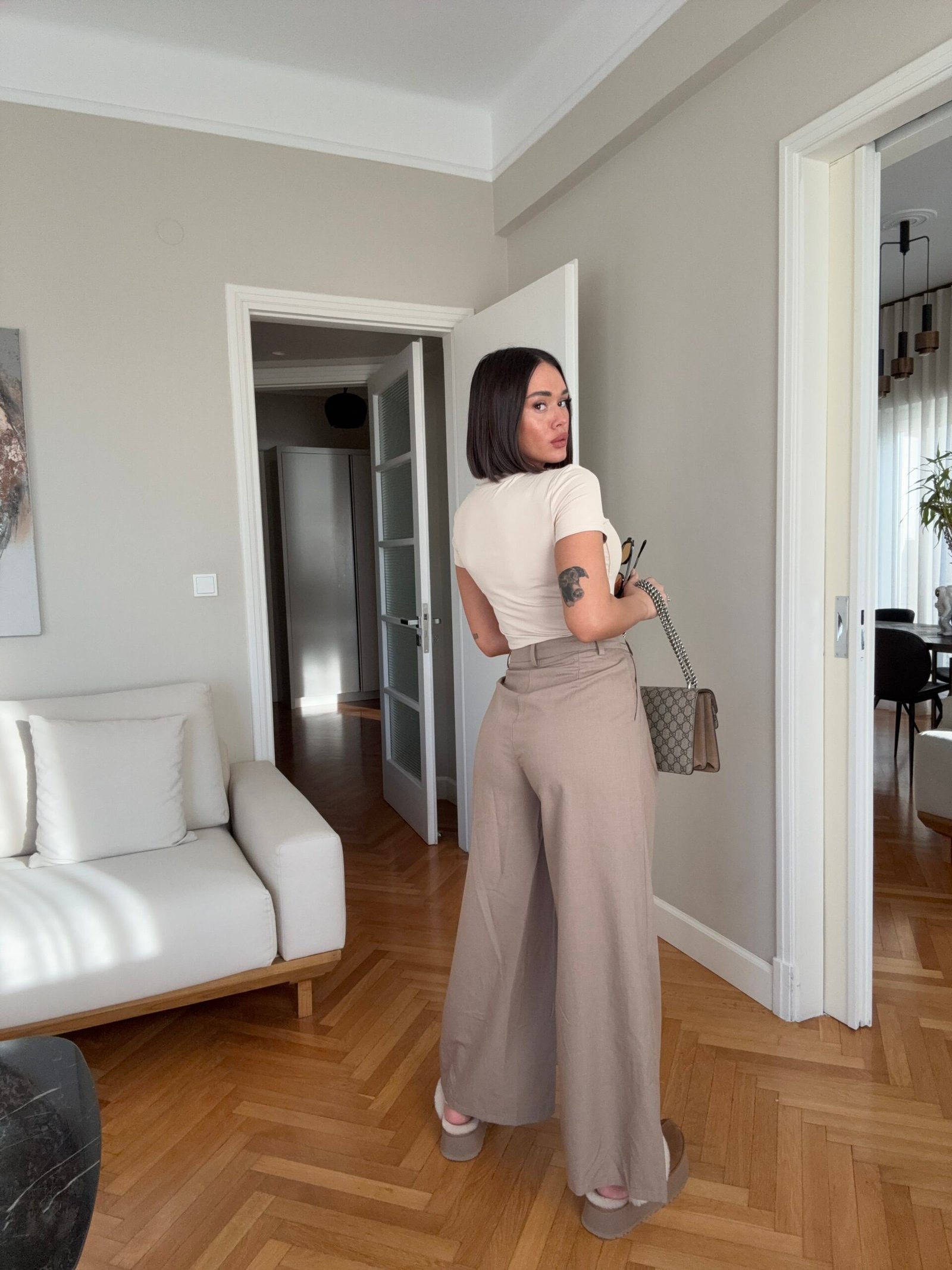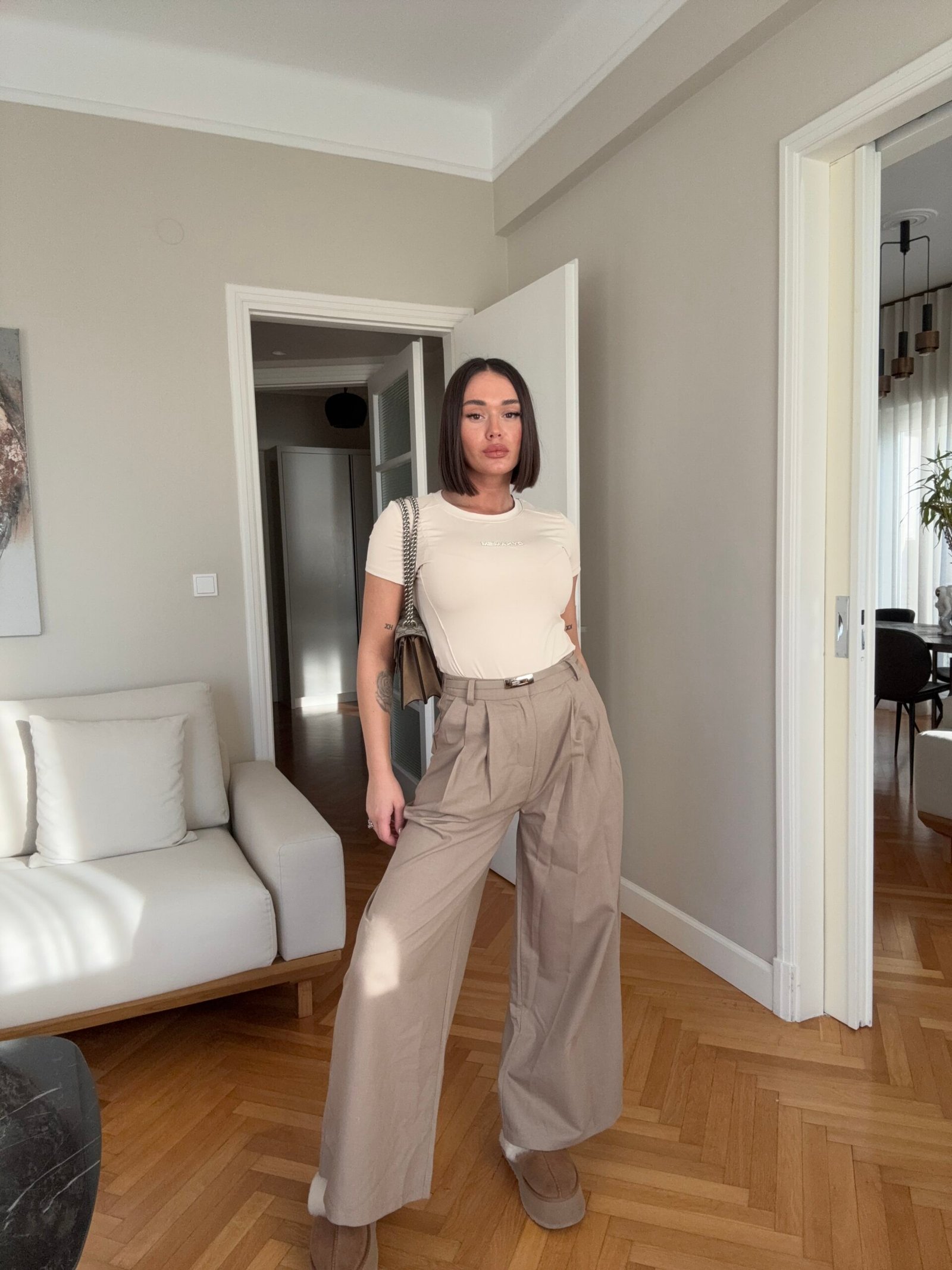 Me bel të larte, vijnë ne prerje të gjërë fundore. Theksojne belin dhe vithet, përmbajne xhepa funksionale. Qepje me penca, detaje rripi lëkure në pjesën e belit.