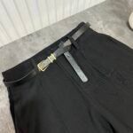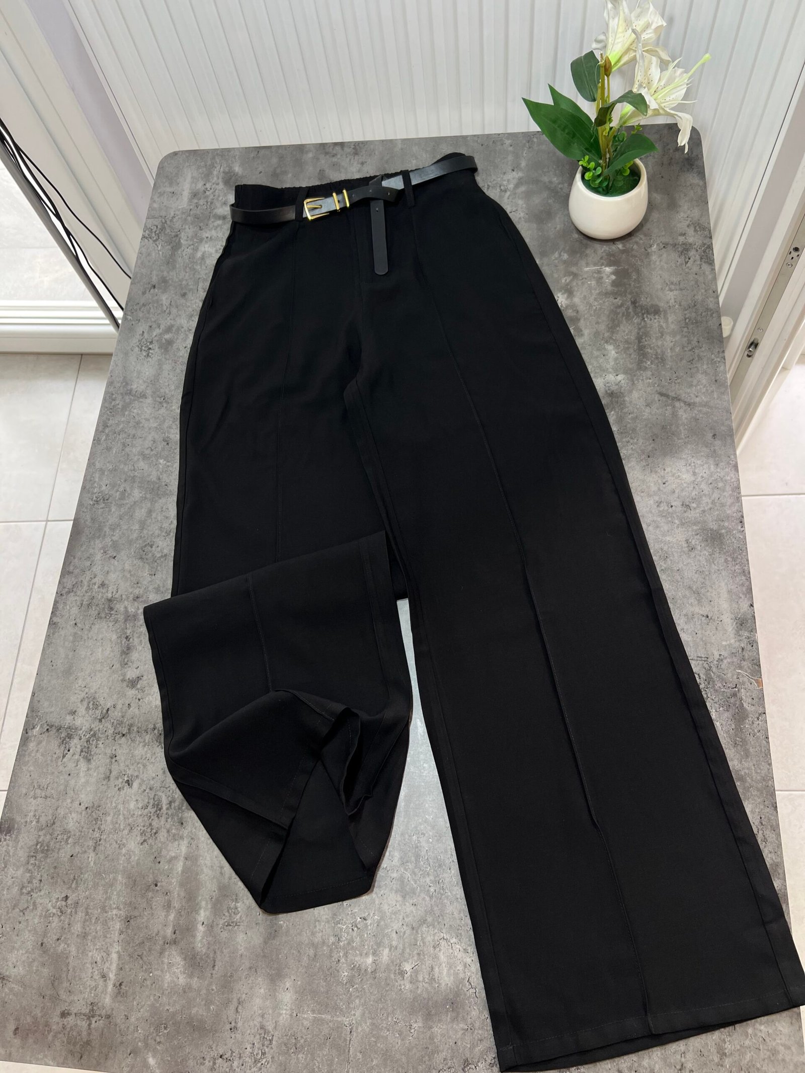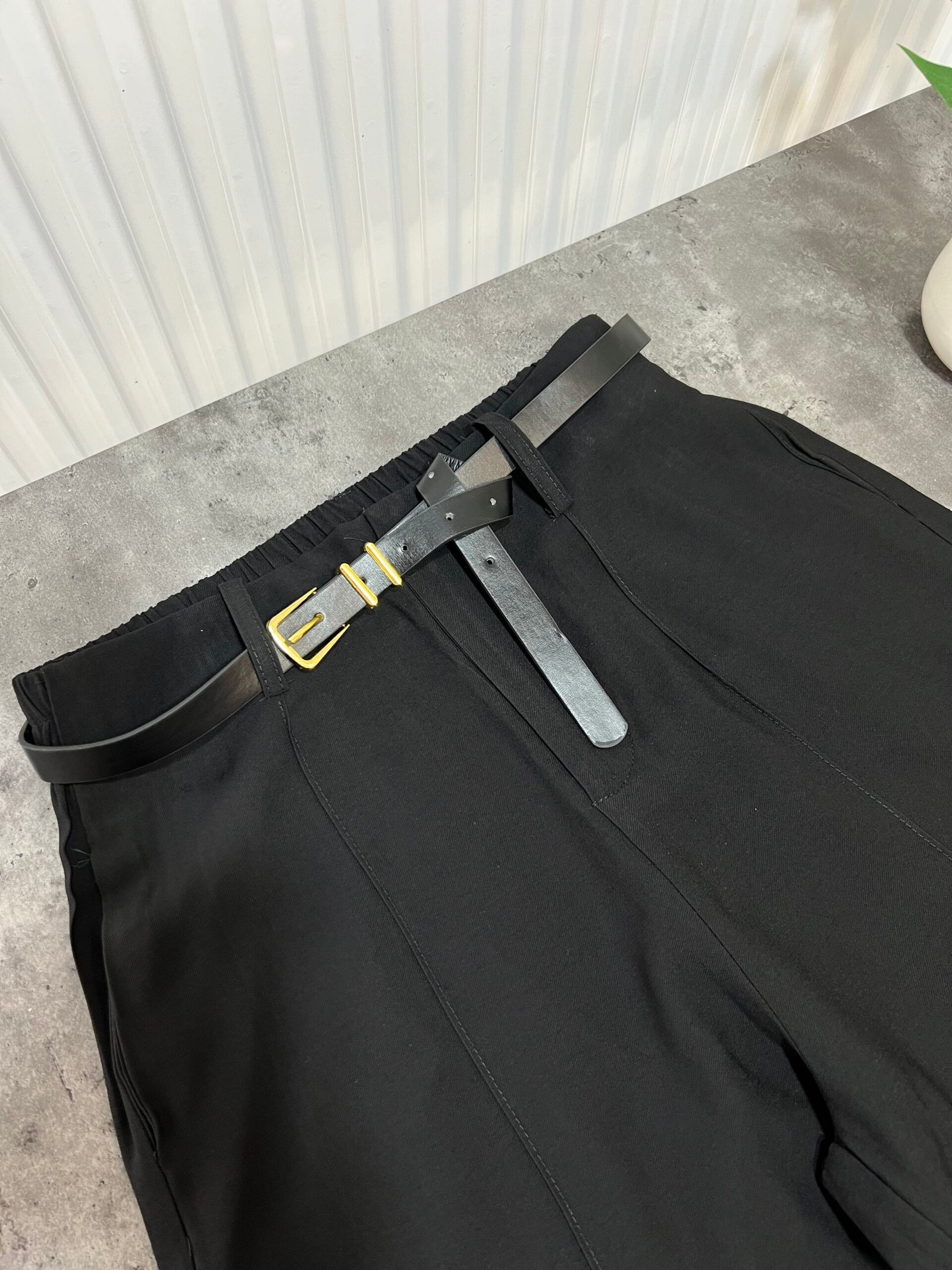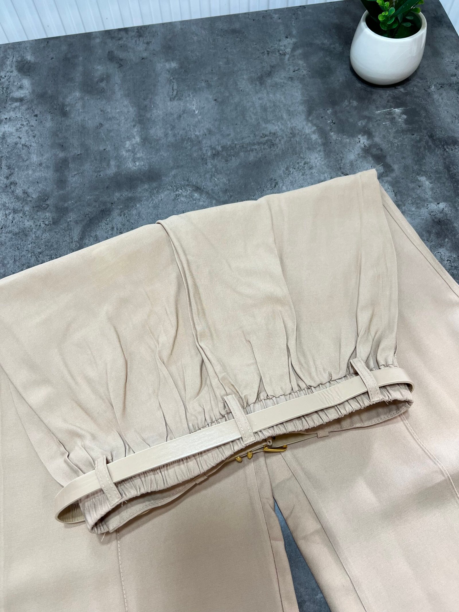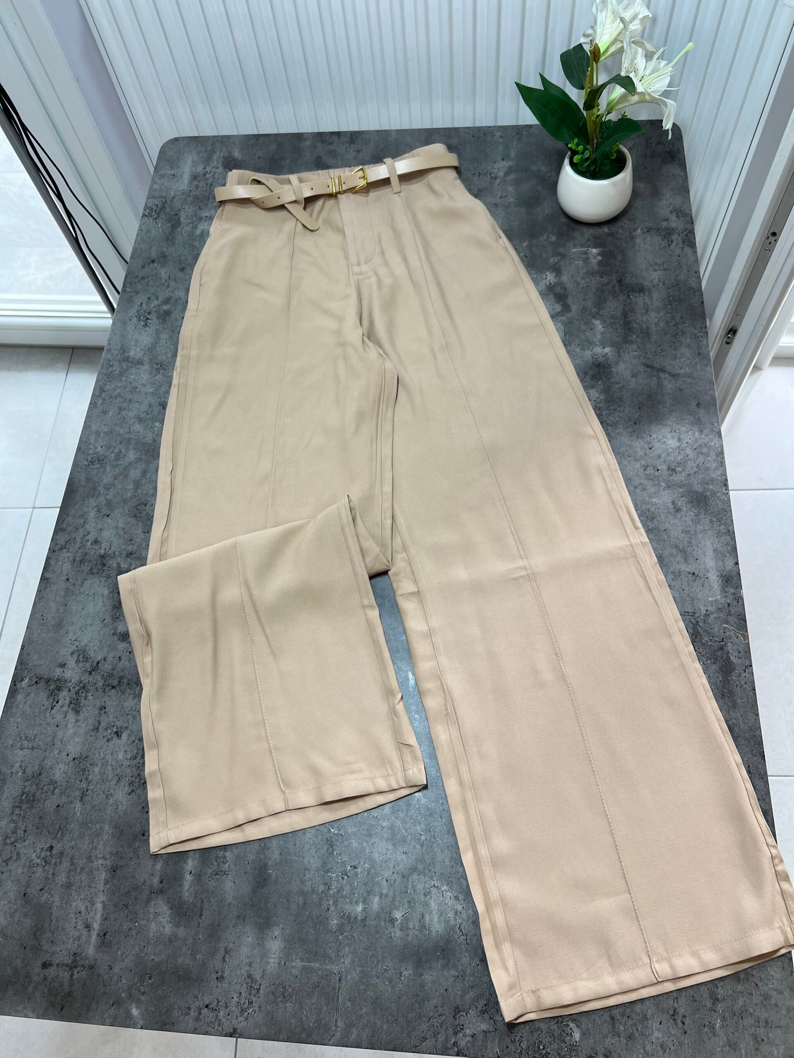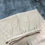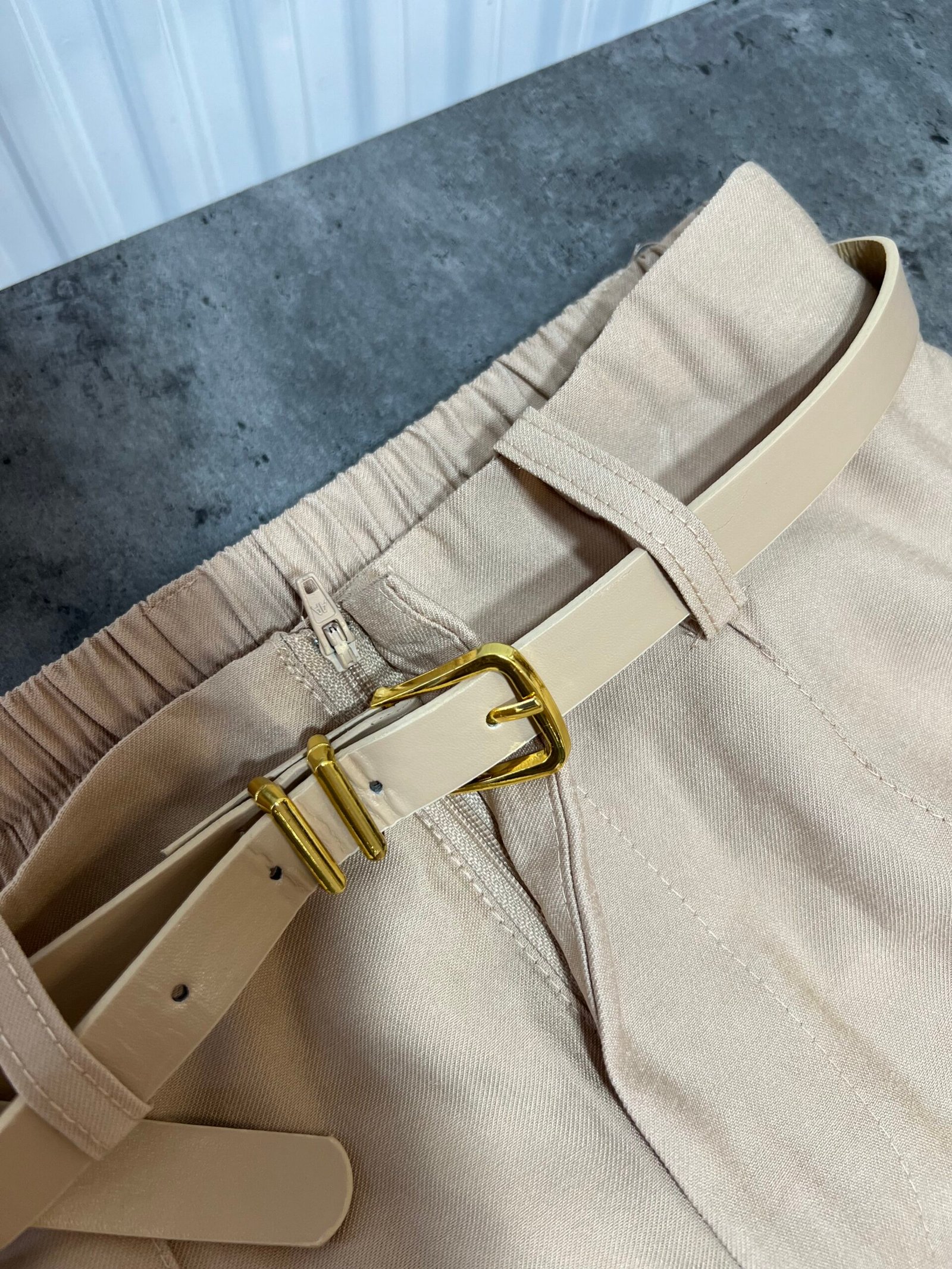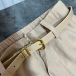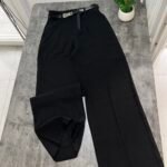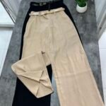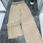 Me bel të lartë, me rrip të përfshire dhe xhepa funksionale. Me qepje tegeli përgjate gjithë gjatësisë. Prerje paralel. Me llastik në bel në pjesën pas. Material i lehtë pranveror.