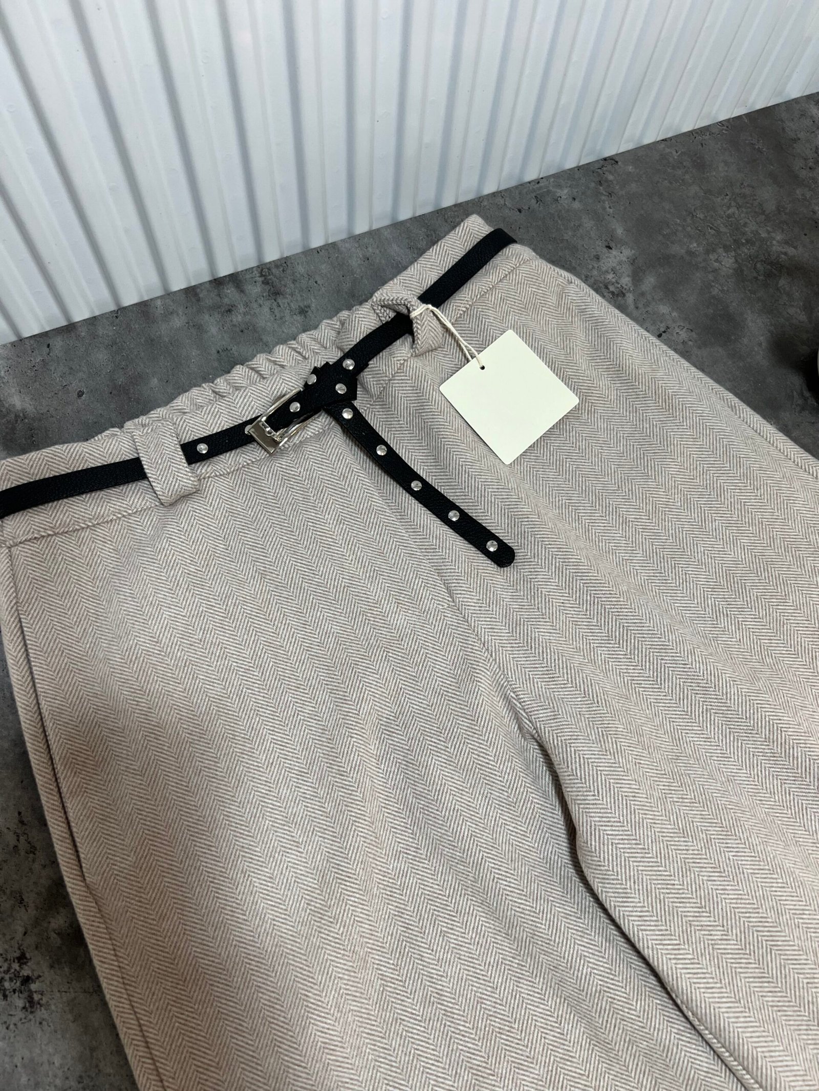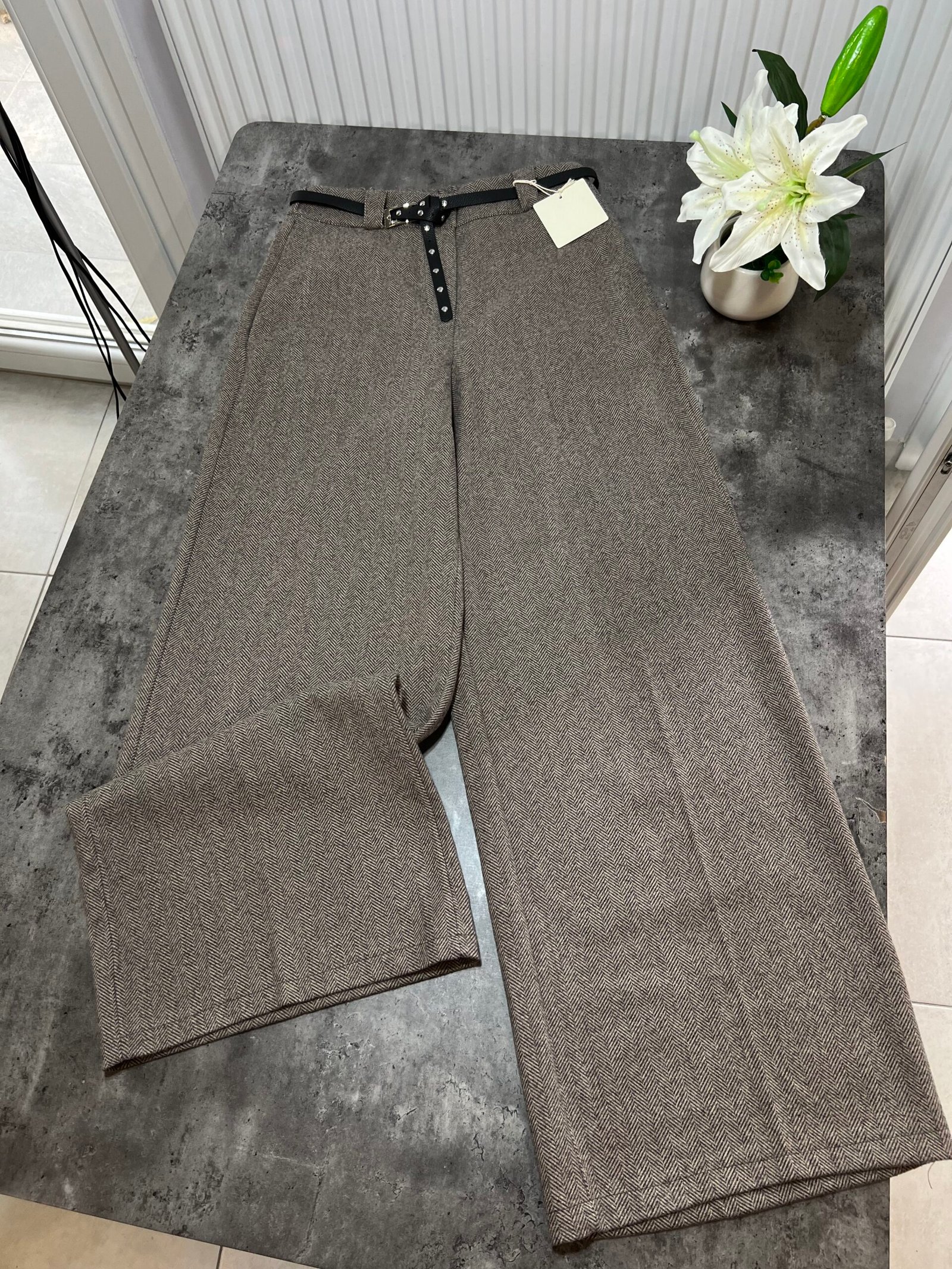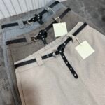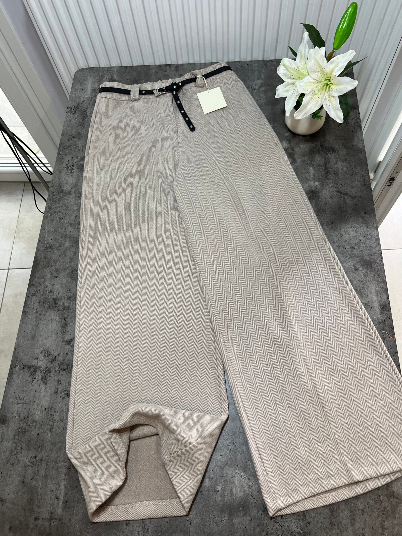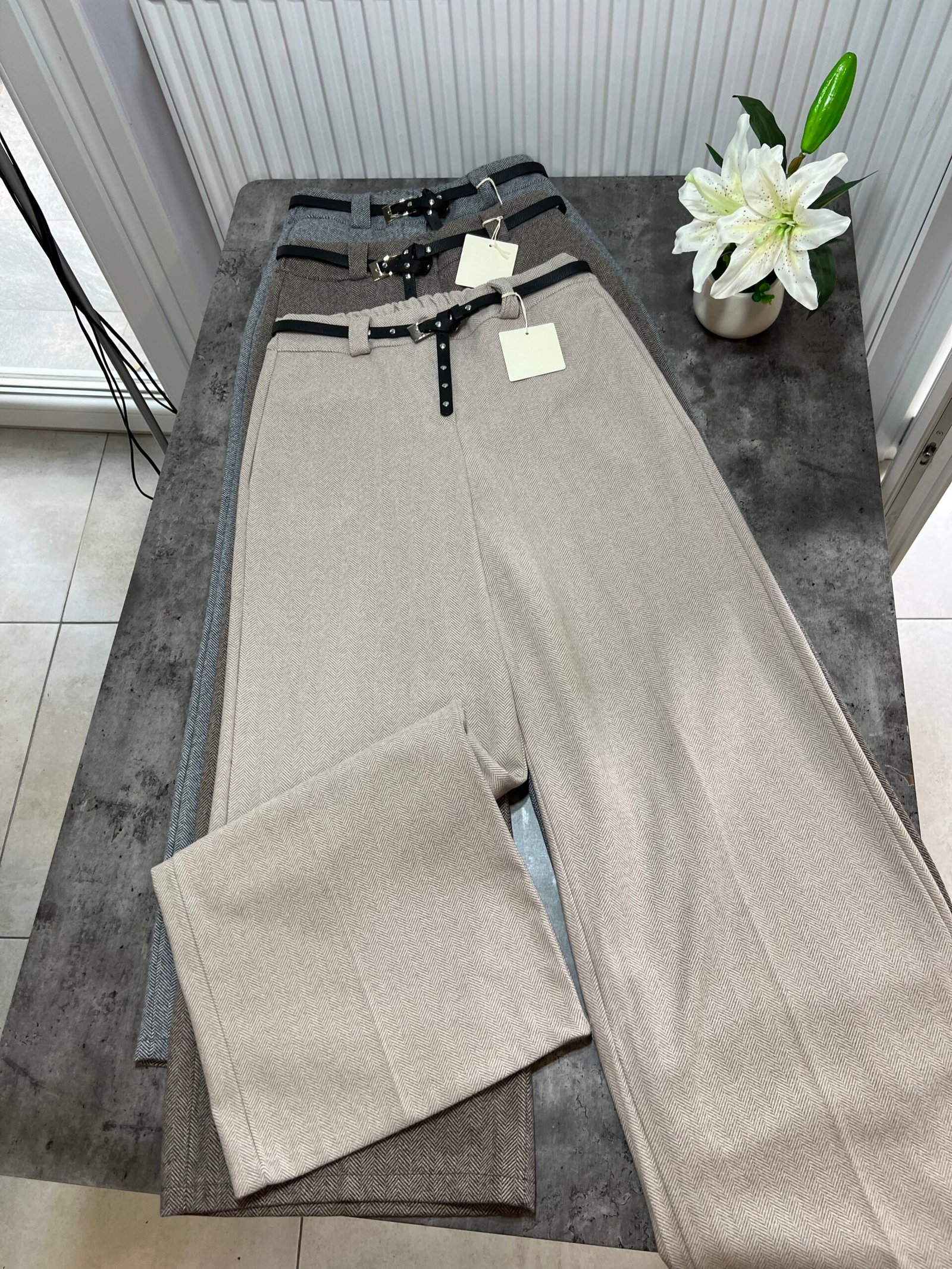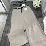 Në prerje paralel, me bel të lartë me llastik në bel në pjesën pas. Përmbajne xhepa funksionale. Mbërthim me zinxhir dhe kopse. Rrip lëkure i përfshire.