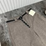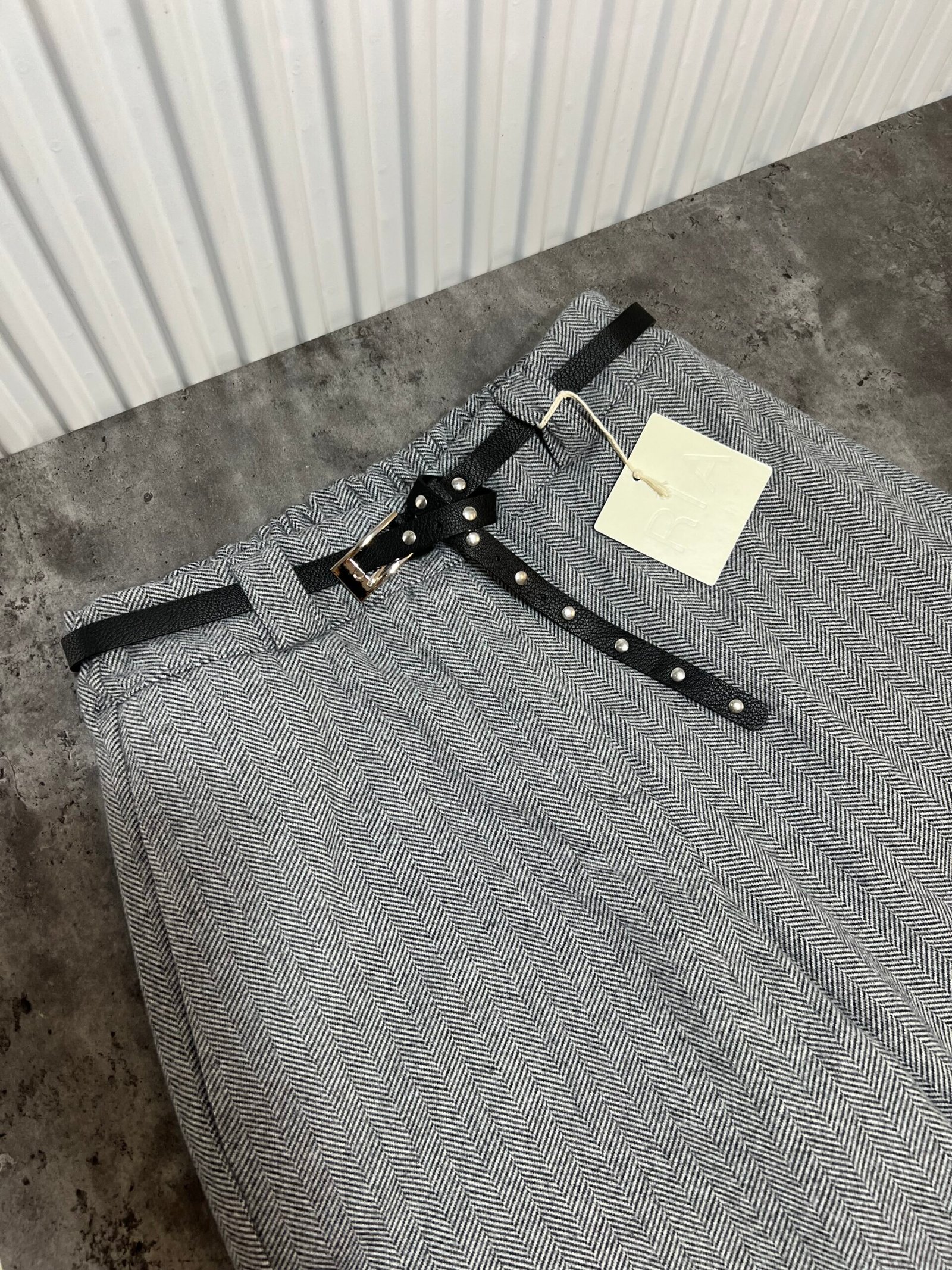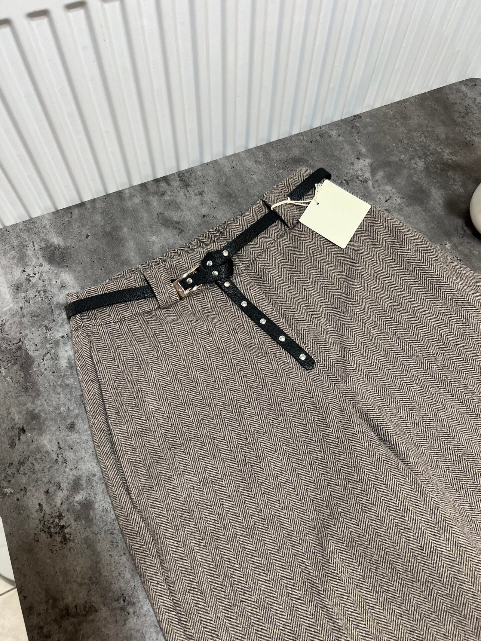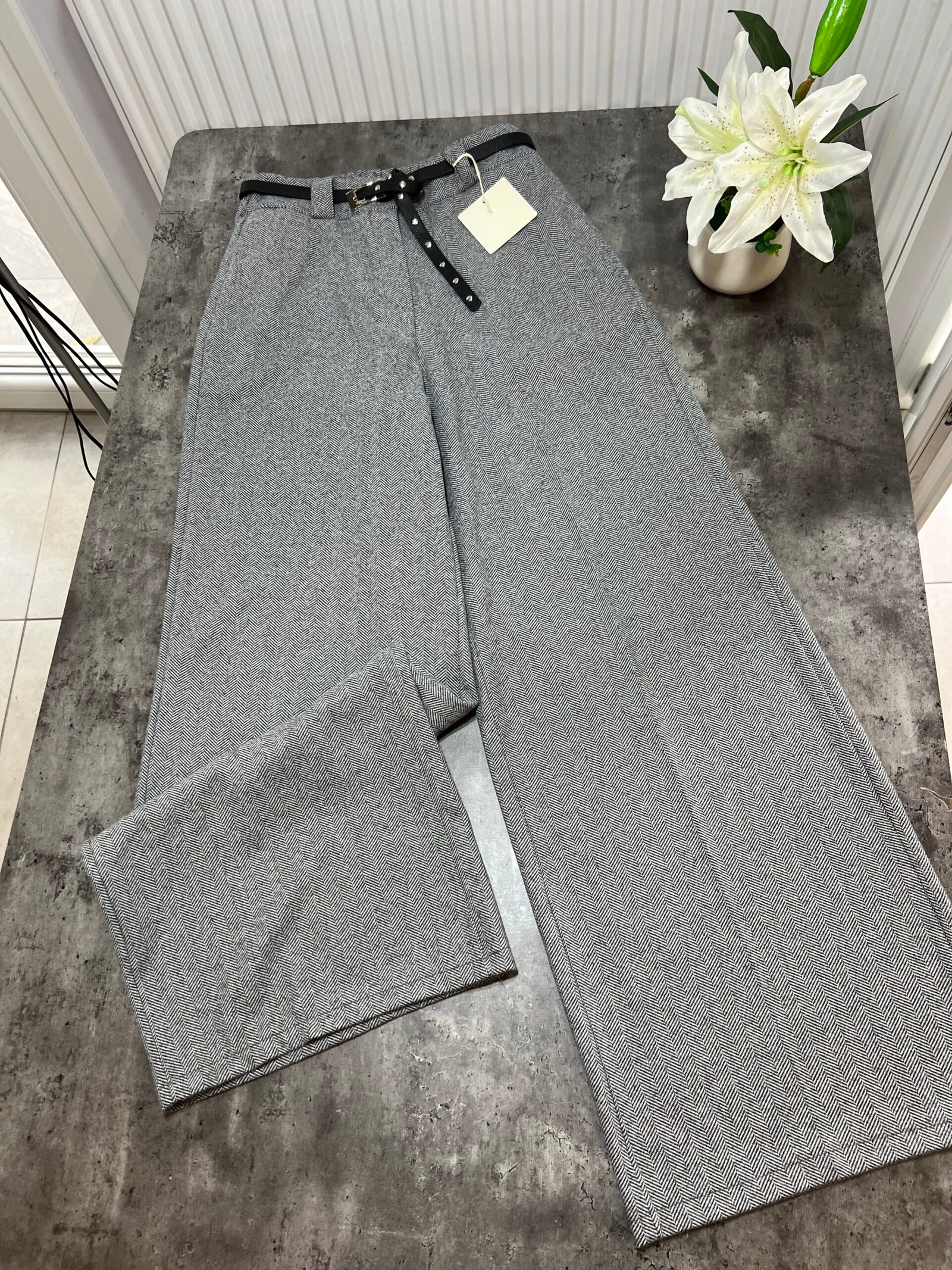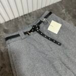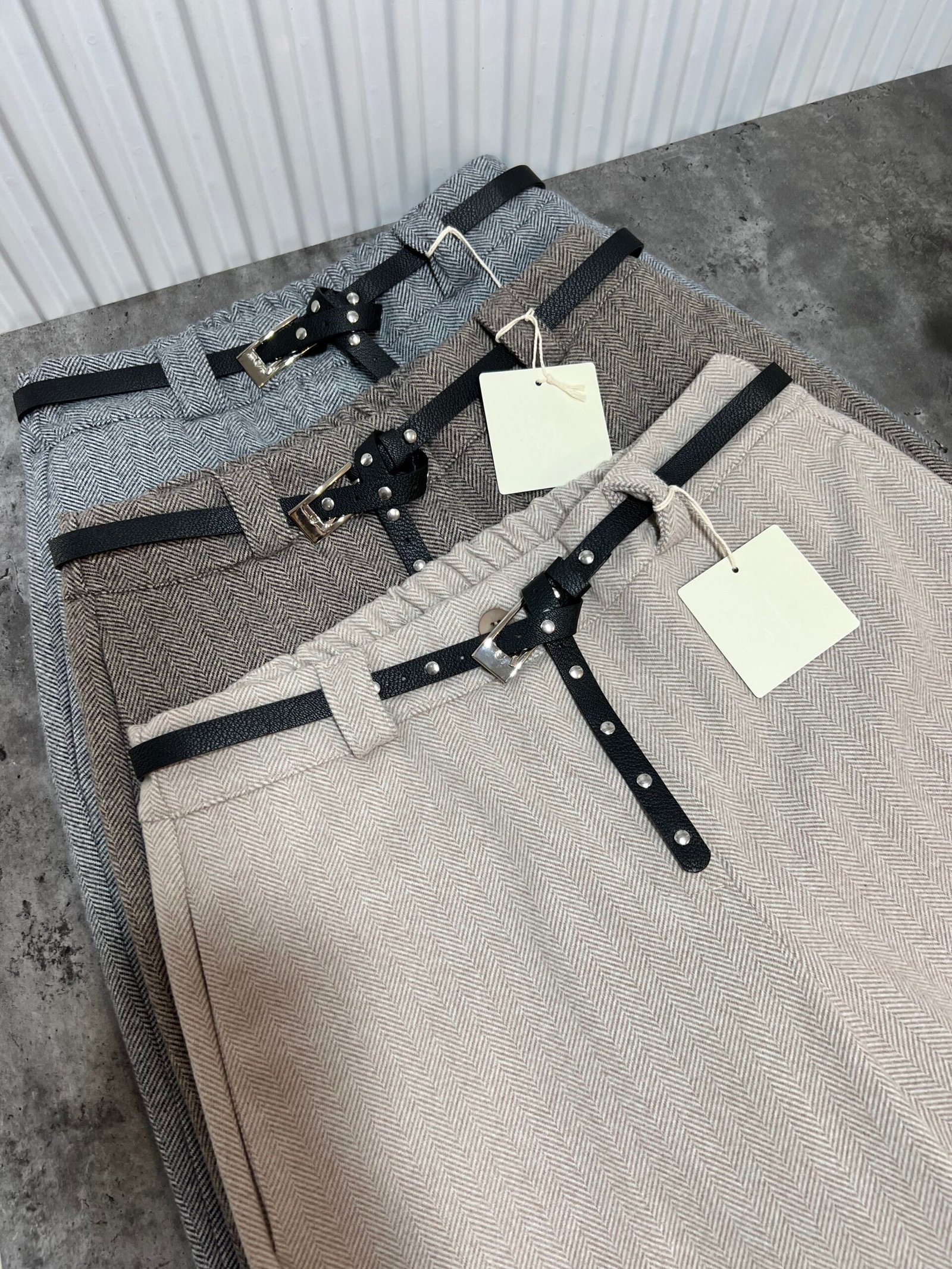 Në prerje paralel, me bel të lartë me llastik në bel në pjesën pas. Përmbajne xhepa funksionale. Mbërthim me zinxhir dhe kopse. Rrip lëkure i përfshire.