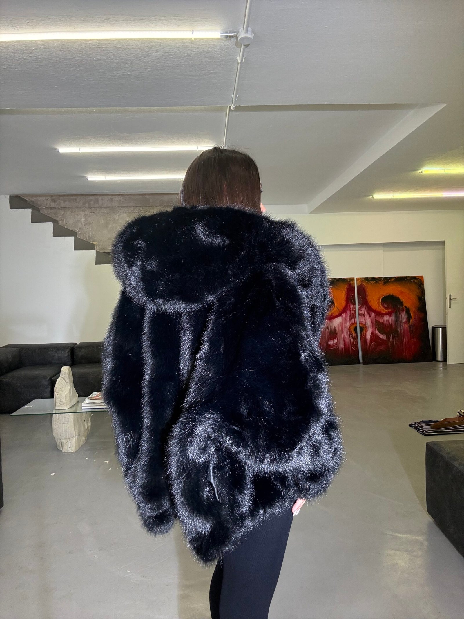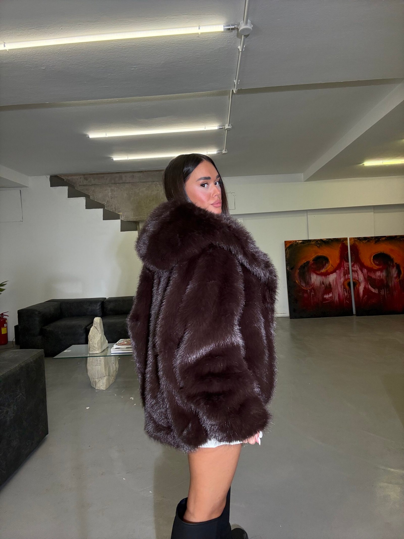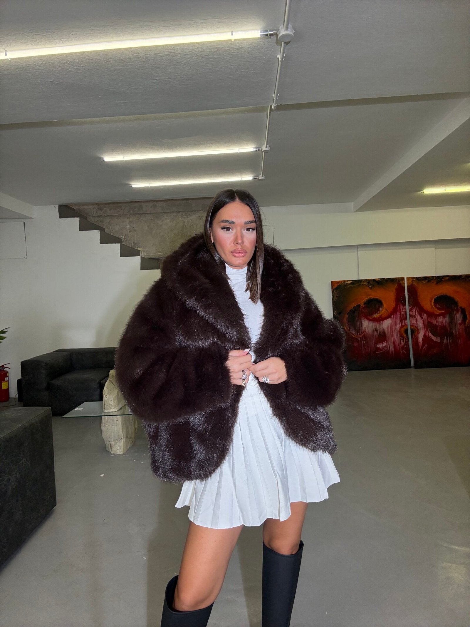 Pellush elegant me kapuç të madh dhe material super të butë që ofron ngrohtësi dhe stil në të njëjtën kohë. Me dizajn modern e voluminoz, ky model kombinohet lehtë si me funde ashtu edhe me pantallona, duke krijuar një pamje luksoze dhe komode për ditët e ftohta të dimrit.