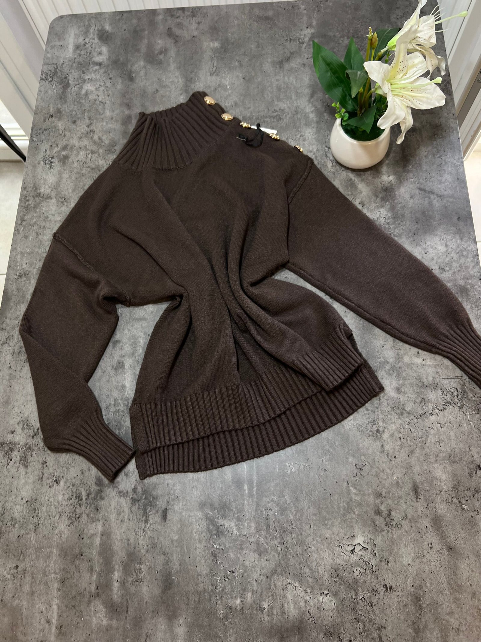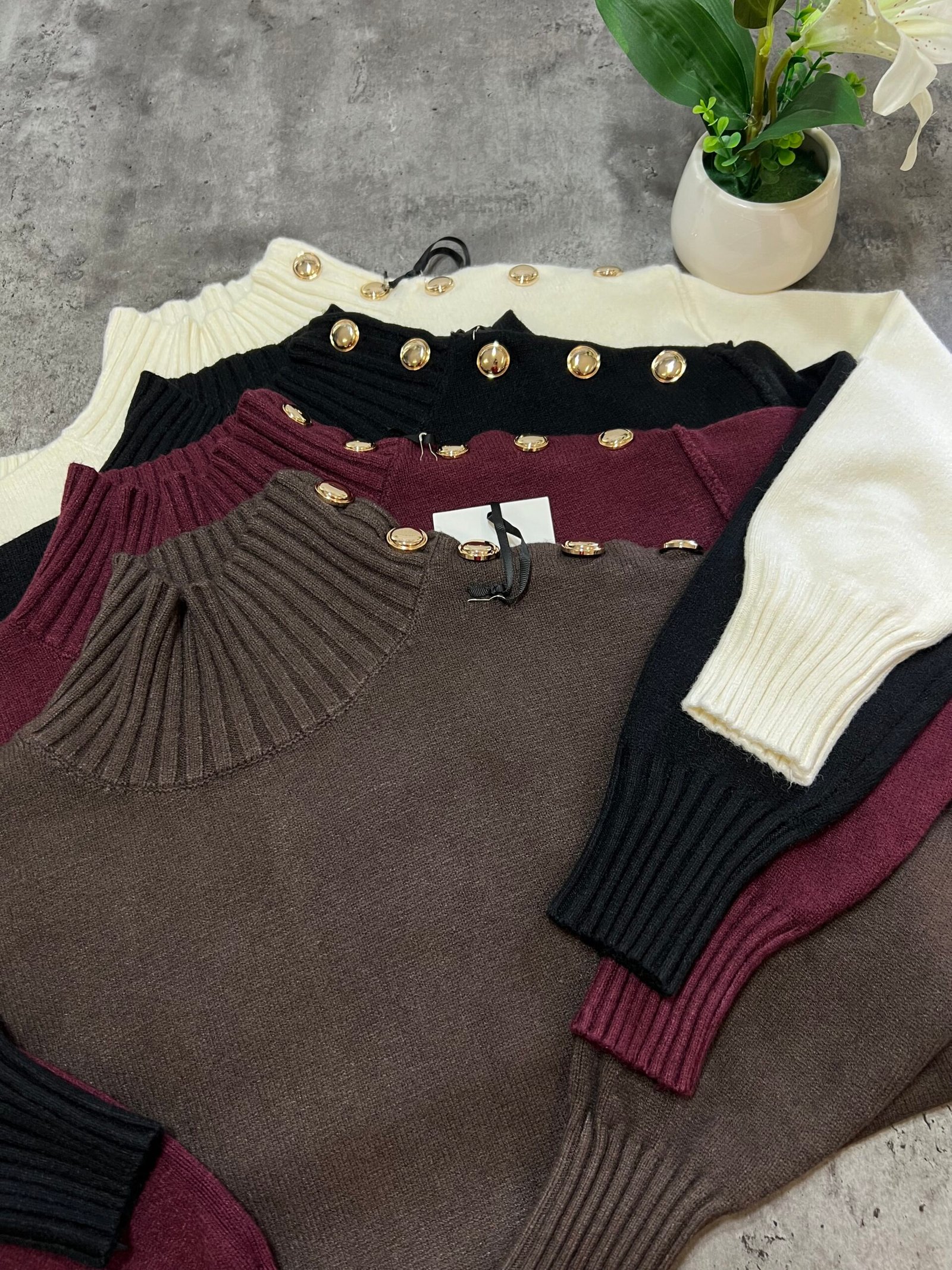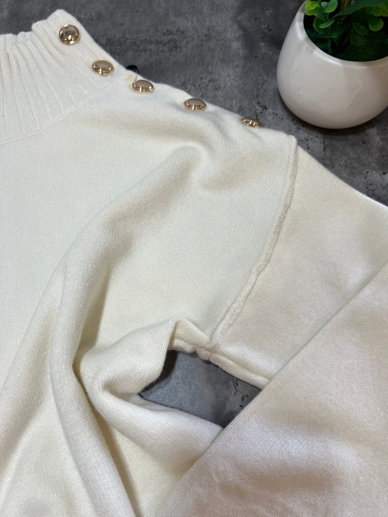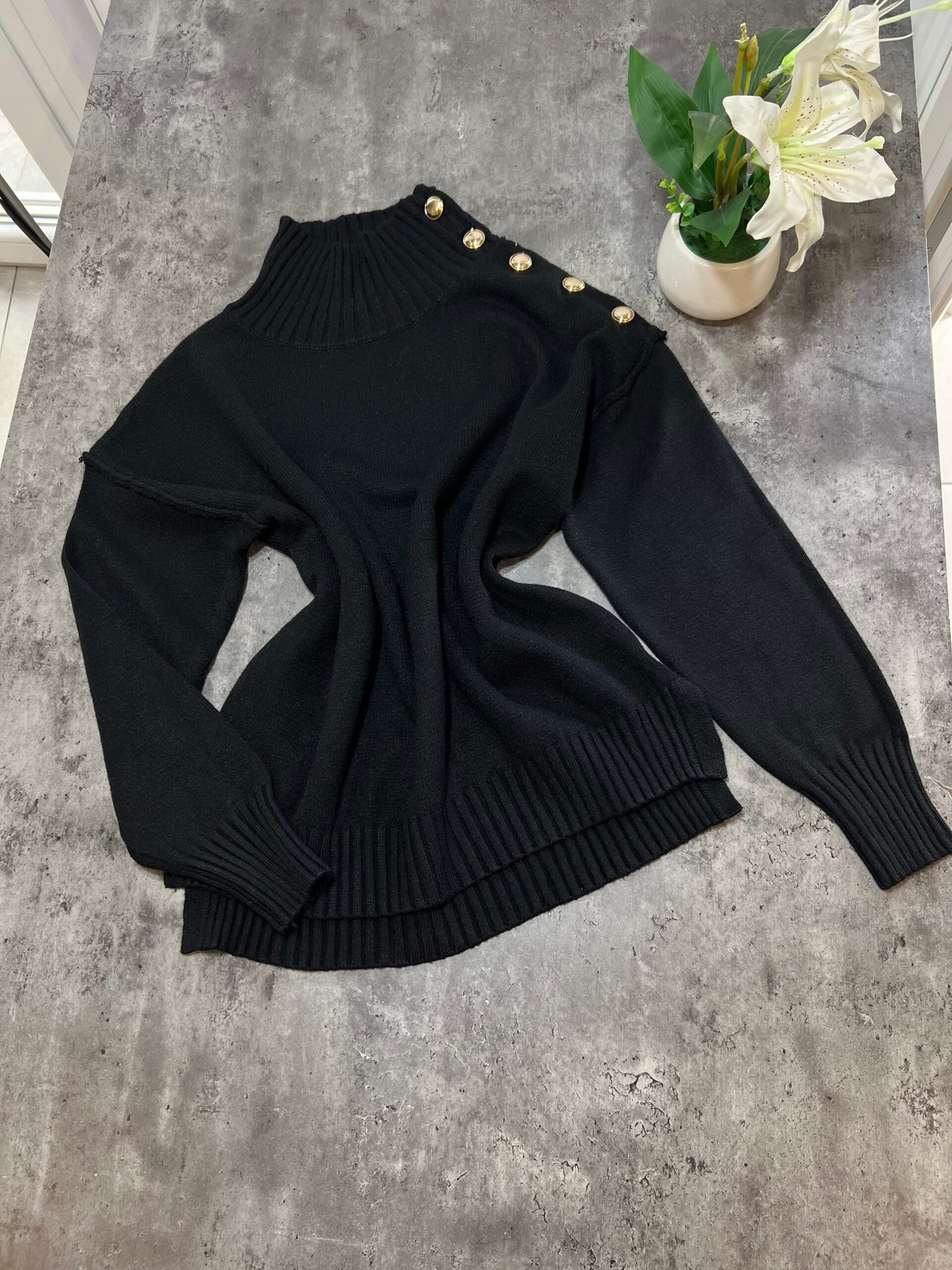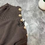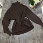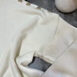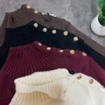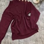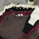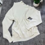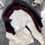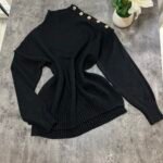 Pulovër me material të butë dhe strukturë elastike, e zbukuruar me kopsa metalike në pjesën e sipërme që shtojnë elegancë dhe finesë. Prerja e përshtatur thekson siluetën, ndërsa detajet me rrudha në jakë dhe fund japin pamje të rafinuar dhe harmonike.