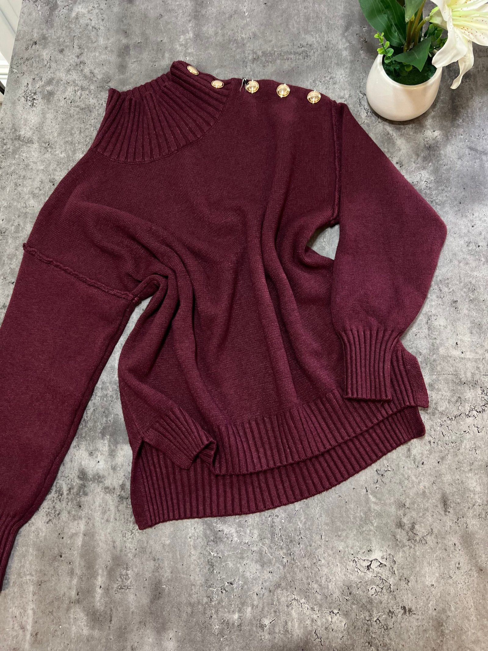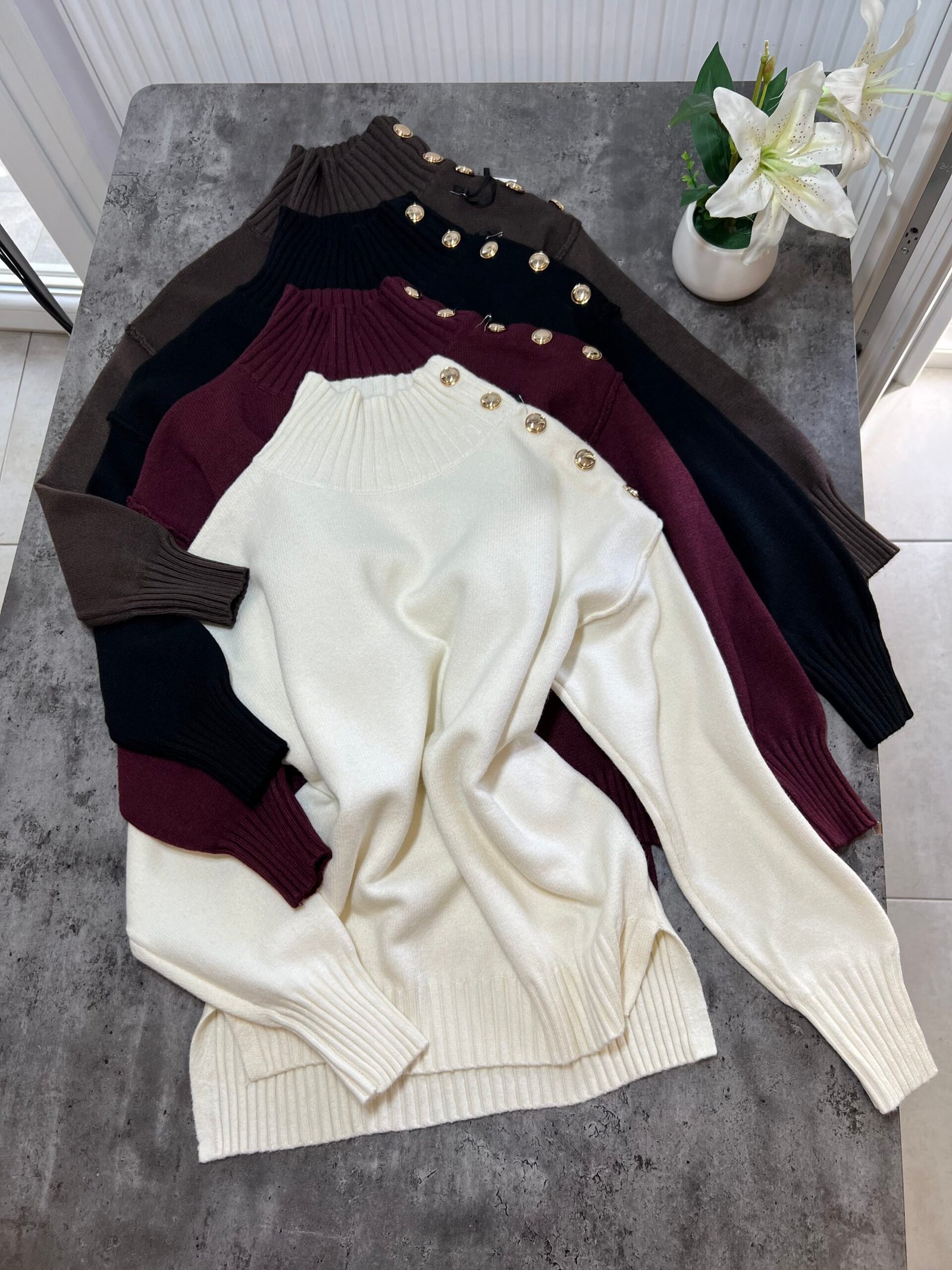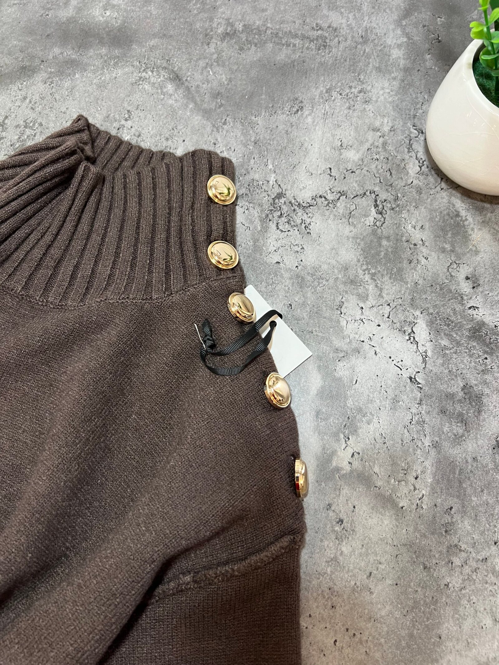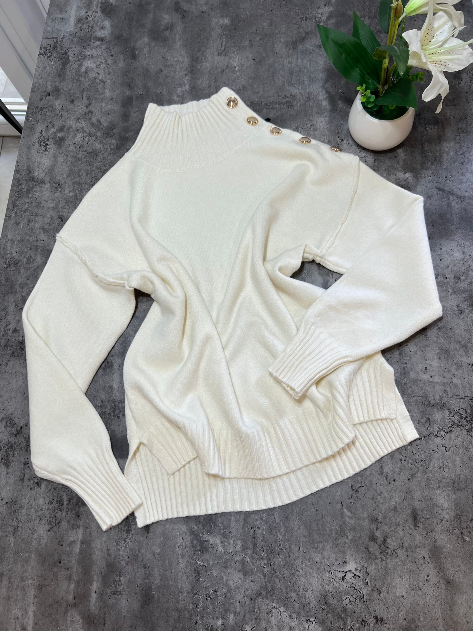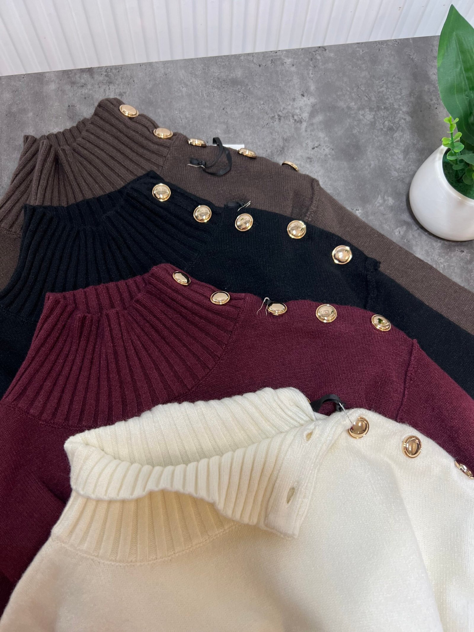 Pulovër me material të butë dhe strukturë elastike, e zbukuruar me kopsa metalike në pjesën e sipërme që shtojnë elegancë dhe finesë. Prerja e përshtatur thekson siluetën, ndërsa detajet me rrudha në jakë dhe fund japin pamje të rafinuar dhe harmonike.