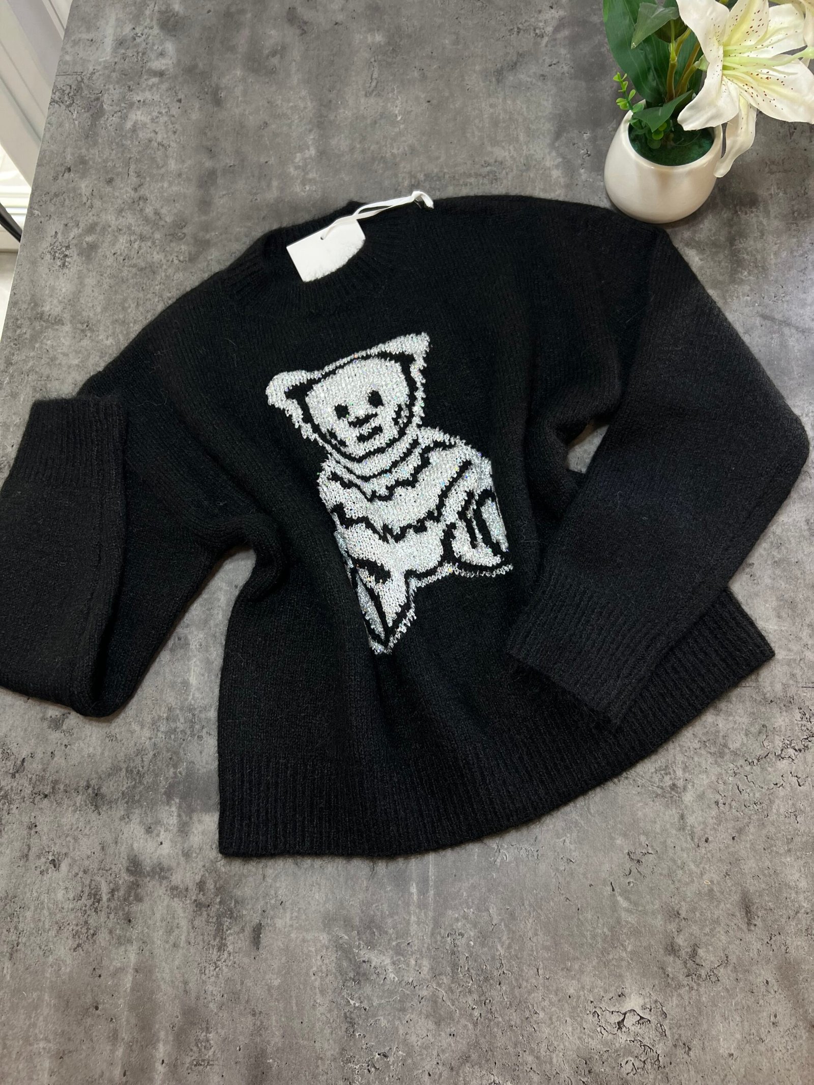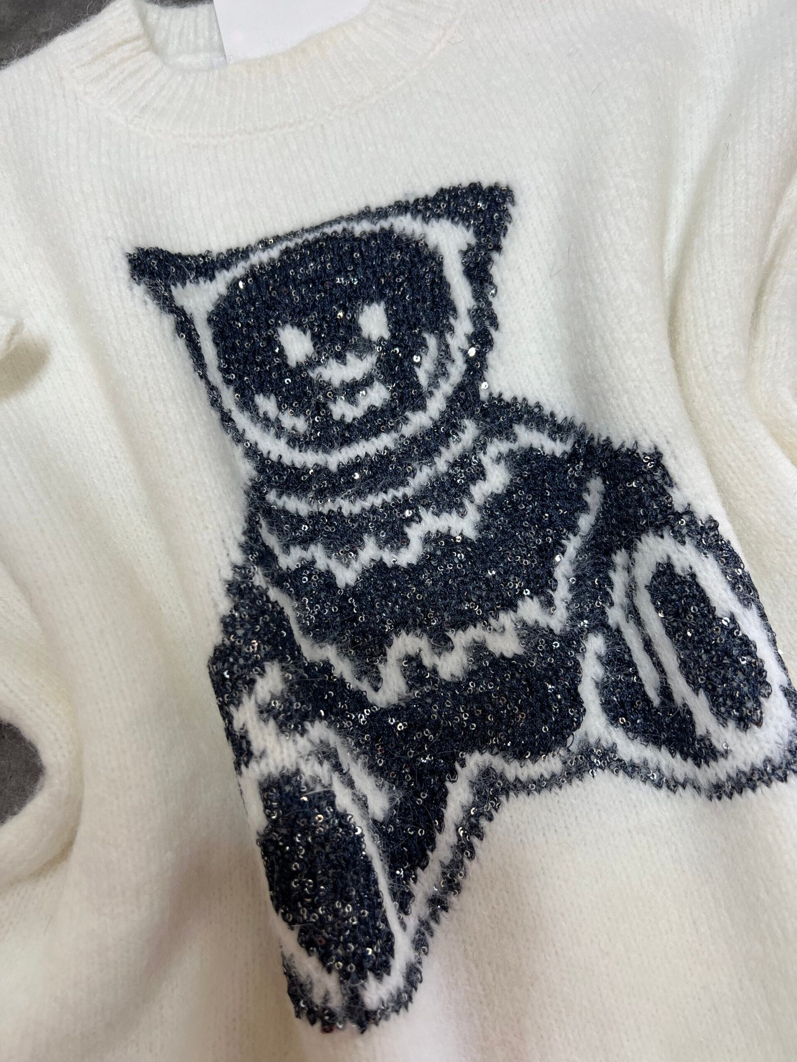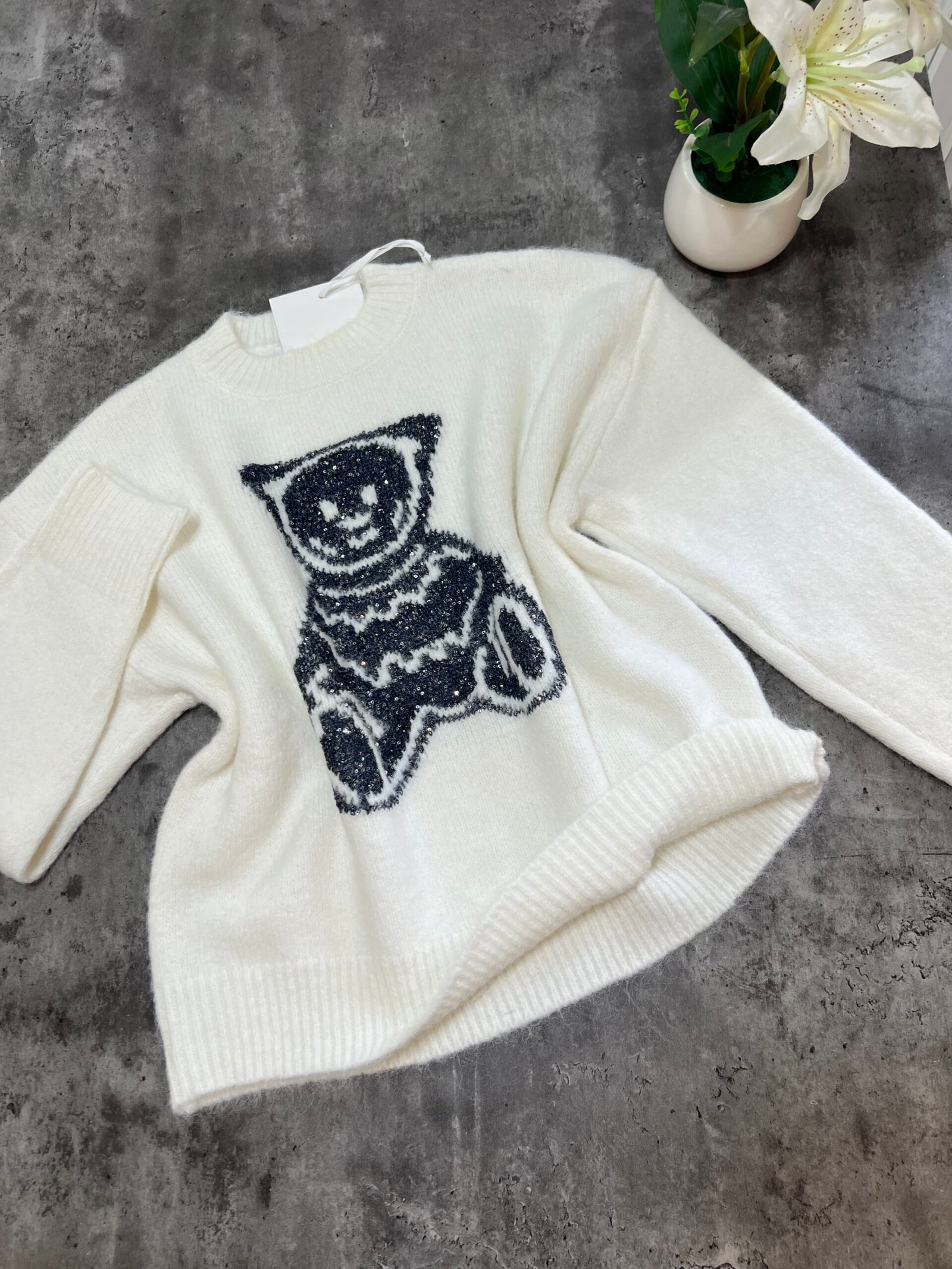 Pulovër e butë dhe e ngrohtë me teksturë leshi dhe motiv arushe të punuar me fije me shkëlqim që i japin një efekt delikat e vajzëror. Materiali cilësor garanton rehati, ndërsa prerja klasike e bën të lehtë për t’u kombinuar në çdo stil ditor.