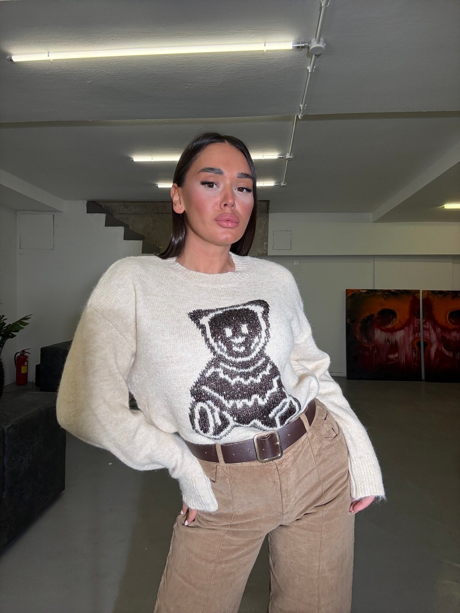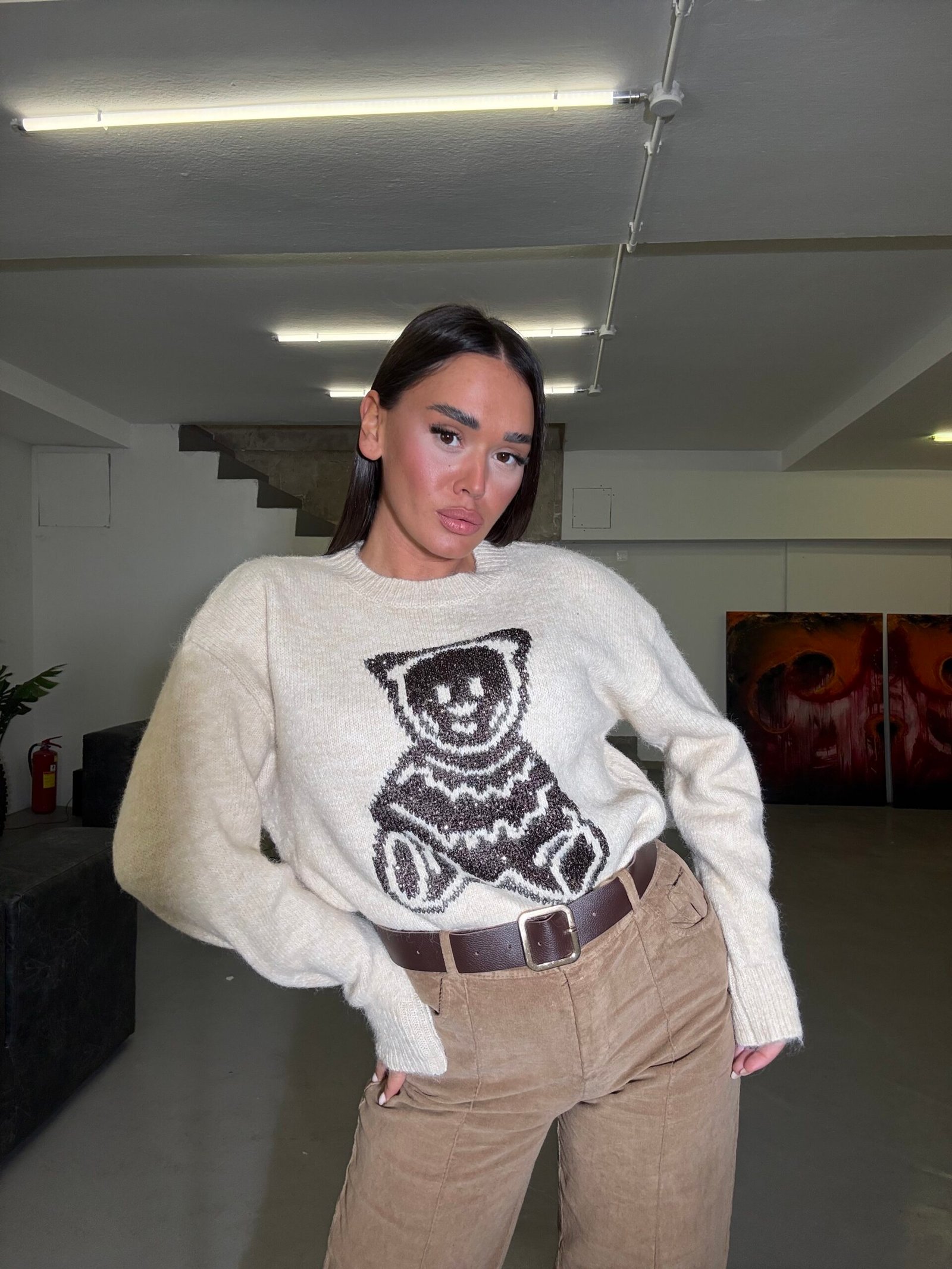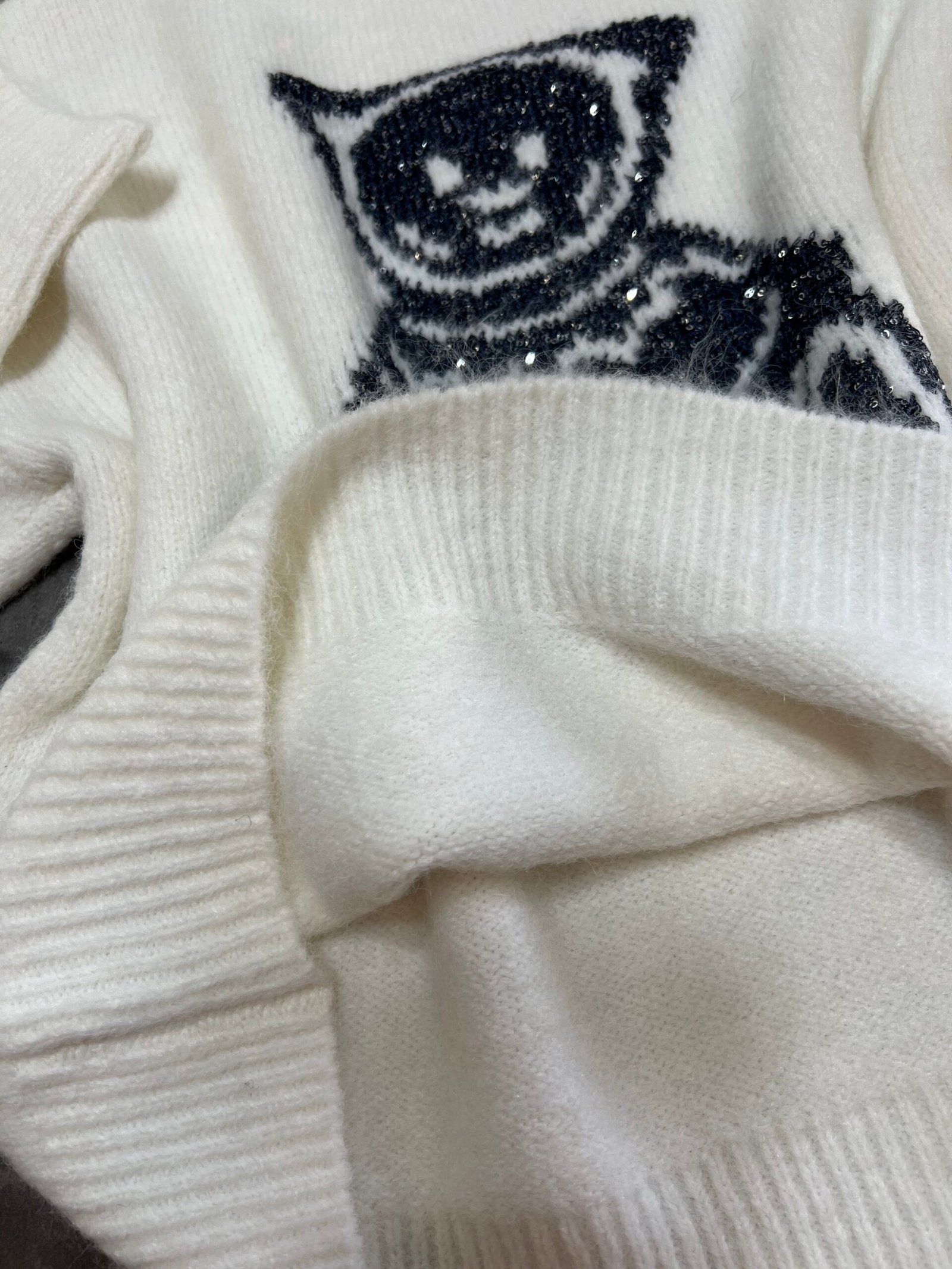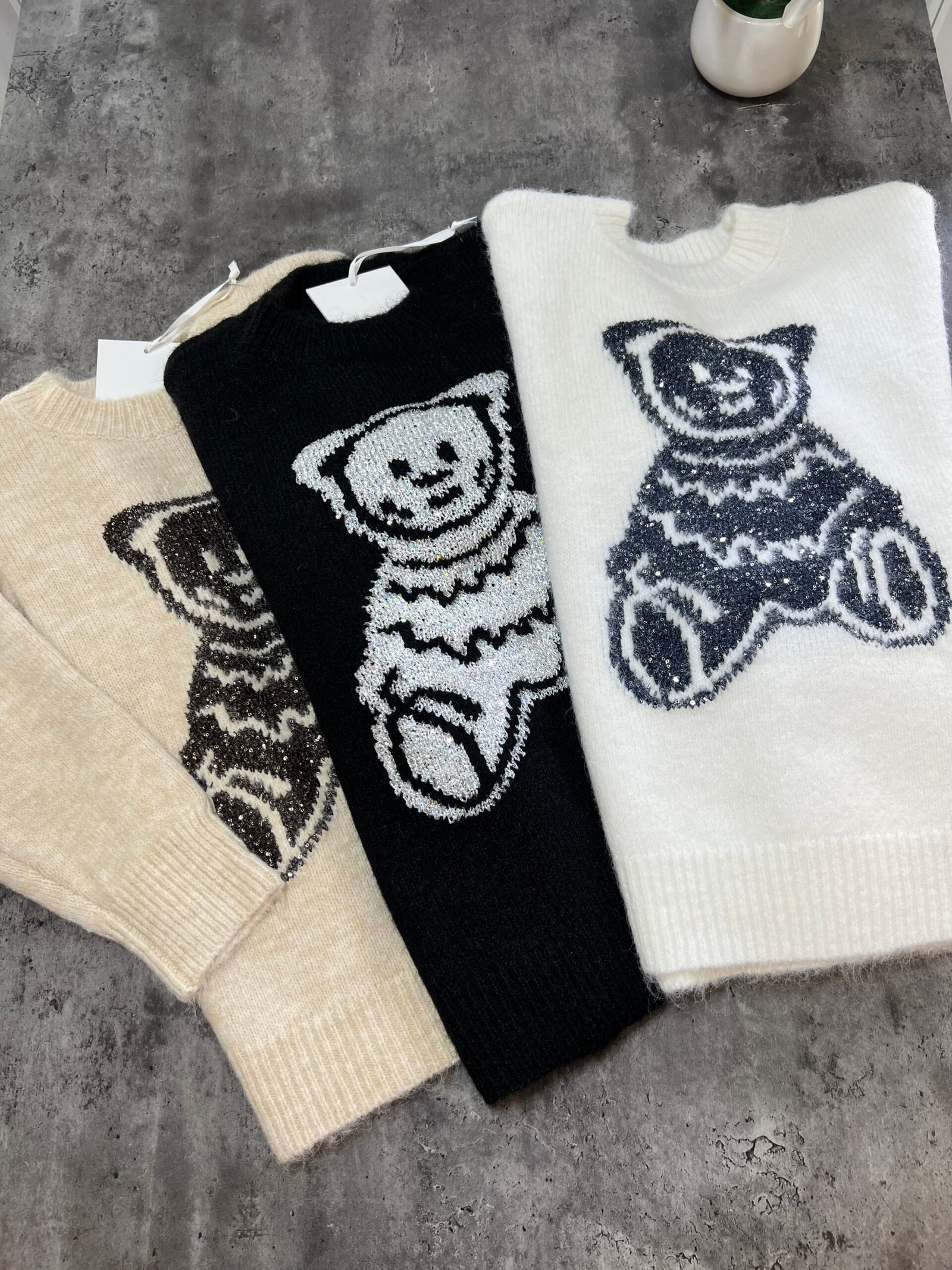 Pulovër e butë dhe e ngrohtë me teksturë leshi dhe motiv arushe të punuar me fije me shkëlqim që i japin një efekt delikat e vajzëror. Materiali cilësor garanton rehati, ndërsa prerja klasike e bën të lehtë për t’u kombinuar në çdo stil ditor.