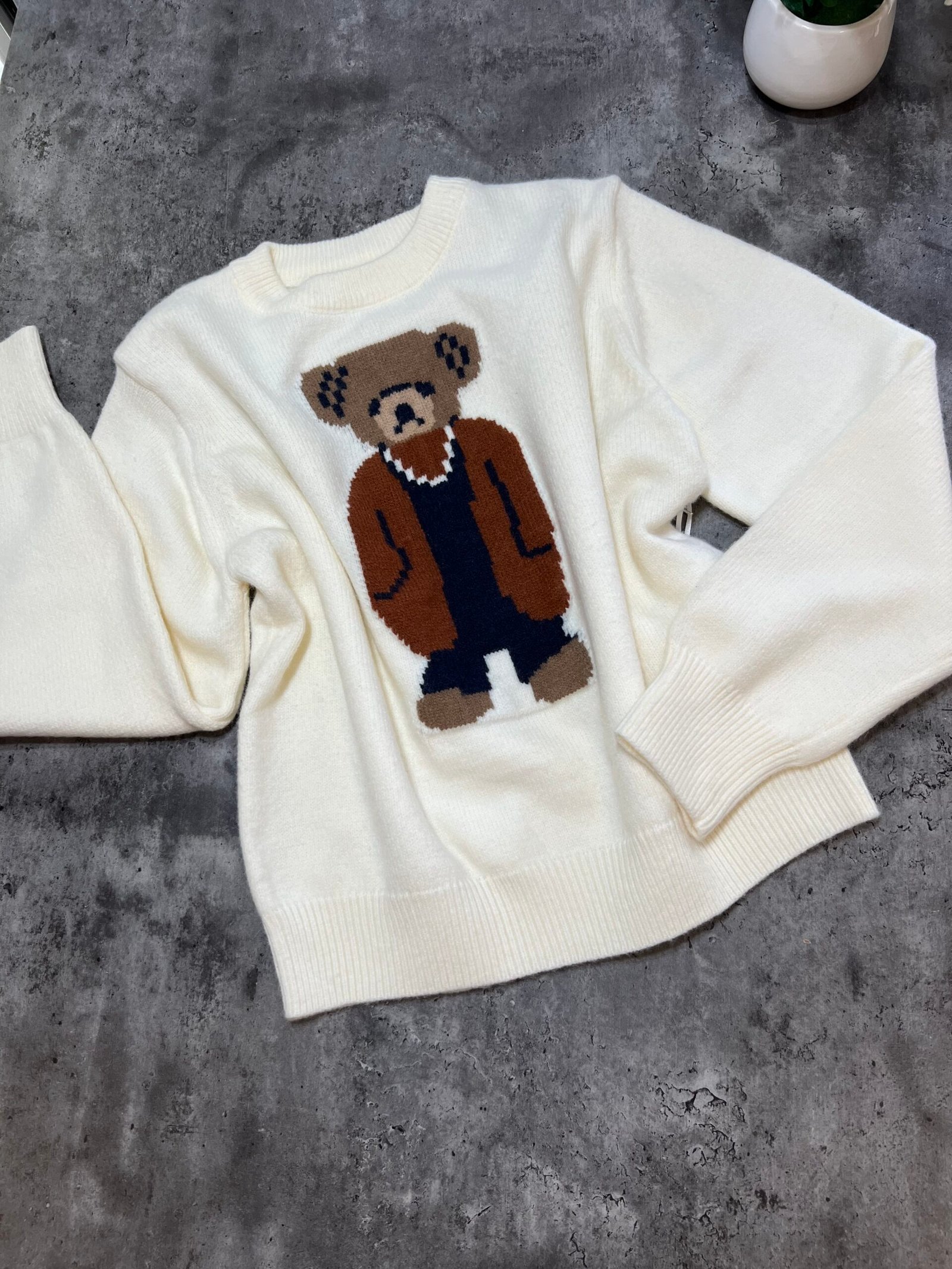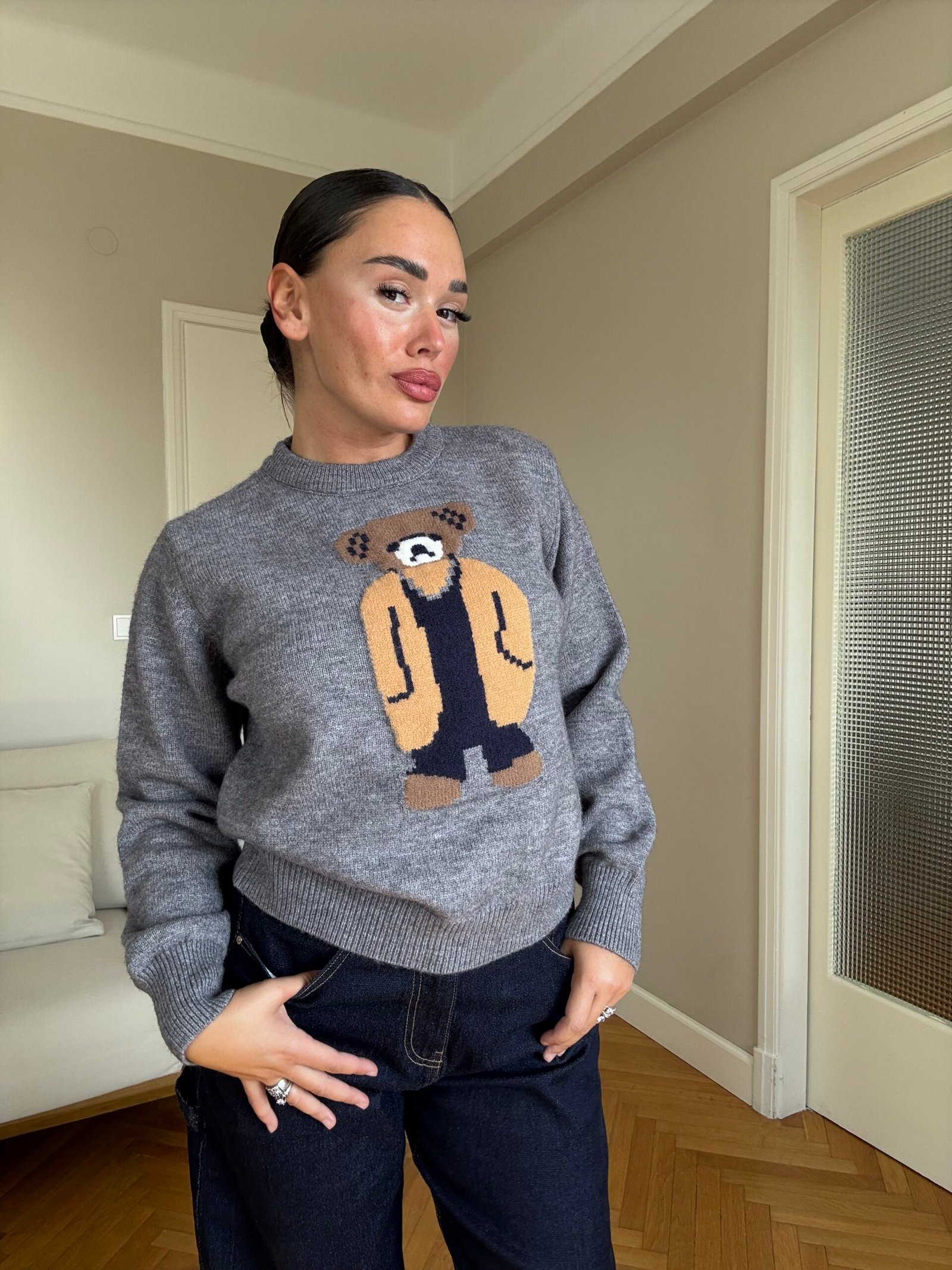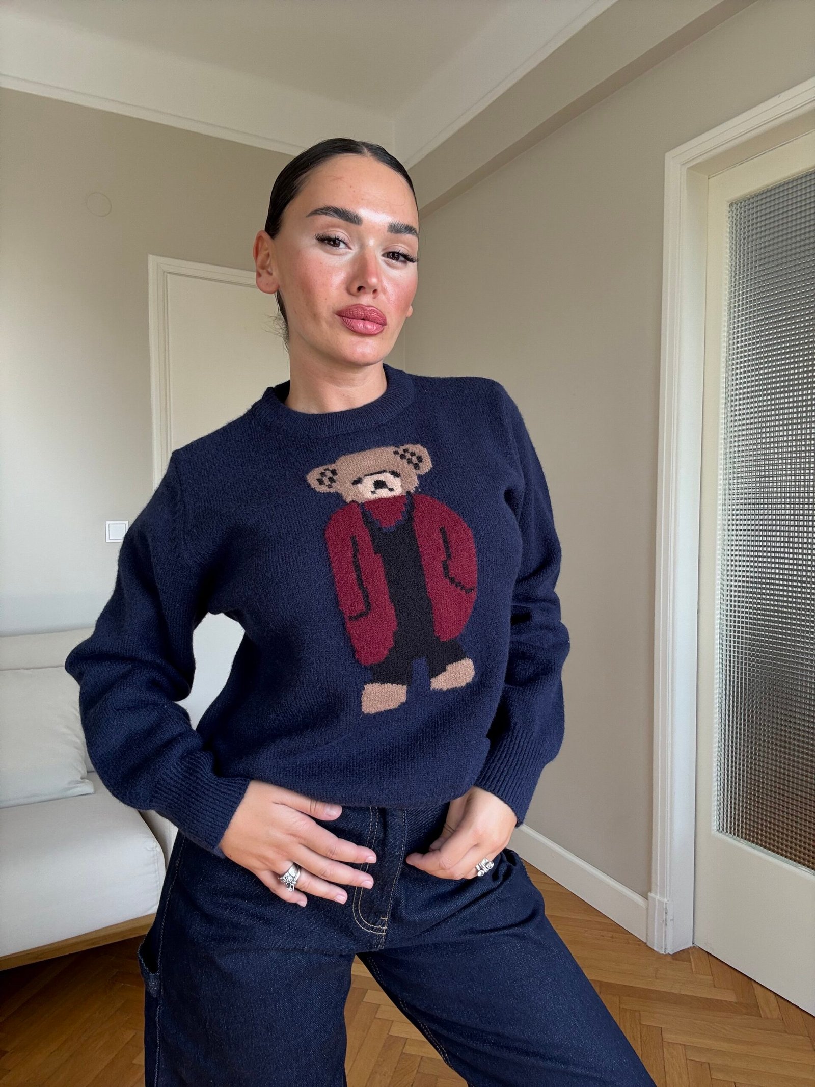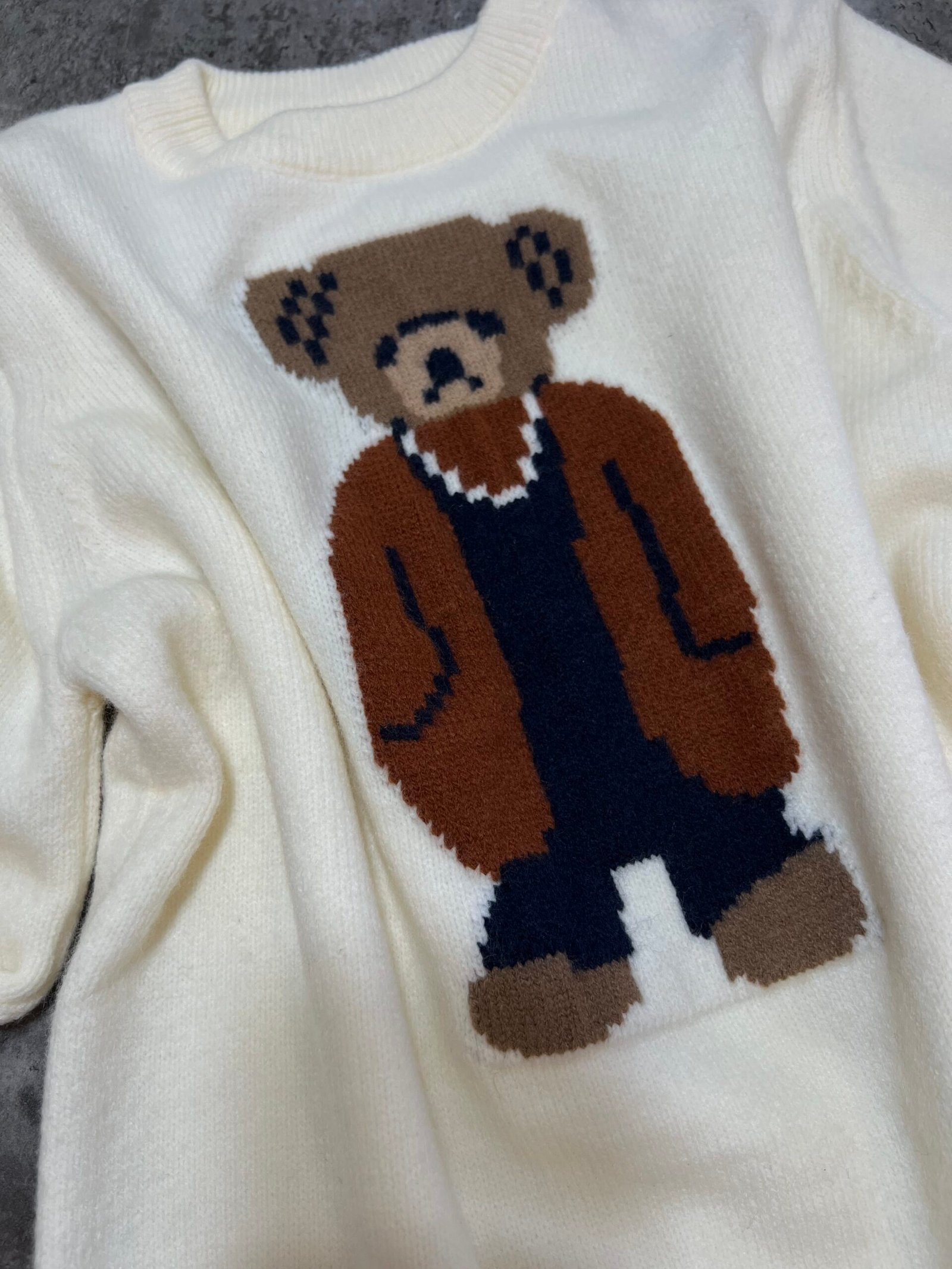 Pulovër e butë dhe komode me dizajn unik të një arushi të thurur në pjesën e përparme. Një model që bashkon ngrohtësinë me stilin modern, duke e bërë dallues në çdo gardërobë. Një zgjedhje ideale për pamje të kuruar dhe trendi në përditshmër