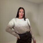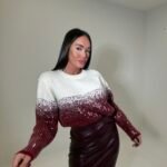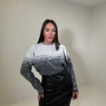 Bluzë e butë me material triko dhe aplikime me shkëlqim në formë gradienti që kalon gradualisht nga drita në ton më të errët.