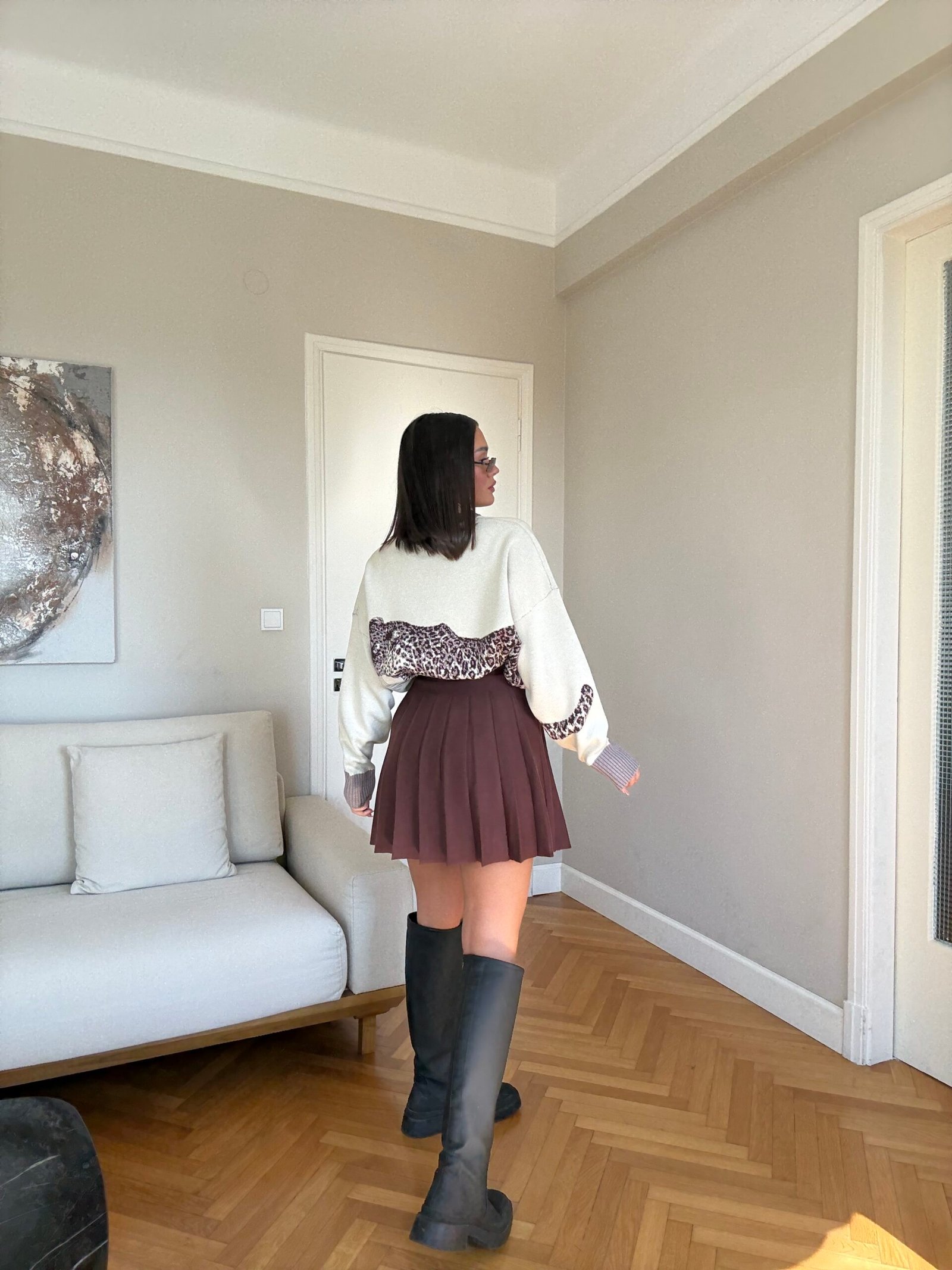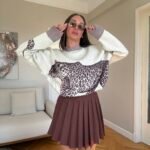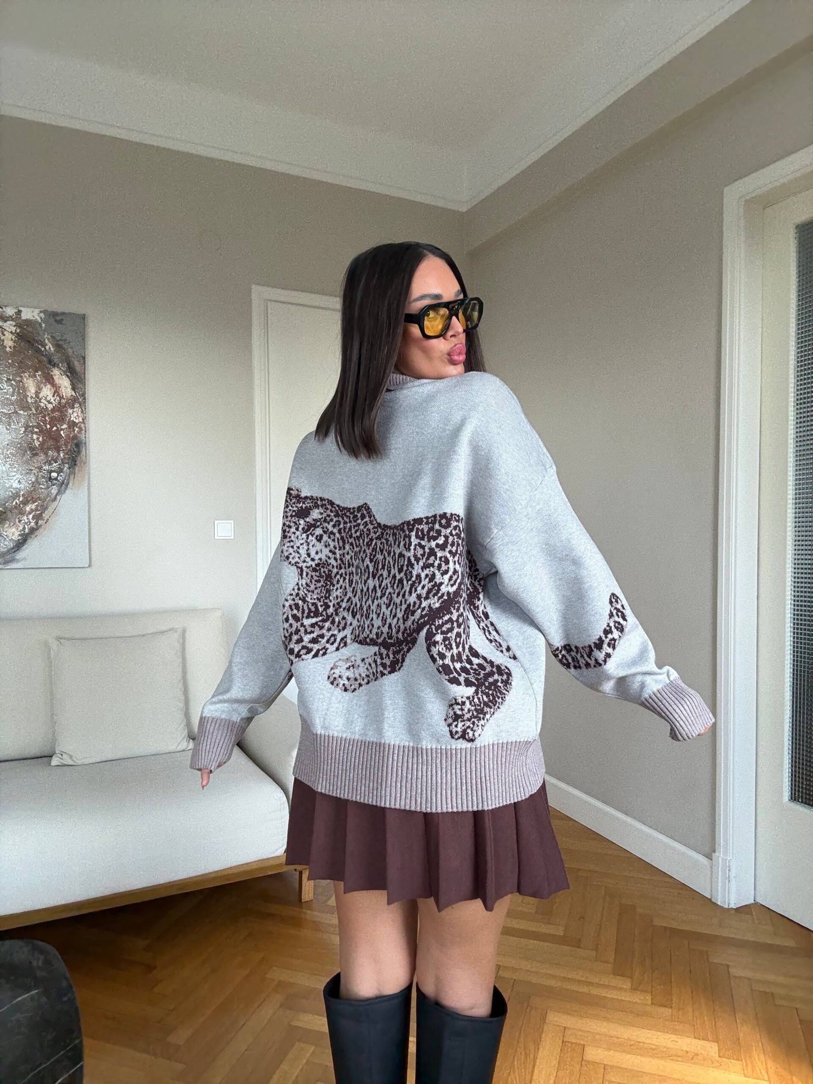 Pulovër moderne dhe komode në stil oversize me print leopardi në pjesën e përparme dhe të pasme. Material i butë dhe i ngrohtë, ideal për veshje të përditshme gjatë stinës së ftohtë. Disponohet në gri dhe bezhë për një pamje unike dhe trendi.