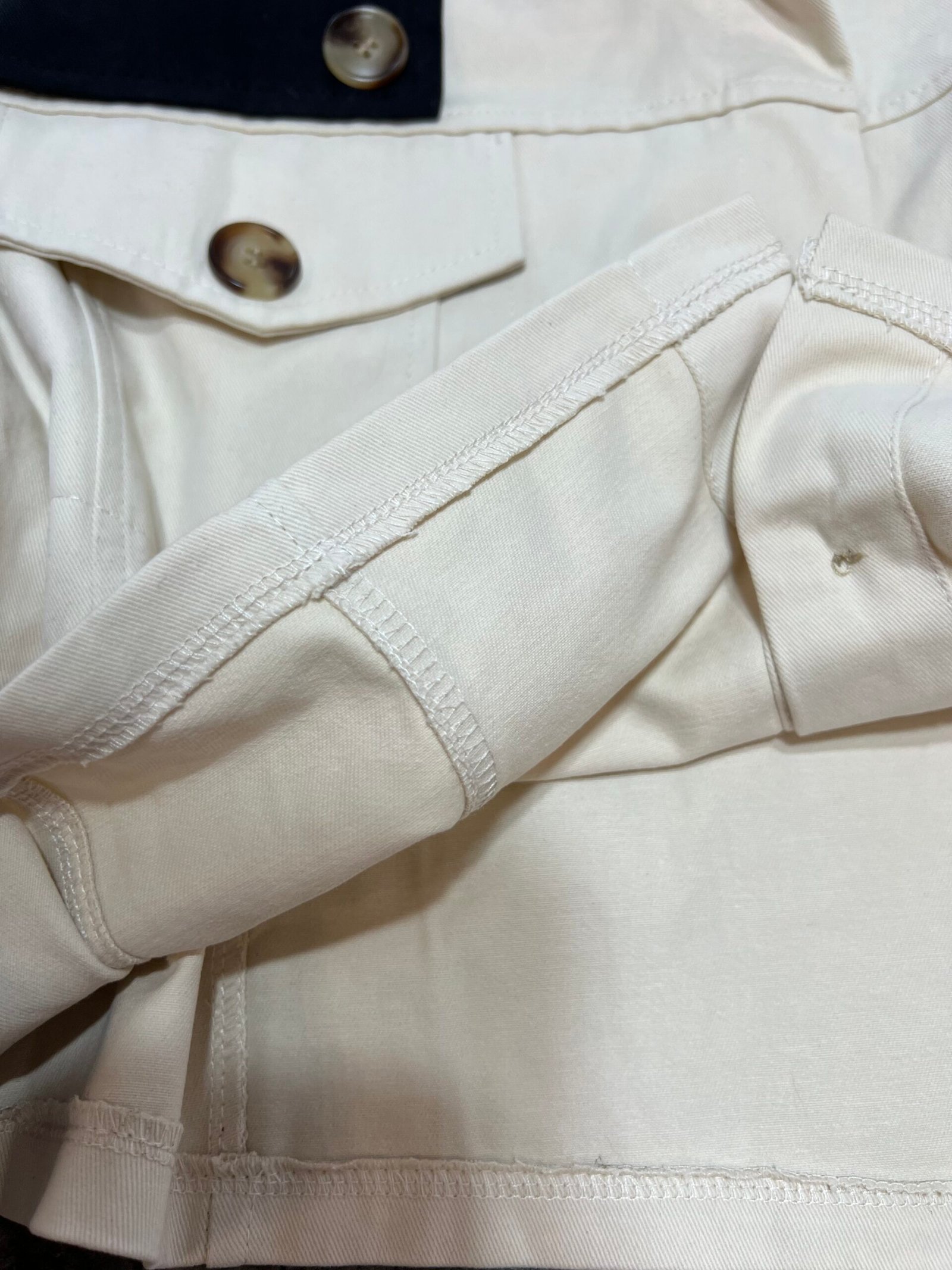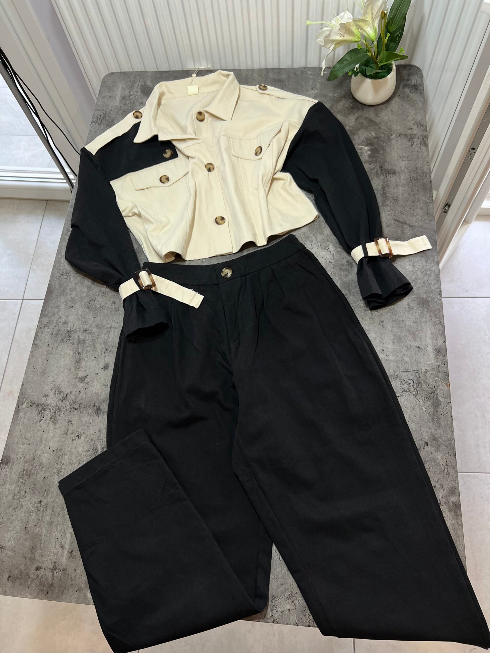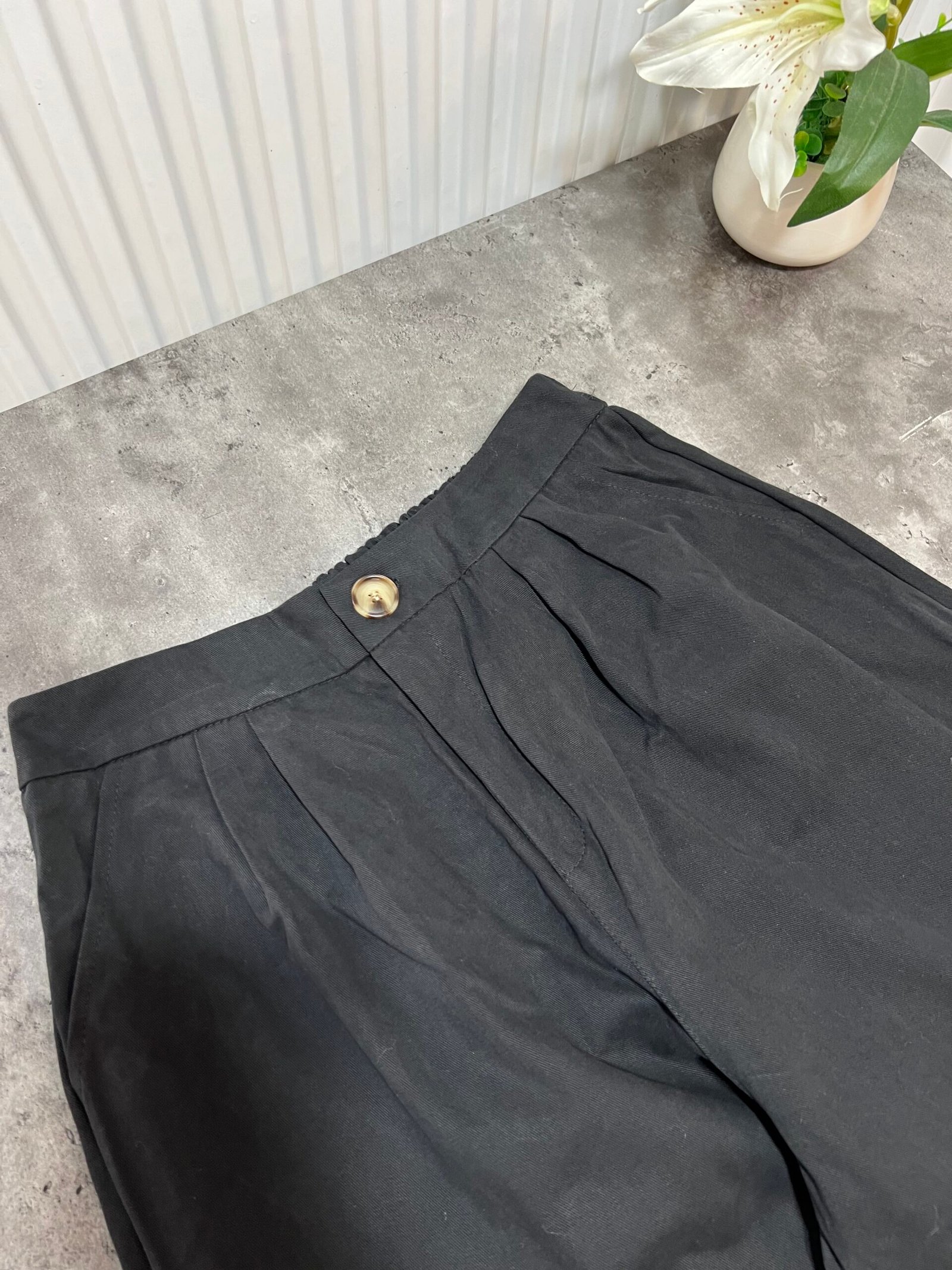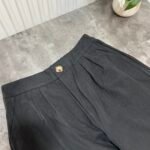 Mbërthim me kopsa funksionale. Pantallona me bel të lartë, prerje stil kaush. Përmbajne xhepa funksionale.