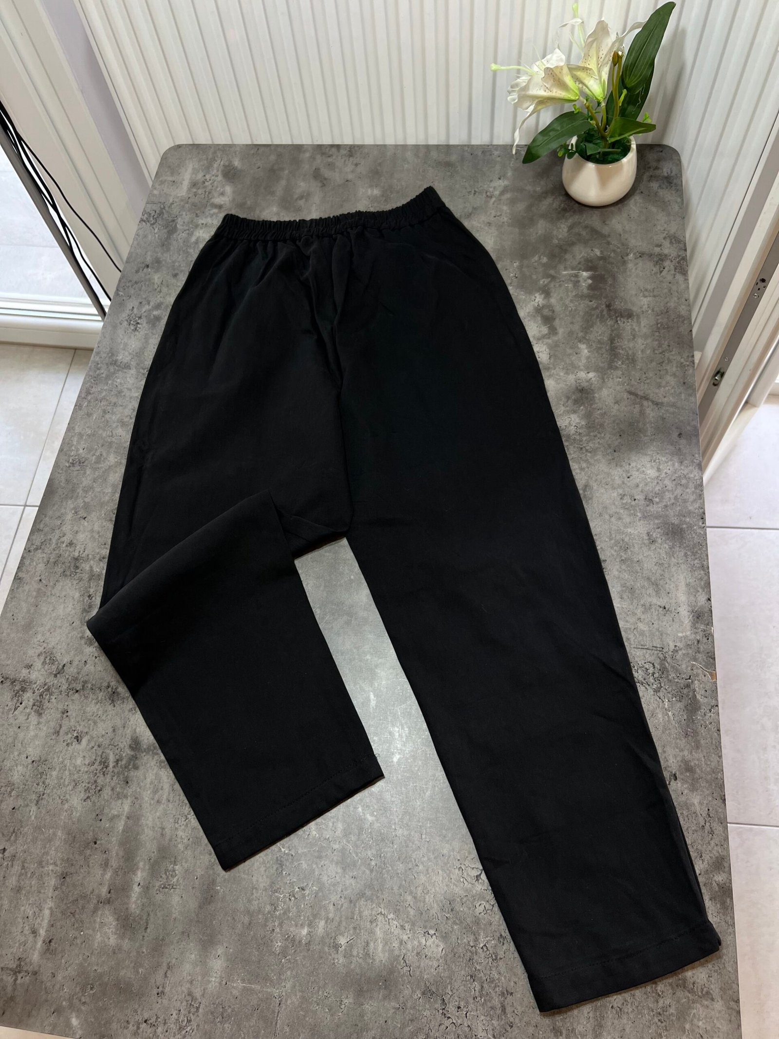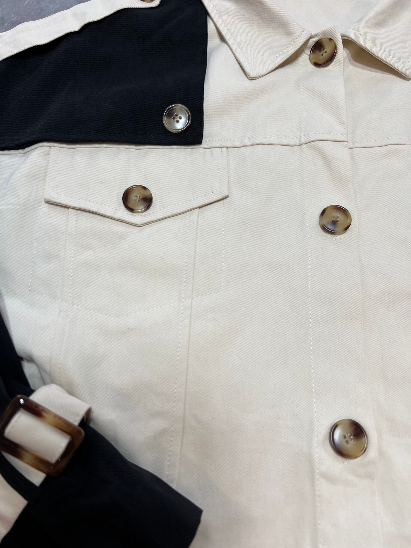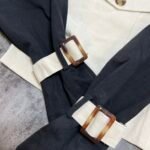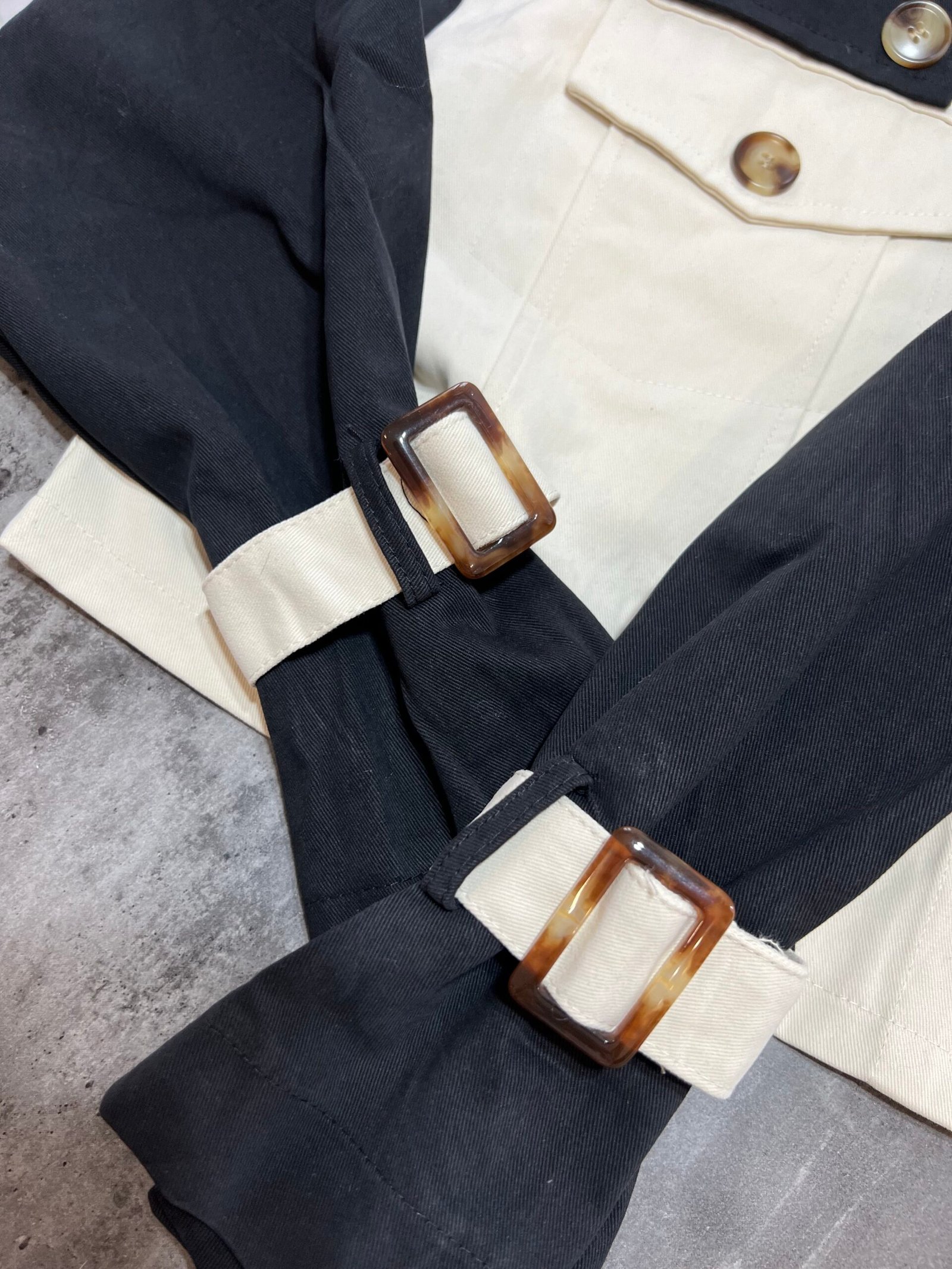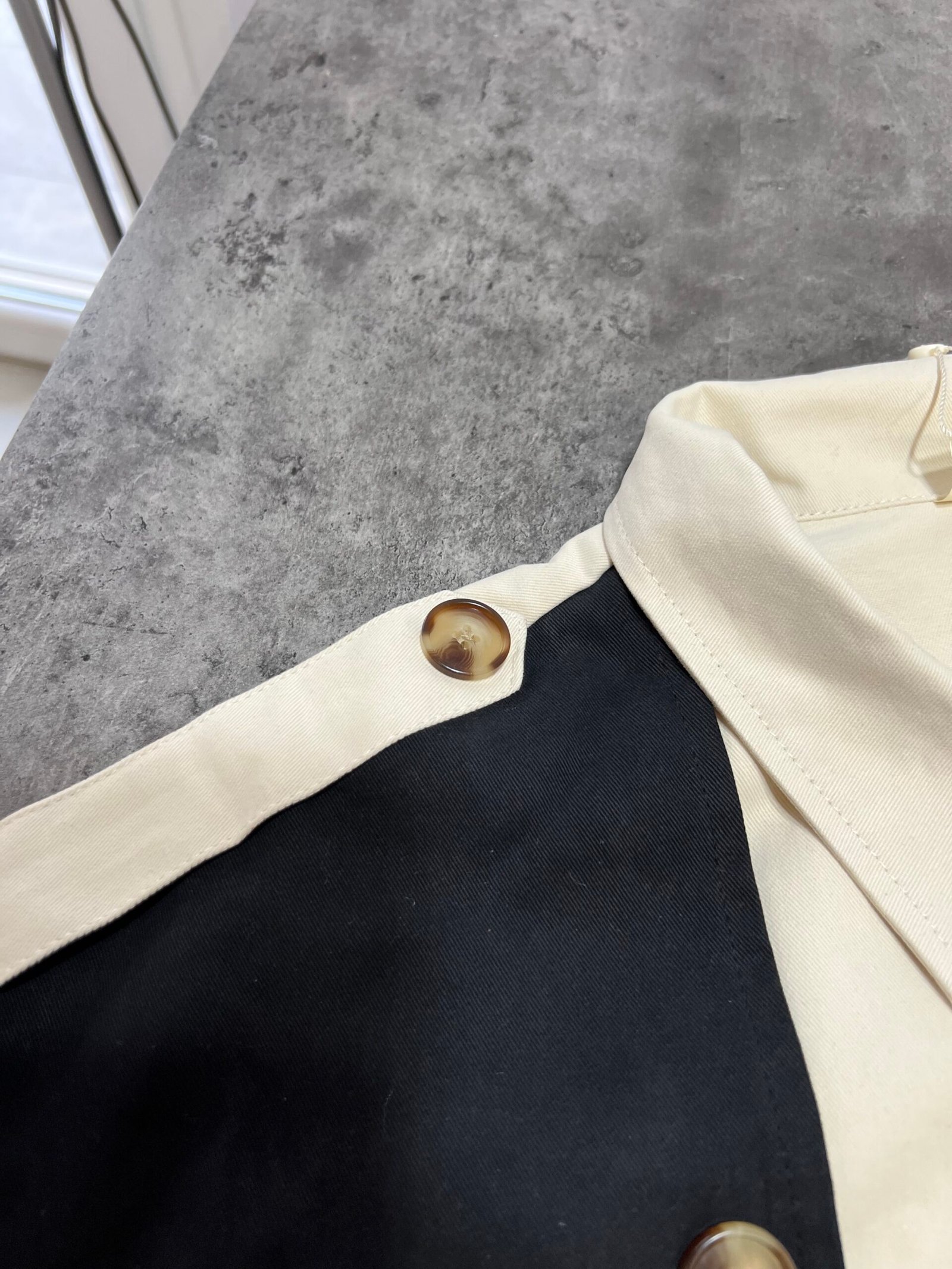 Mbërthim me kopsa funksionale. Pantallona me bel të lartë, prerje stil kaush. Përmbajne xhepa funksionale.