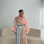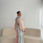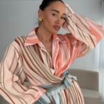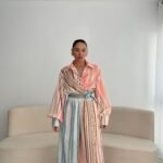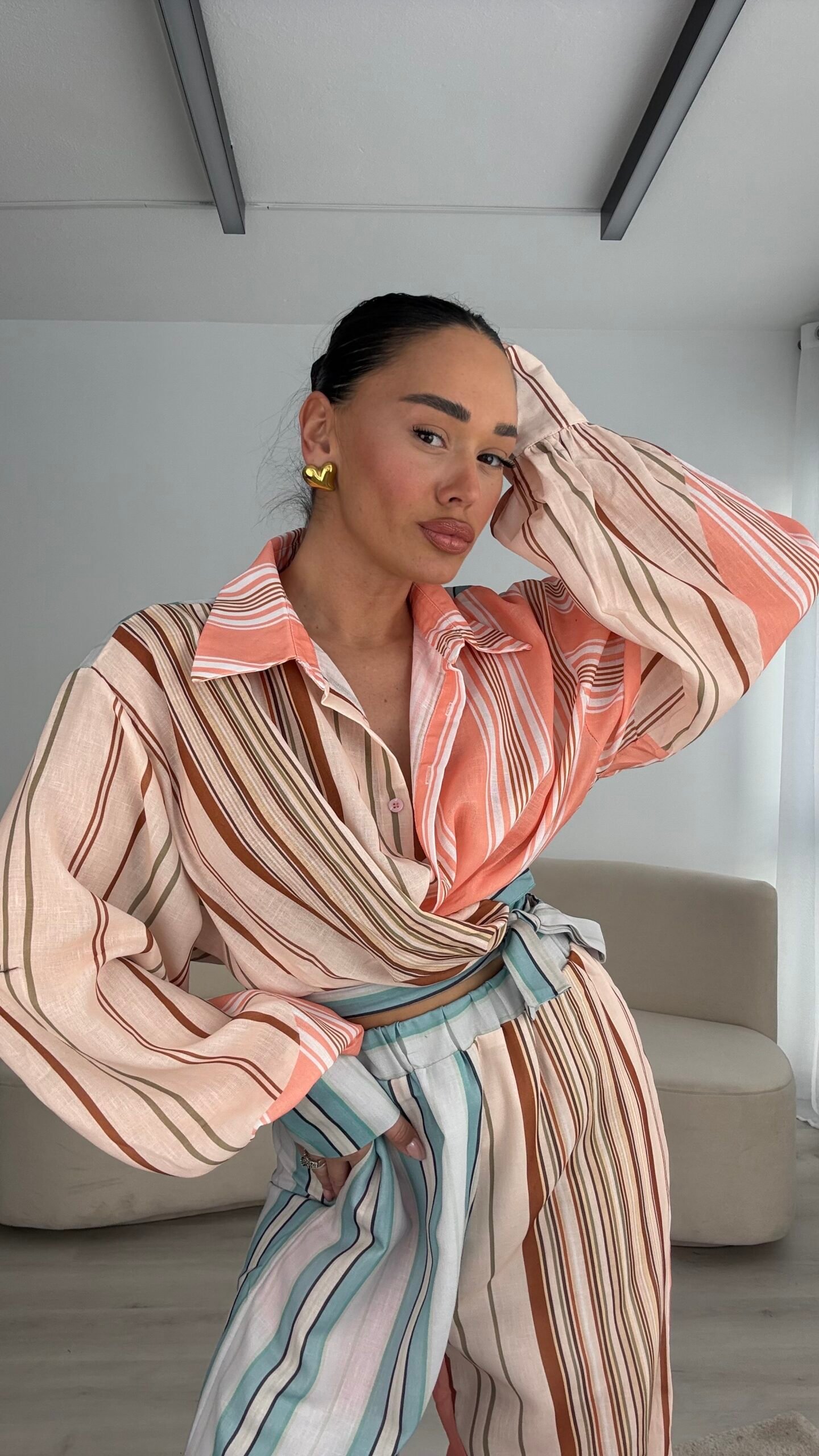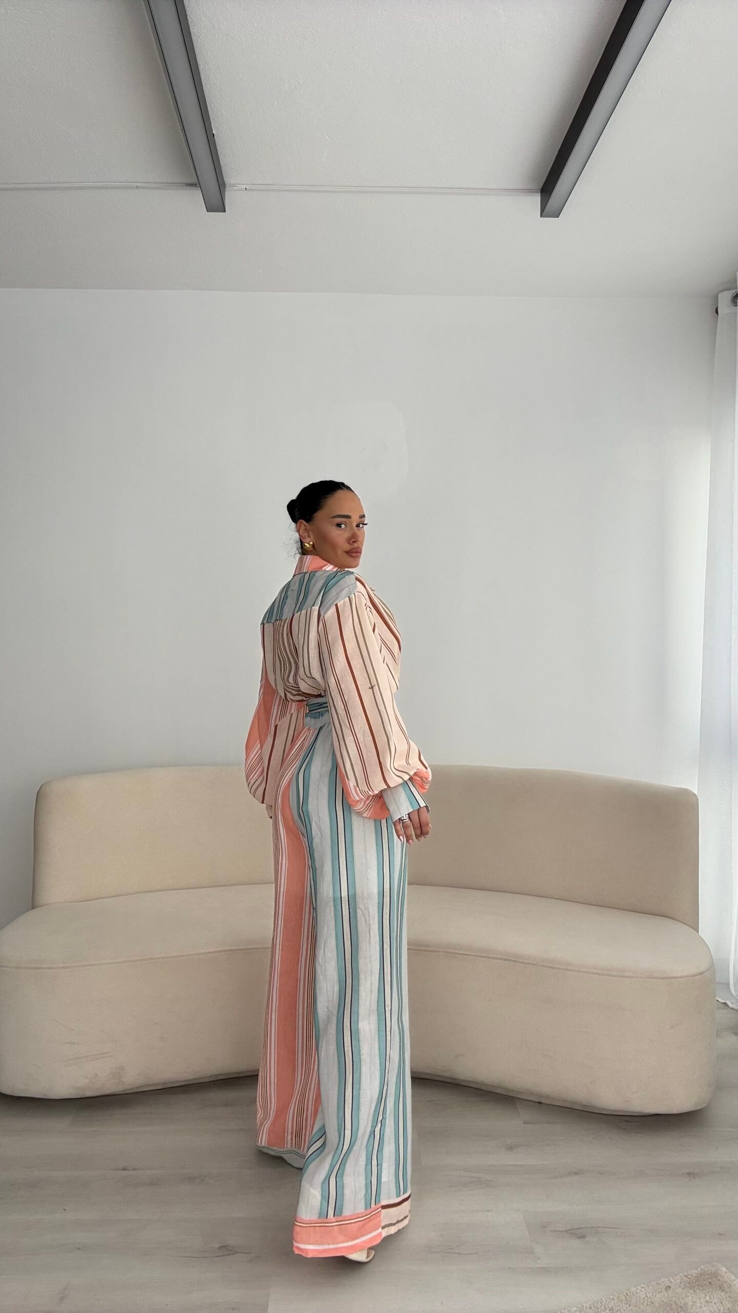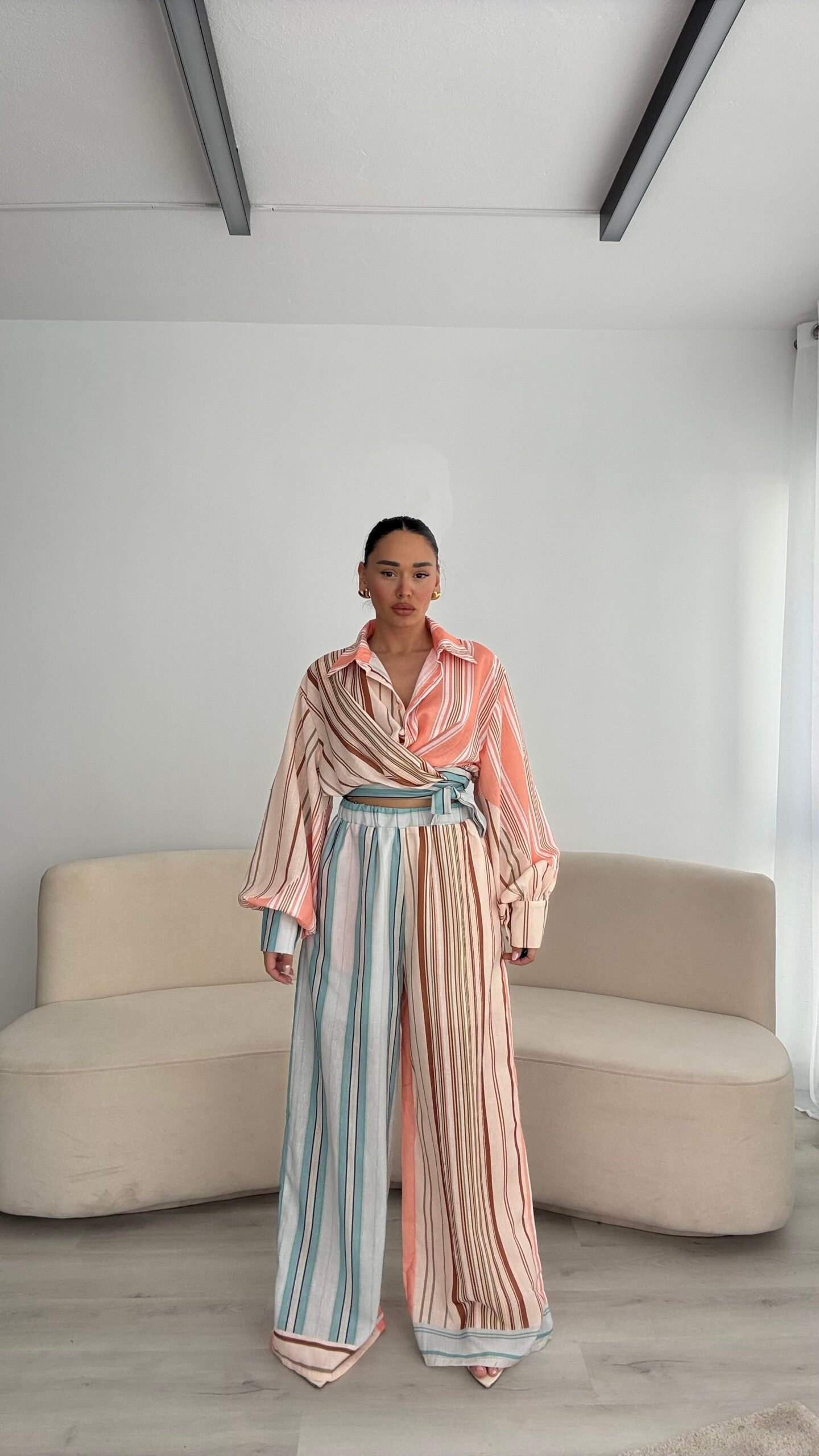Set 2 pjesësh me dizajn me vija dhe prerje wide-leg që jep elegancë dhe lëvizje të bukur në trup. Këmisha me lidhje në bel thekson linjat në mënyrë shumë feminile, ndërsa pantallonat e gjera krijojnë një look të gjatë dhe effortless. Material i lehtë dhe komod, perfekt për ditë vere me stil.