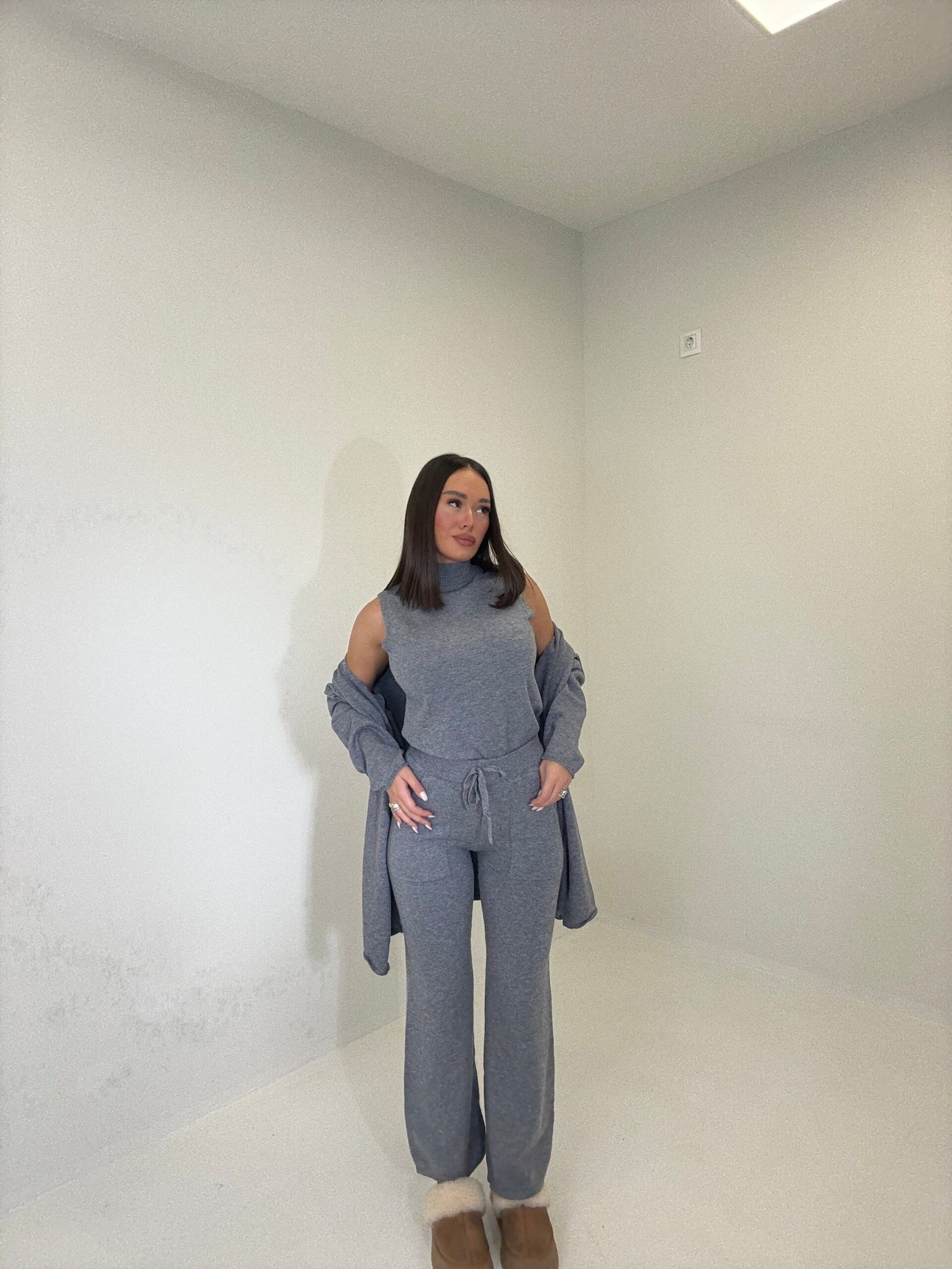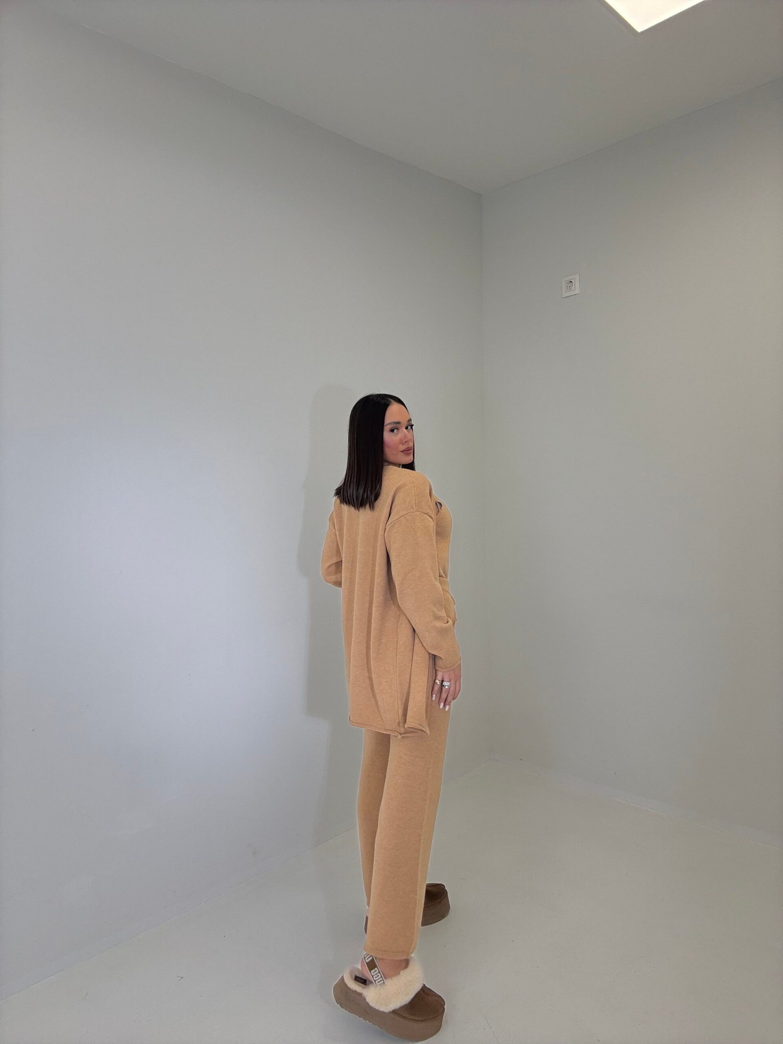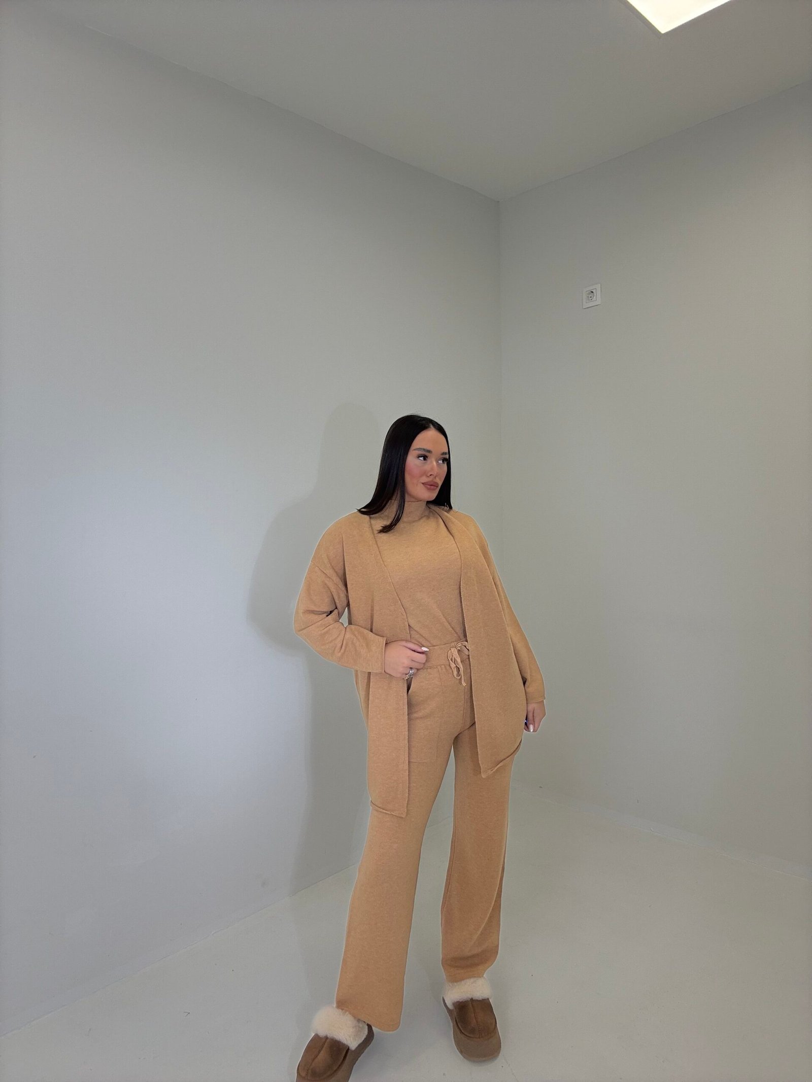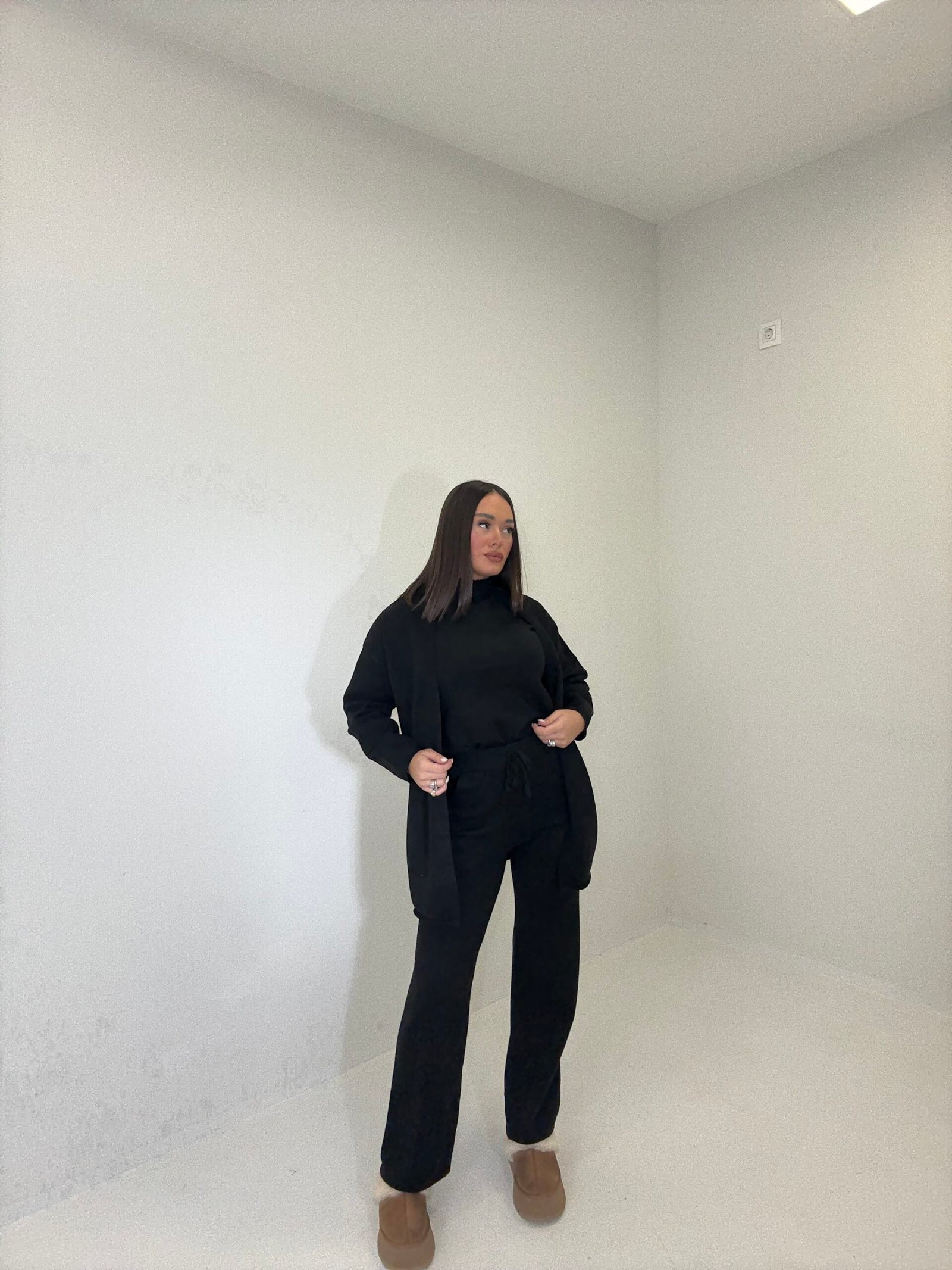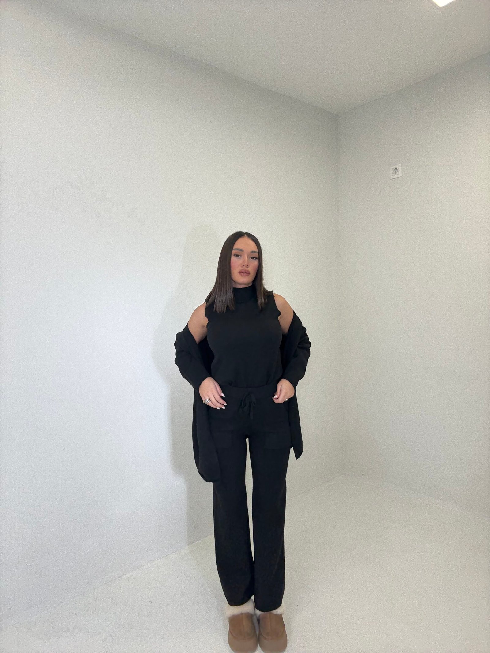 Set 3-pjesësh loungewear, përfshin bluzën e butë me jakë të lartë, pantallonat e gjera ultra-komode dhe cardiganin e lehtë për shtresim, duke krijuar kombinimin perfekt për ngrohtësi dhe stil në përditshmëri. Prerja e lirshme, dhe fleksibiliteti i përdorimit e kthejnë në një zgjedhje të domosdoshme për garderobën e sezonit. Ideale për vajzat që kërkojnë komoditet, thjeshtësi dhe pamje të kuruar në një të vetme.