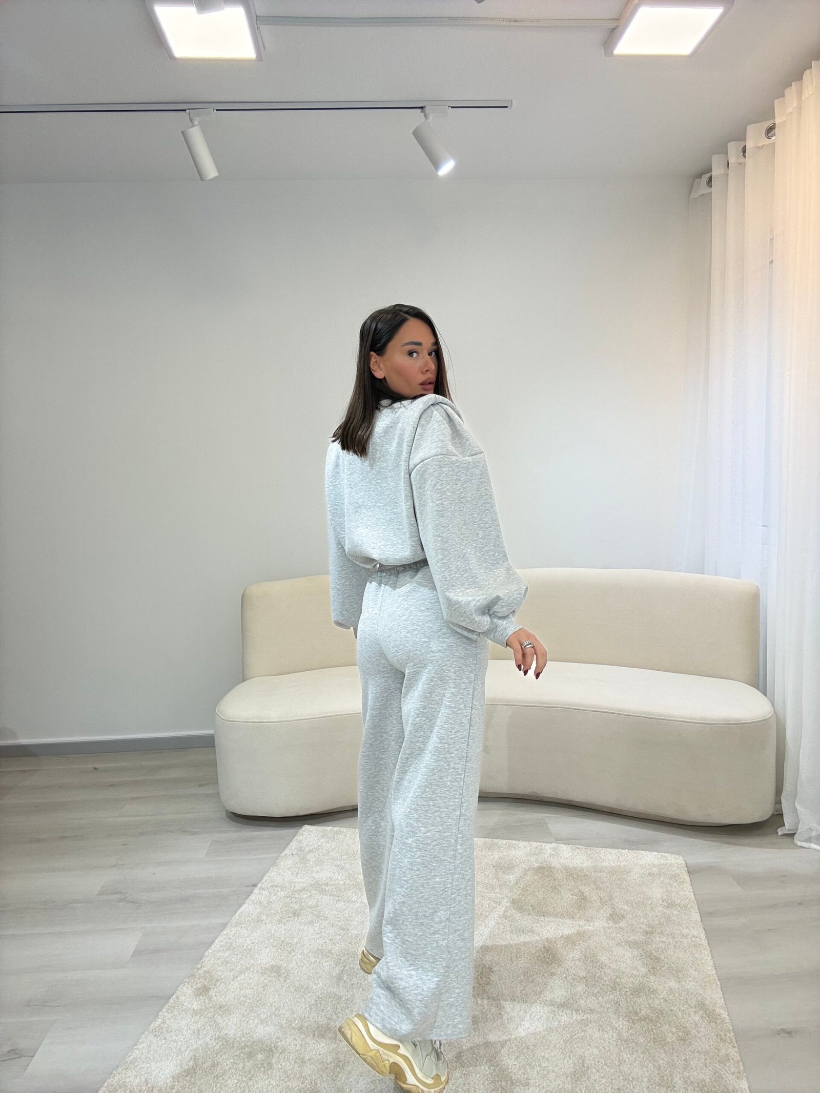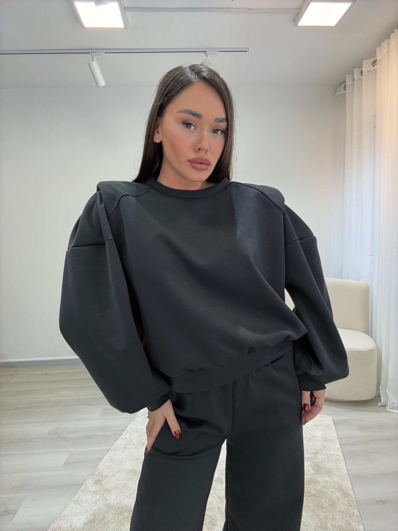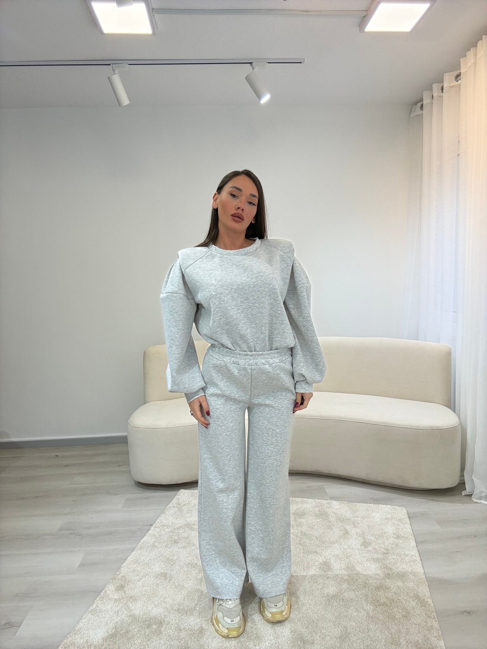 Set modern dhe minimalist me pantallona të gjera dhe bluzë me prerje të relaksuar, ideal për përditshmëri aktive dhe stil urban. Material i butë dhe komod që ofron rehati maksimale, duke ruajtur një pamje të pastër dhe elegante për çdo moment të ditës.