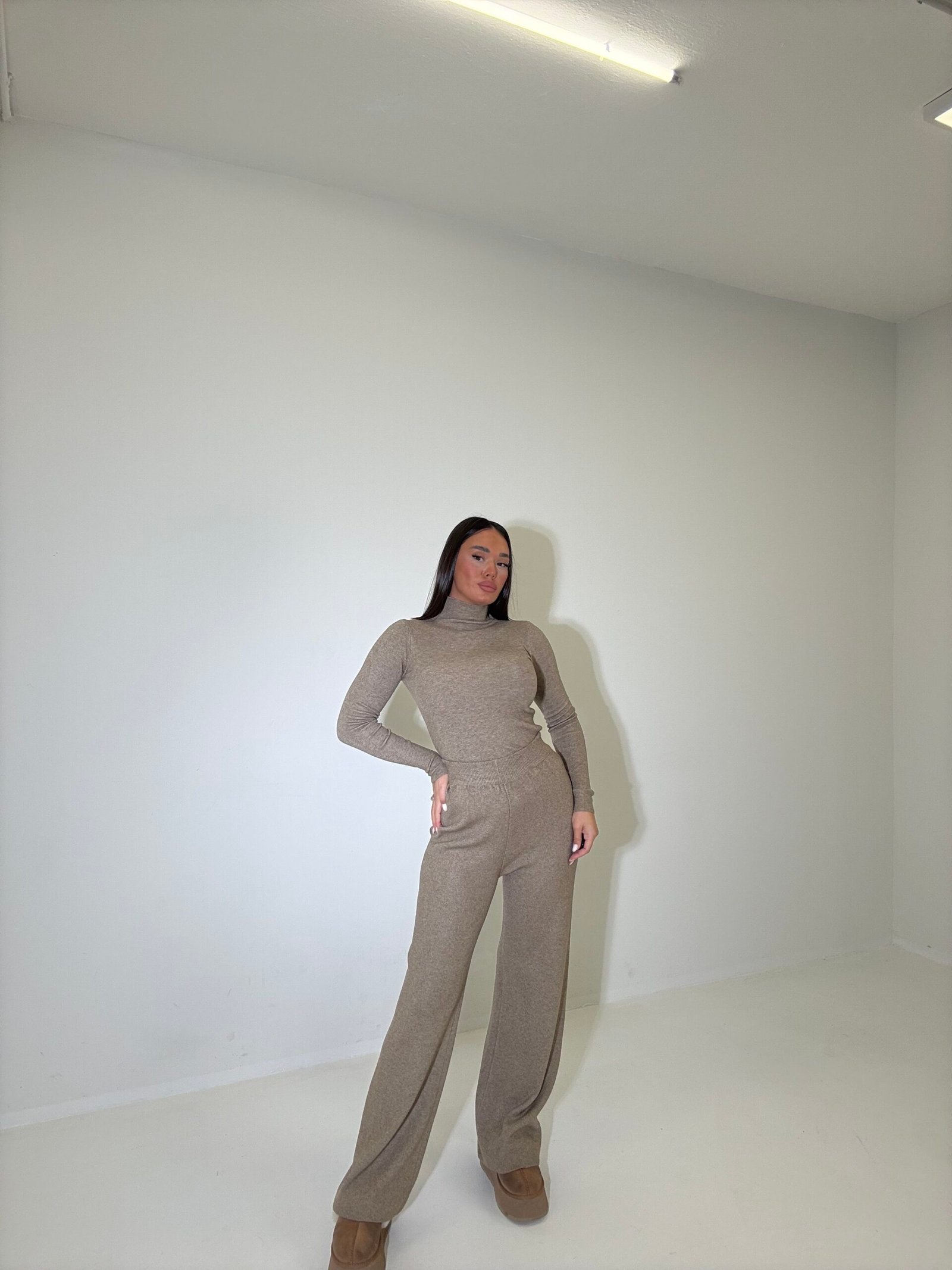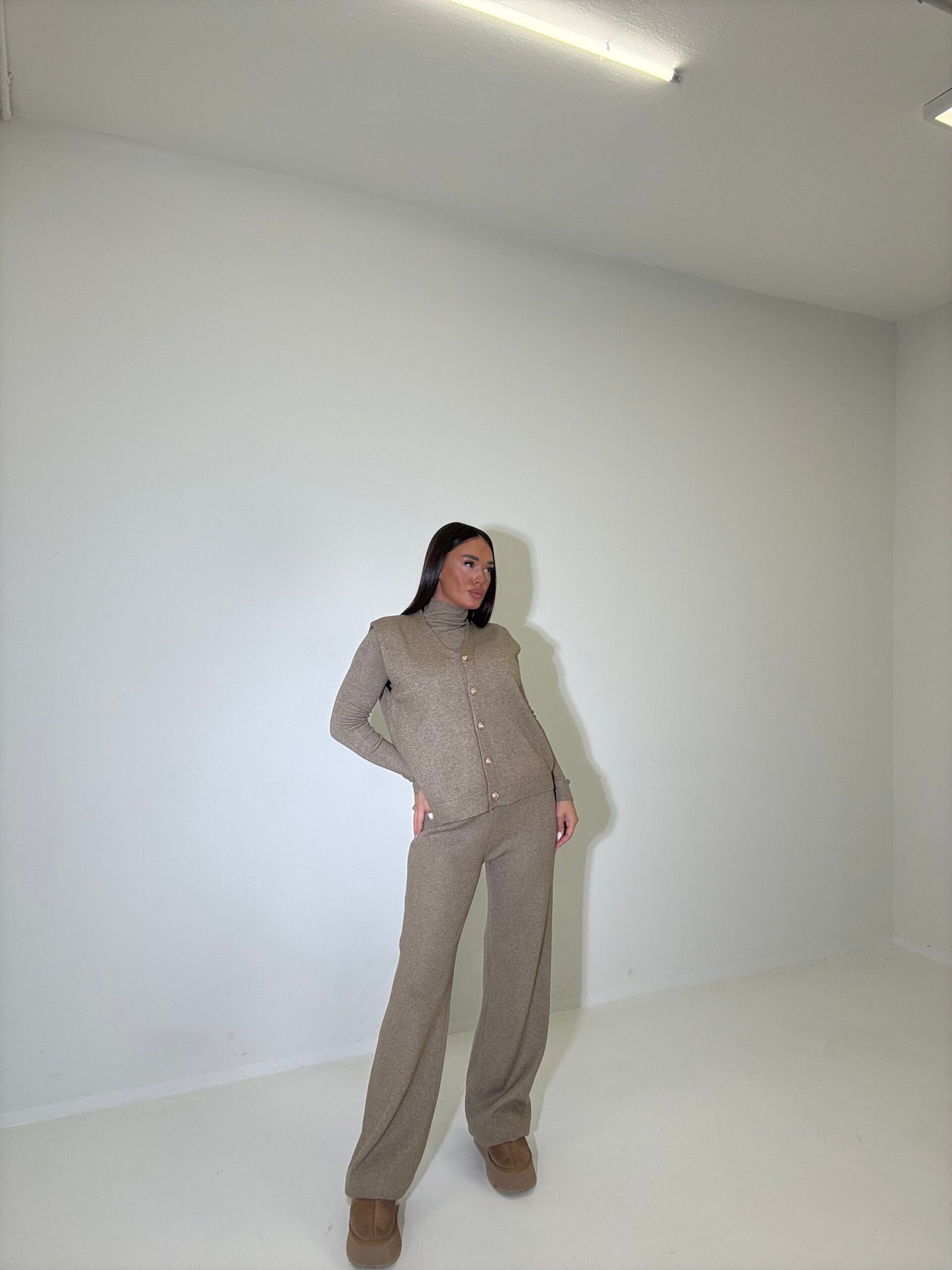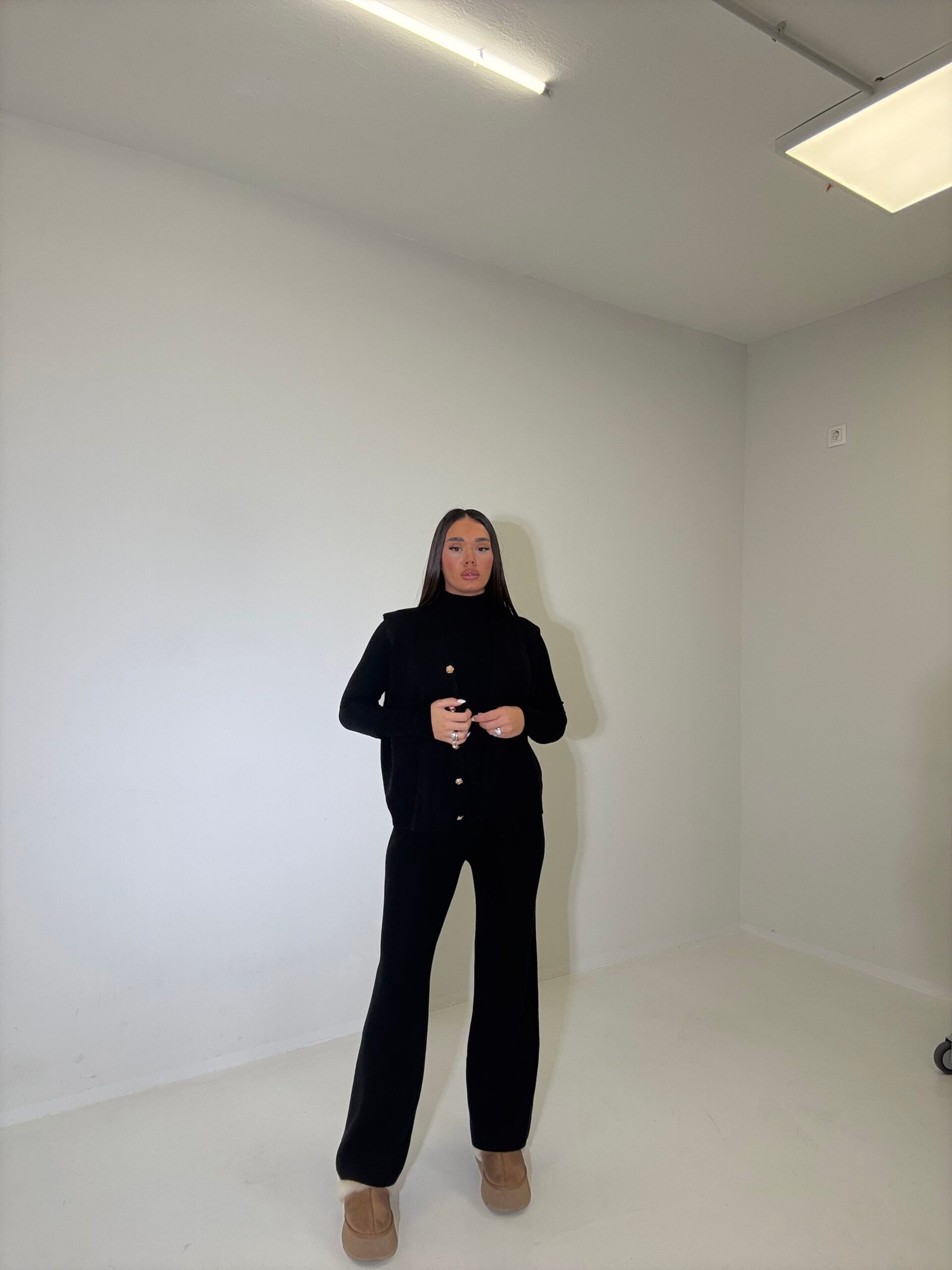 Set i butë dhe elegant me pantallona të gjata, golf të ngushtë dhe jelek me kopsa dekorative. Realizuar nga material elastik dhe i ngrohtë, ky set ofron rehati maksimale dhe pamje moderne për çdo ditë të ftohtë — perfekt për pamje “cozy chic”.
