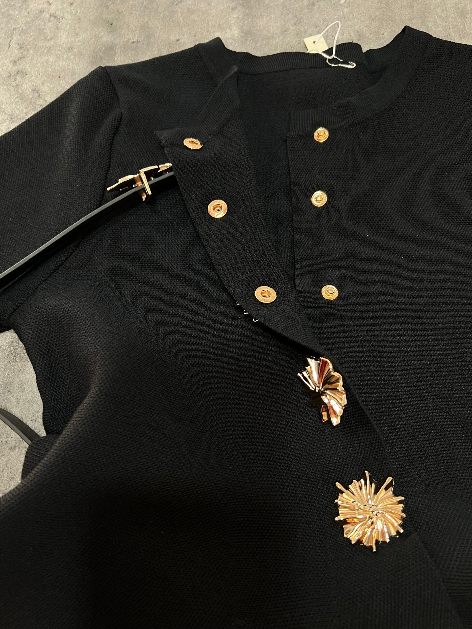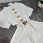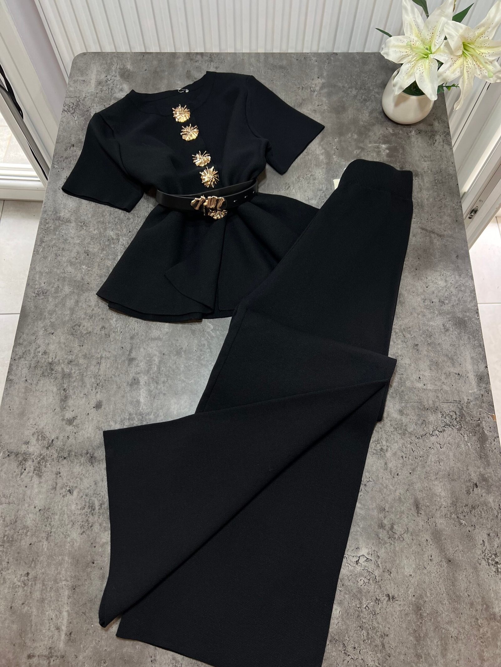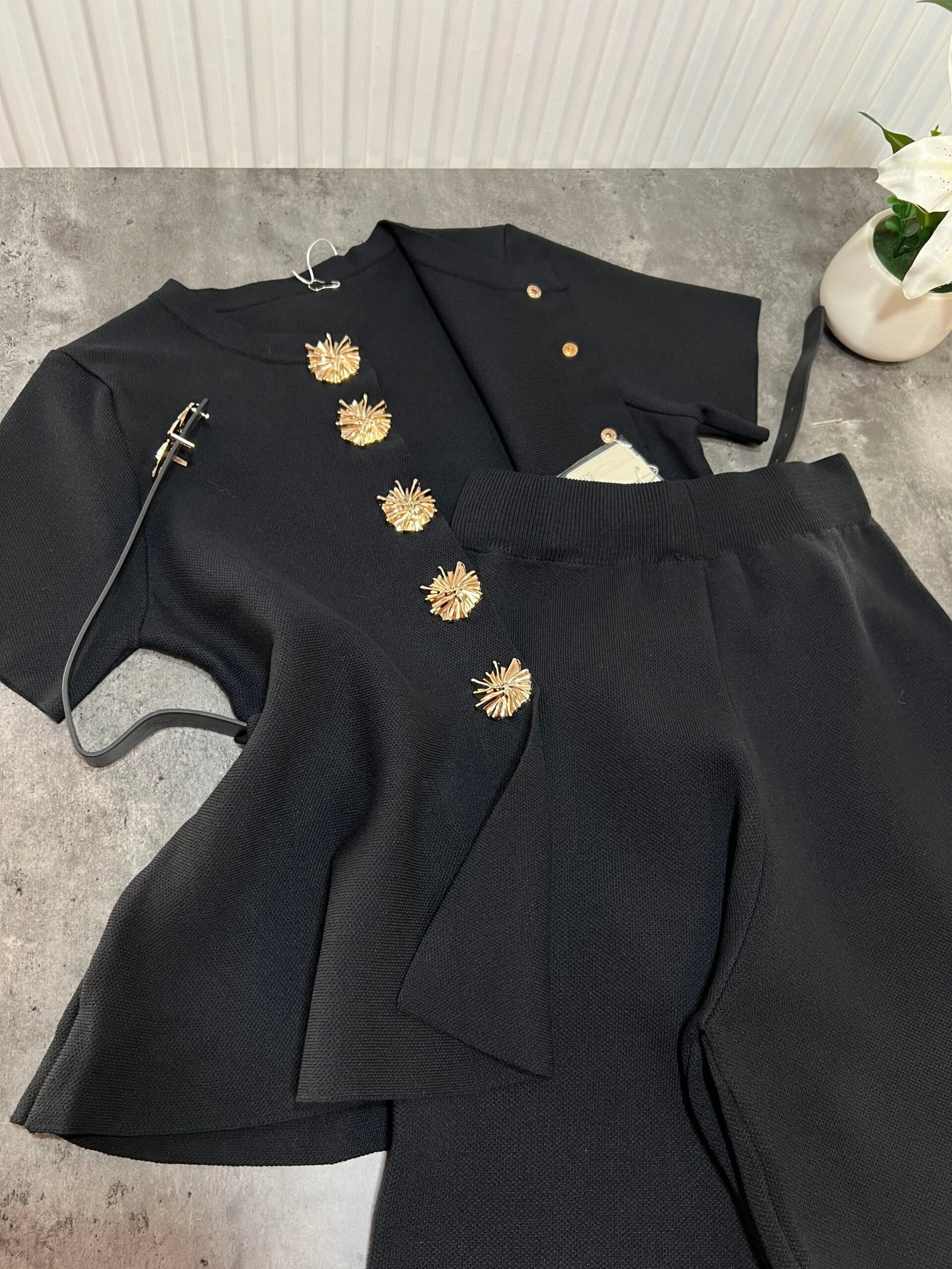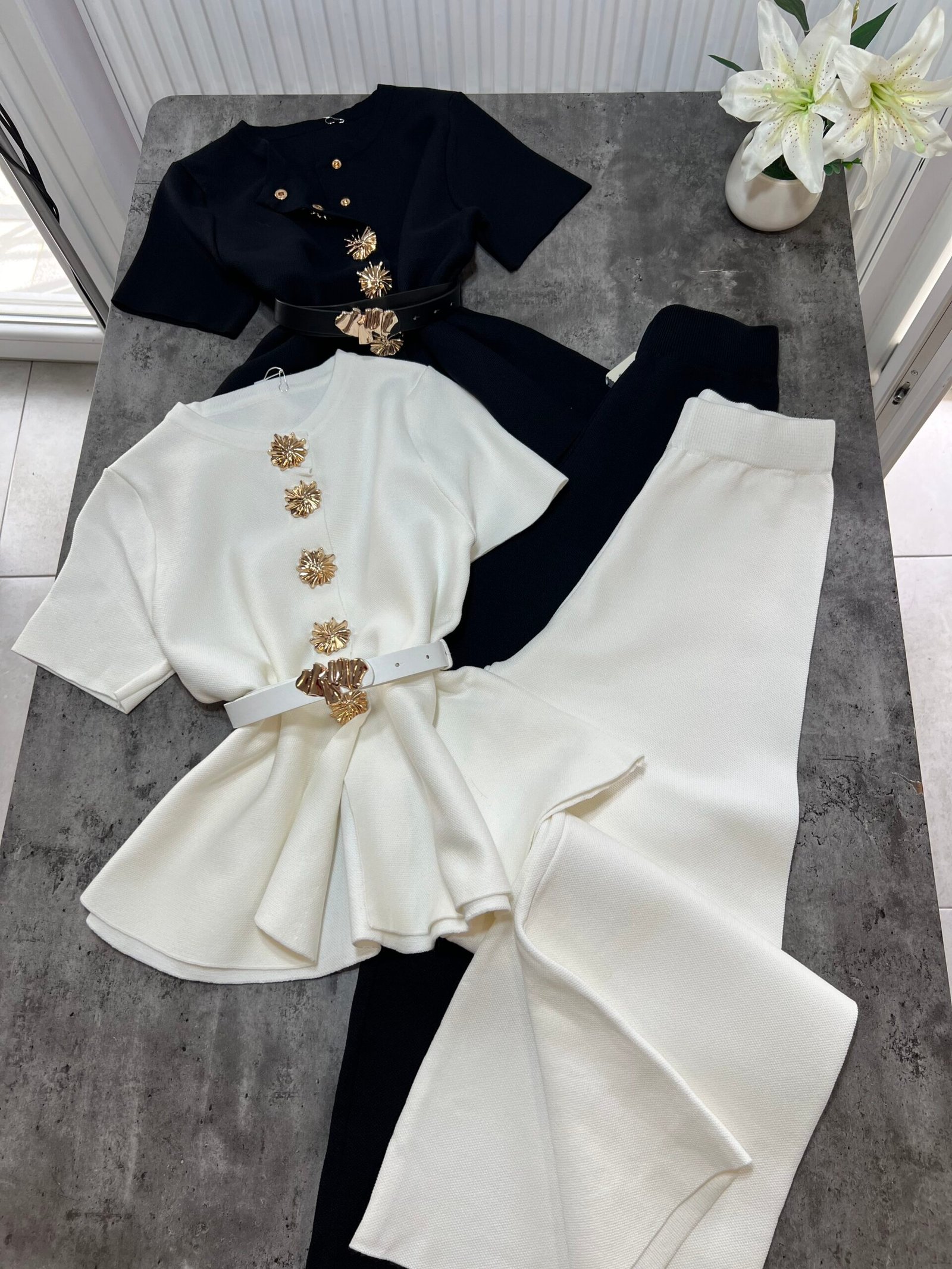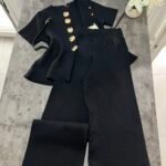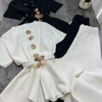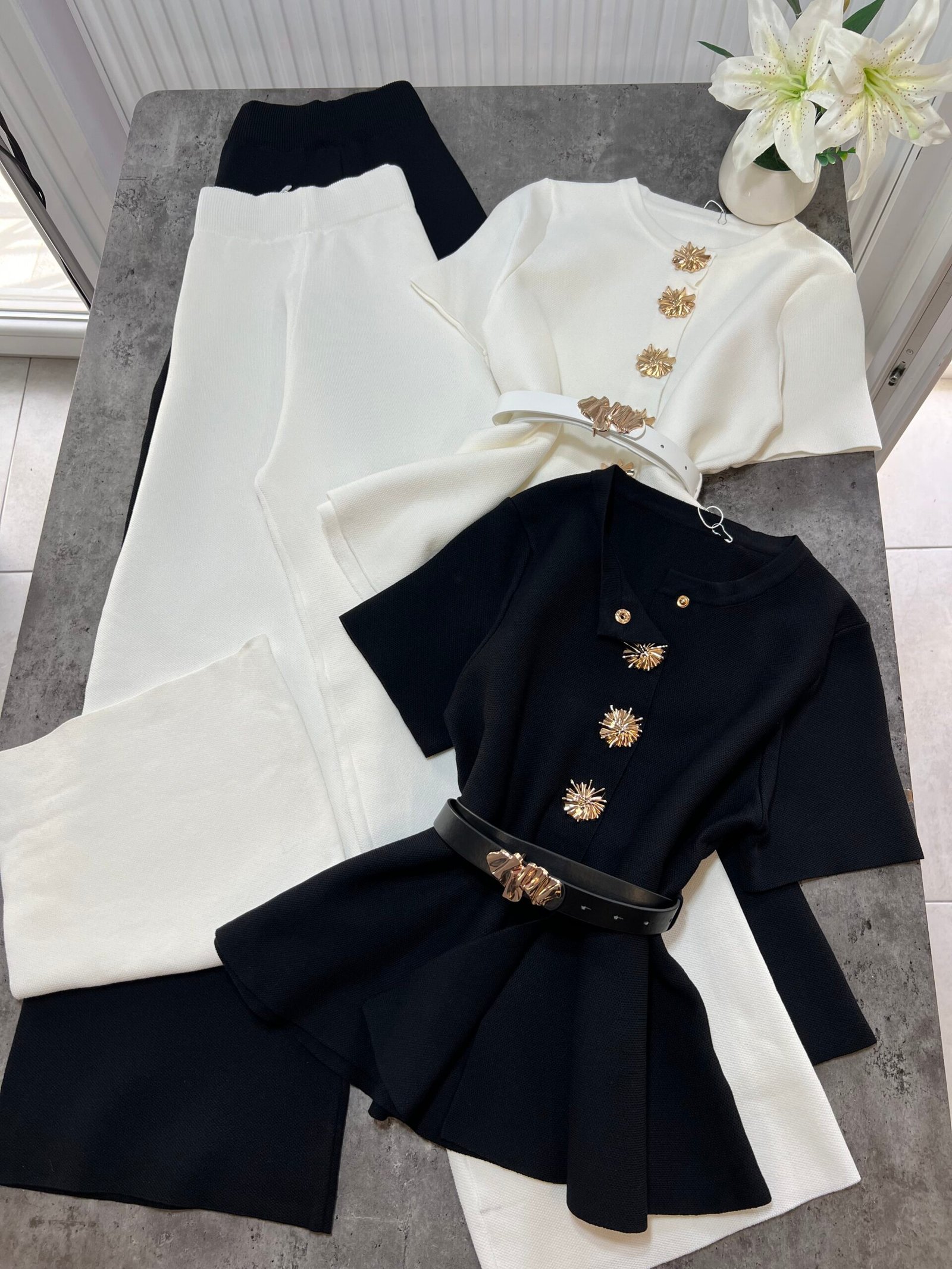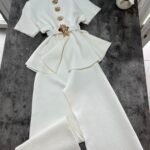 Set elegant dy-pjesësh i dizajnuar për një look modern dhe shumë femëror, i përbërë nga bluzë me mëngë të shkurtra dhe pantallona të gjera me prerje të strukturuar. Bluza është e punuar me pala delikate dhe e zbukuruar me kopsa metalike funksionale që i japin një ndjesi luksoze, ndërsa rripi në bel thekson bukur siluetën. Pantallonat me bel të lartë dhe linjë të drejtë ofrojnë rehati dhe elegancë në çdo lëvizje. Materiali cilësor mban formën dhe garanton veshje komode gjatë gjithë ditës. Ideale për evente, dalje elegante apo kombinime smart-casual, ky set është një zgjedhje perfekte për një garderobë moderne dhe të kuruar.