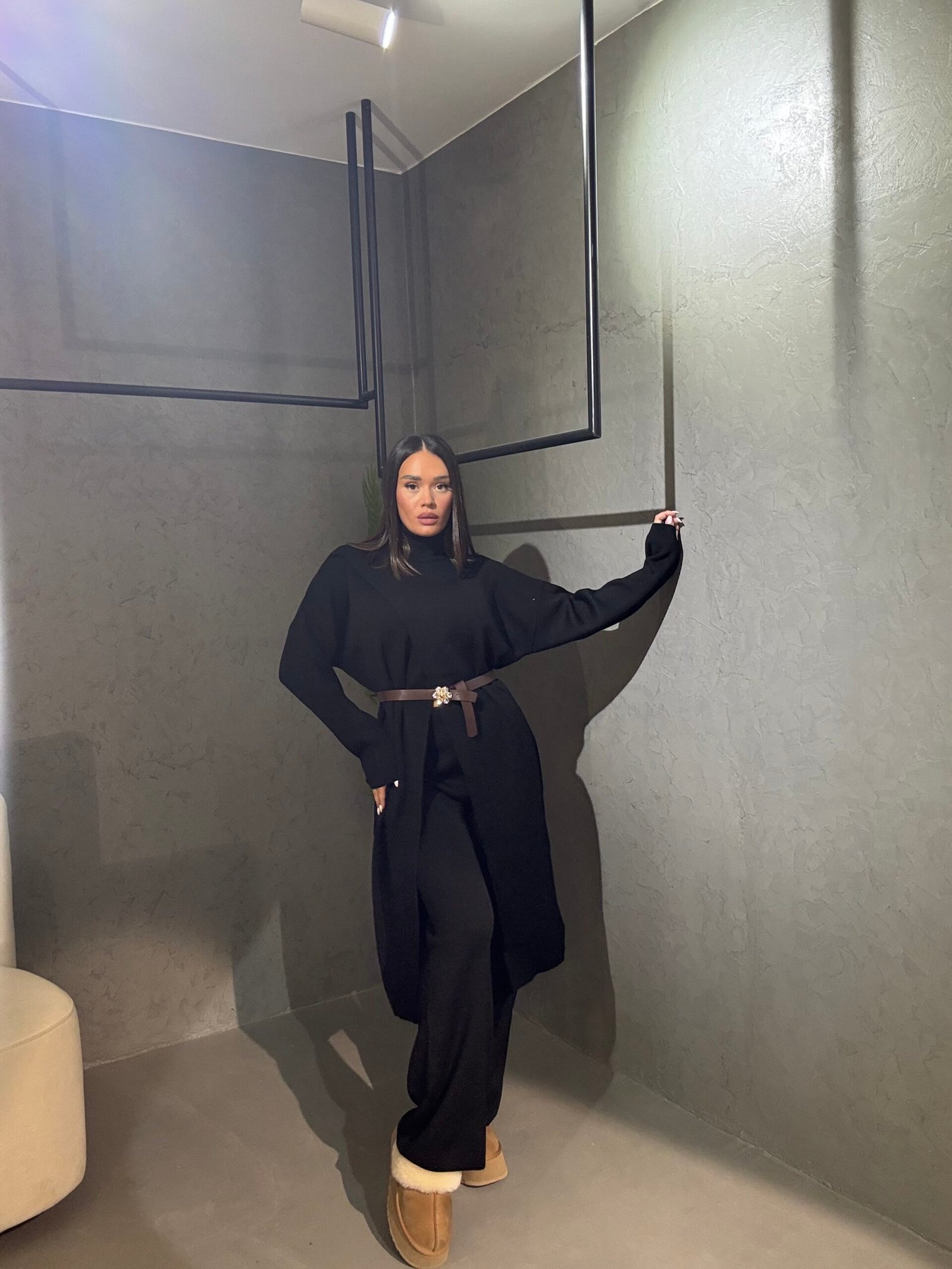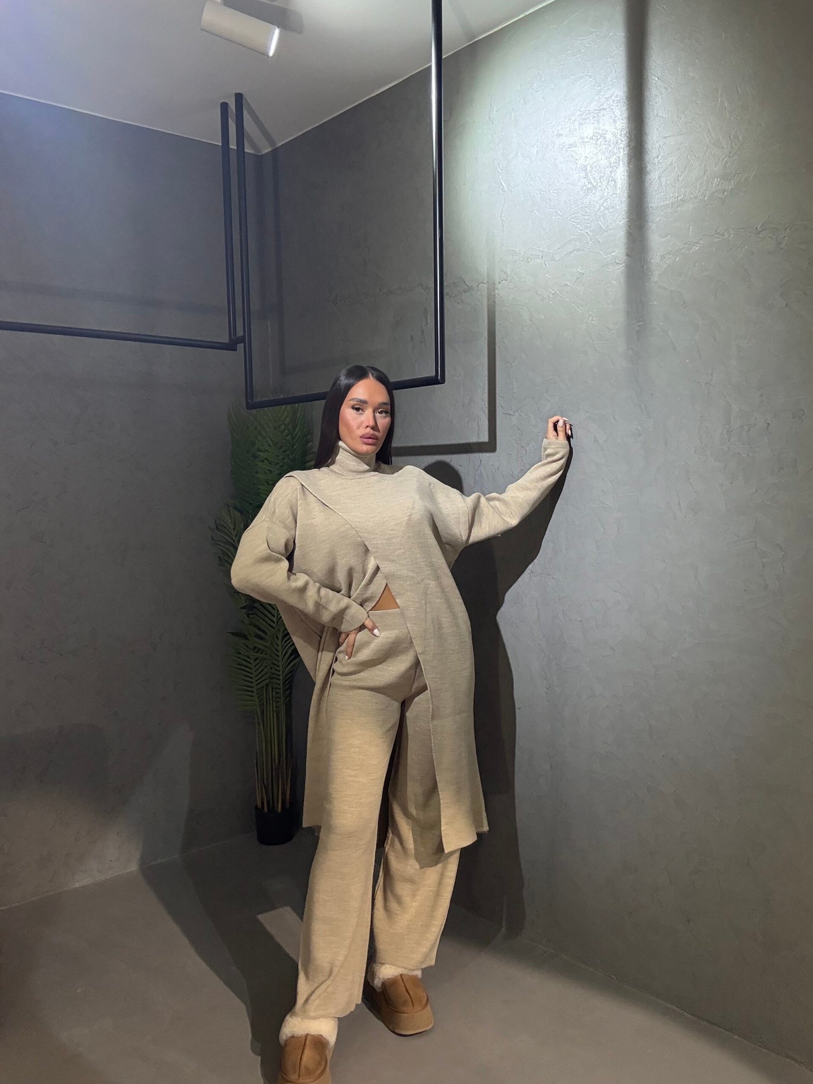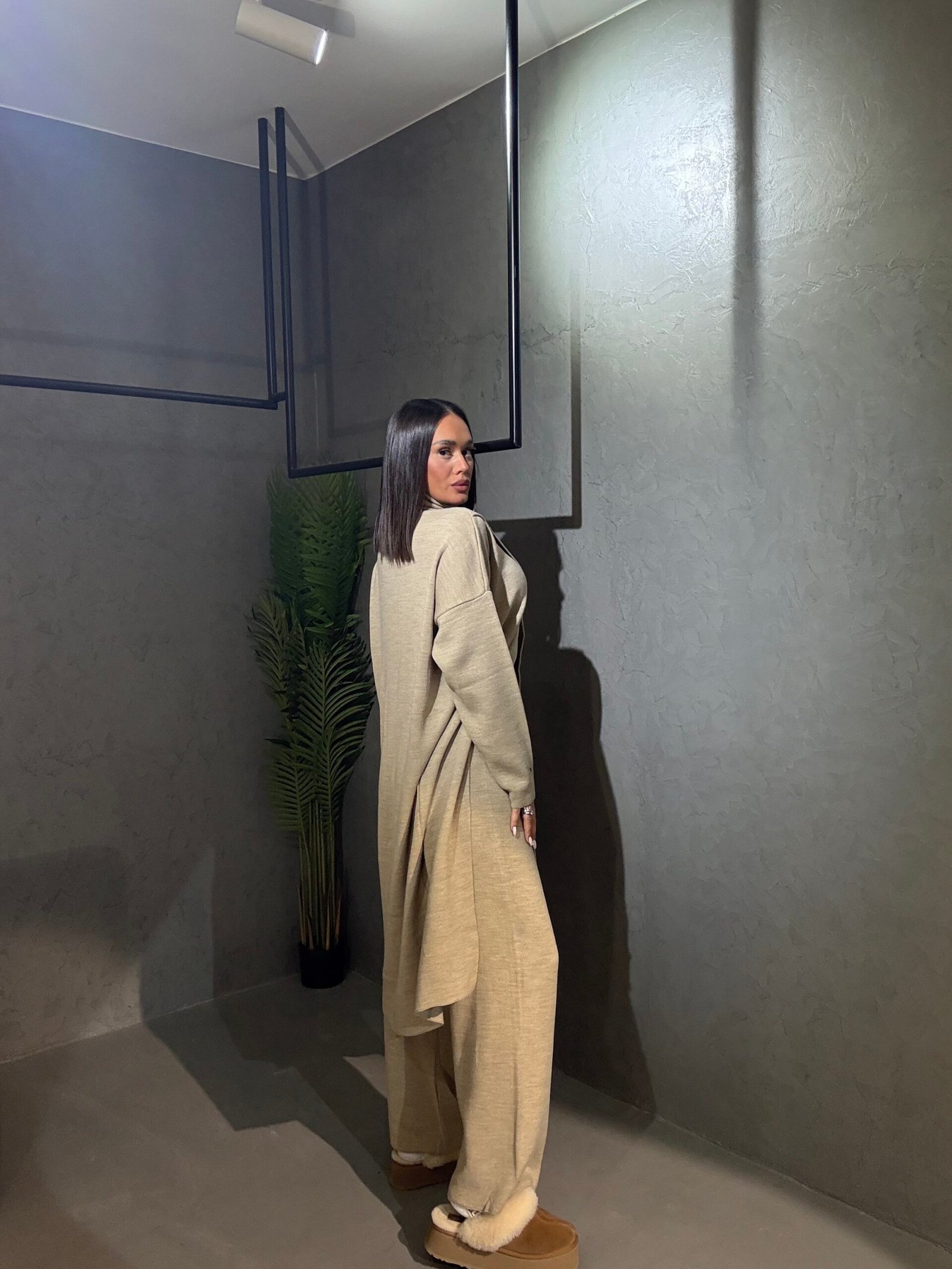 Kostum deve elegant me tunik të gjatë me prerje asimetrike dhe qafë të lartë që sjell një pamje moderne dhe të rafinuar. Materiali i butë dhe elastik siguron rehati gjatë gjithë ditës. Një kombinim perfekt mes finesës dhe komoditetit për çdo rast.