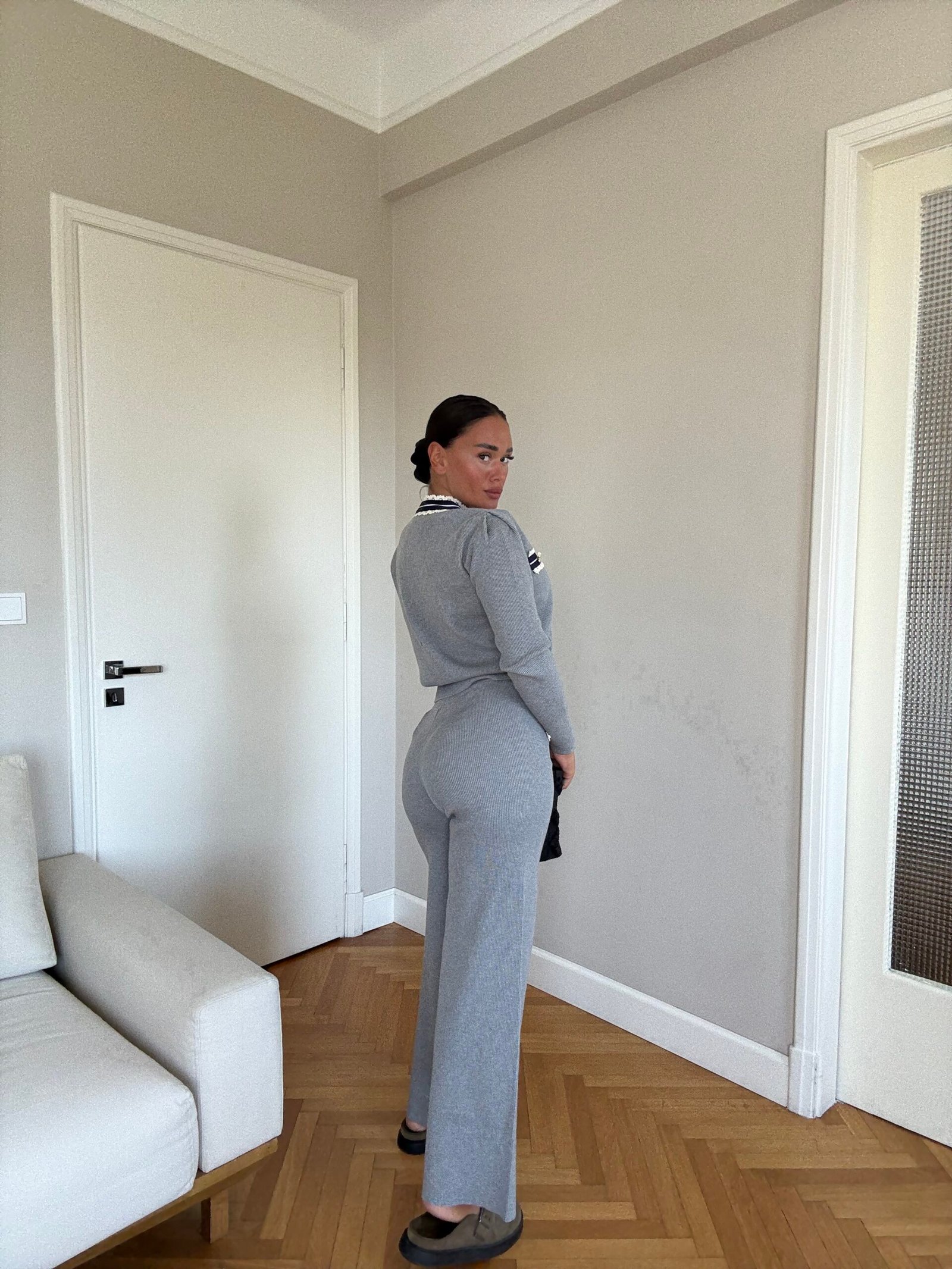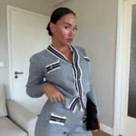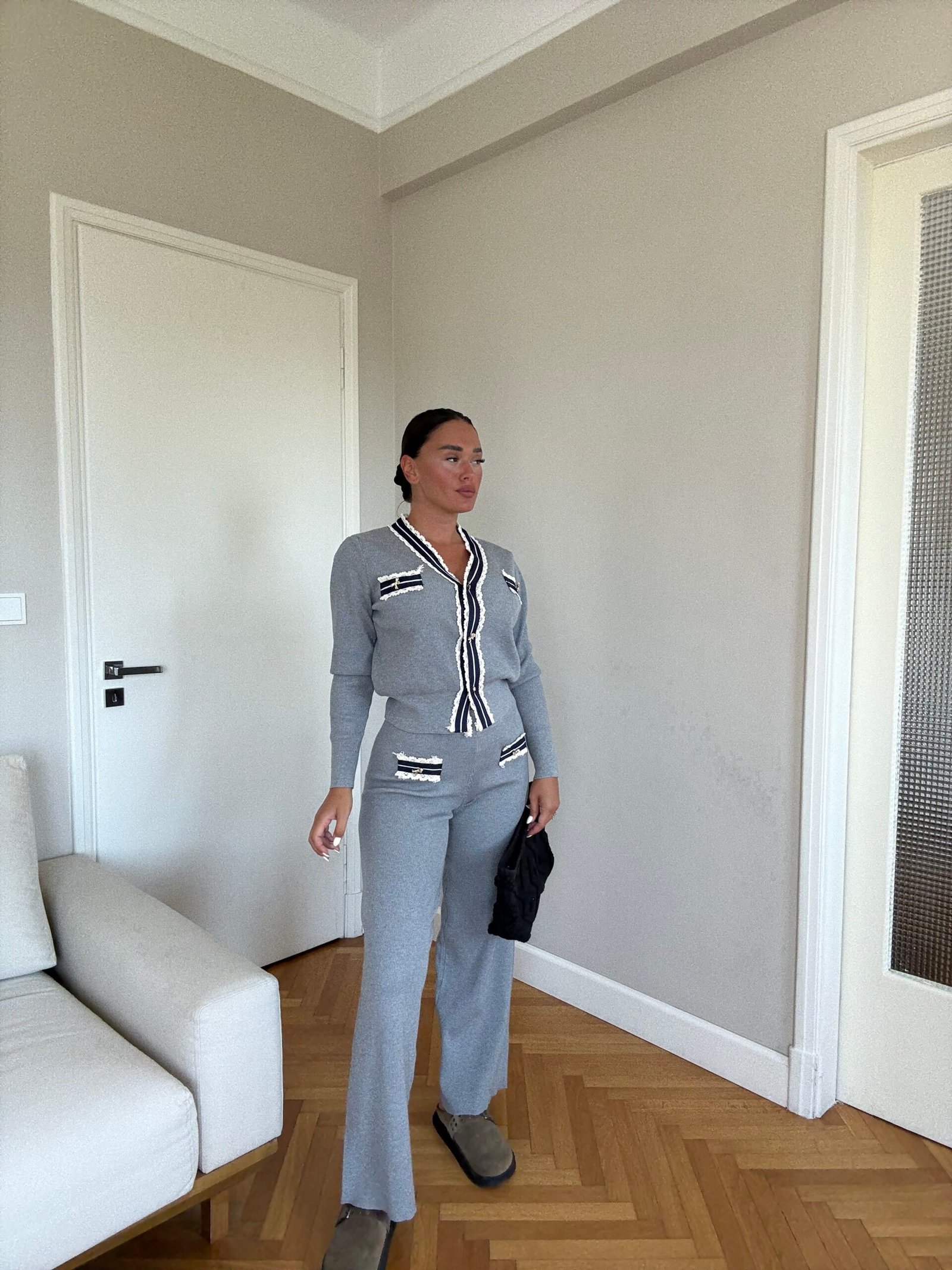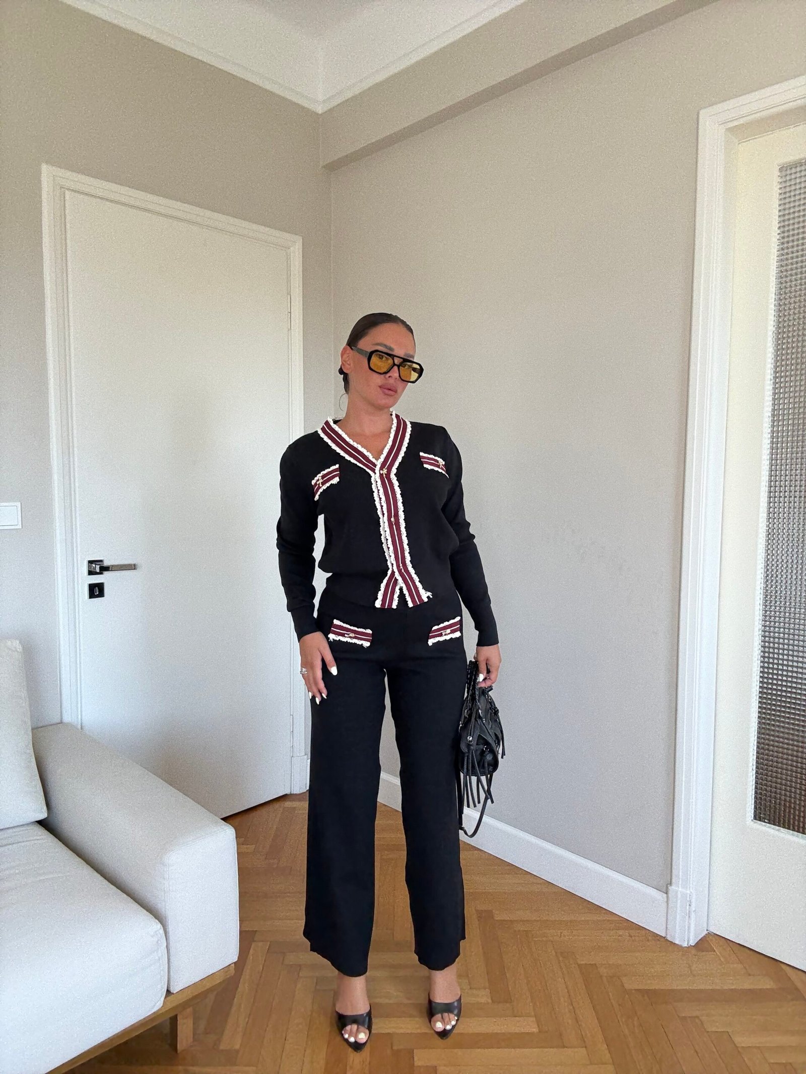 Ky set është zgjedhja ideale për një pamje elegante dhe komode. Përfshin një xhaketë të shkurtër me detaje kontrast në jakë, xhepa dhe përpara, të theksuara me kopsa dekorative që shtojnë hijeshi. Pantallonat me prerje të drejtë janë të rehatshme dhe i japin trupit një siluetë të rafinuar, perfekte si për kombinime ditore chic ashtu edhe për raste më formale.