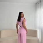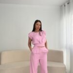 Ky set elegant përbëhet nga një top pa mëngë me prerje moderne dhe detaj lule në njërën anë, kombinuar me pantallona të gjata me bel të lartë dhe prerje të drejtë. Materiali i lehtë dhe i rehatshëm e bën ideal për ditët e ngrohta dhe eventet verore.Pamje e freskët dhe femërore, ndërsa dizajni minimal i shton finesë. Mund ta kombinoni me taka ose atlete për një stil casual-chic.