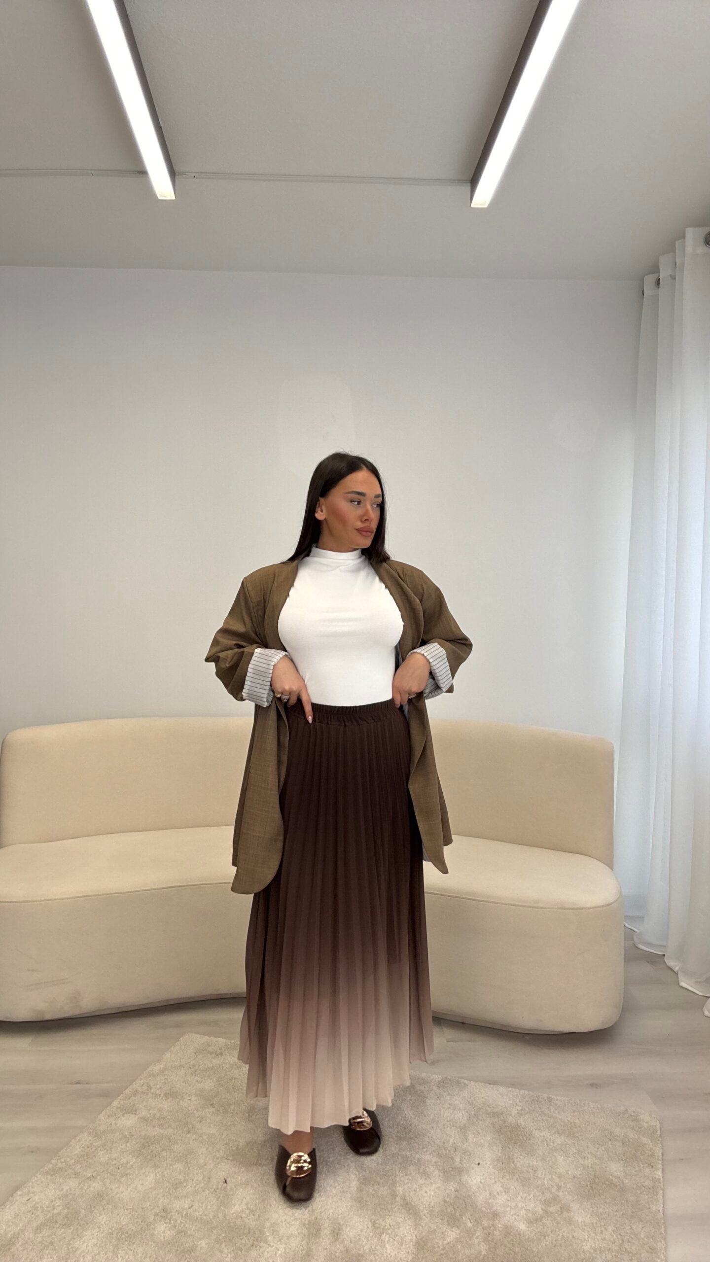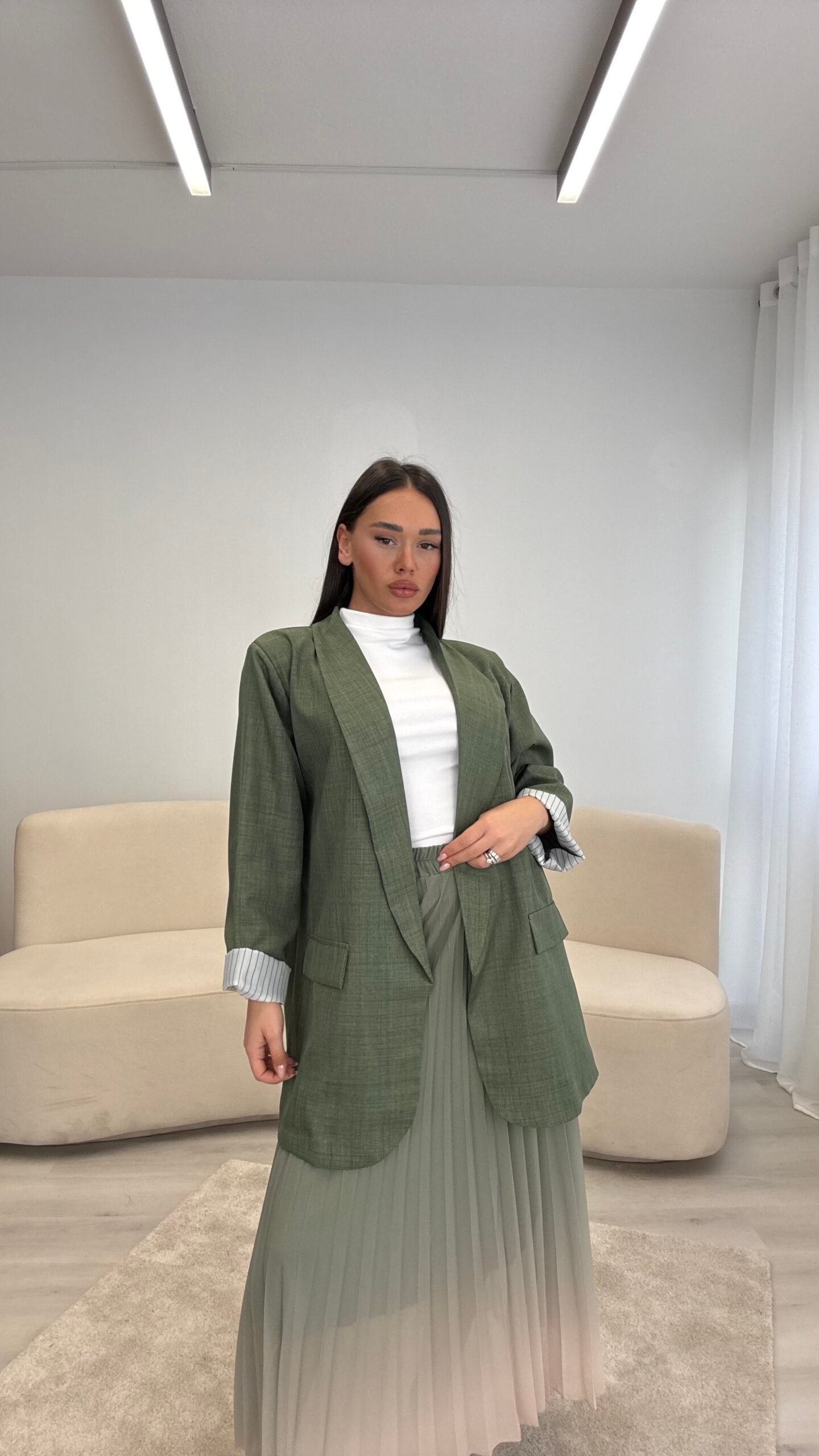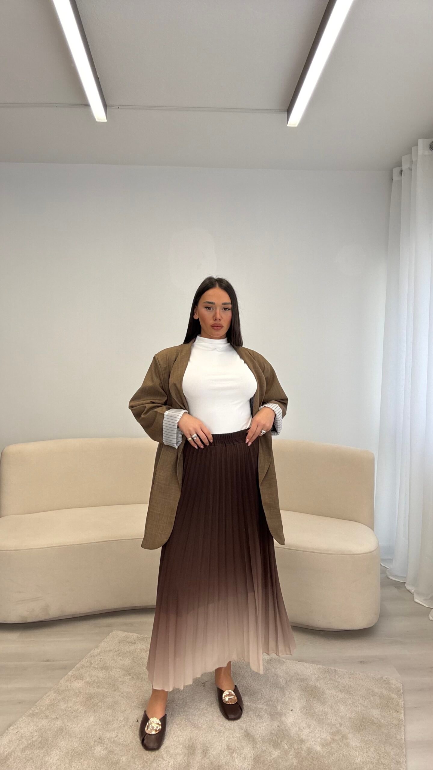 Set modern me xhaketë strukturuar dhe fund me pala me lëvizje fluide, i dizajnuar për një look elegant dhe të rafinuar. Pjesët mund të porositen edhe veçmas, duke ofruar fleksibilitet maksimal për kombinime të ndryshme. Ideal për outfit-e nga dita në darkë, me një balancë perfekte mes klasikes dhe trendit.