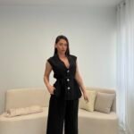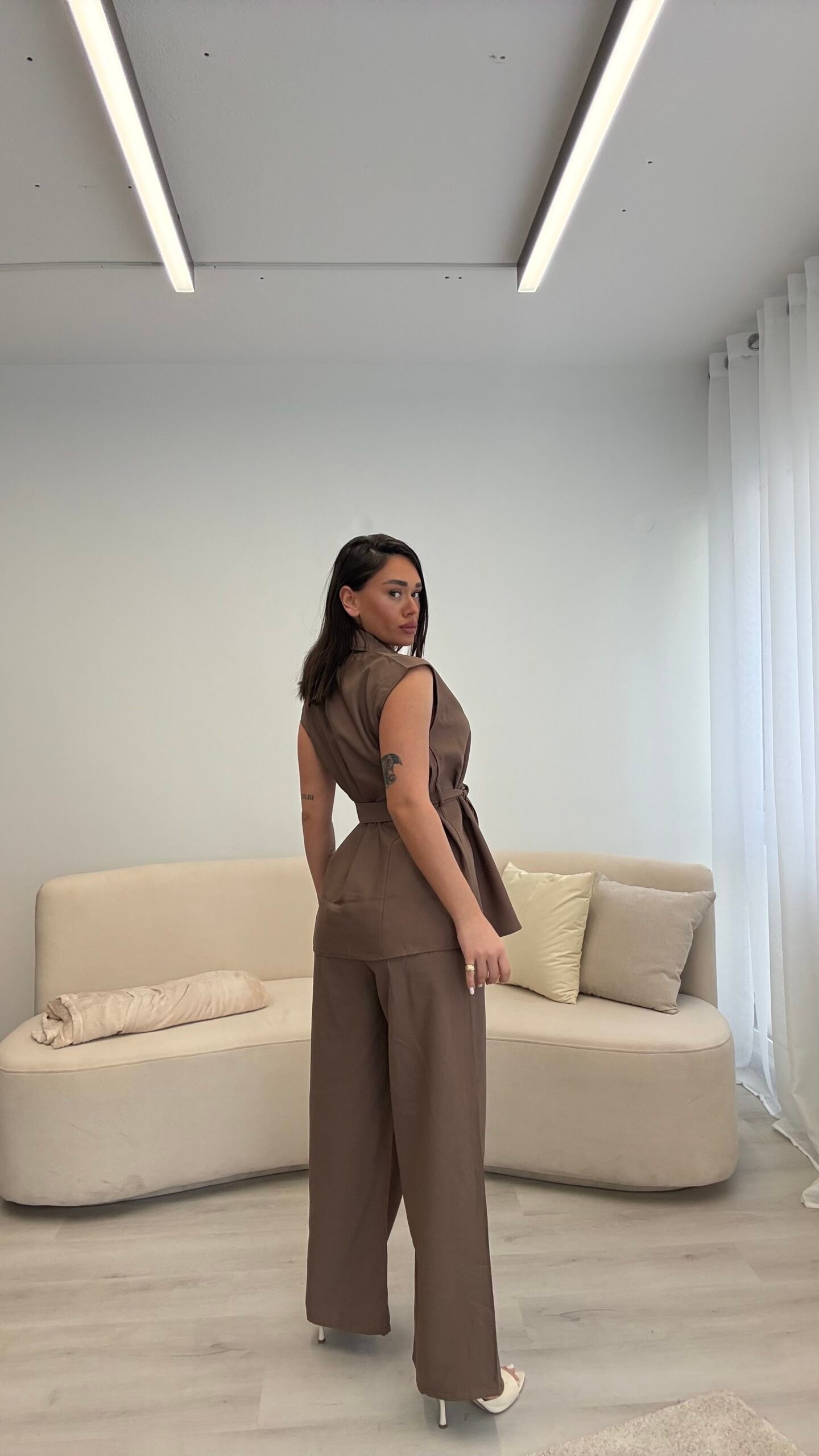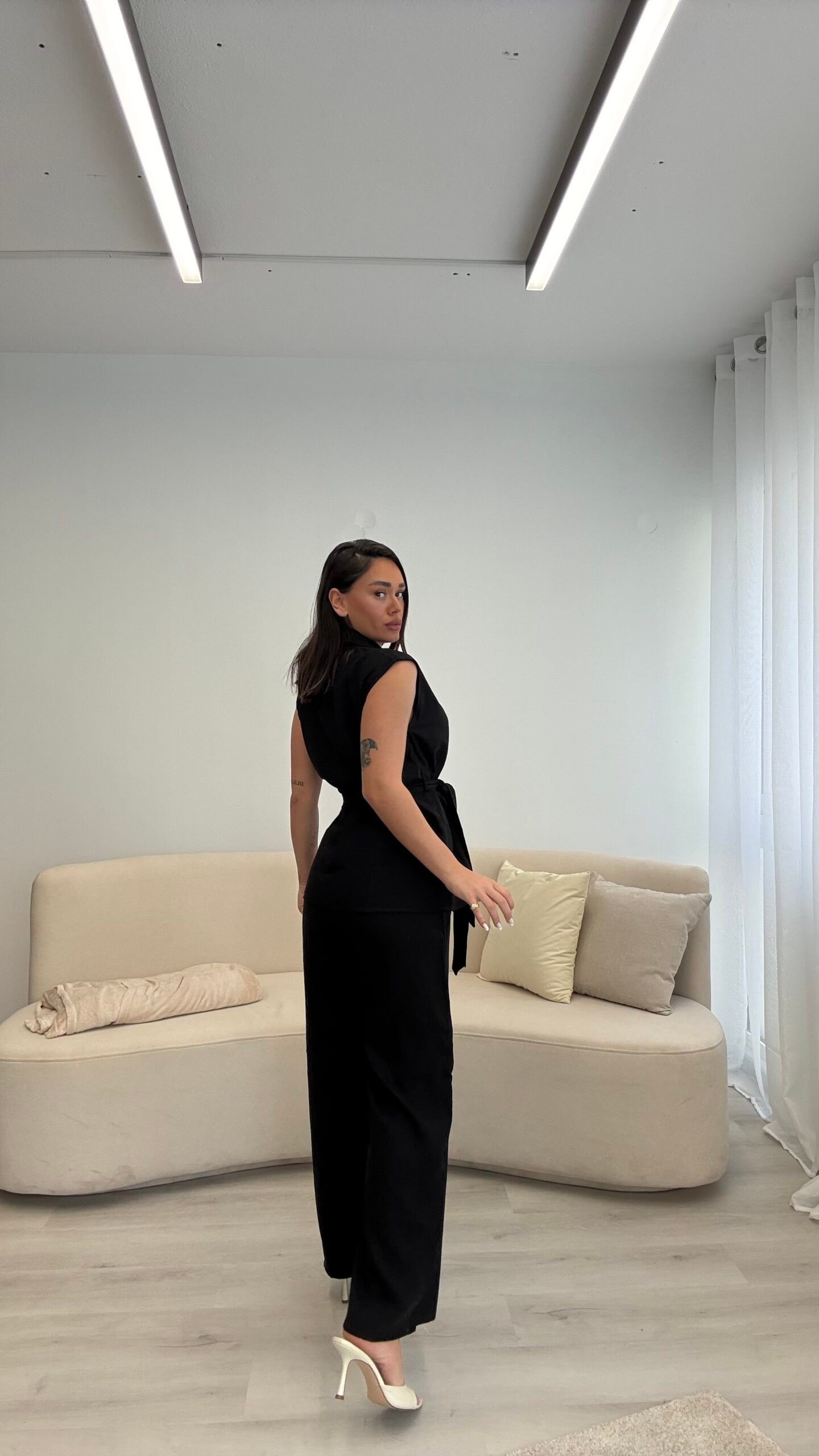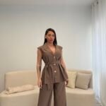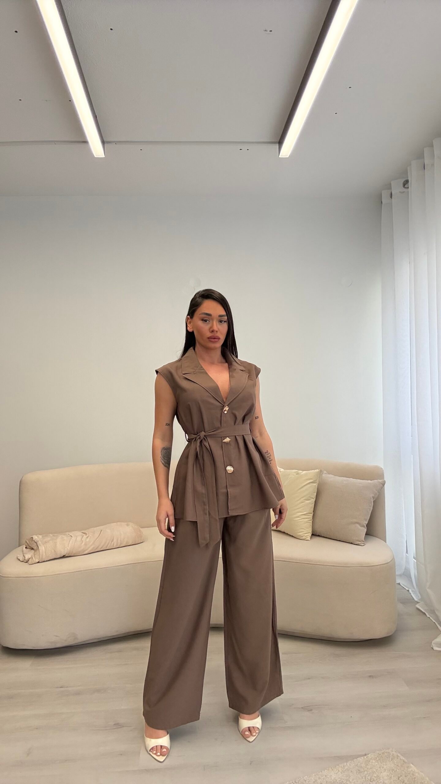 Set elegant dhe modern i përbërë nga jelek me prerje tailored, jakë klasike dhe rrip në bel që thekson siluetën, i kombinuar me pantallona wide leg për një pamje të rafinuar dhe komode. Material i lehtë dhe i rrjedhshëm, ideal për city look, evente ose stil elegant të përditshëm.