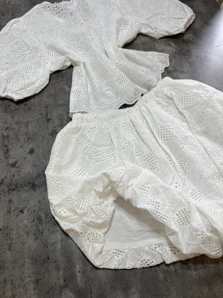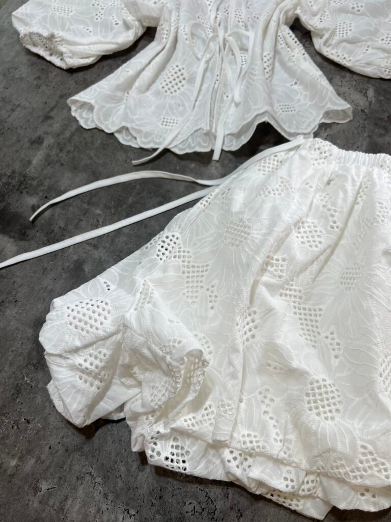 Pantallona të shkurtra të gjera në trajtë fundi, me bel të larte me llastik dhe lidhëse. Përmbajnë xhepa funksionale dhe astar brënda.