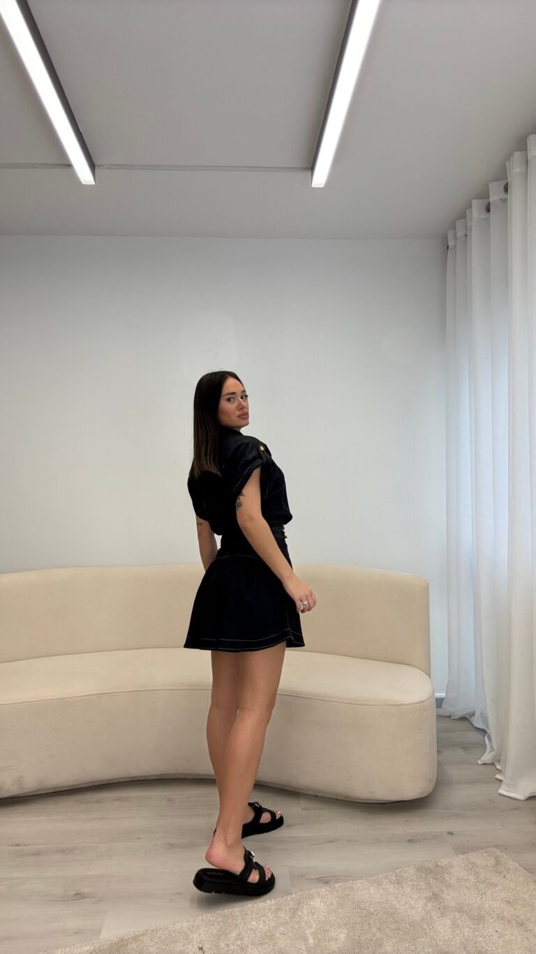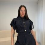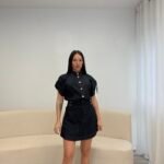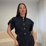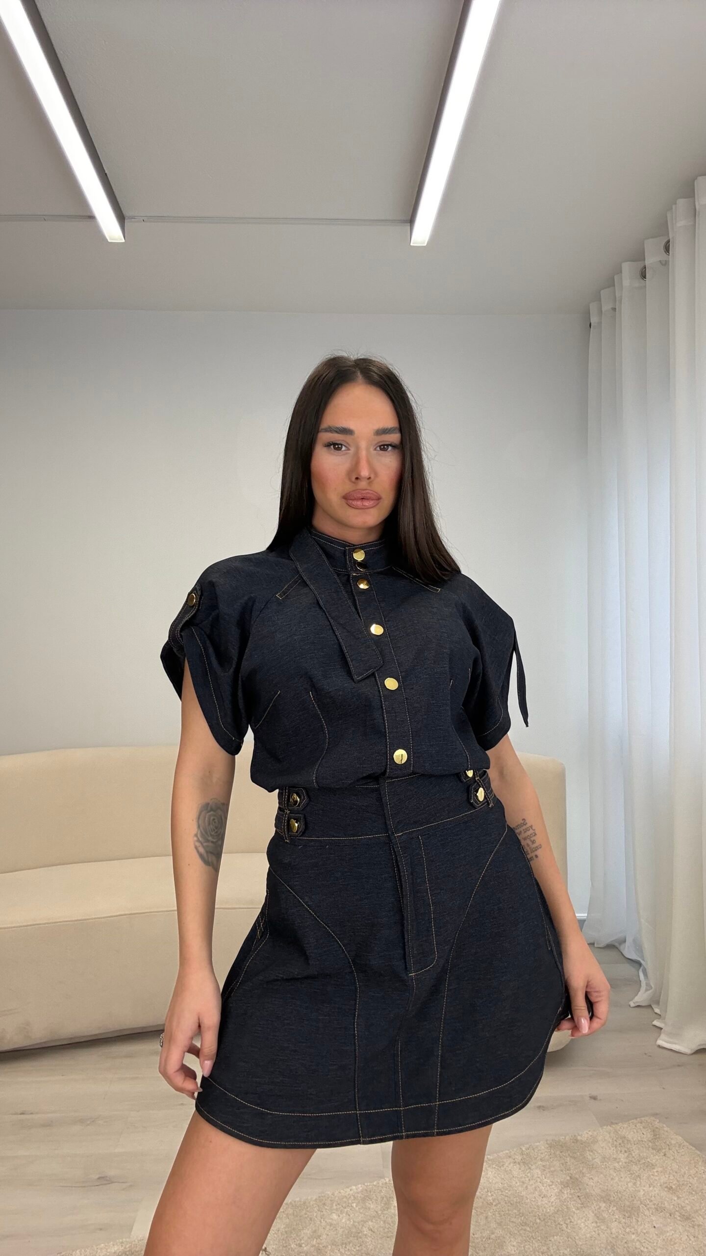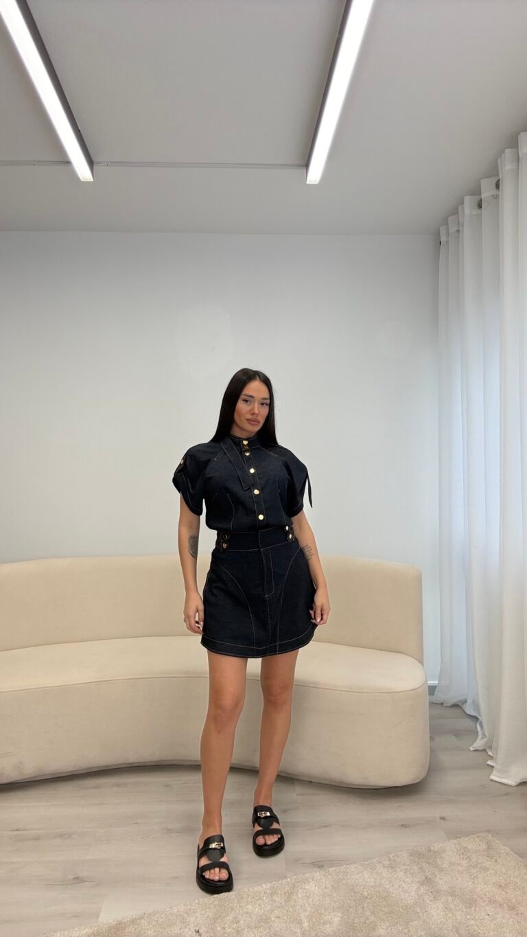Set modern jeans i përbërë nga fund me prerje te strukturuar dhe këmishë e shkurtër me kopsa gold, që thekson linjat e trupit dhe krijon një look të fortë, clean dhe “effortless chic” për çdo dalje.
