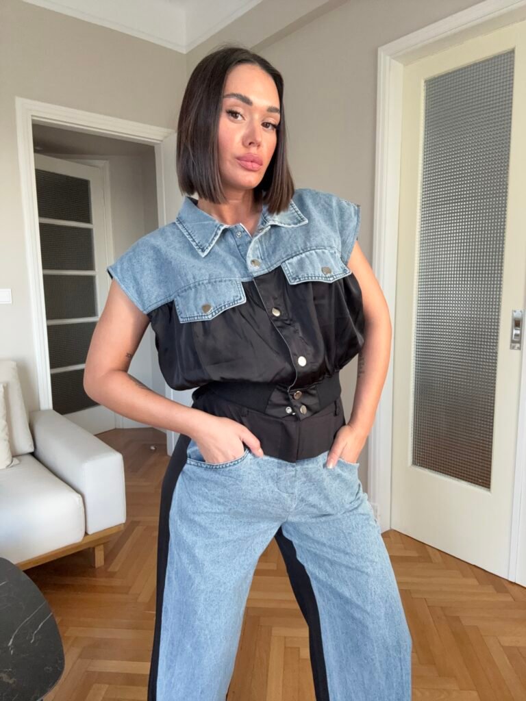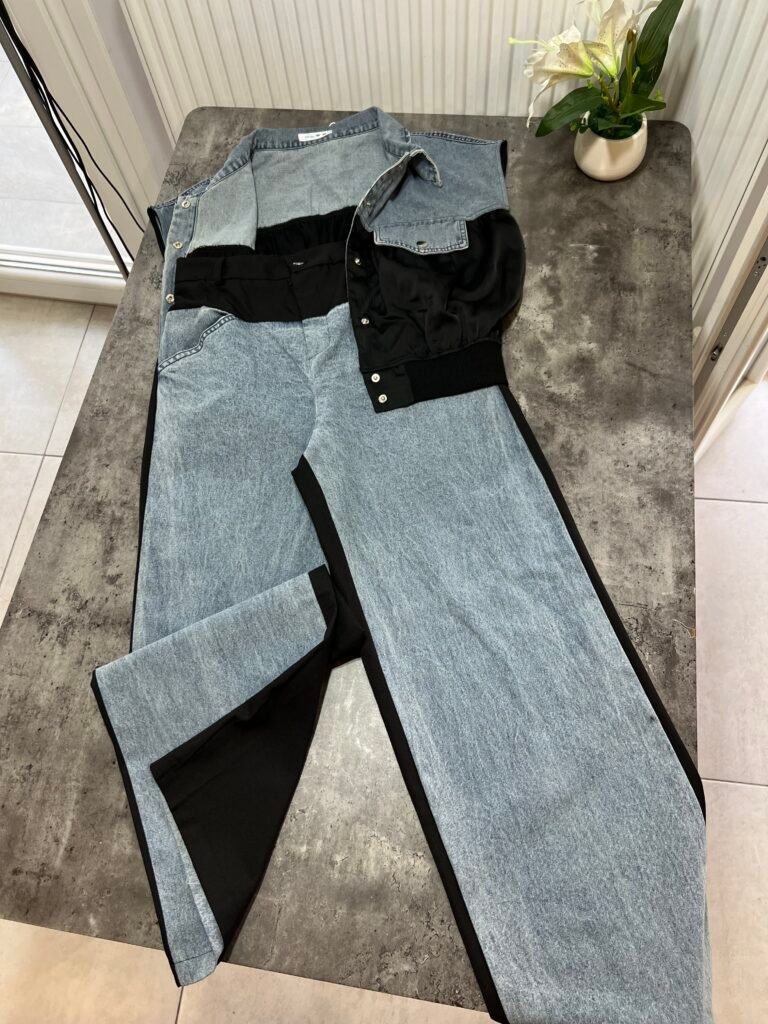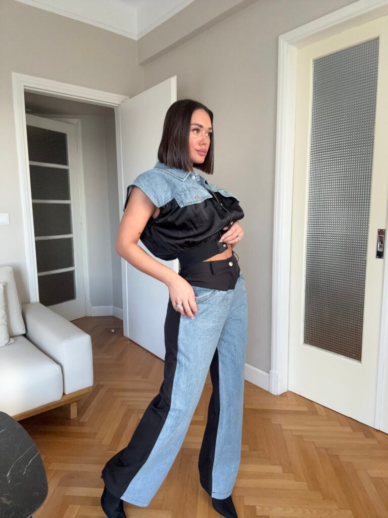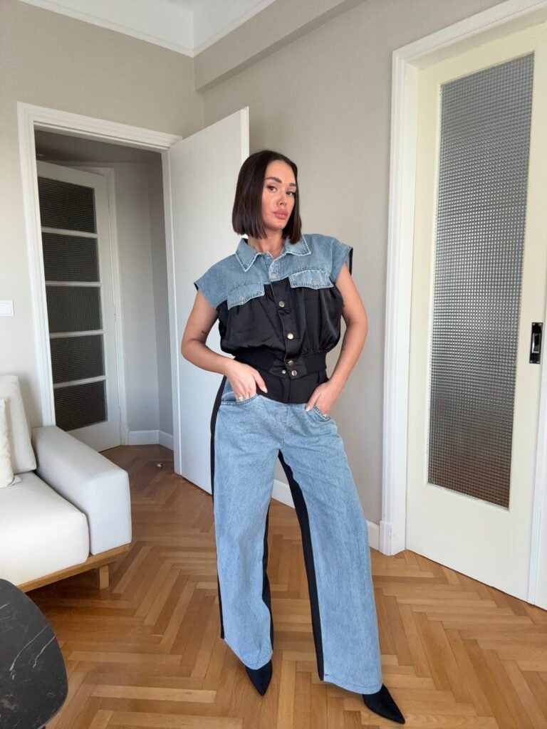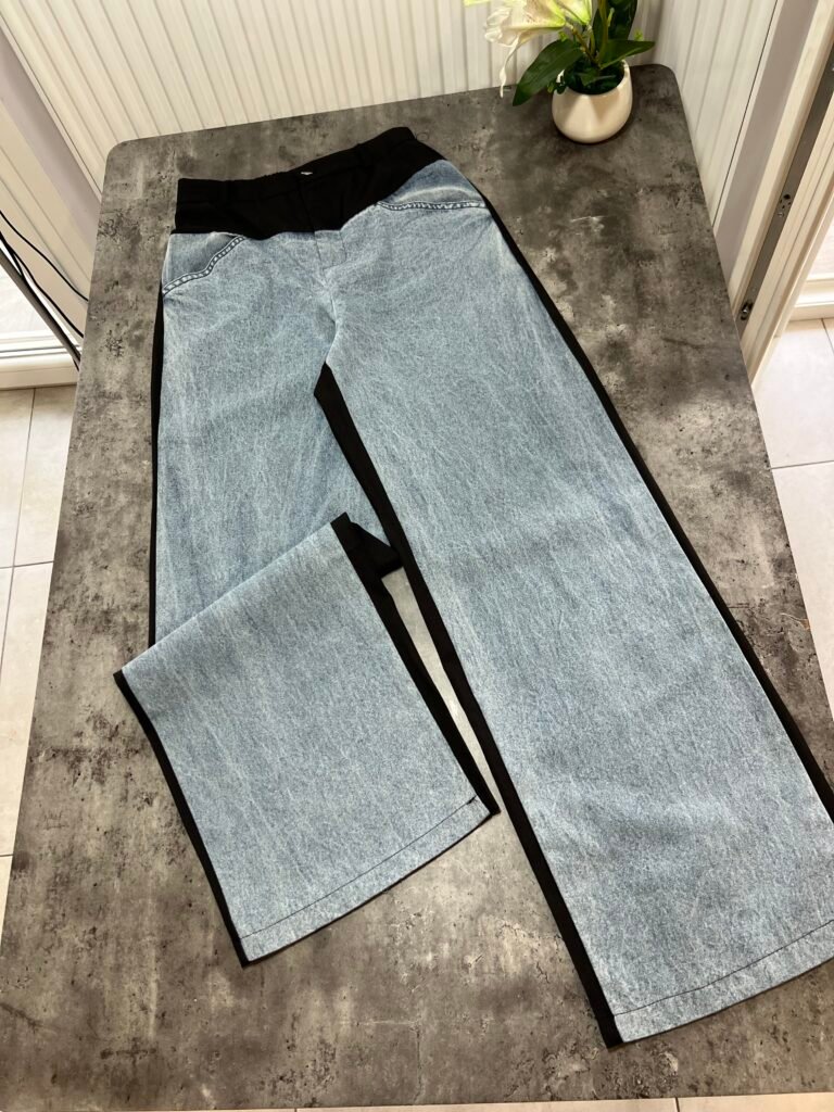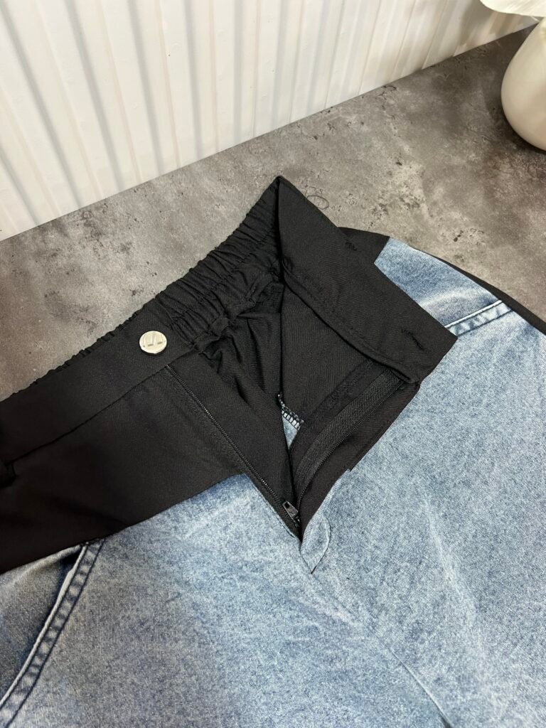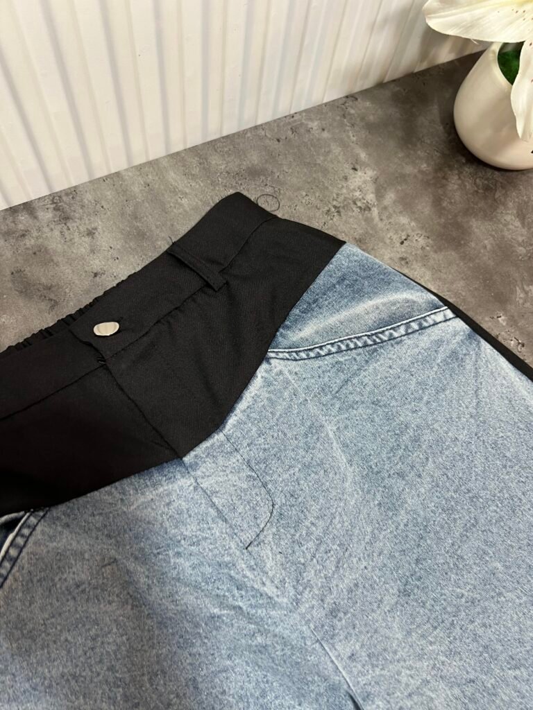 Jeans me ndërthurje të copës së teritalit në prerje të lirshme paralel.