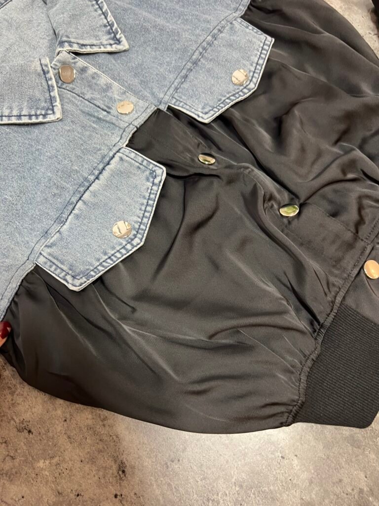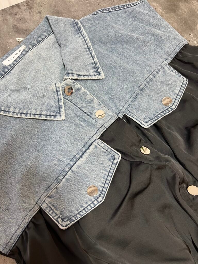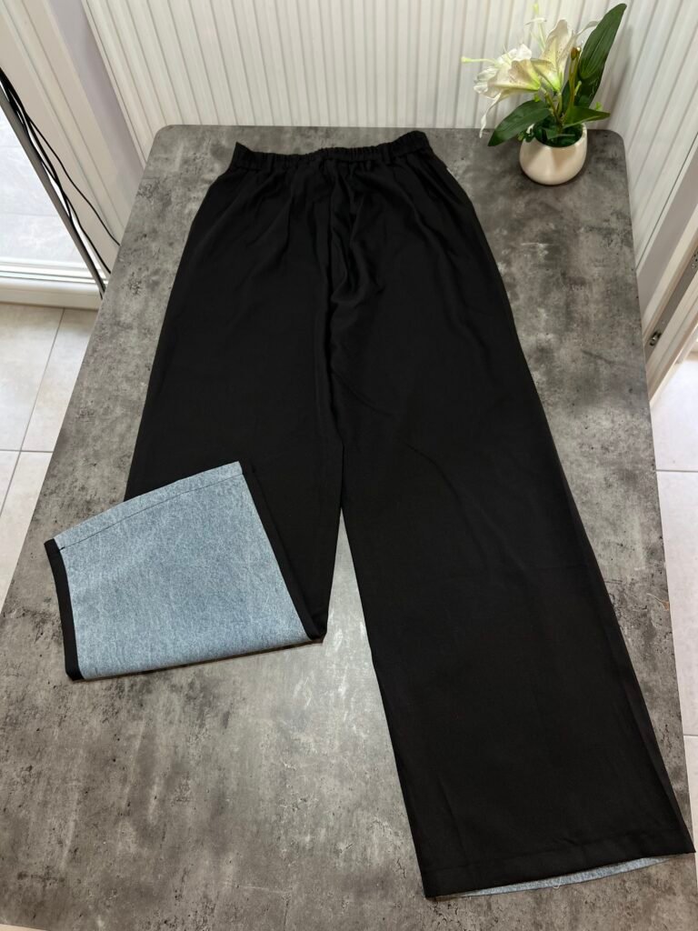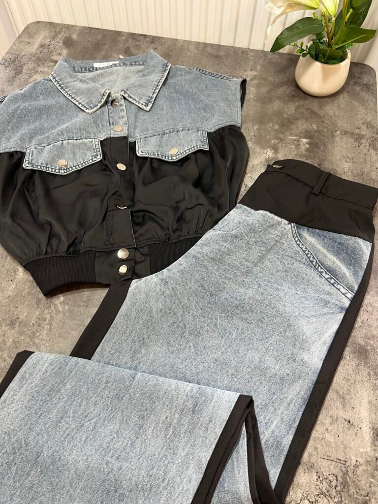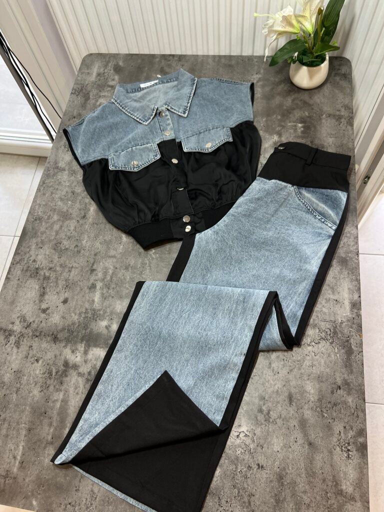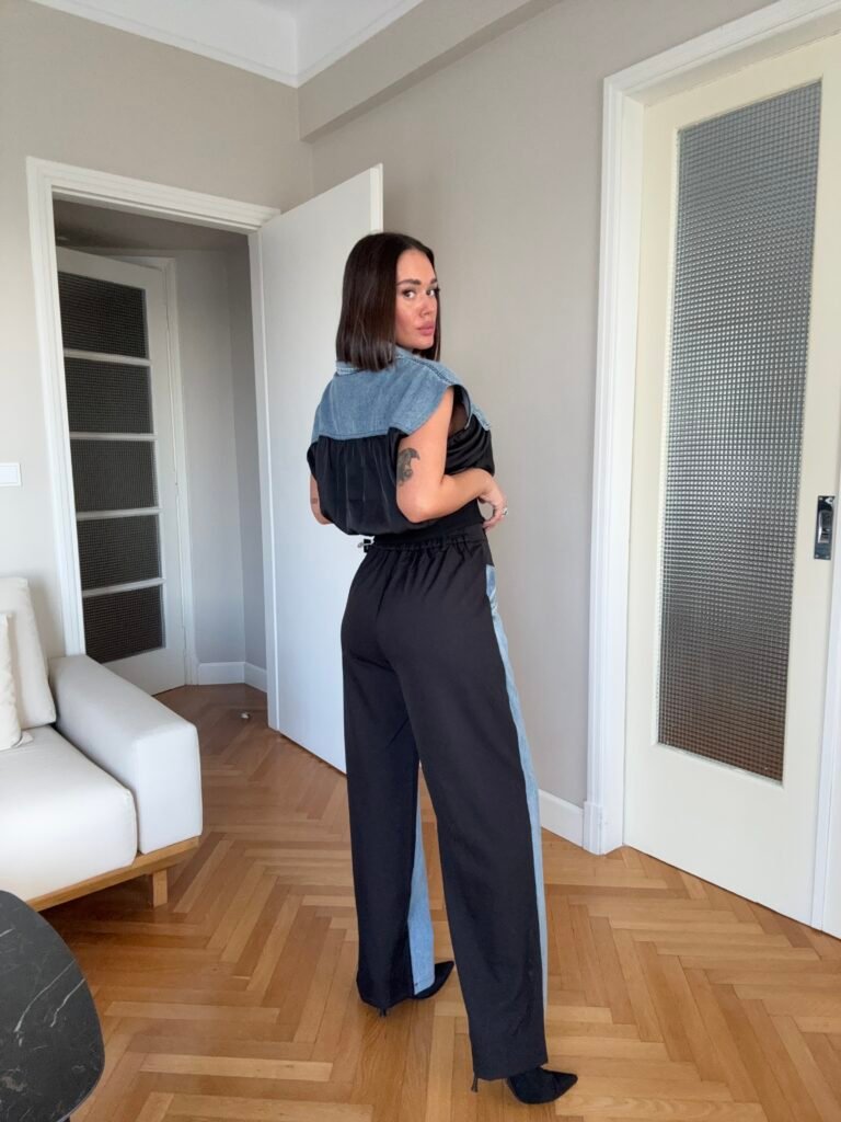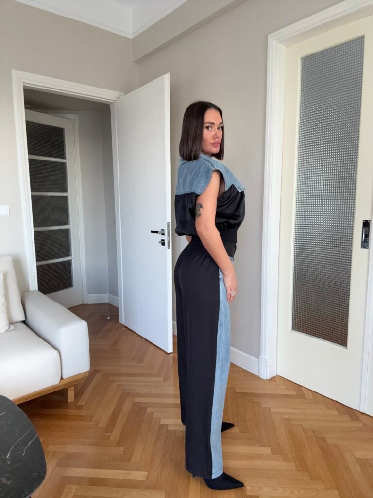 Jeans me ndërthurje të copës së teritalit në prerje të lirshme paralel.