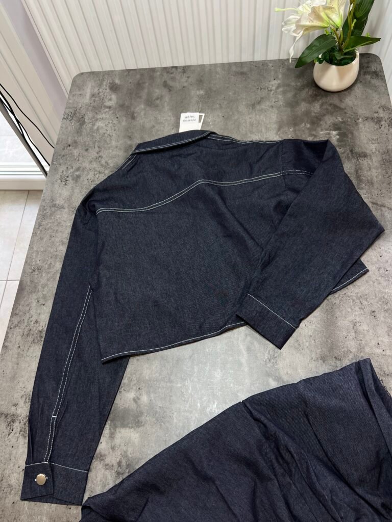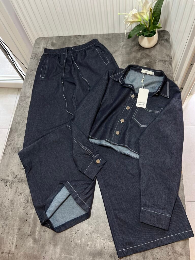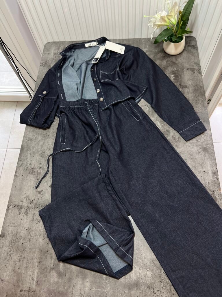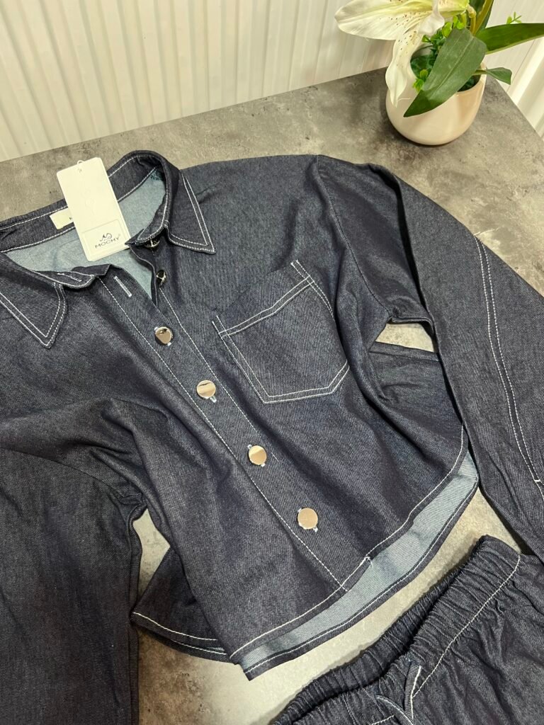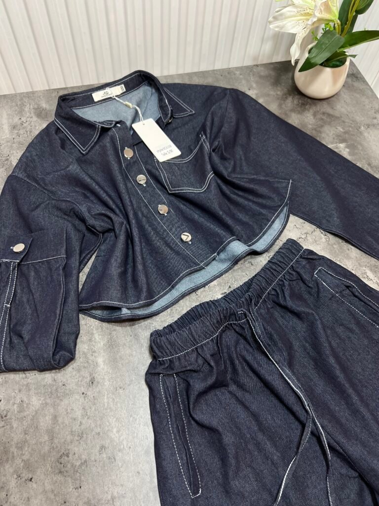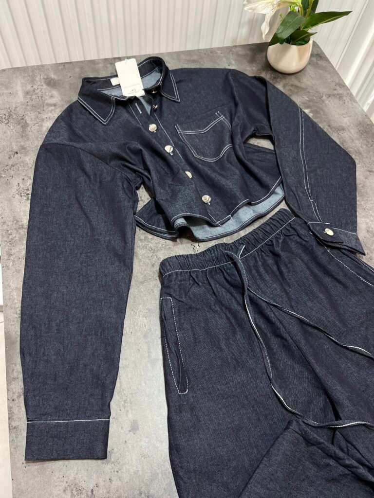 Këmisha në prerje të lirshme fundore, midi-crop. Me xhep anësor funksional. Mbërthim me kopsa. Me qepje me tegela të bardhë të dukshëm. Xhinset në prerje të lirshme me bel të lartë, llastik lidhëse dhe xhepa funksionale. Prerje paralel.