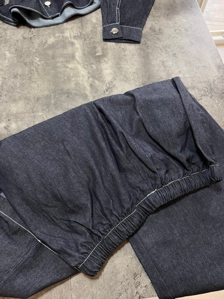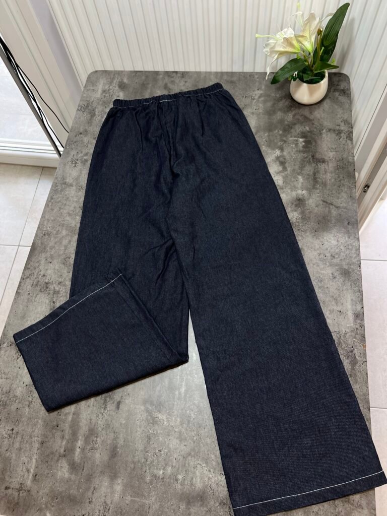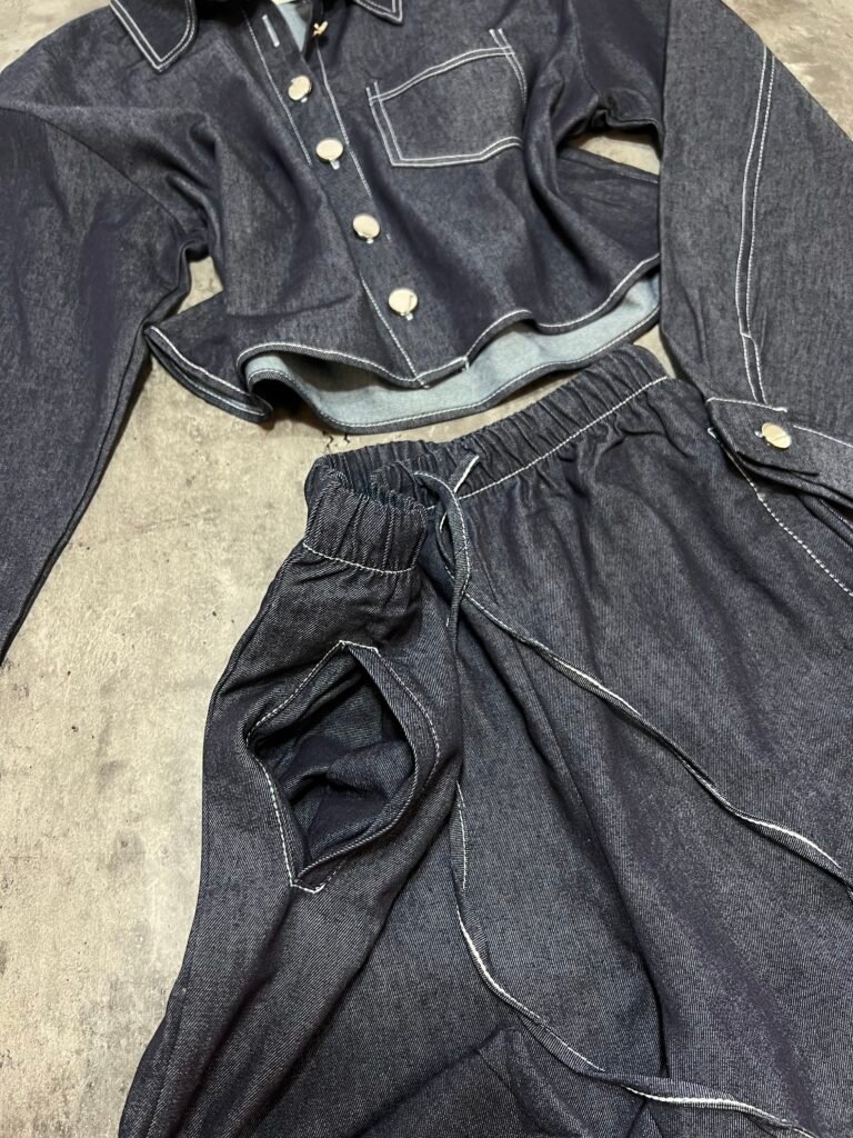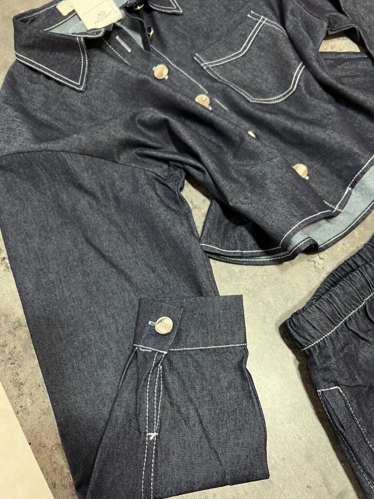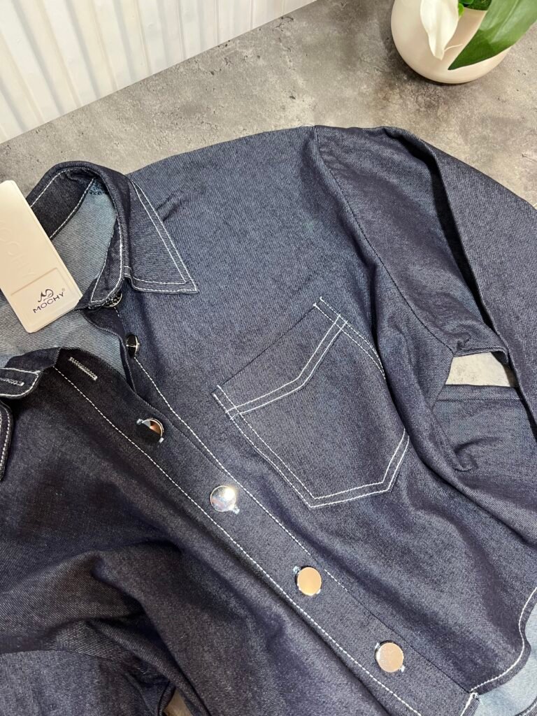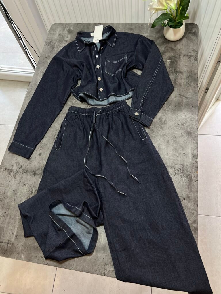 Këmisha në prerje të lirshme fundore, midi-crop. Me xhep anësor funksional. Mbërthim me kopsa. Me qepje me tegela të bardhë të dukshëm. Xhinset në prerje të lirshme me bel të lartë, llastik lidhëse dhe xhepa funksionale. Prerje paralel.