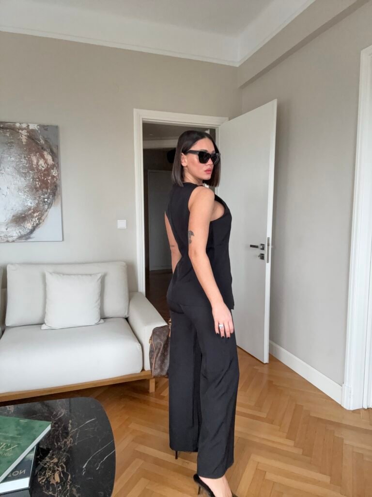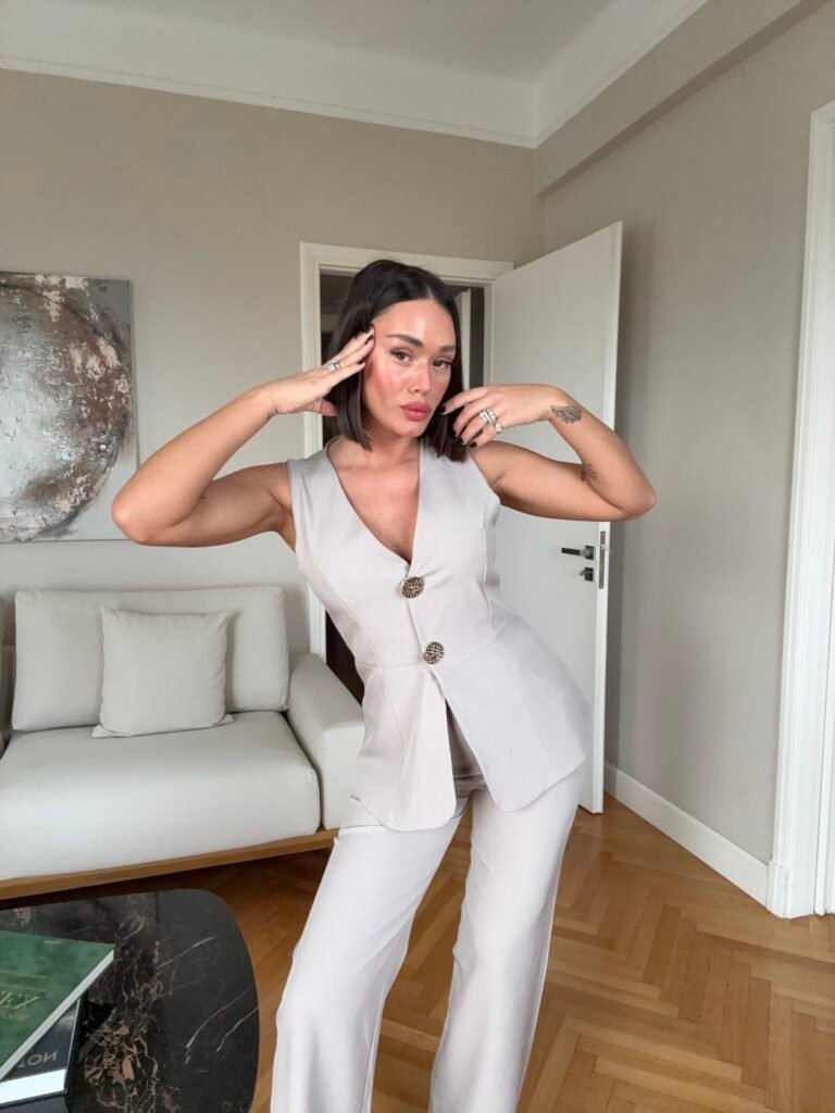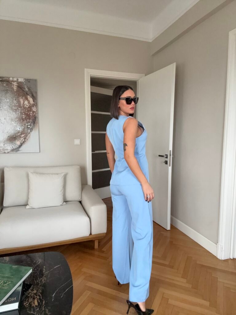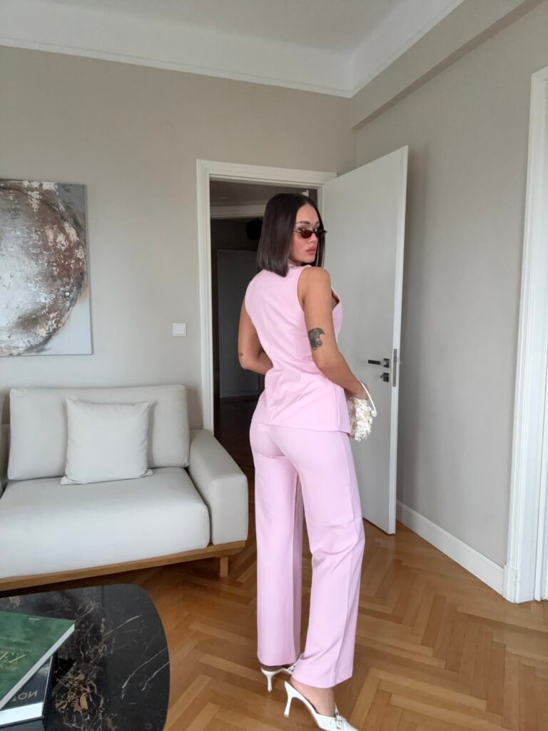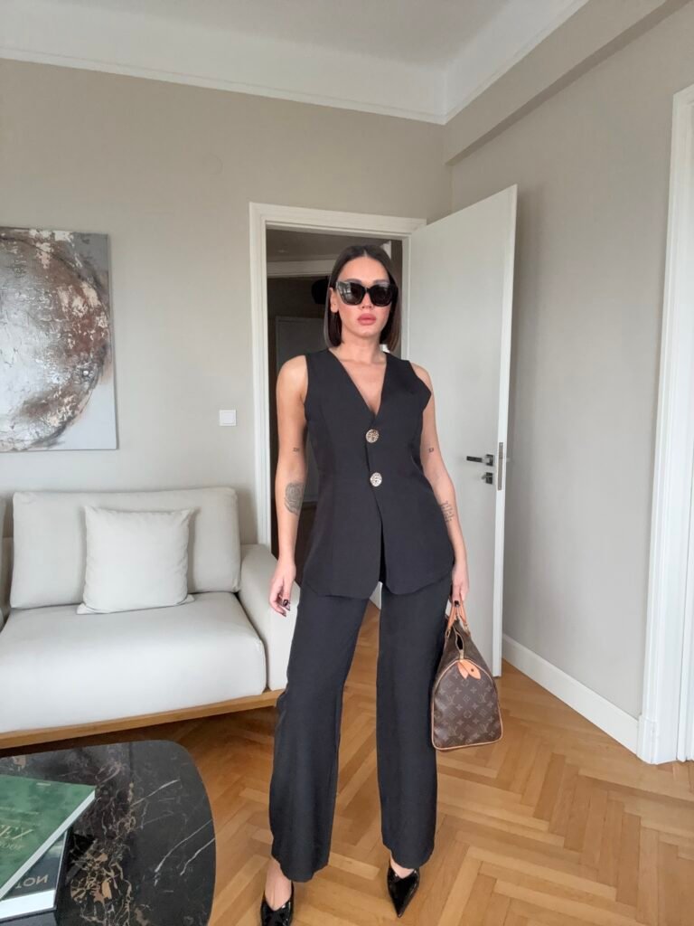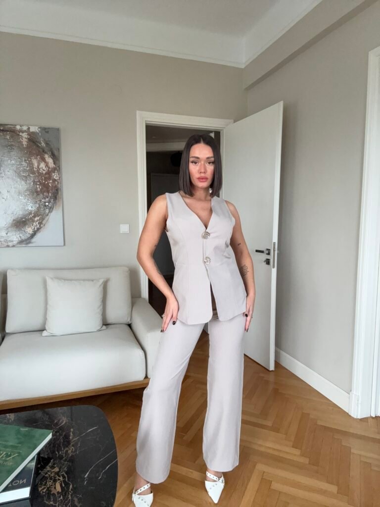 Pantallona të gjata me bel të larte, me llastik pas. Prerje e drejtë. Përmbajne xhepa funksionale. Jelek në gjatësi poshtë vitheve, me astar brënda. Me mbërthim kopsash të mëdha gold.