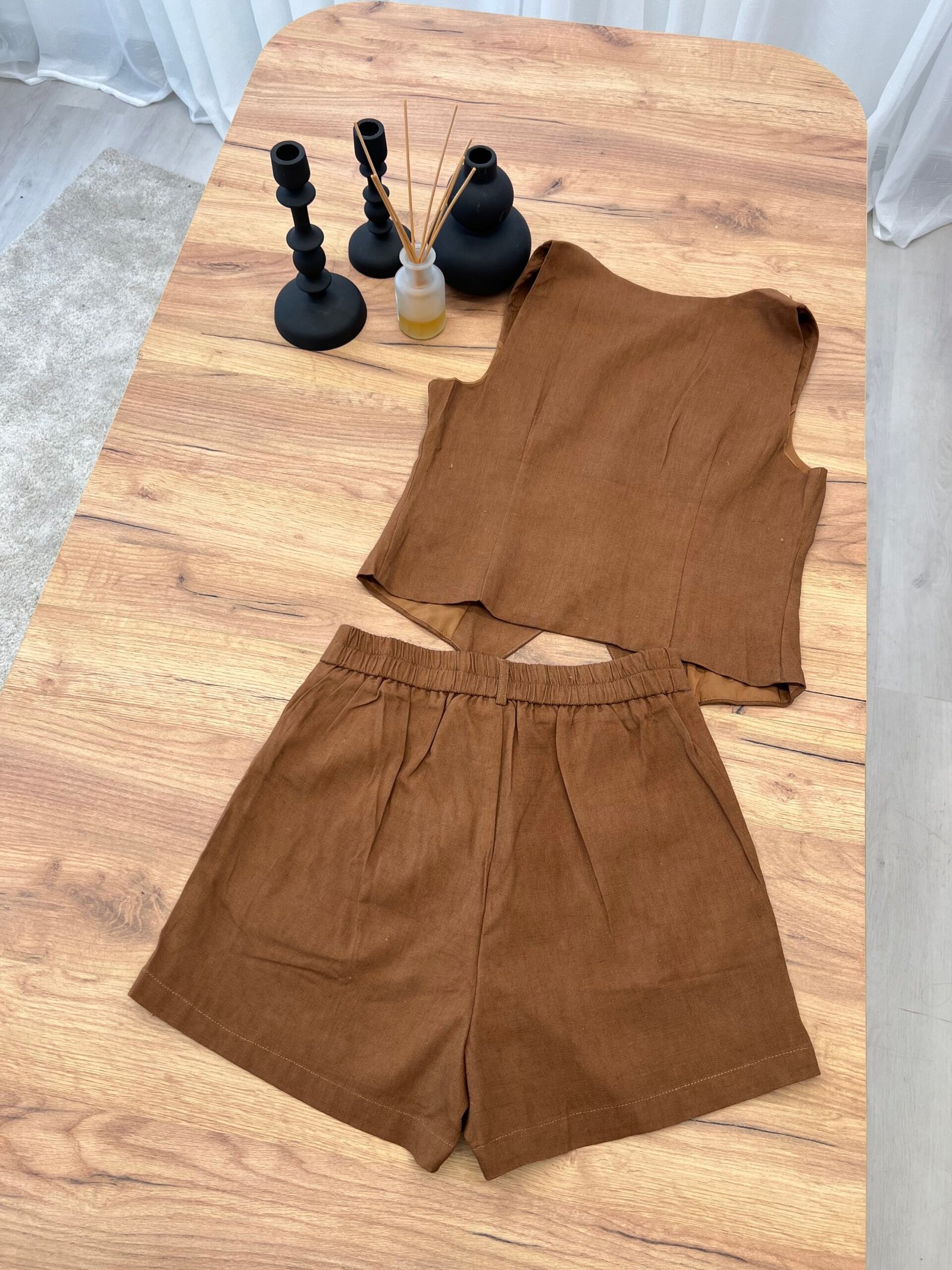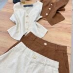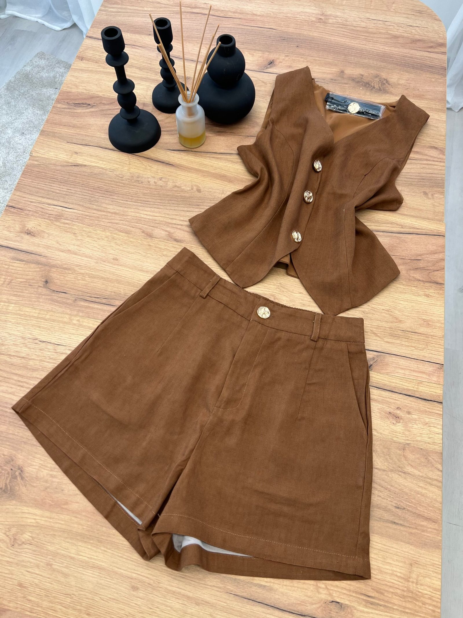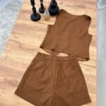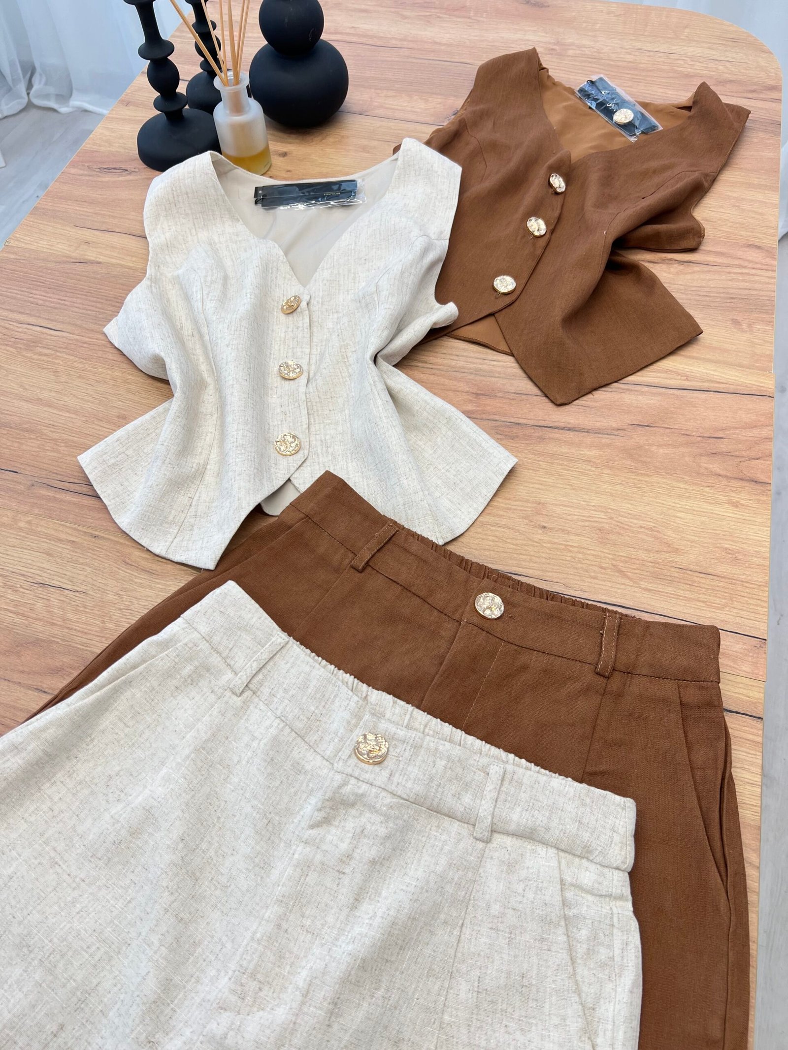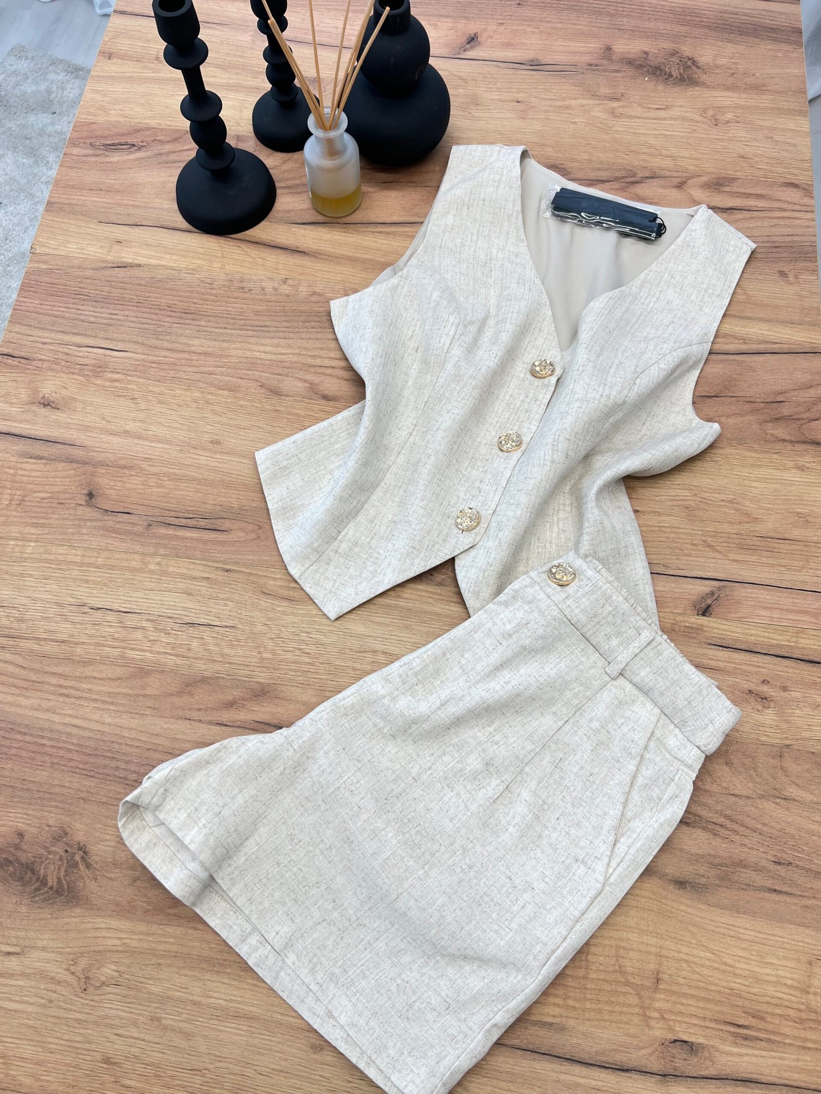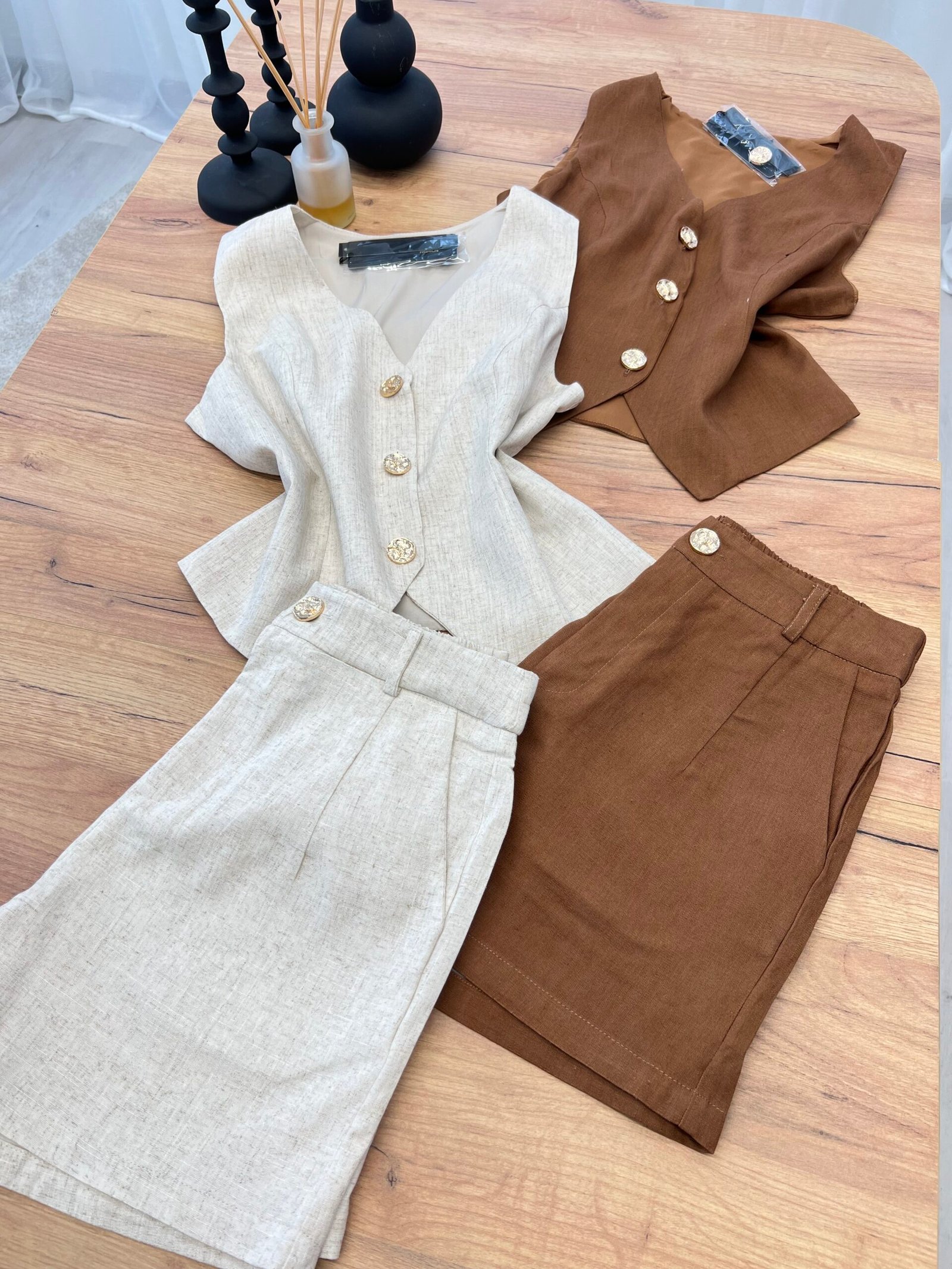 Set 2-pjesësh me jelek elegant me kopsa dekorative dhe prerje që formëson bukur trupin, i kombinuar me pantallona të shkurtra me linjë të pastër dhe bel të strukturuar. Dizajn minimalist me detaje classy që krijon një look modern dhe të rafinuar.