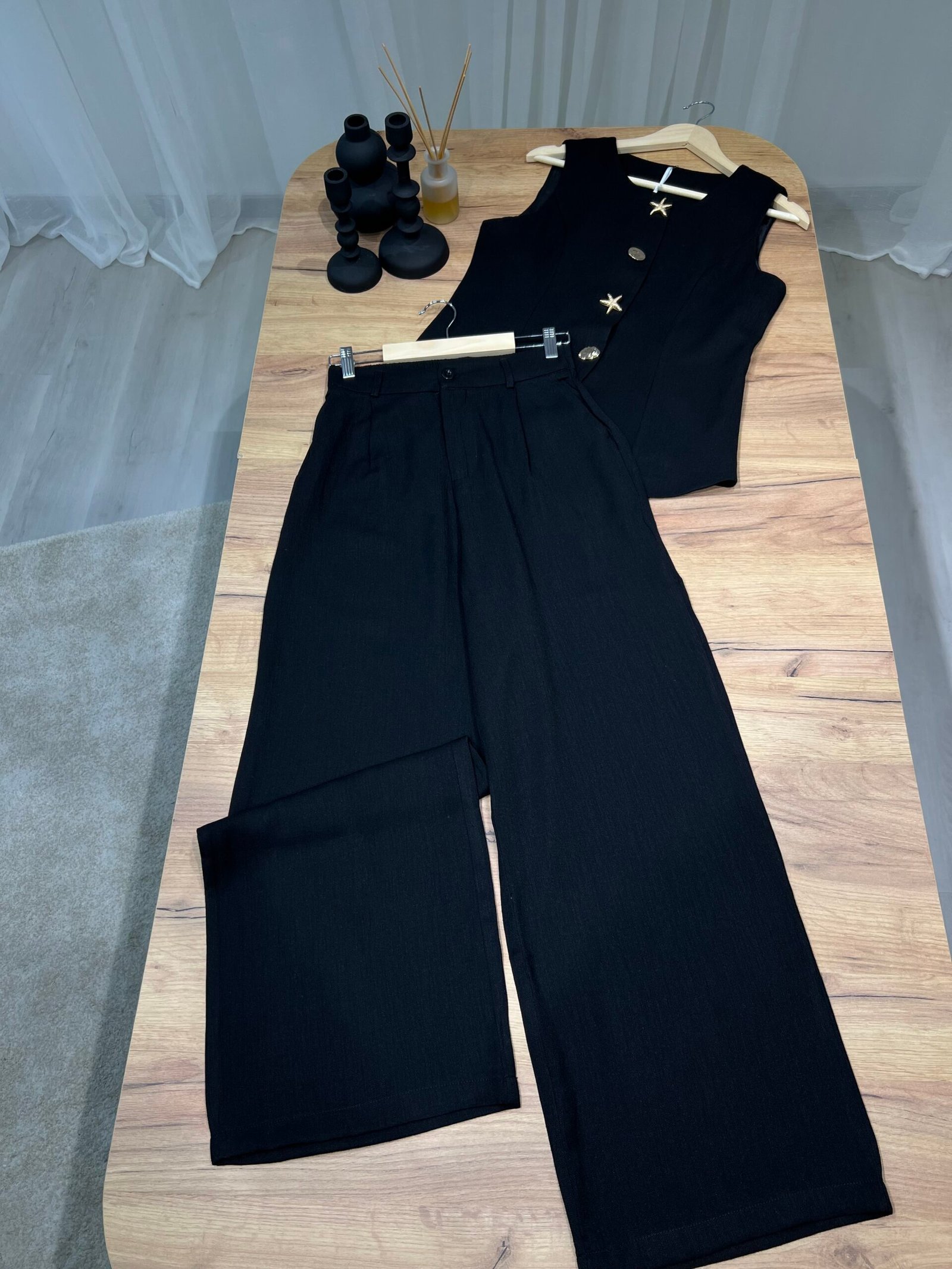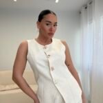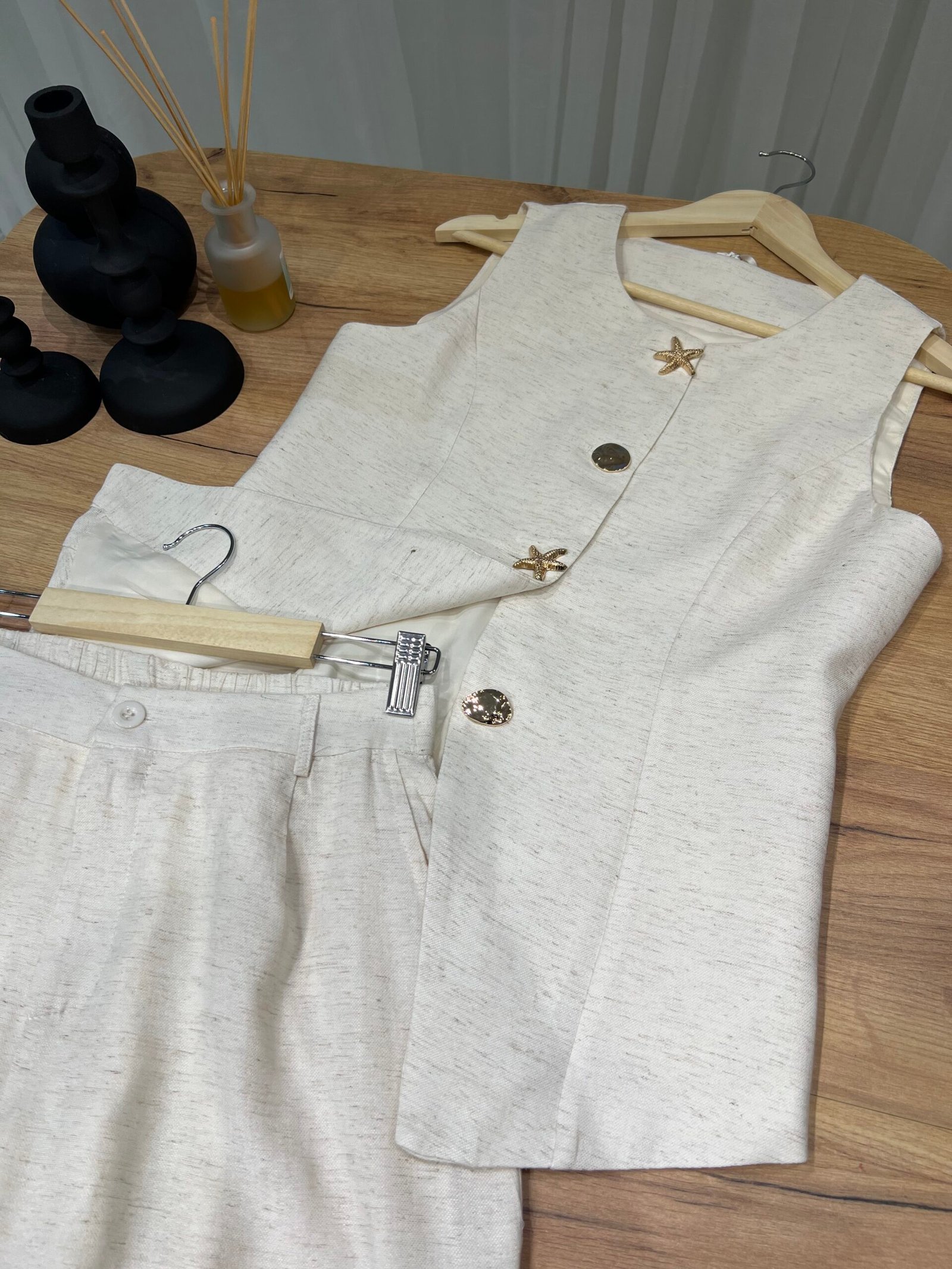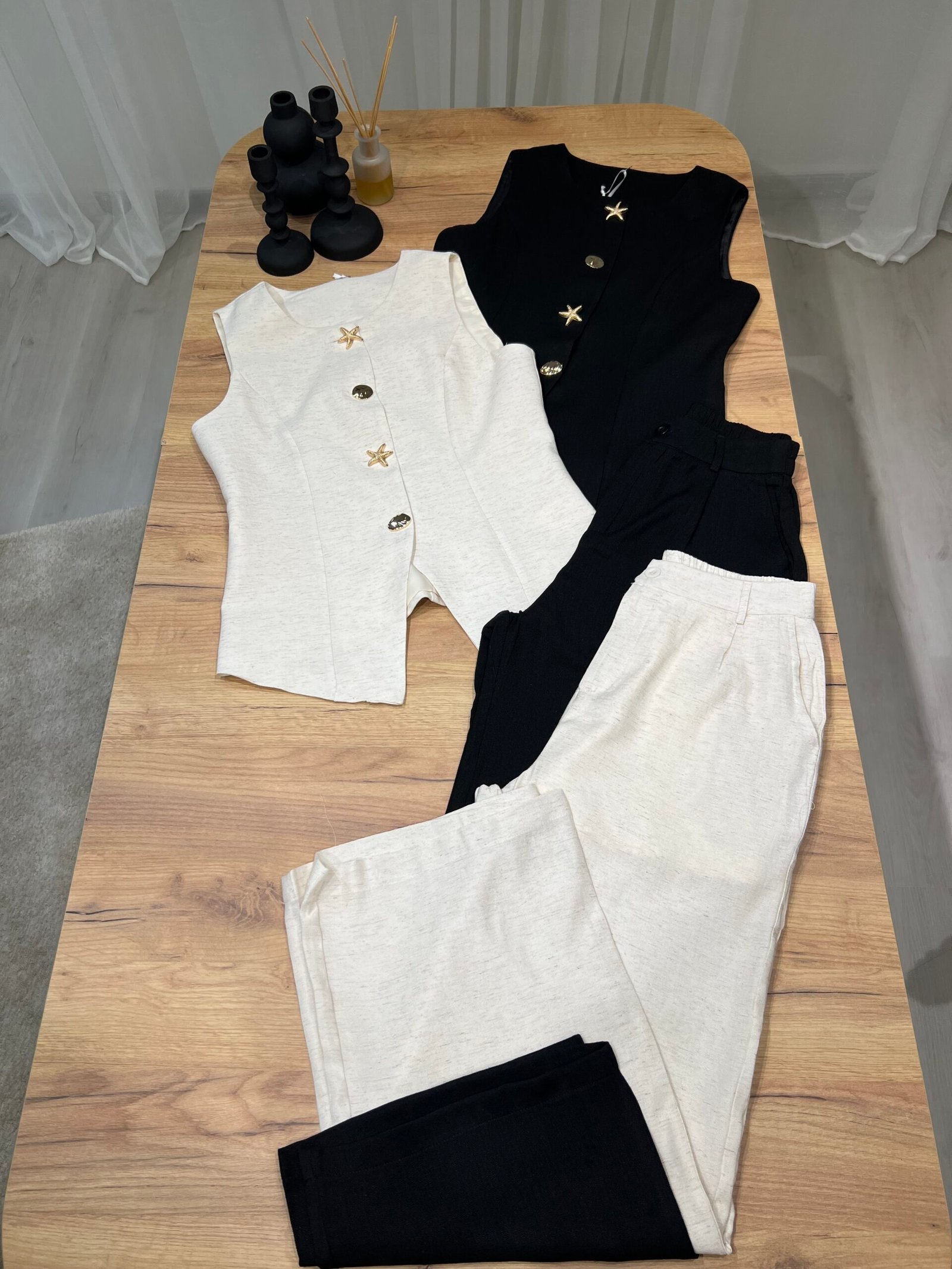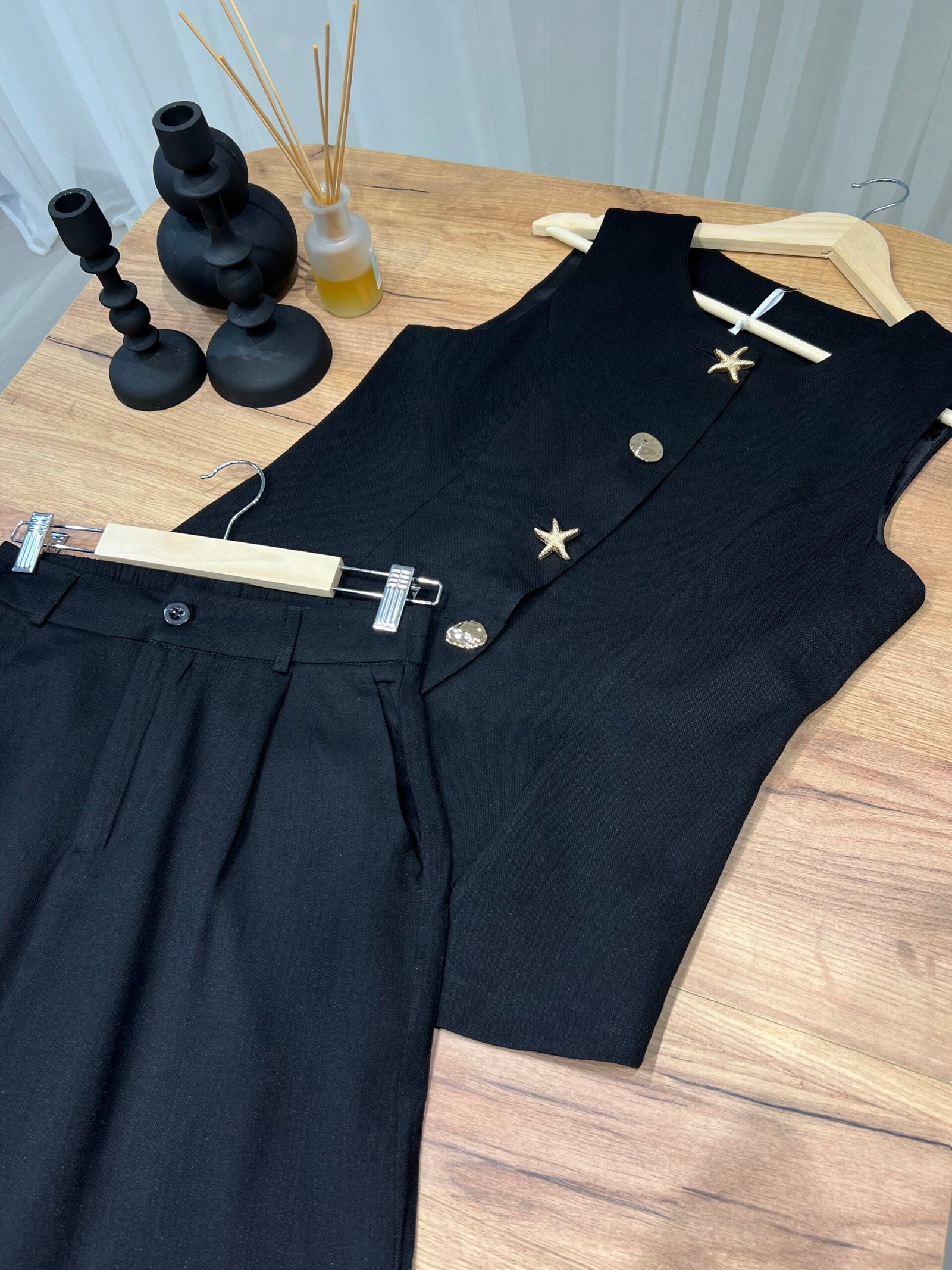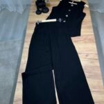 Set dy-pjesësh me jelek pa mëngë me kopsa dekorative gold dhe pantallona me prerje të drejtë. Material cilësor me strukturë elegante, ideal për look classy chic dhe kombinime smart casual. Perfekt për zyrë, evente apo dalje elegante.