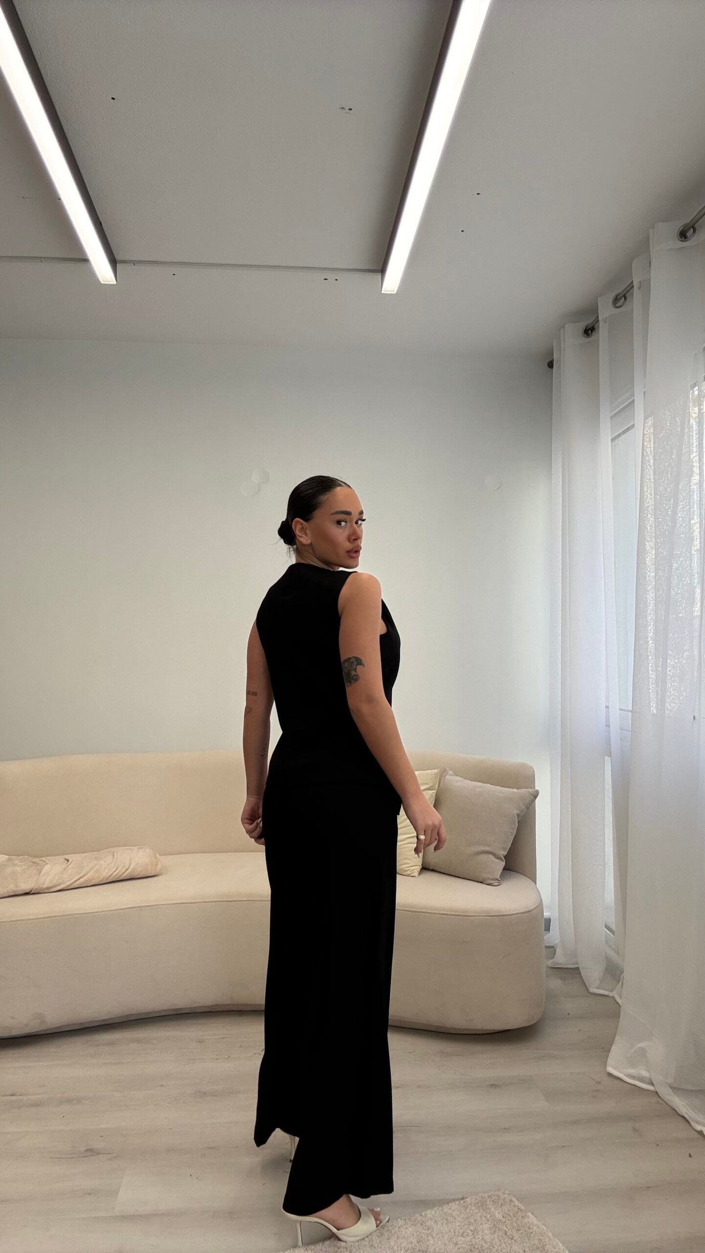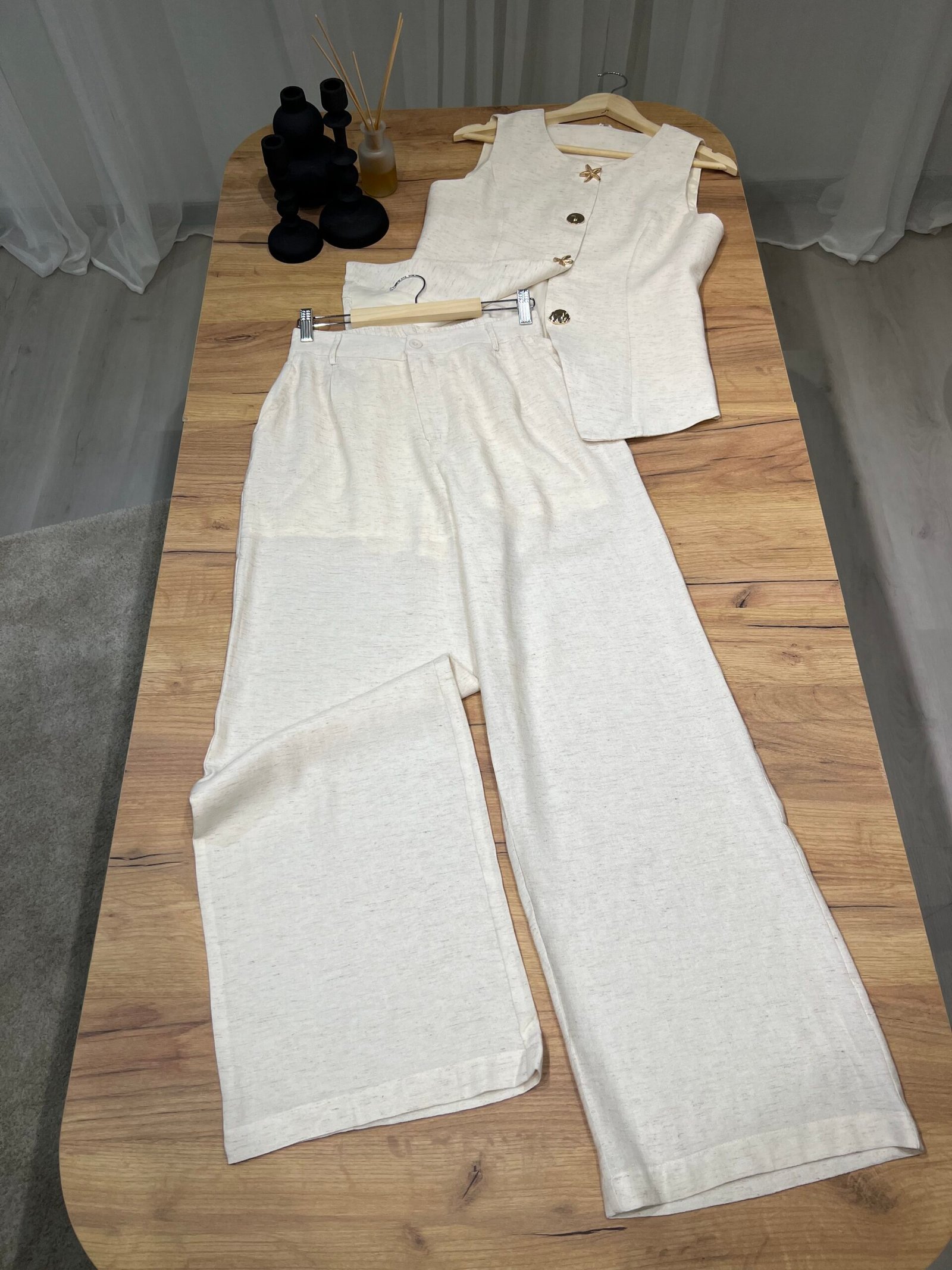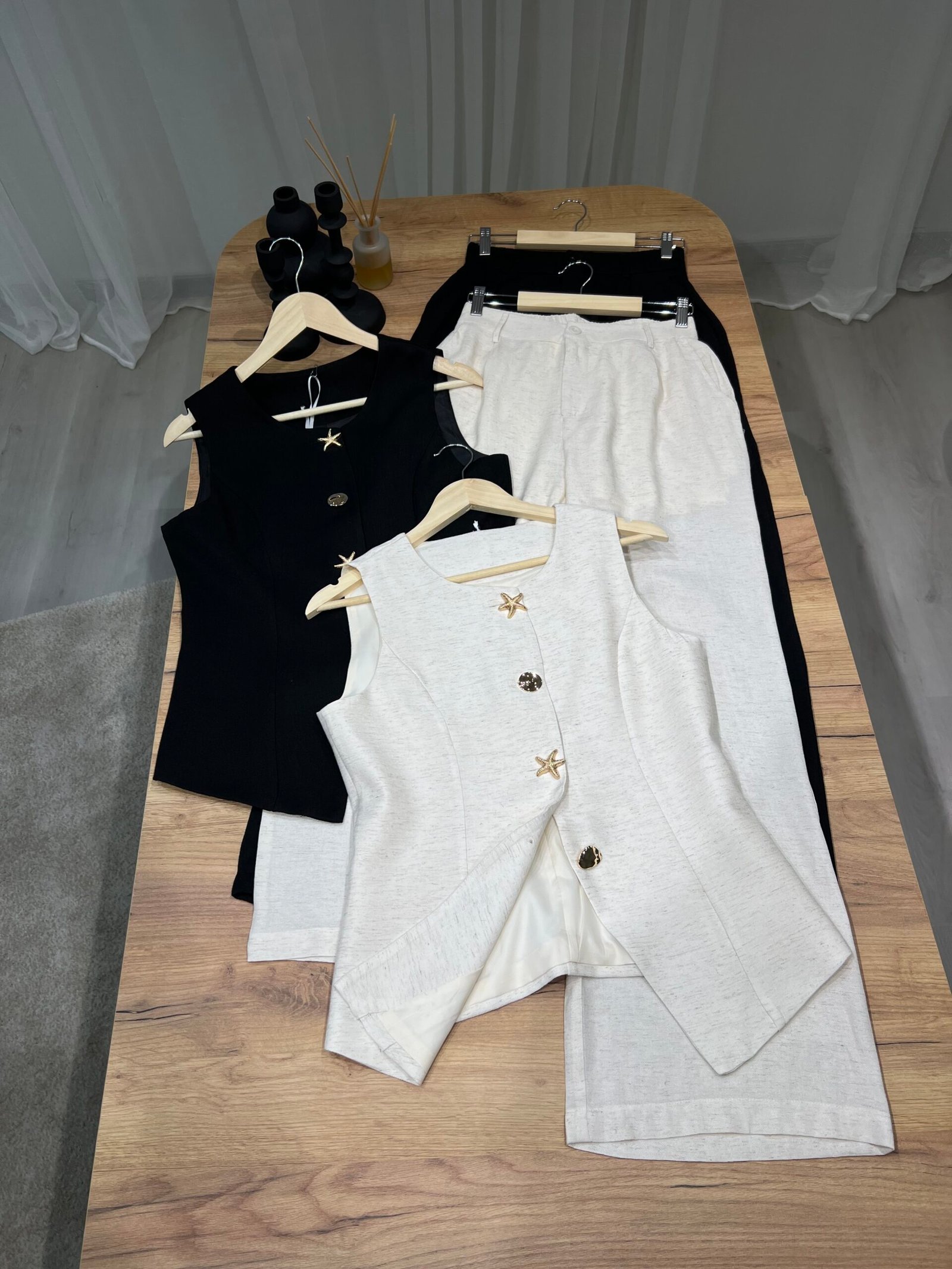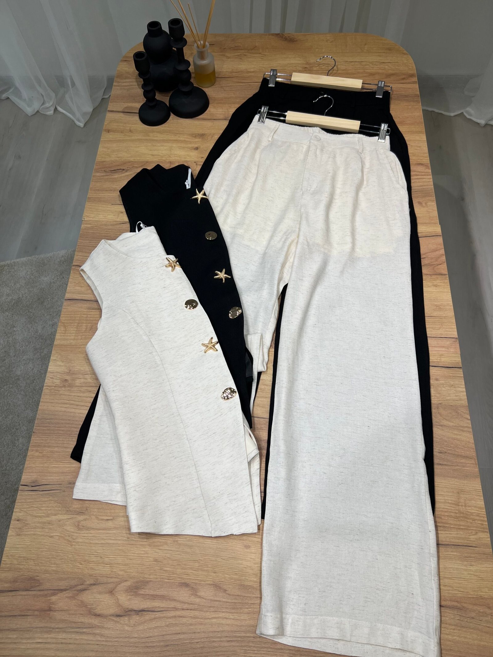 Set dy-pjesësh me jelek pa mëngë me kopsa dekorative gold dhe pantallona me prerje të drejtë. Material cilësor me strukturë elegante, ideal për look classy chic dhe kombinime smart casual. Perfekt për zyrë, evente apo dalje elegante.